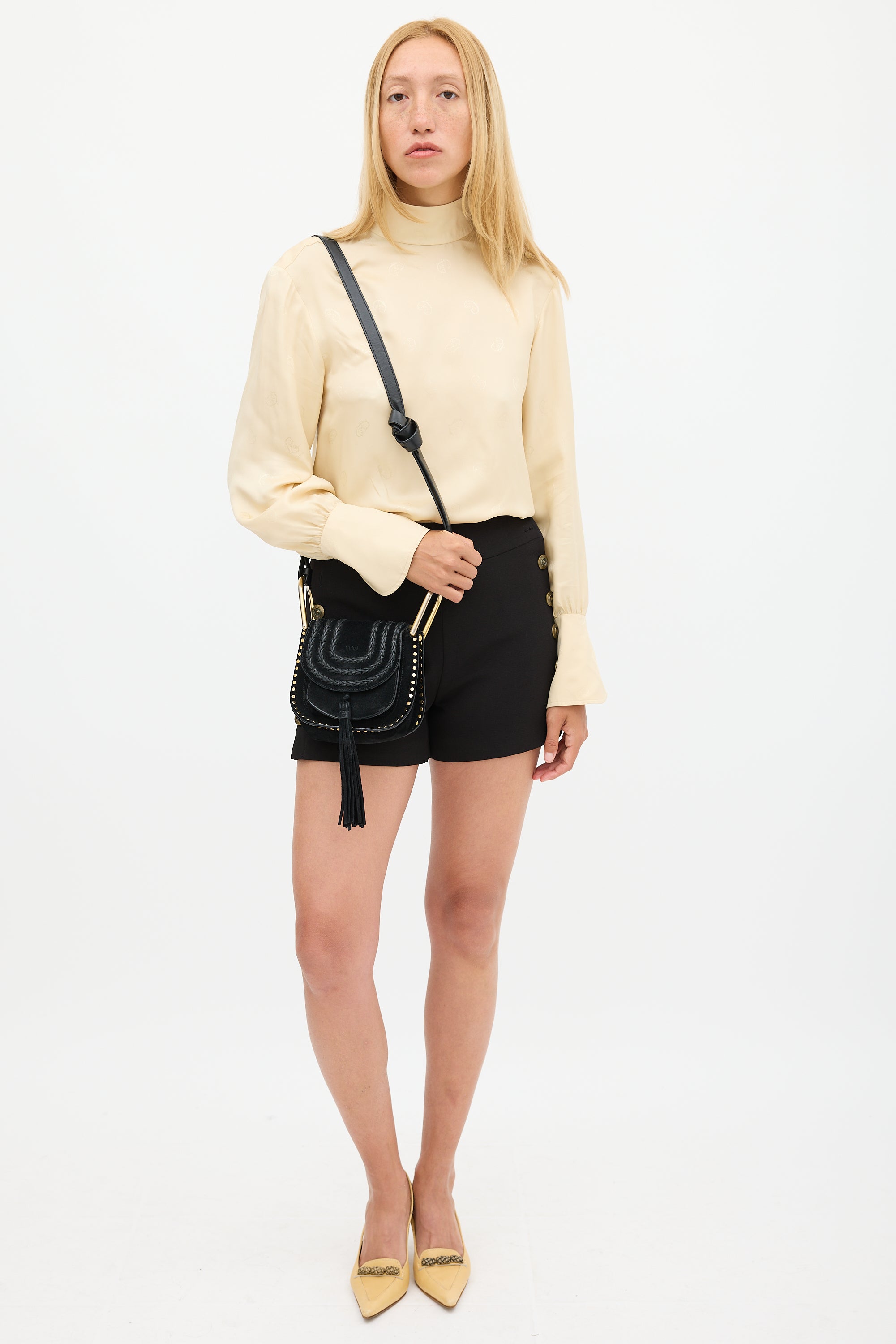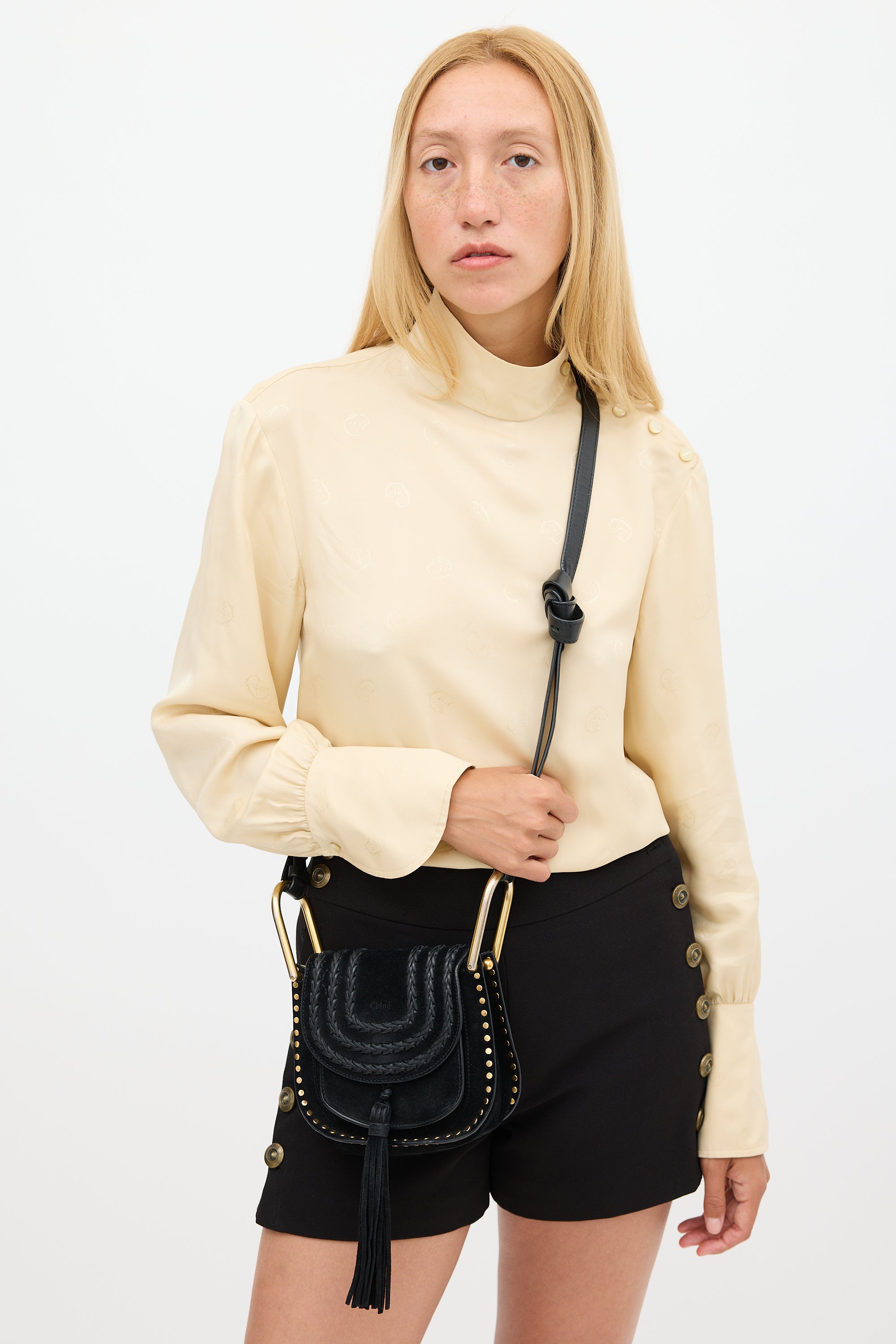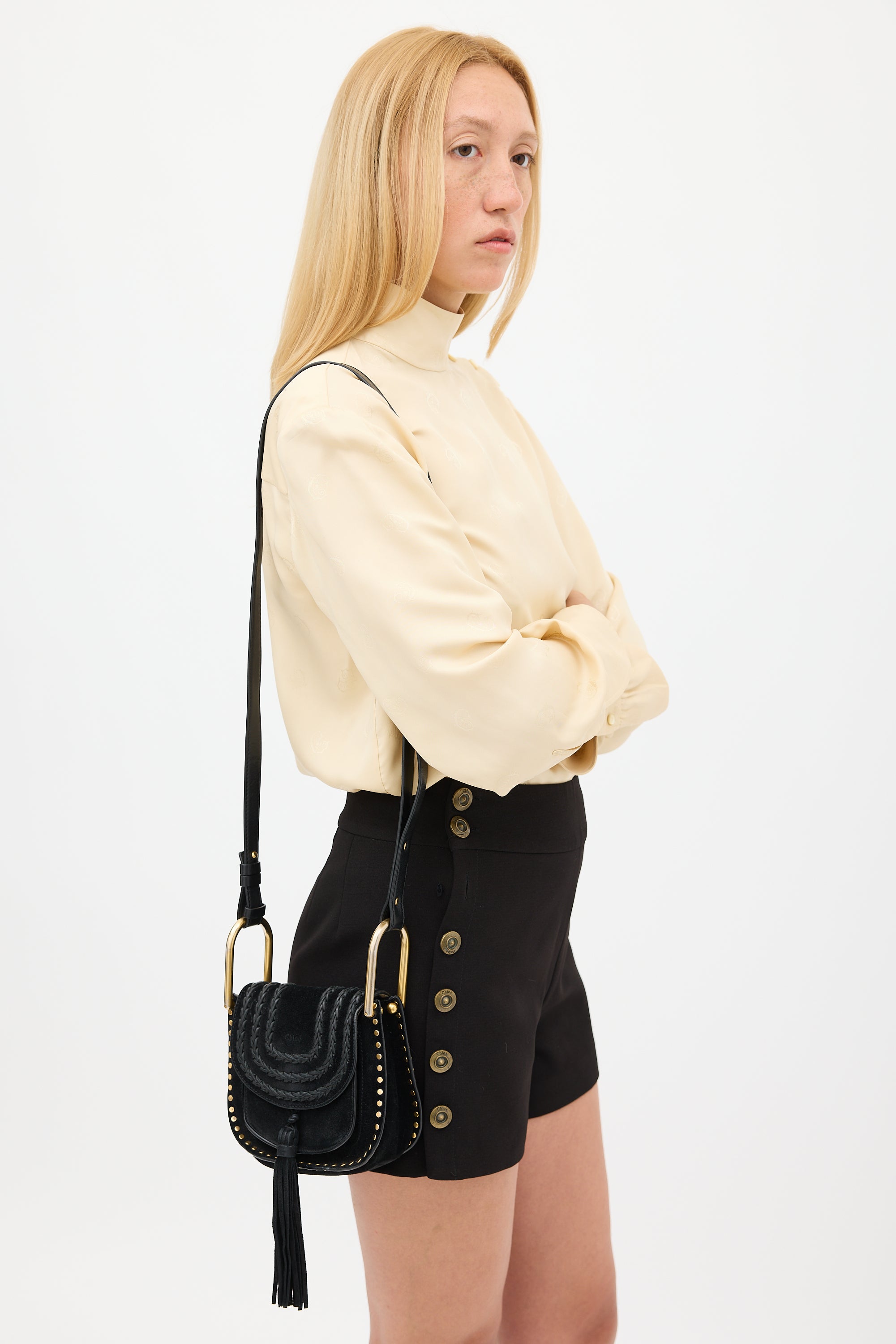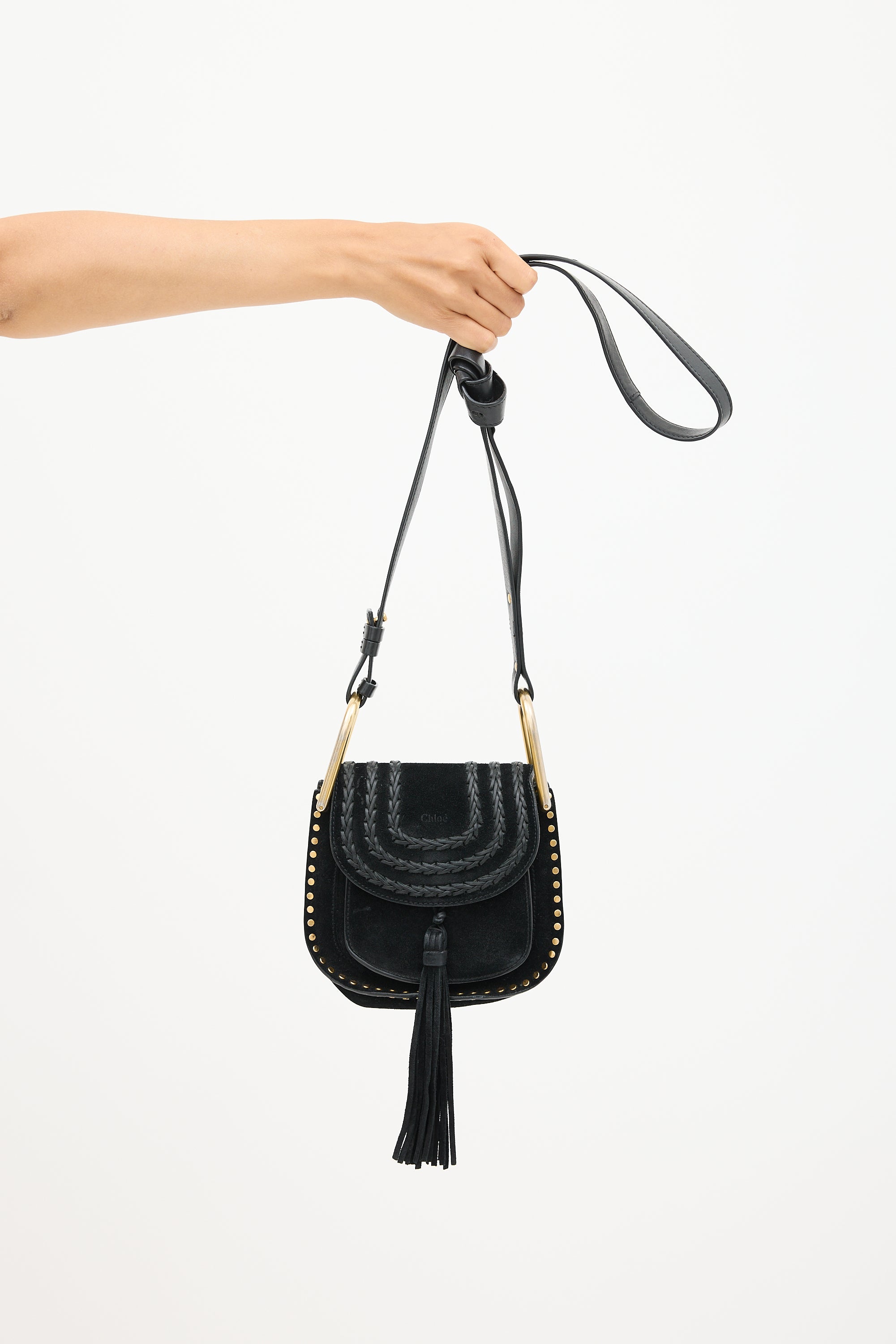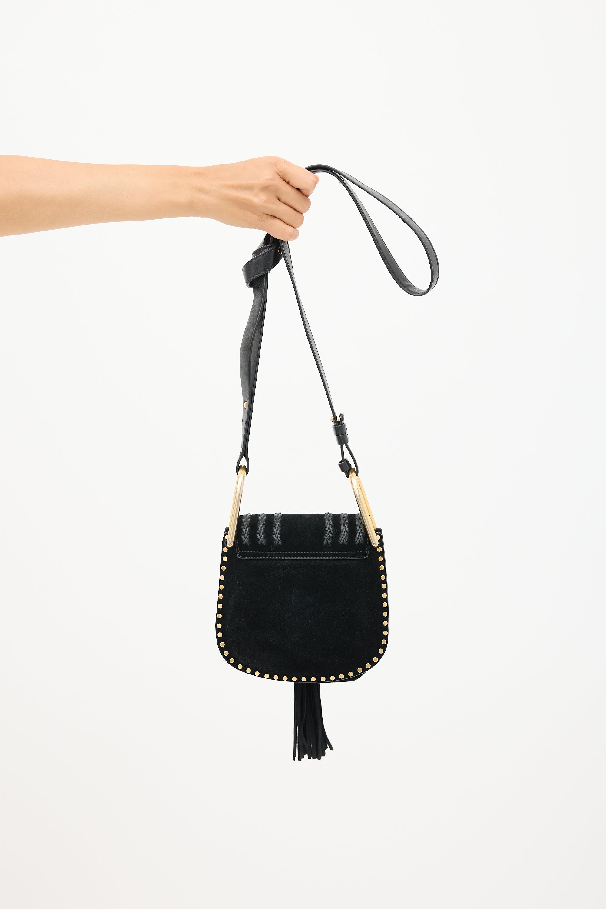Pre-owned Chloé black suede mini Hudson crossbody bag featuring gold tone hardware, stud trim throughout body, shoulder strap with knot detail, front flap with tassel and woven detailing, magnetic closure, single slip pocket under flap, and one main compartment. Comes with dust bag.