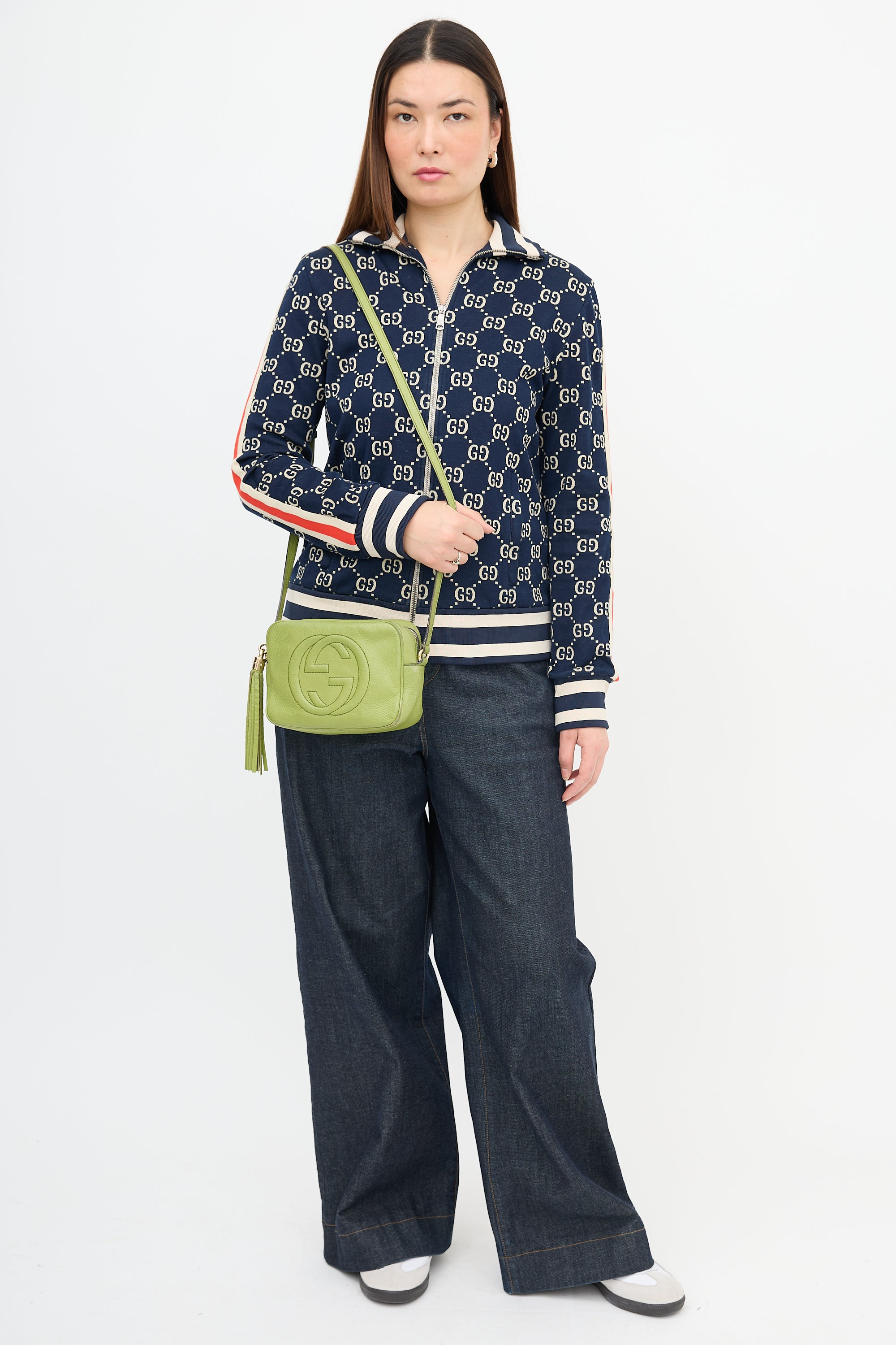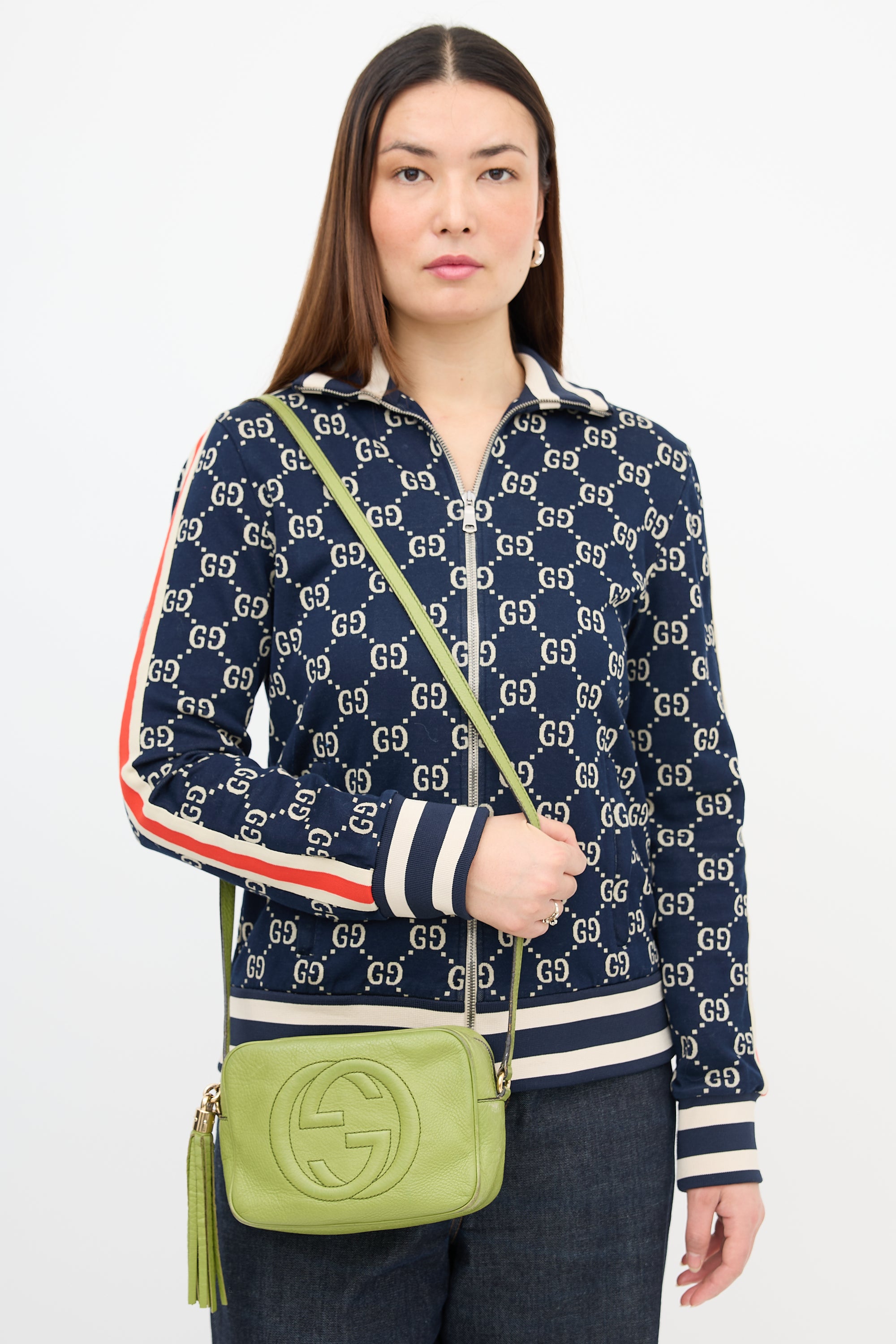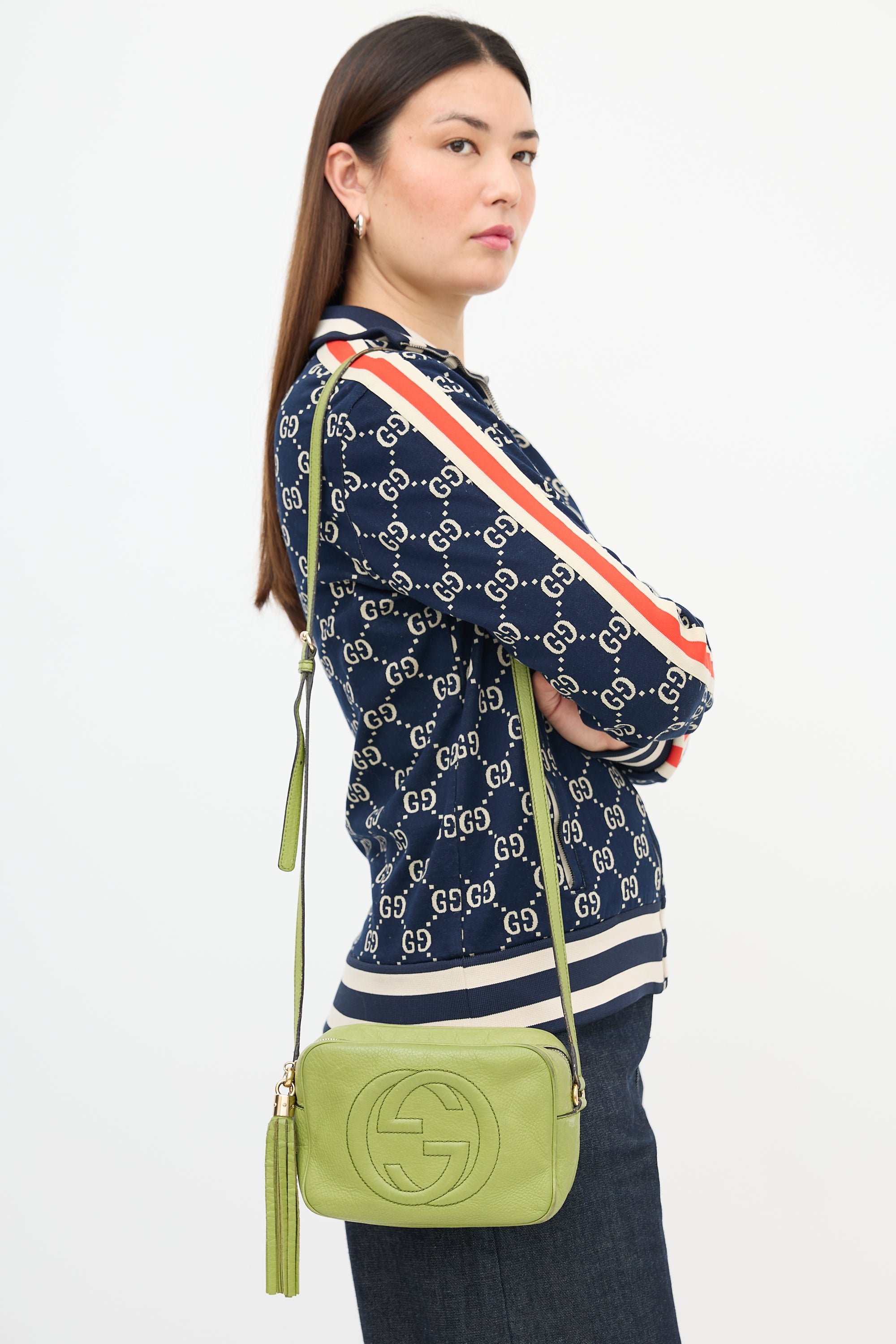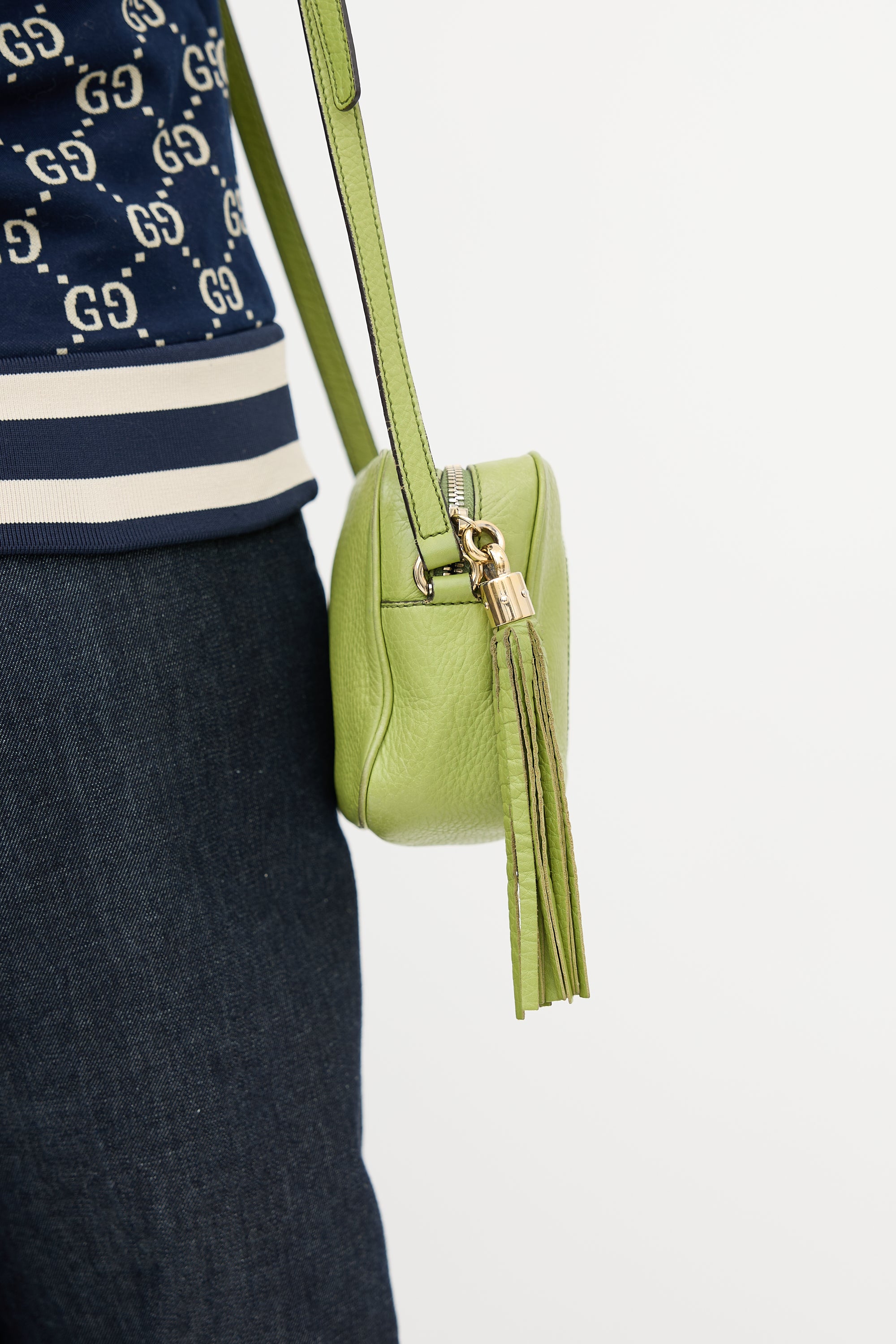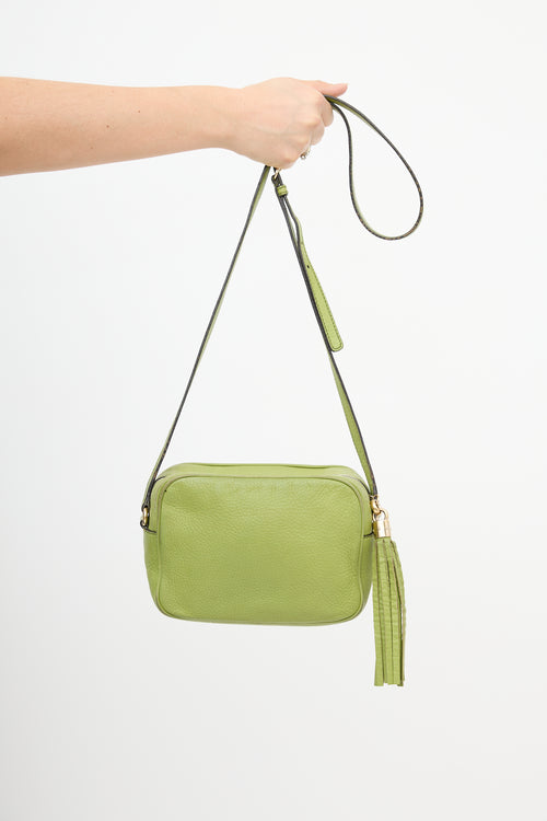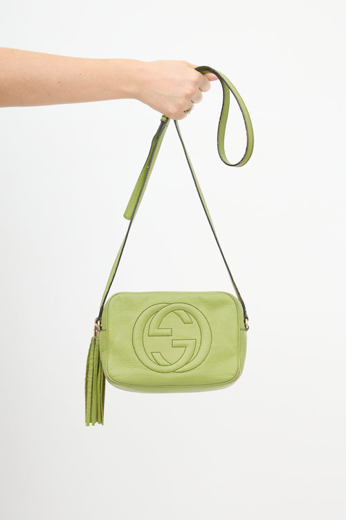Pre-owned Gucci green leather small Soho Disco bag featuring tonal stitching, stitched interlocking GG motif at front, top zip closure with tassel charm, adjustable shoulder strap, and one lined main compartment with two slip pockets.
