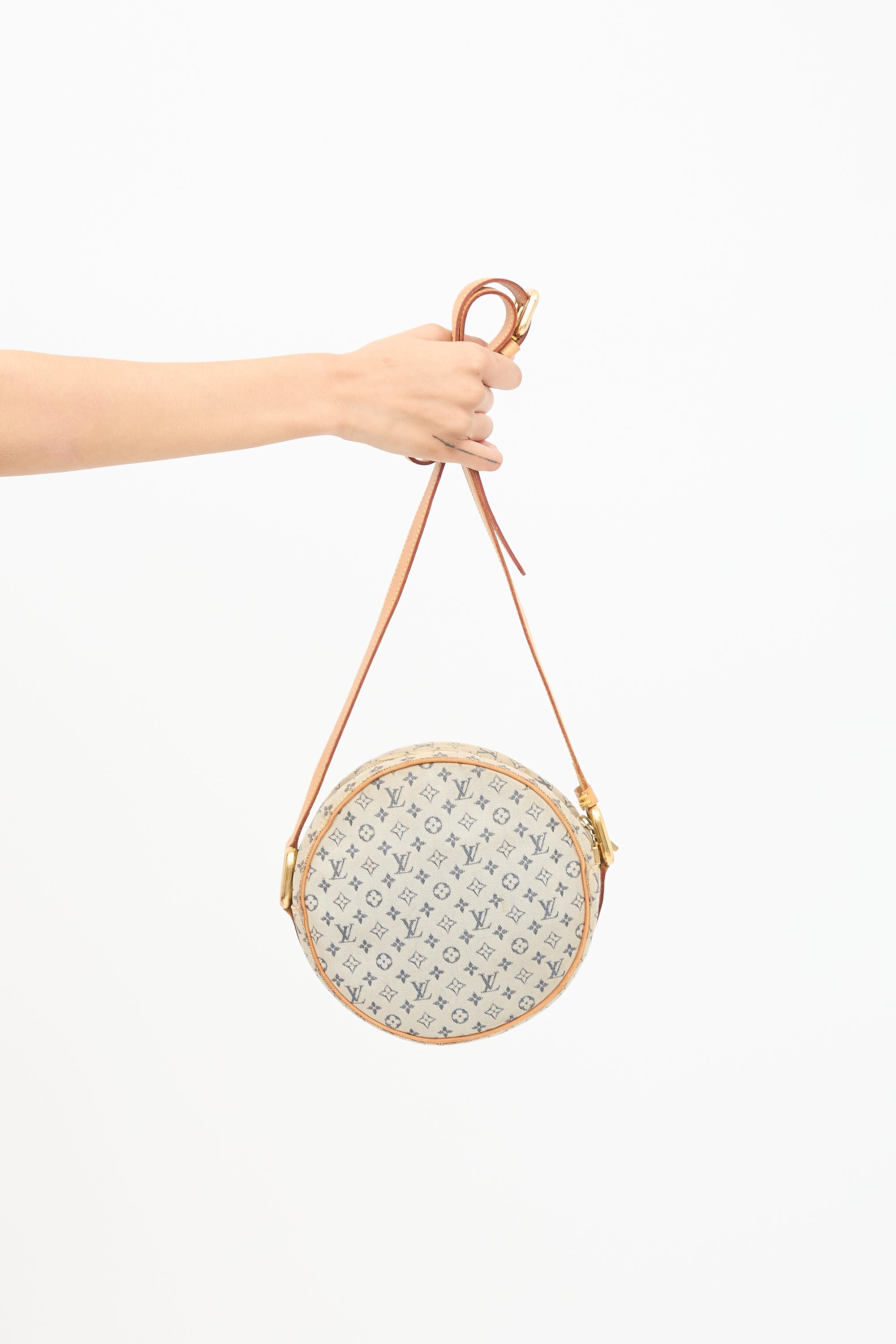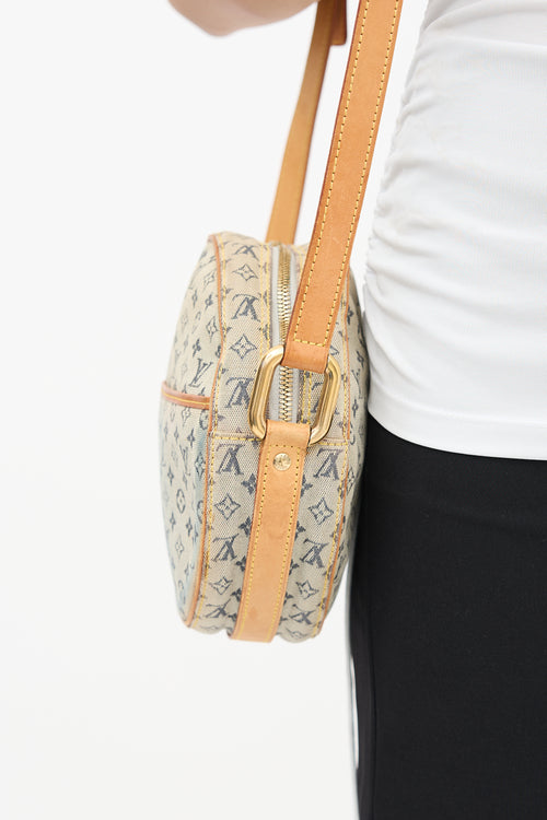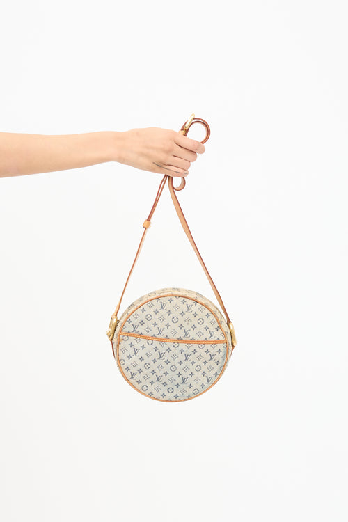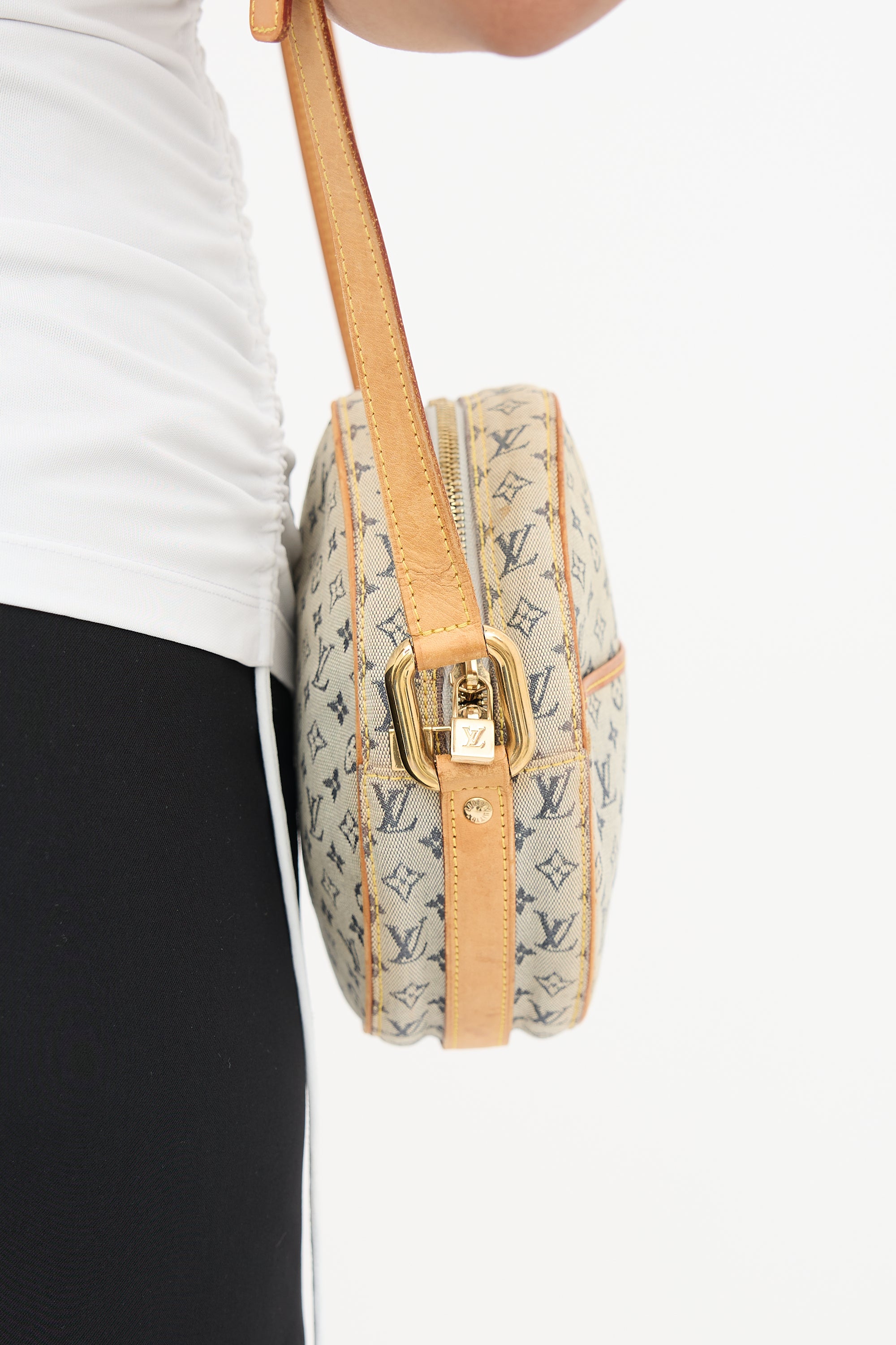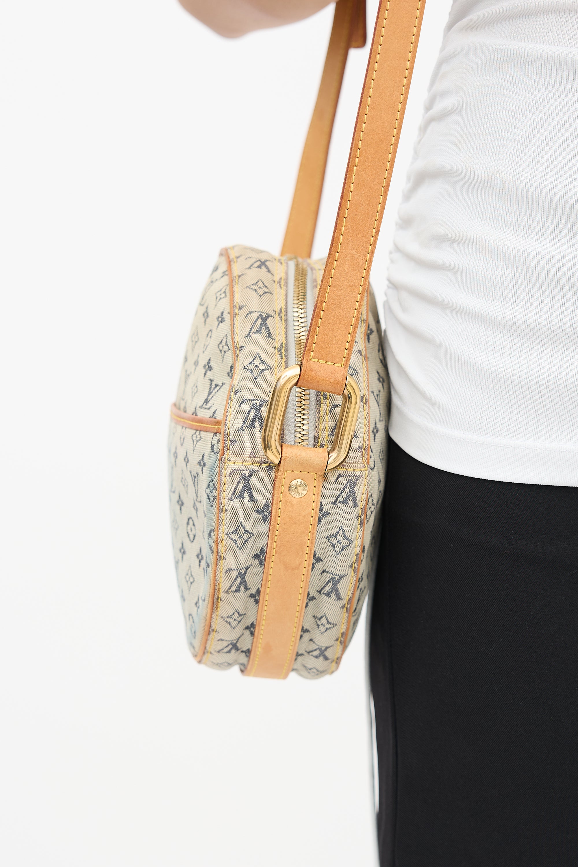 Pre-owned Louis Vuitton beige and blue Mini Lin Jeanne GM bag featuring a leather adjustable crossbody strap, canvas monogram body, gold tone hardware, leather trim, front slip pocket, zip top closure, and one slip pocket at interior.