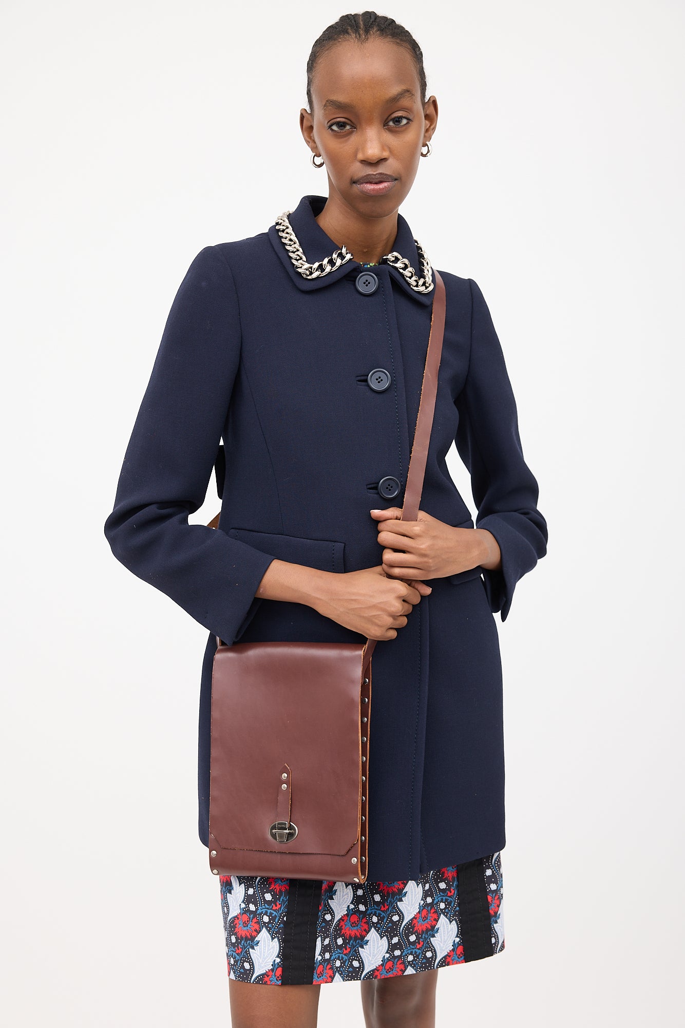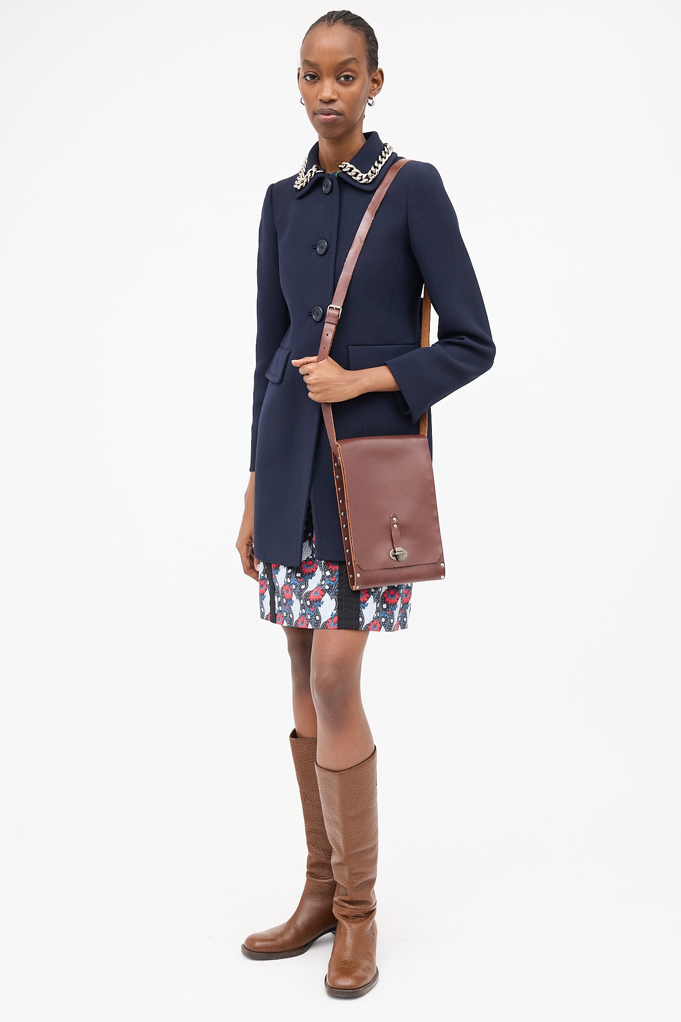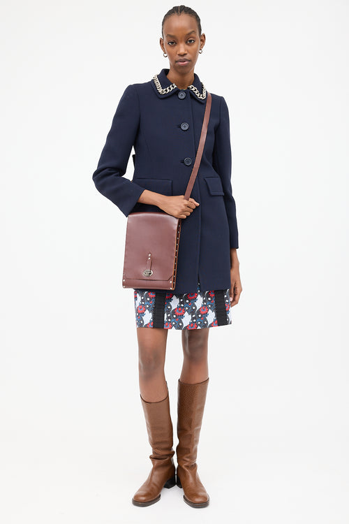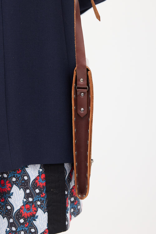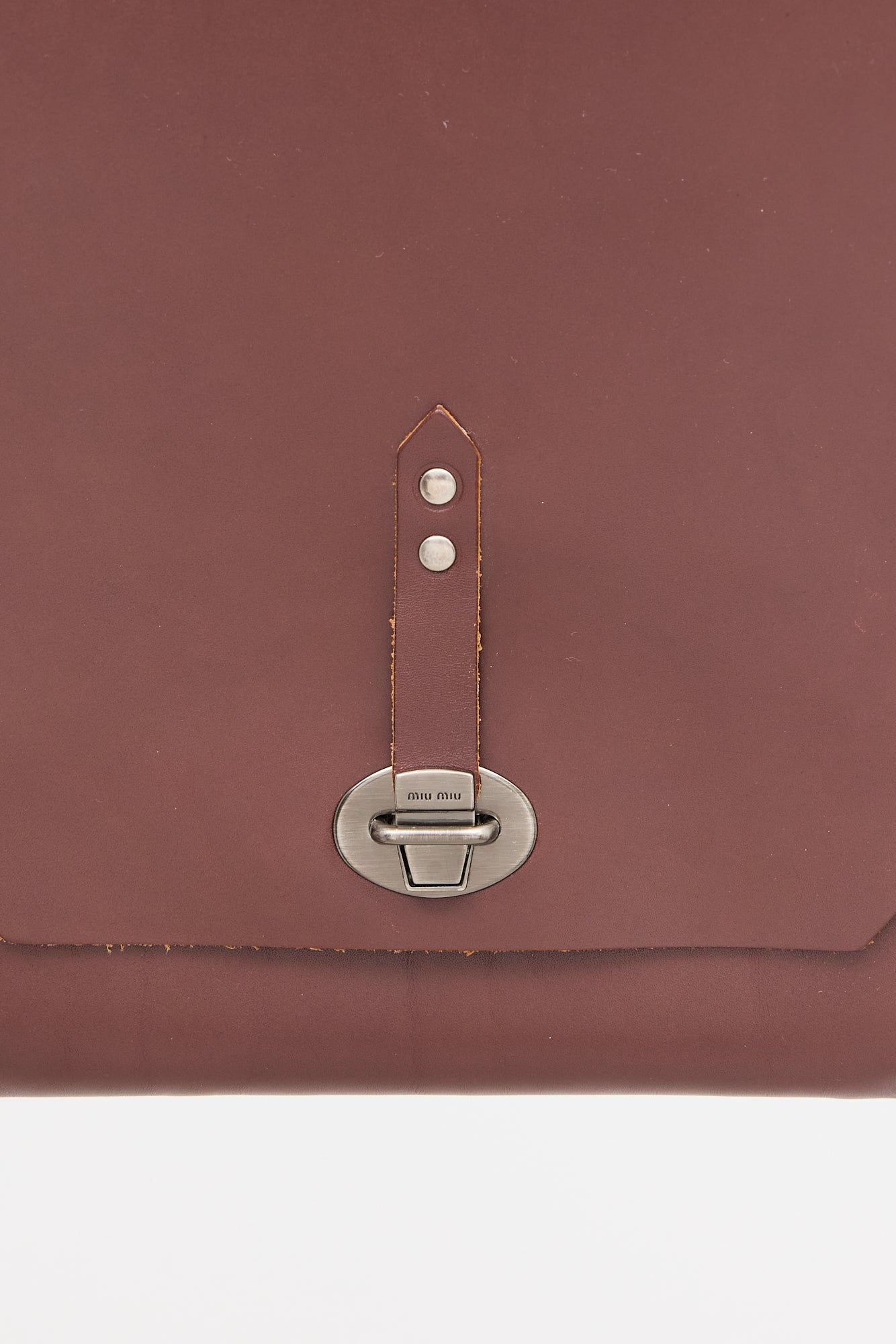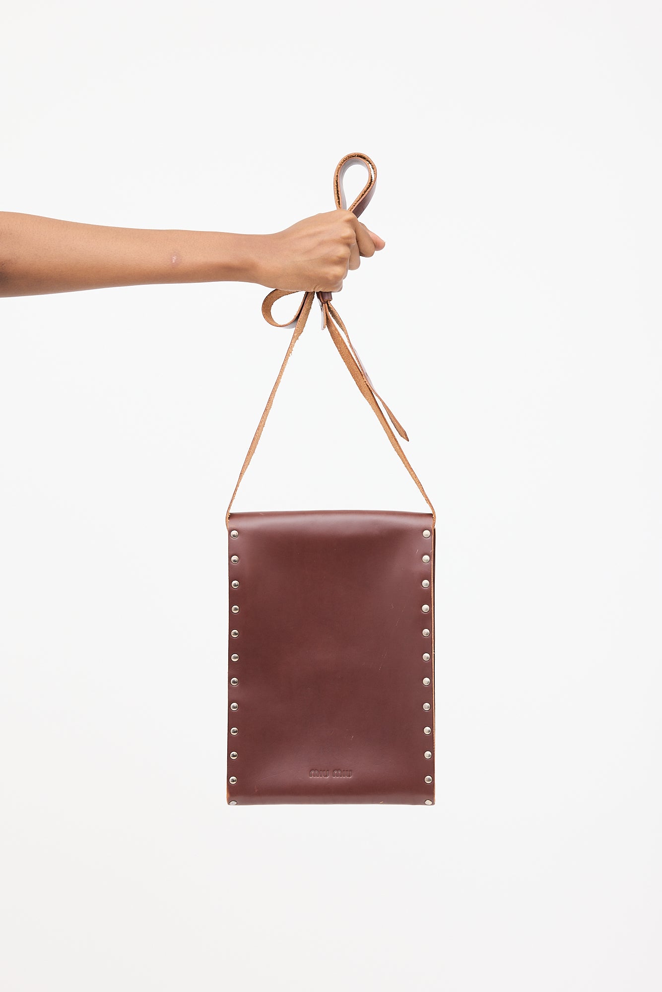 Pre-owned Miu Miu brown leather officer crossbody bag featuring stamped logo at bottom centre back, silver tone hardware, studs along edges, adjustable strap, front flap, tuck lock closure, and one main compartment.