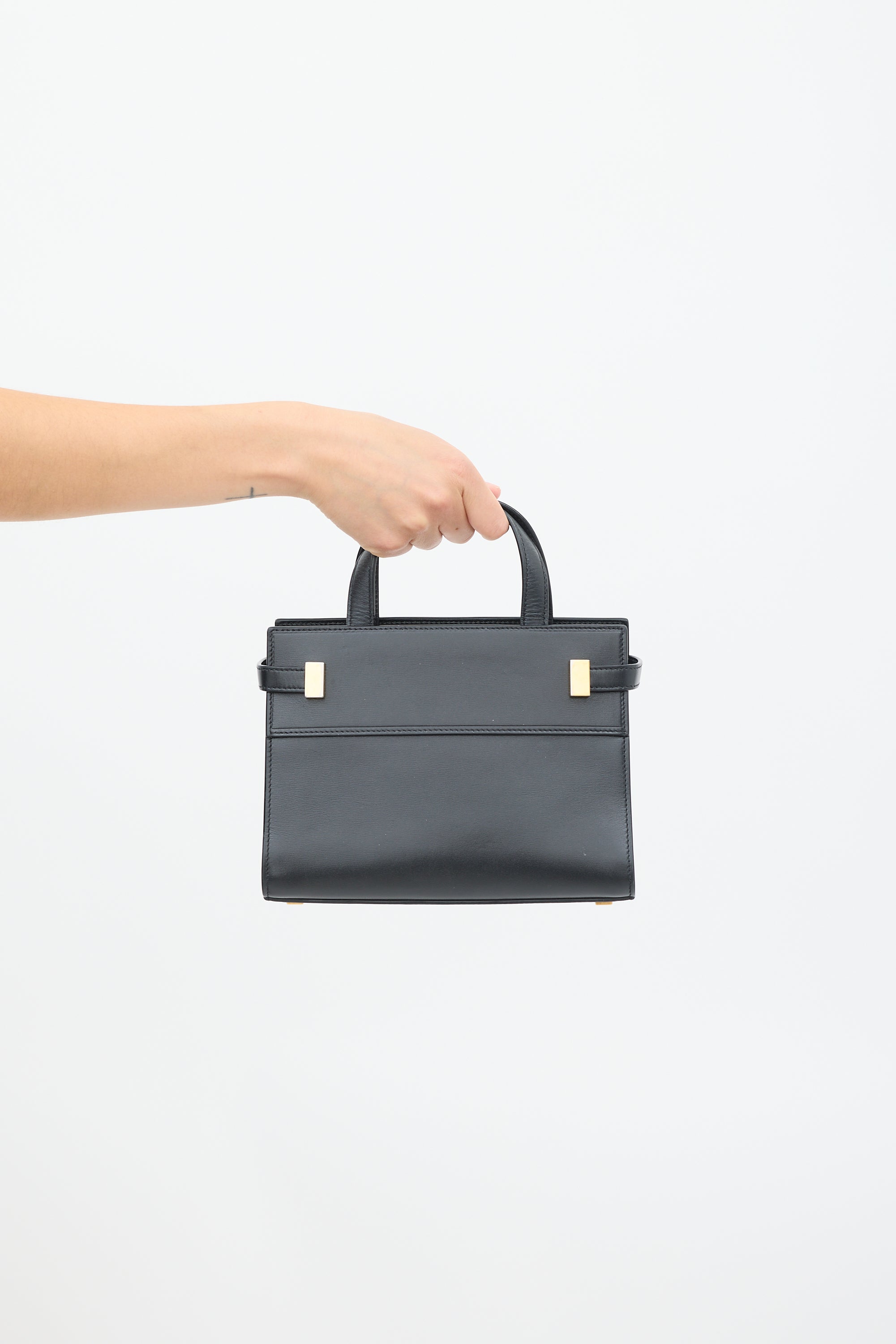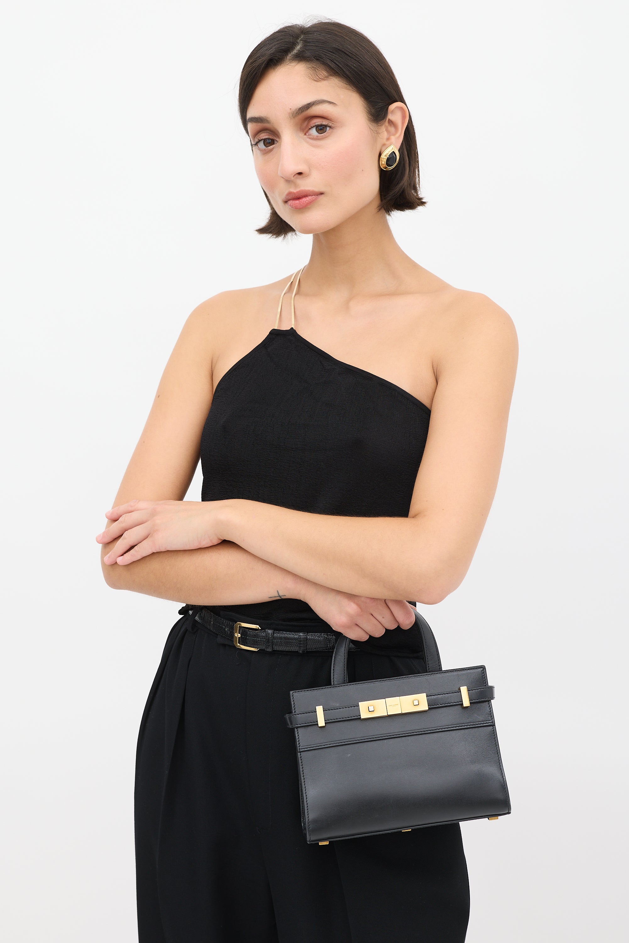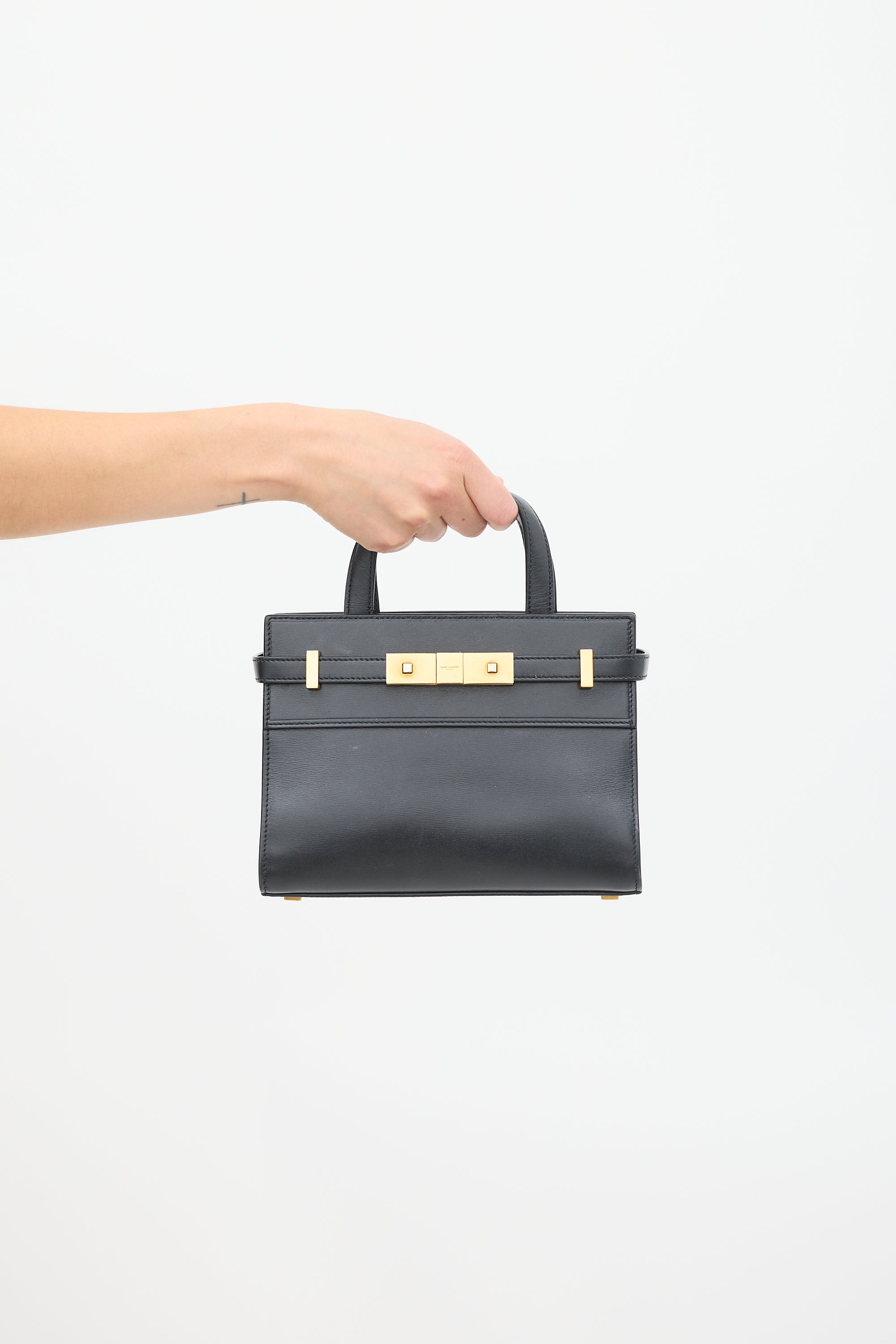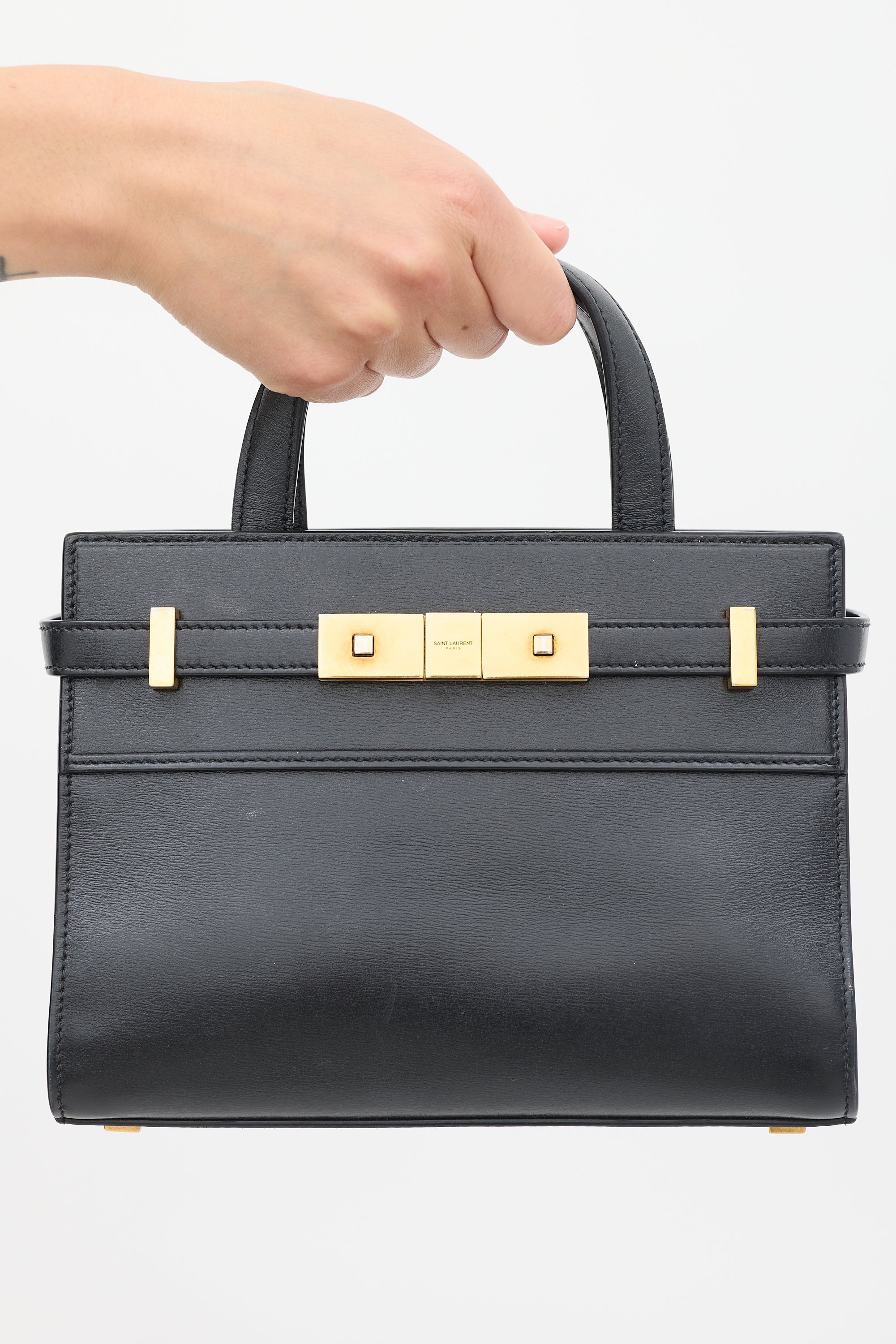 Pre-owned Saint Laurent black leather Manhattan mini bag featuring tonal stitching, gold tone hardware, five protective feet at base, top strap detail with magnetic fastenings and engraved logo at front, dual flat top handles, detachable and adjustable shoulder strap, open top, and one lined main compartment with single slip pocket. Comes with original dust bag.