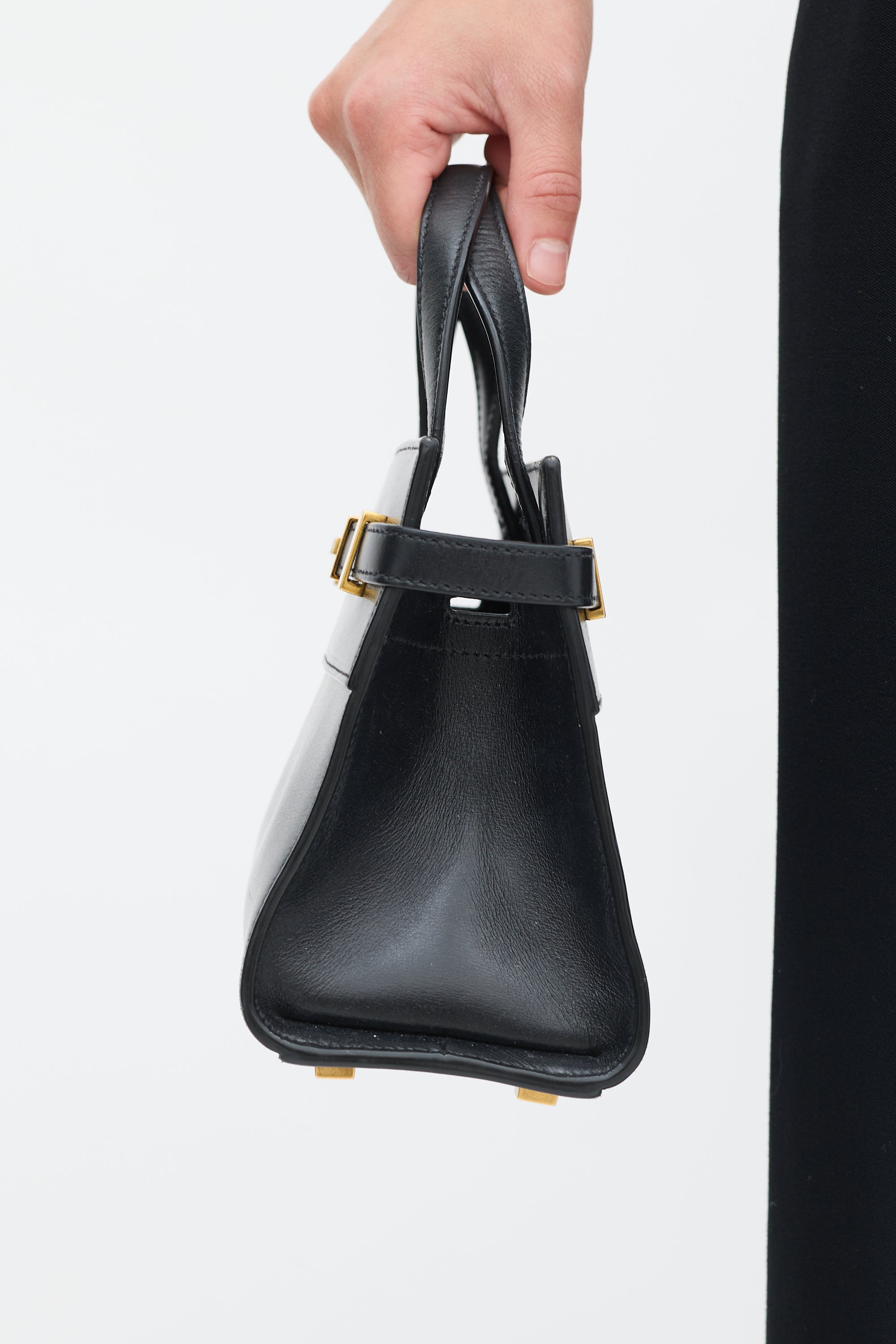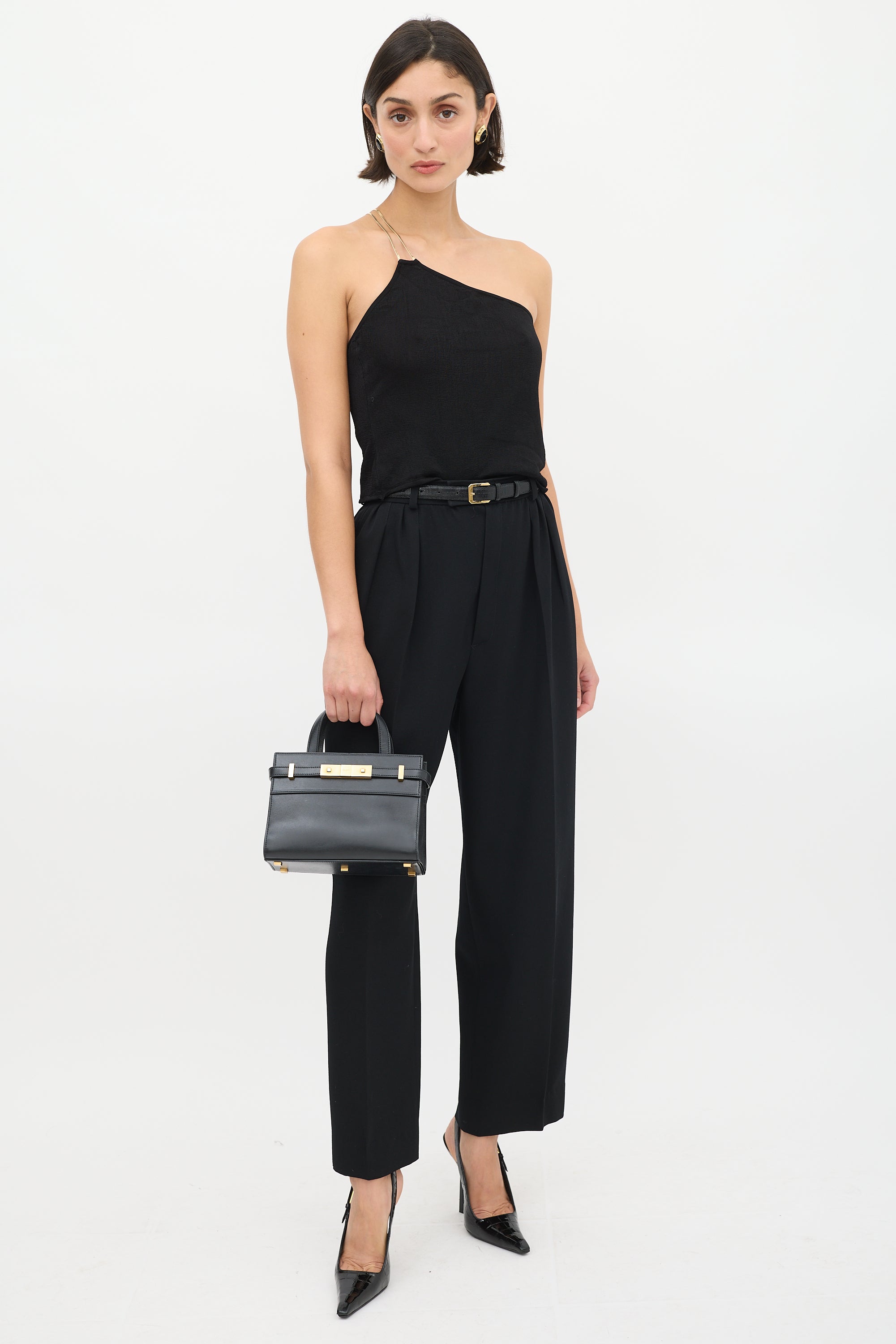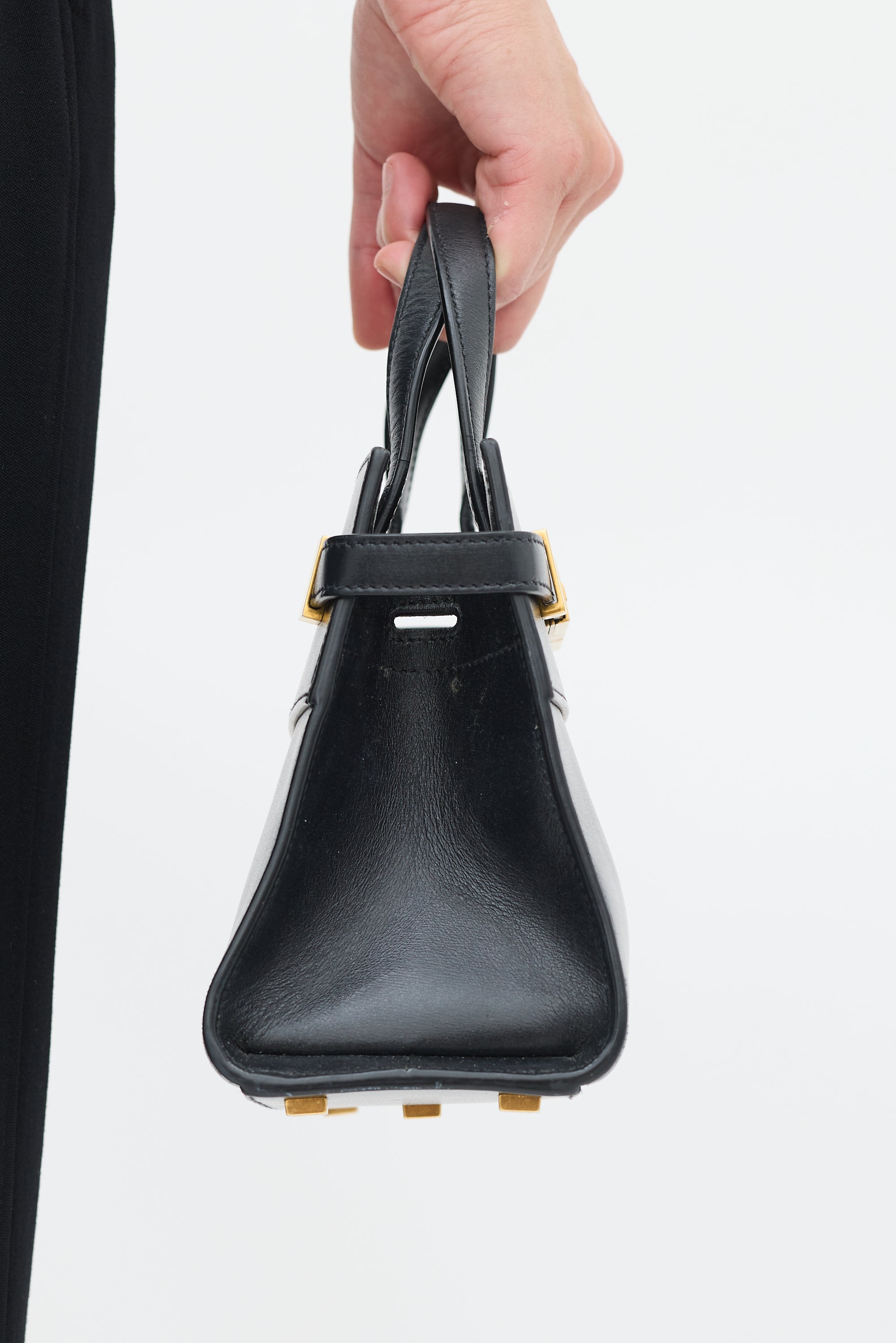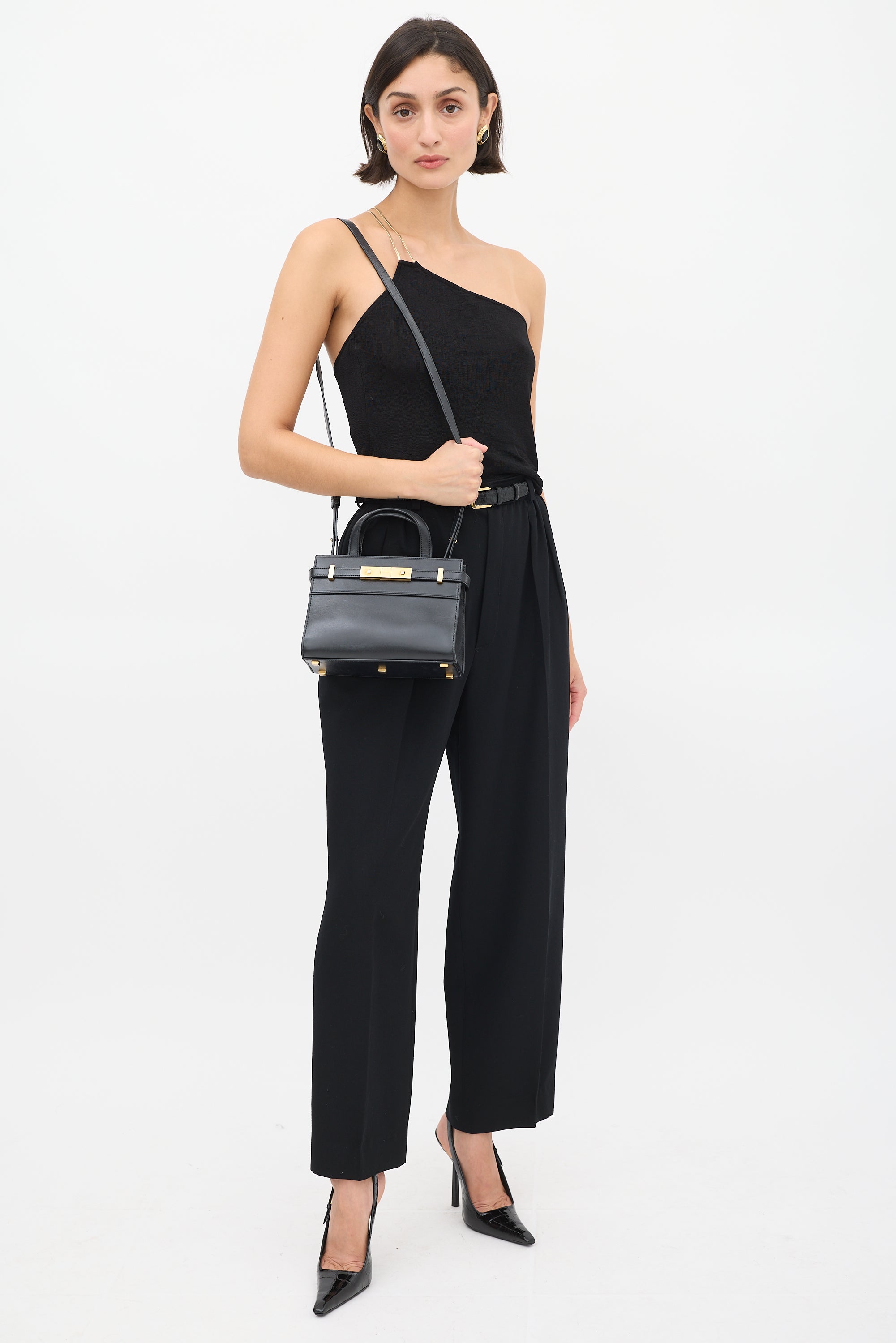 Pre-owned Saint Laurent black leather Manhattan mini bag featuring tonal stitching, gold tone hardware, five protective feet at base, top strap detail with magnetic fastenings and engraved logo at front, dual flat top handles, detachable and adjustable shoulder strap, open top, and one lined main compartment with single slip pocket. Comes with original dust bag.