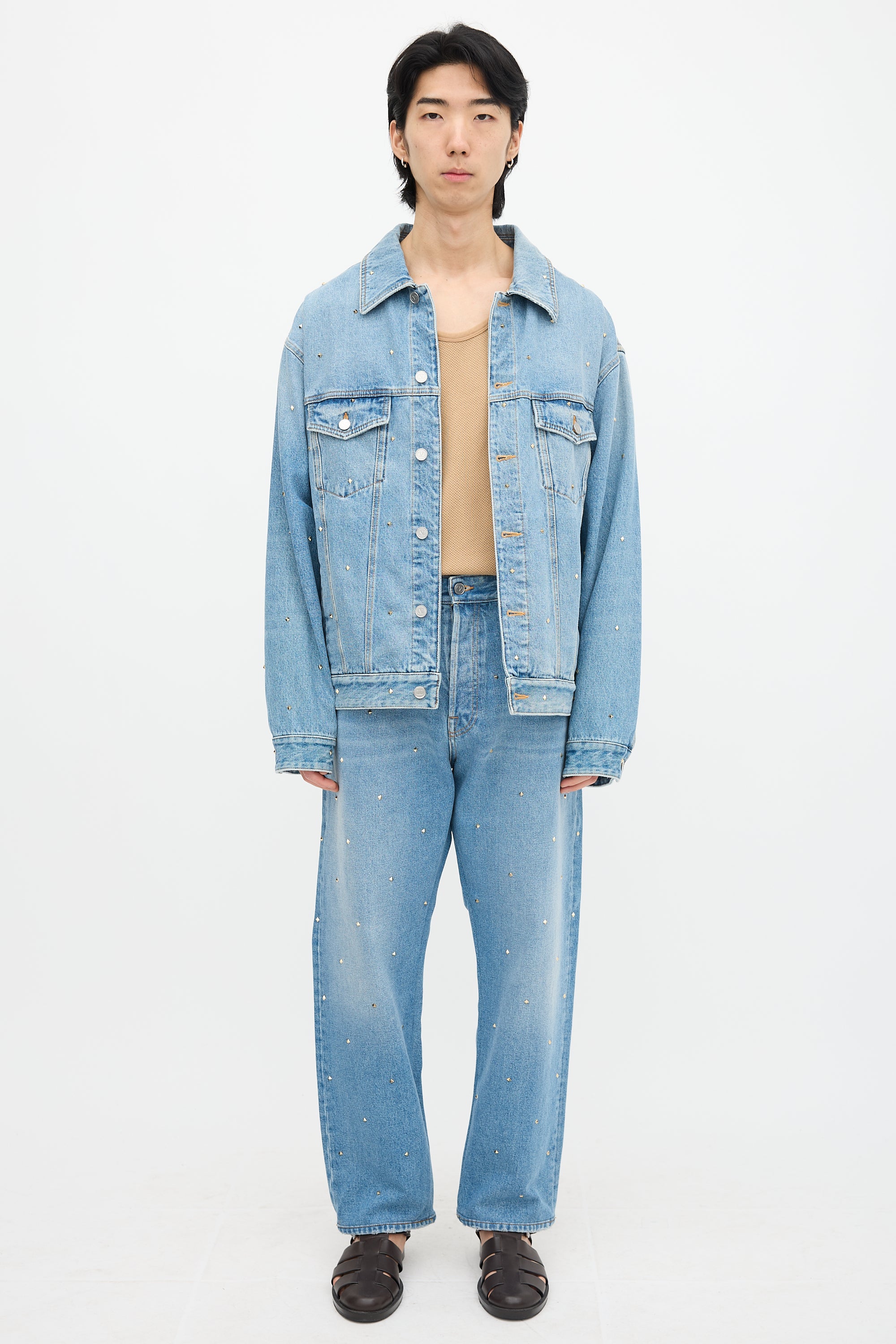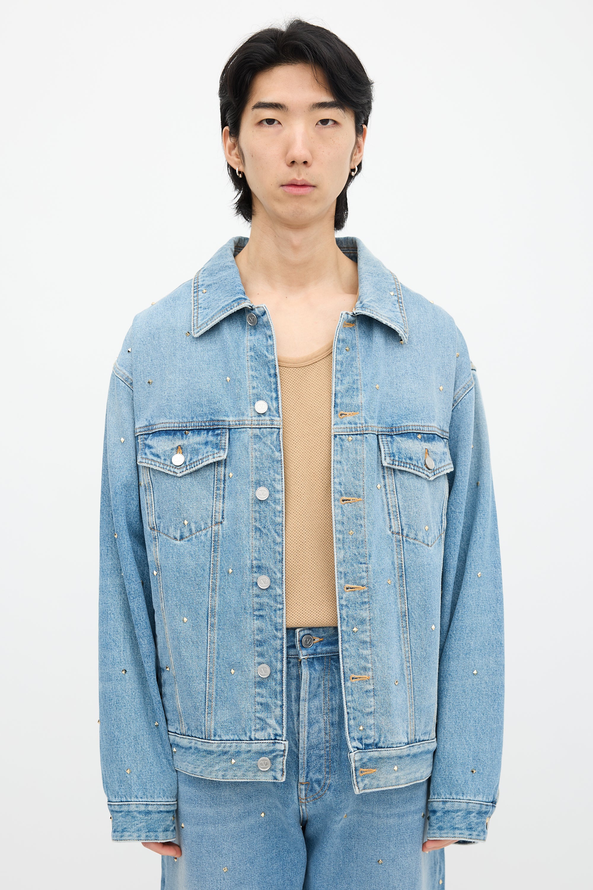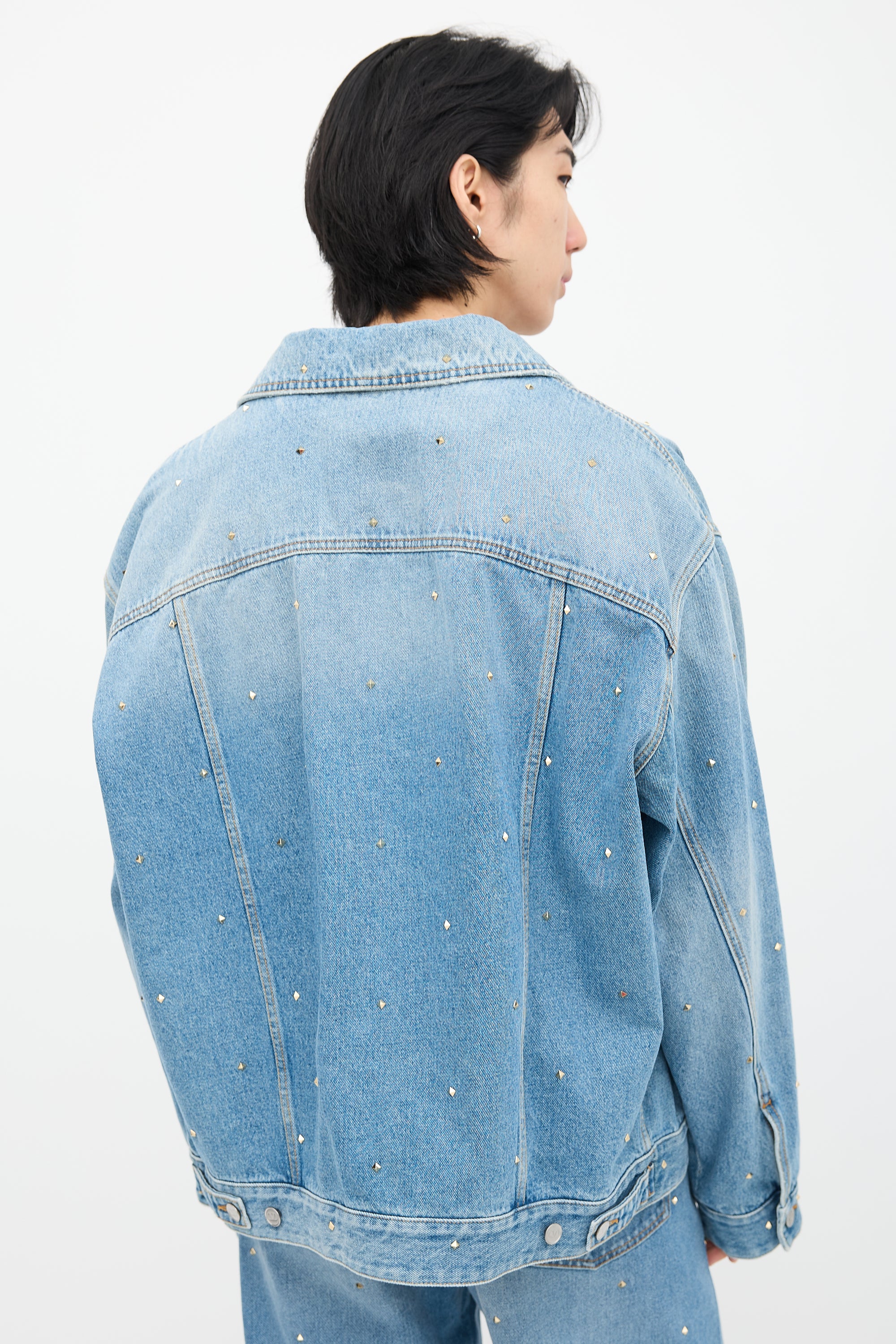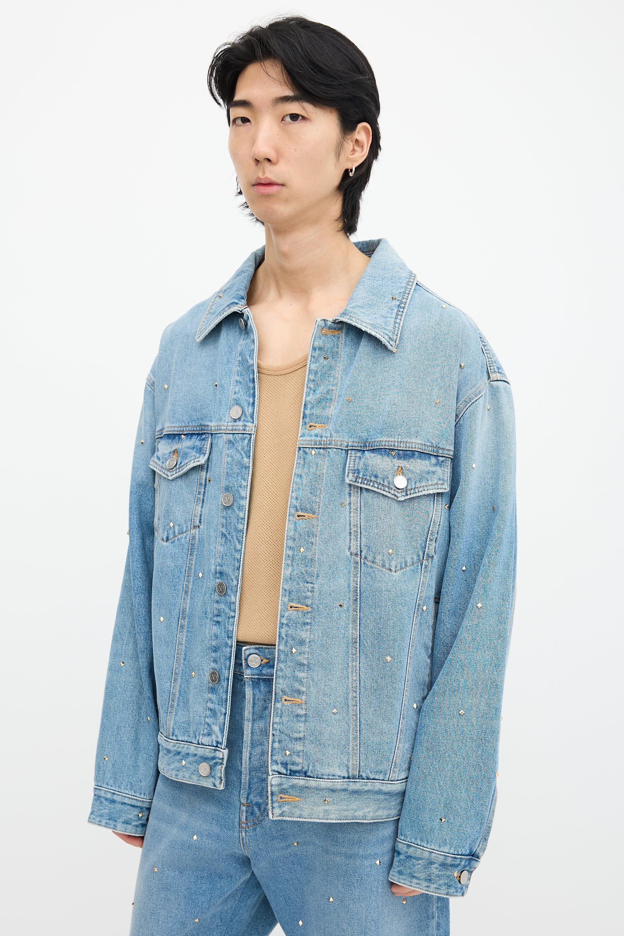 Pre-owned Valentino light wash denim jacket featuring allover Rockstud embellishment, spread collar, button up front, four front pockets, adjustable hem, and buttoned cuffs.