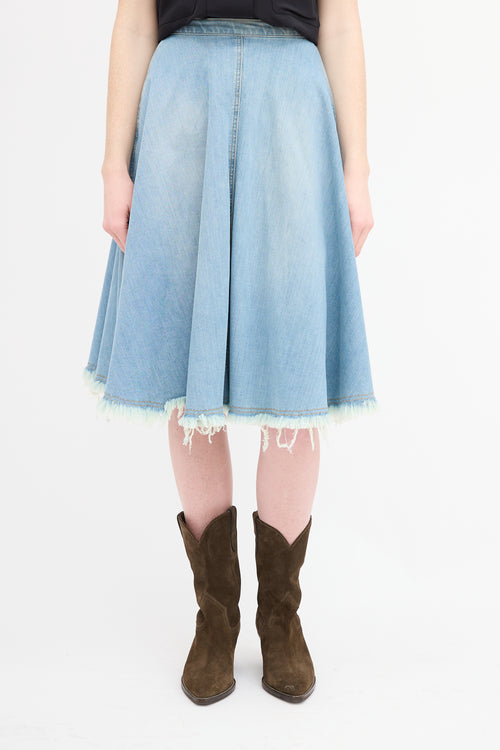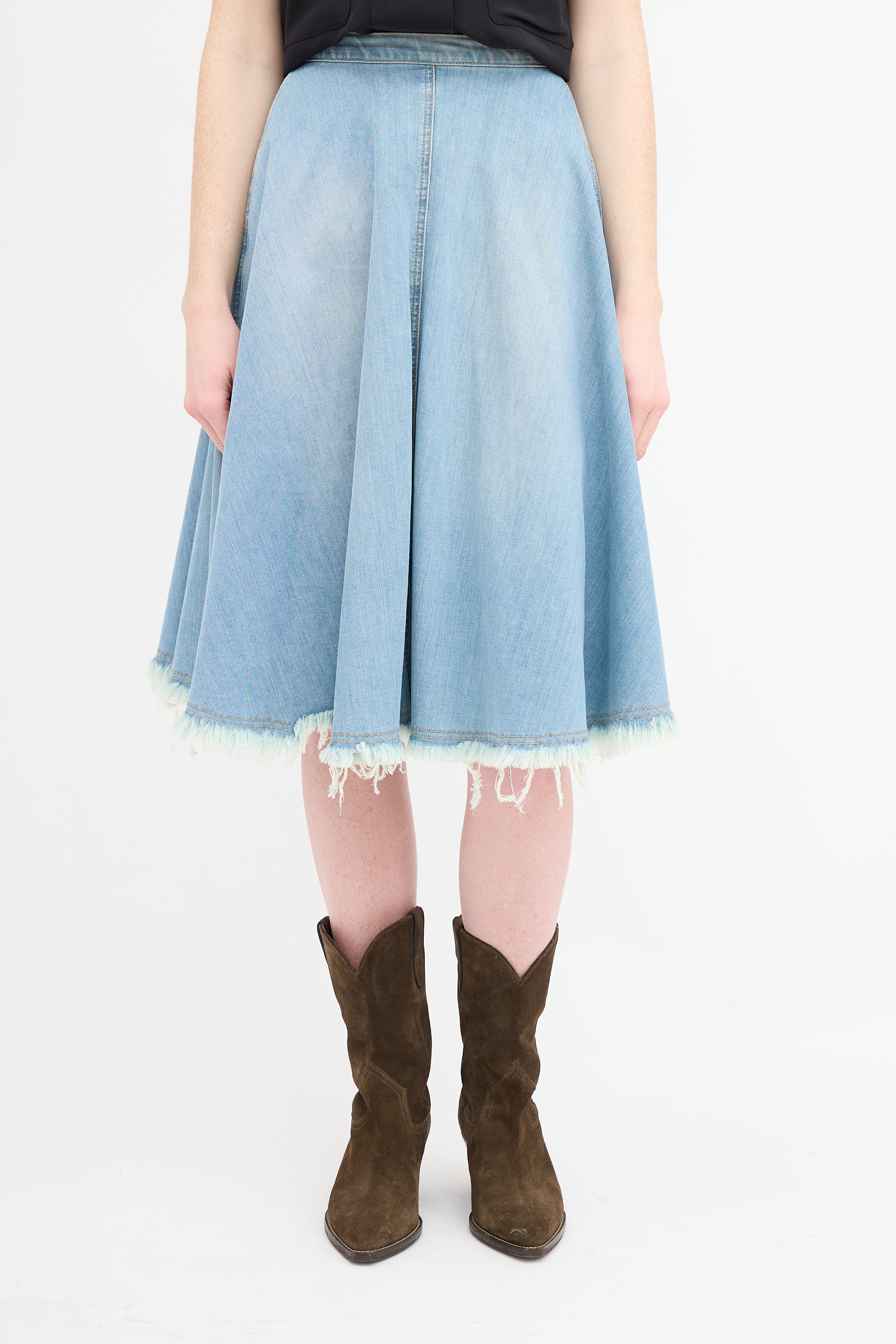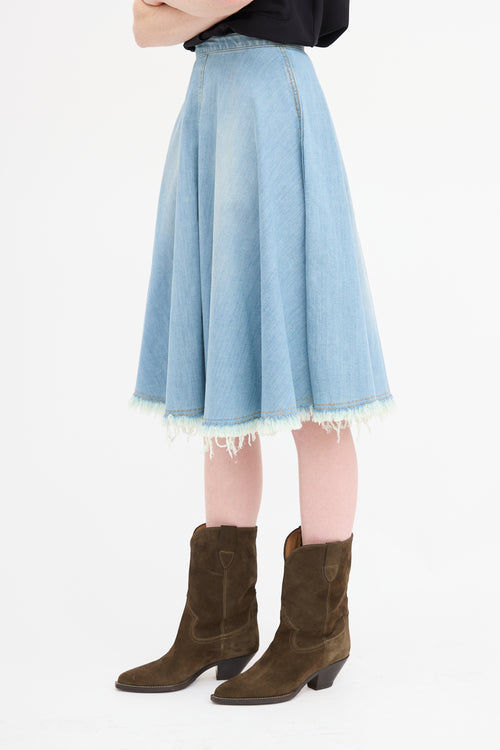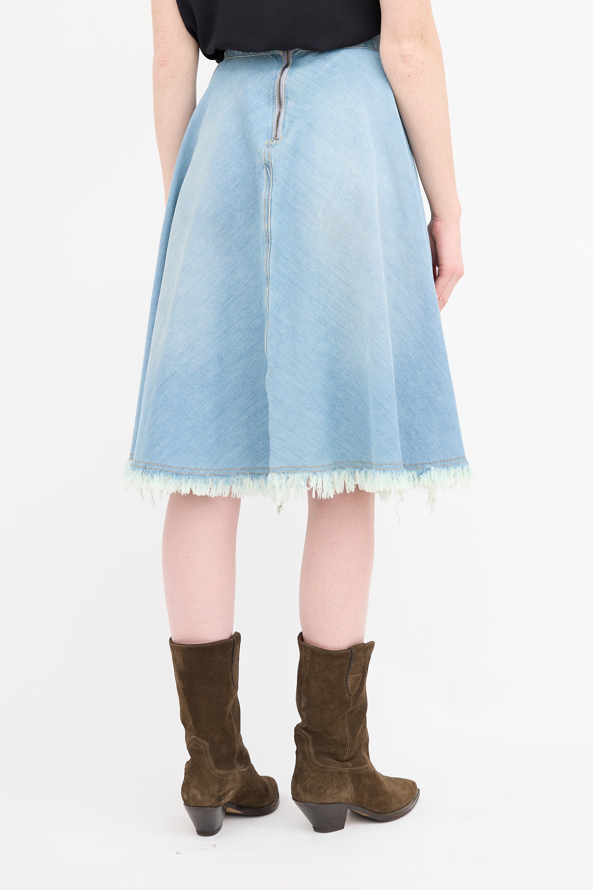 Pre-owned Rachel Comey light wash denim skirt featuring zip closure at side and raw hem.