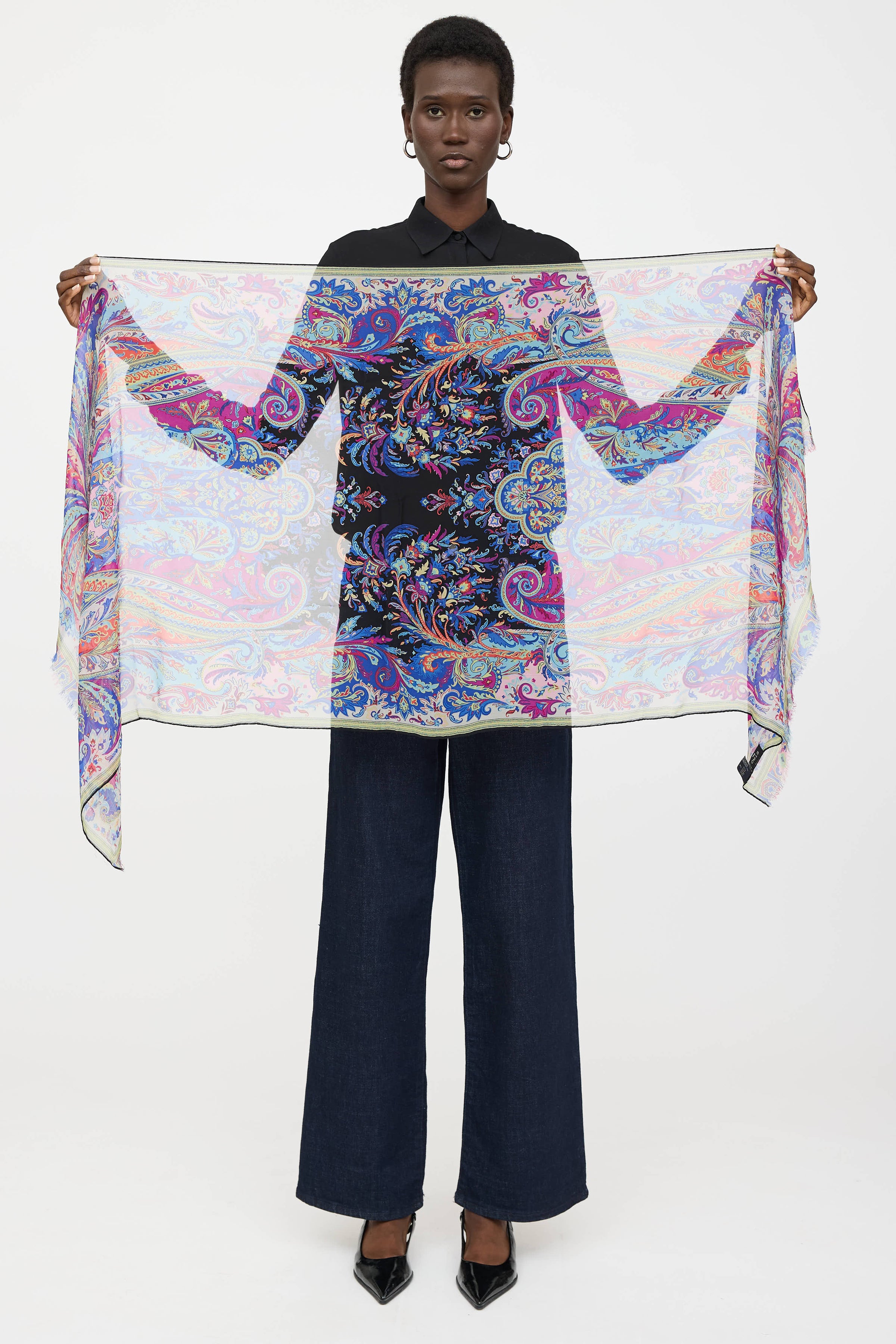 Pre-owned Etro blue silk scarf featuring a multicolour paisley pattern throughout, rolled edges, and fringe trim.