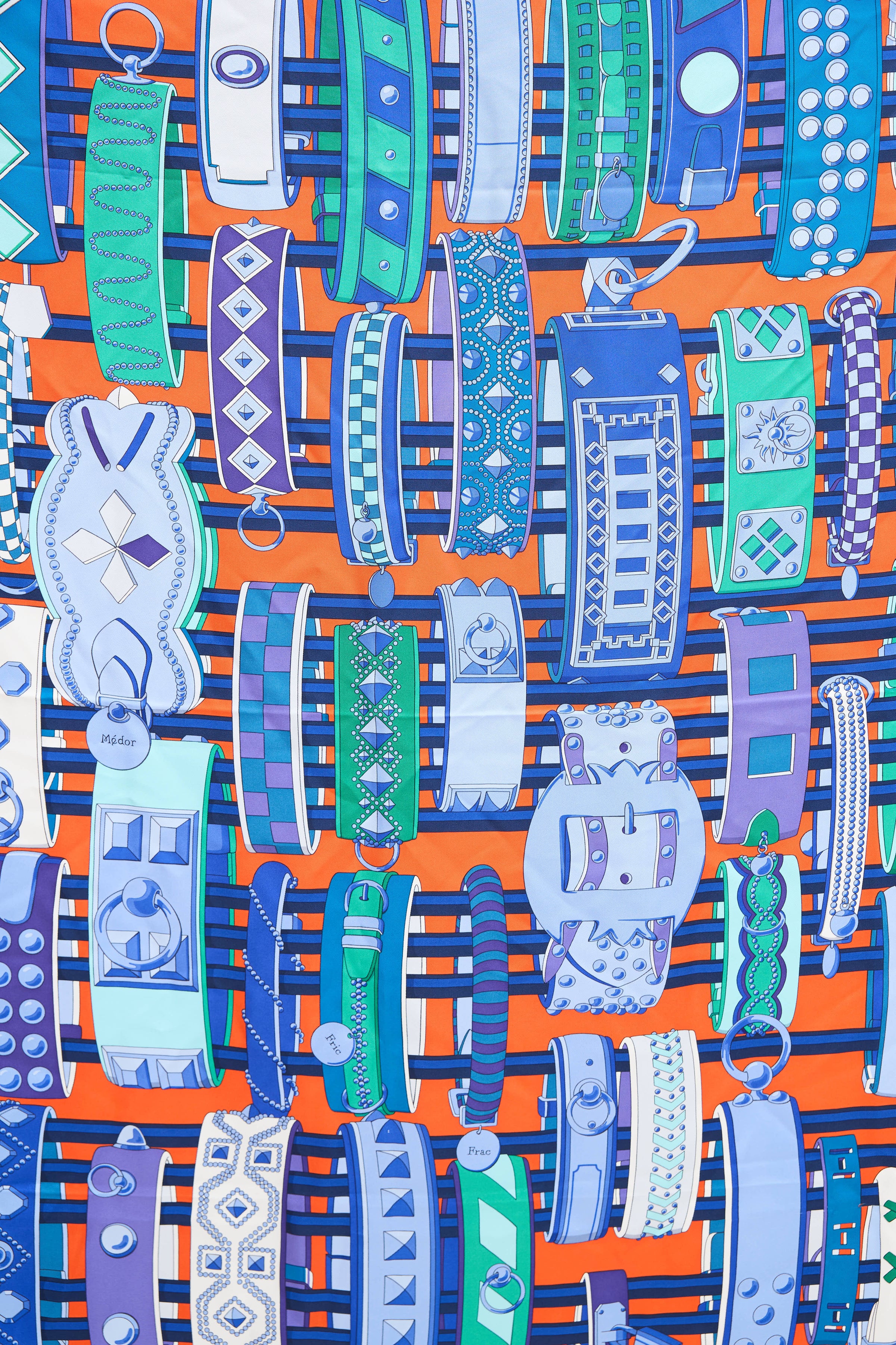 Pre-owned Hermès blue and multicolor silk scarf featuring Collier de Chien print by Virginie Jamin and hand rolled edges.