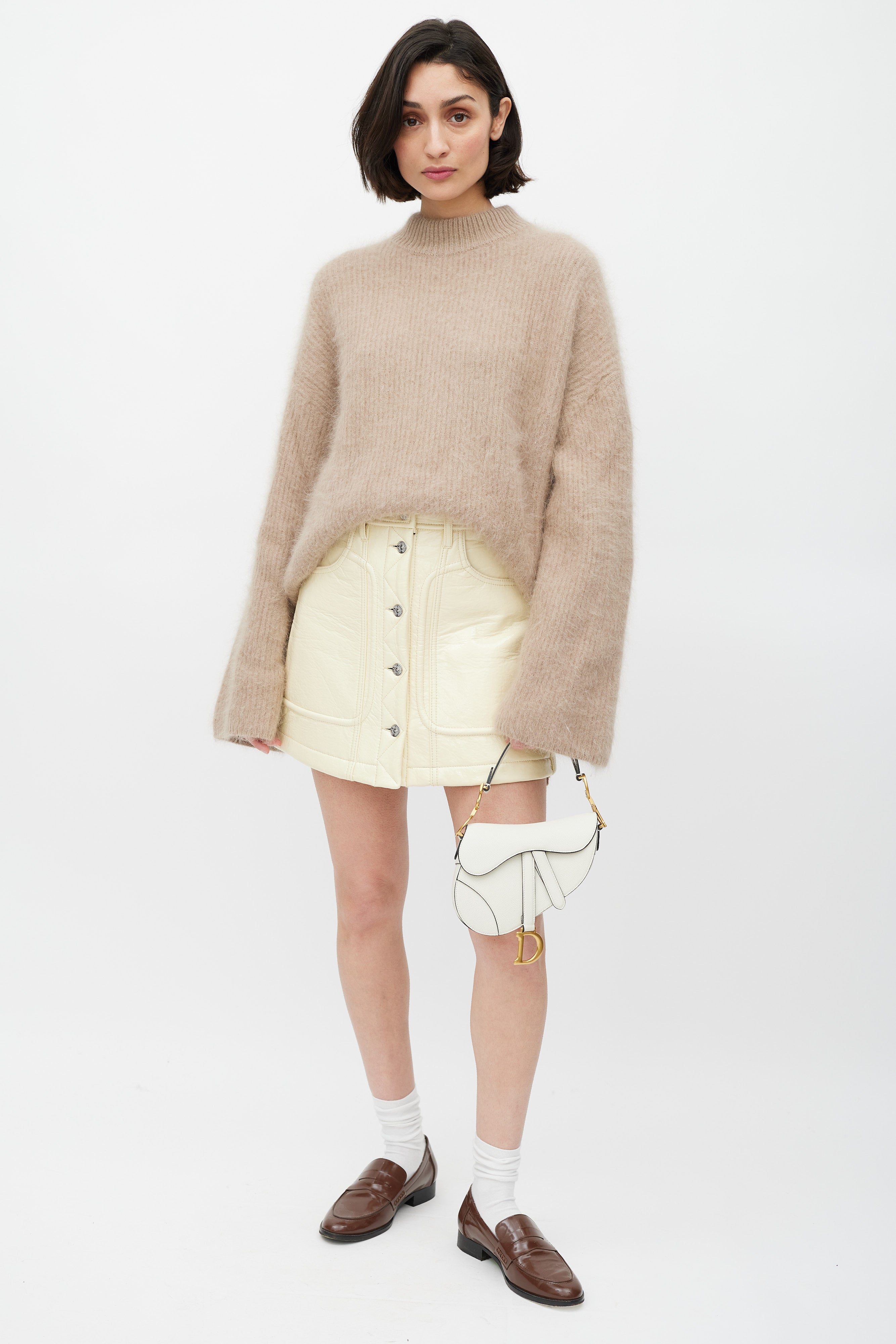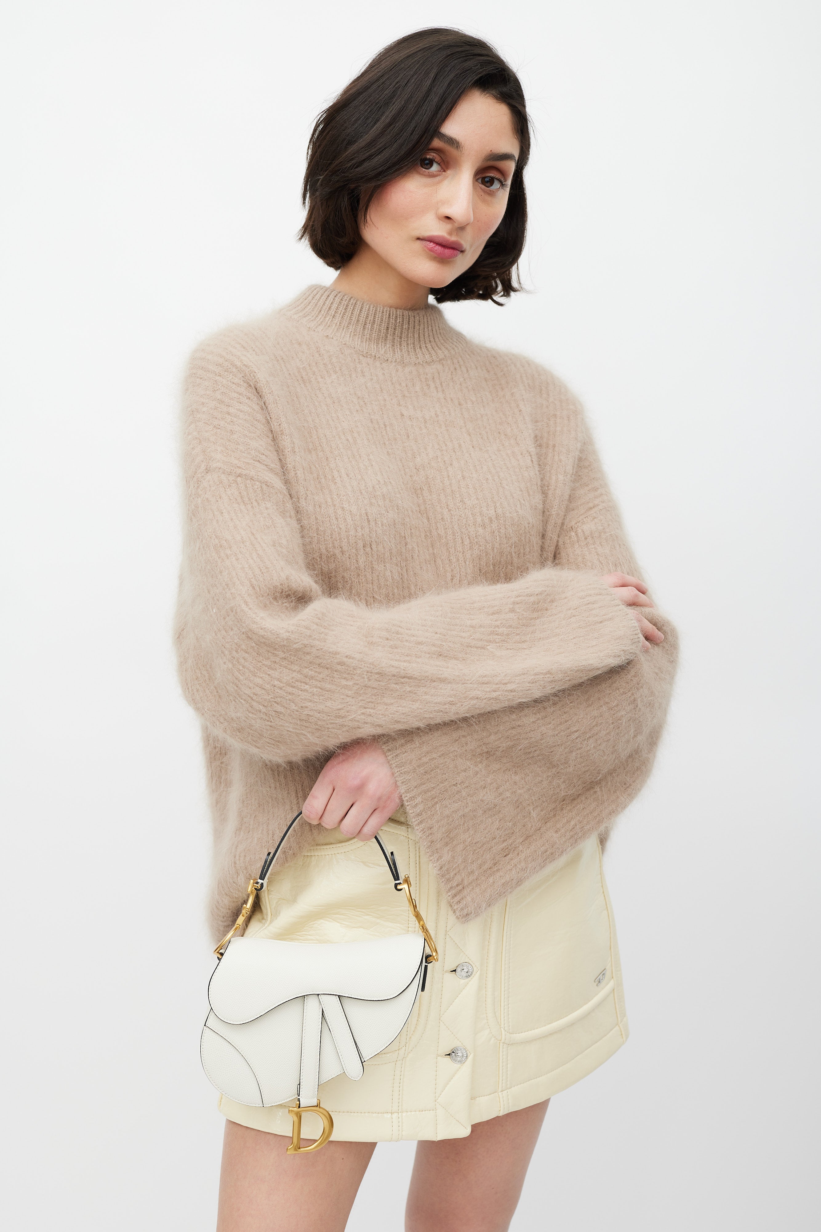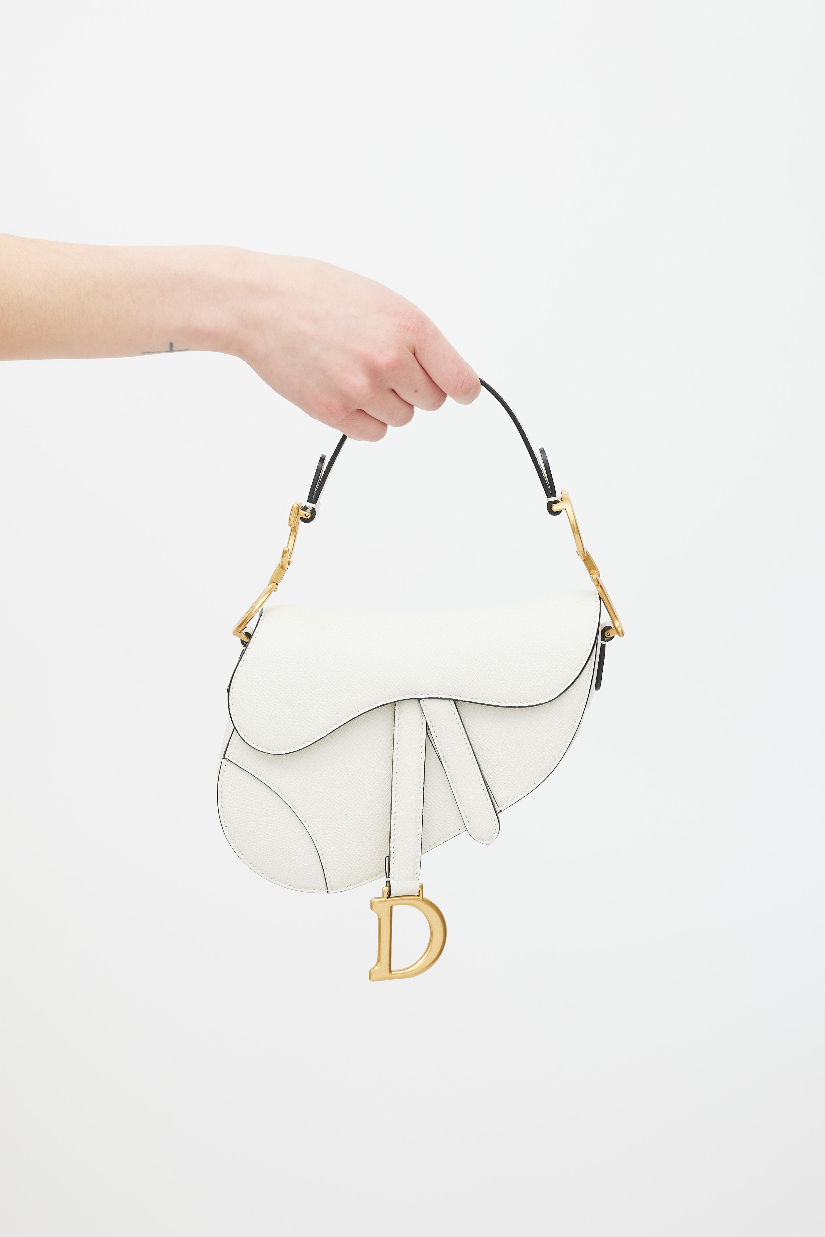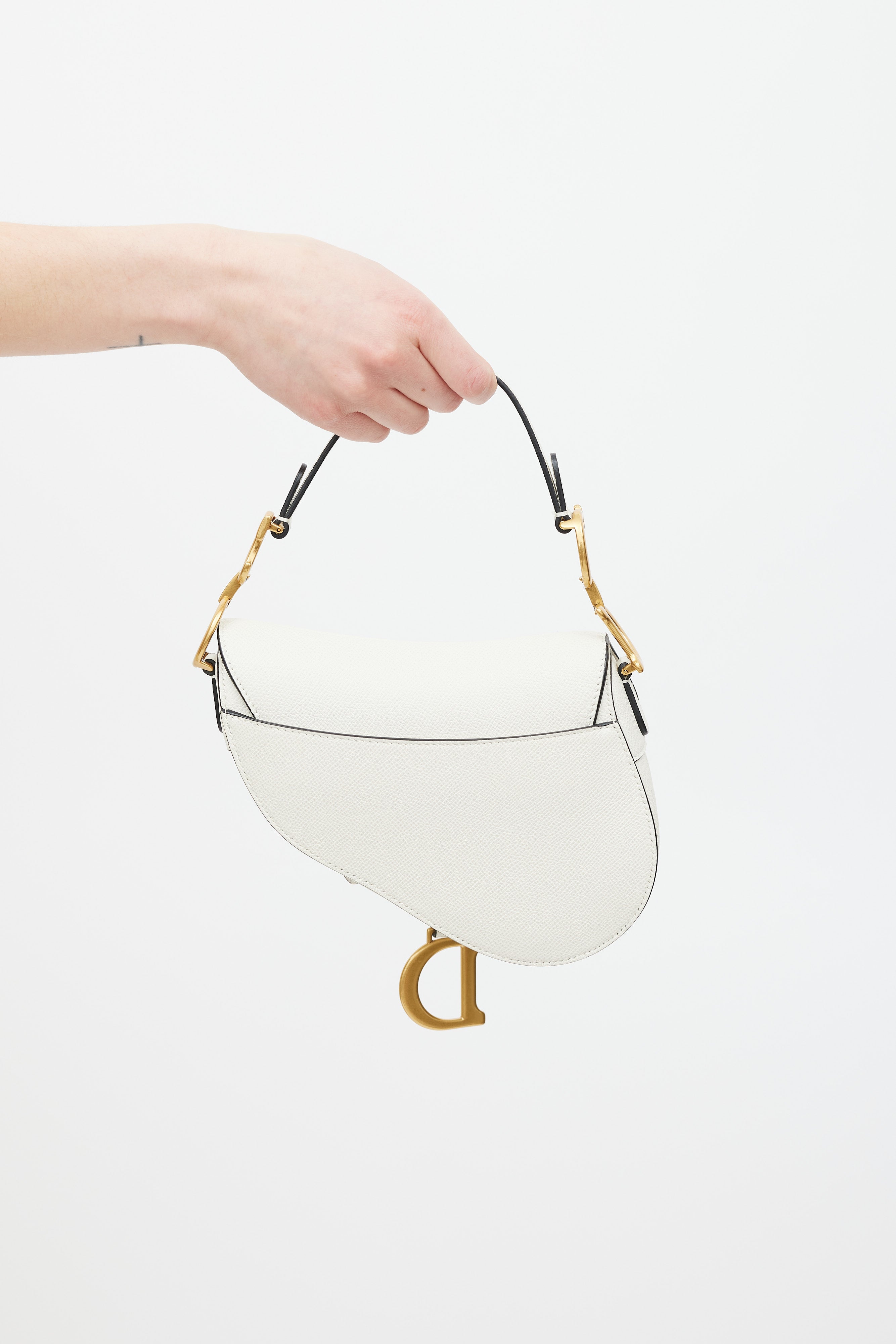 Pre-owned Christian Dior 2020 white leather Mini Saddle bag featuring a single handle with gold tone CD logo hardware, curved saddle body, slip pocket at outer back, top flap with magnetic closure and strap detail with D logo hardware, and one main compartment.