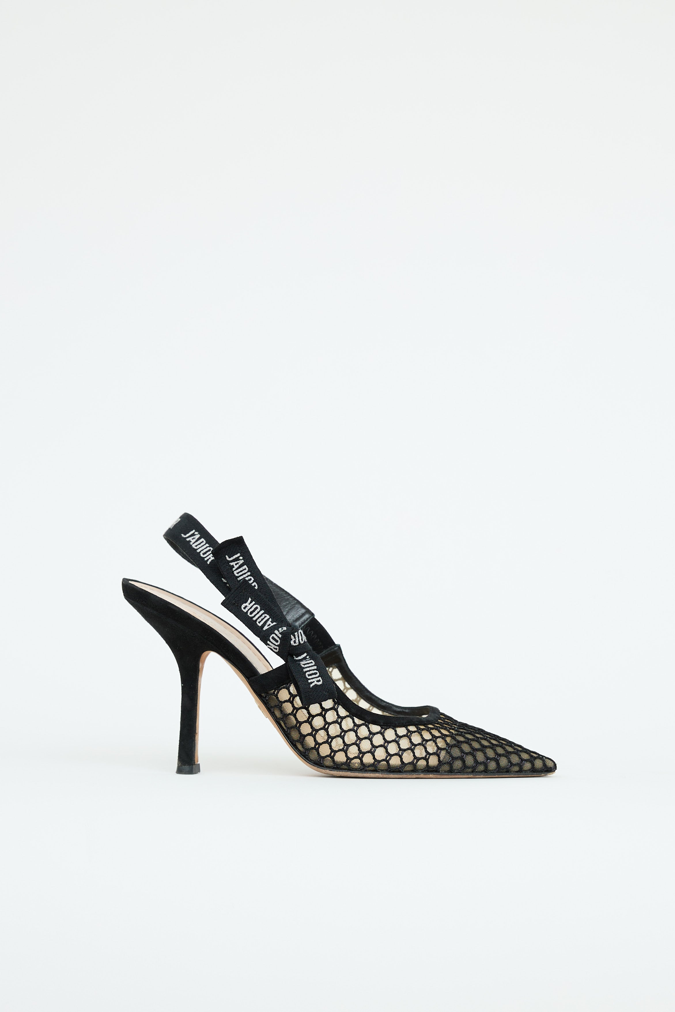 Pre-owned Dior black mesh slingback pump featuring a pointed mesh toe, elastic slingback with embroidered J'Adior logos, wrapped heel, and leather insole and outsole.