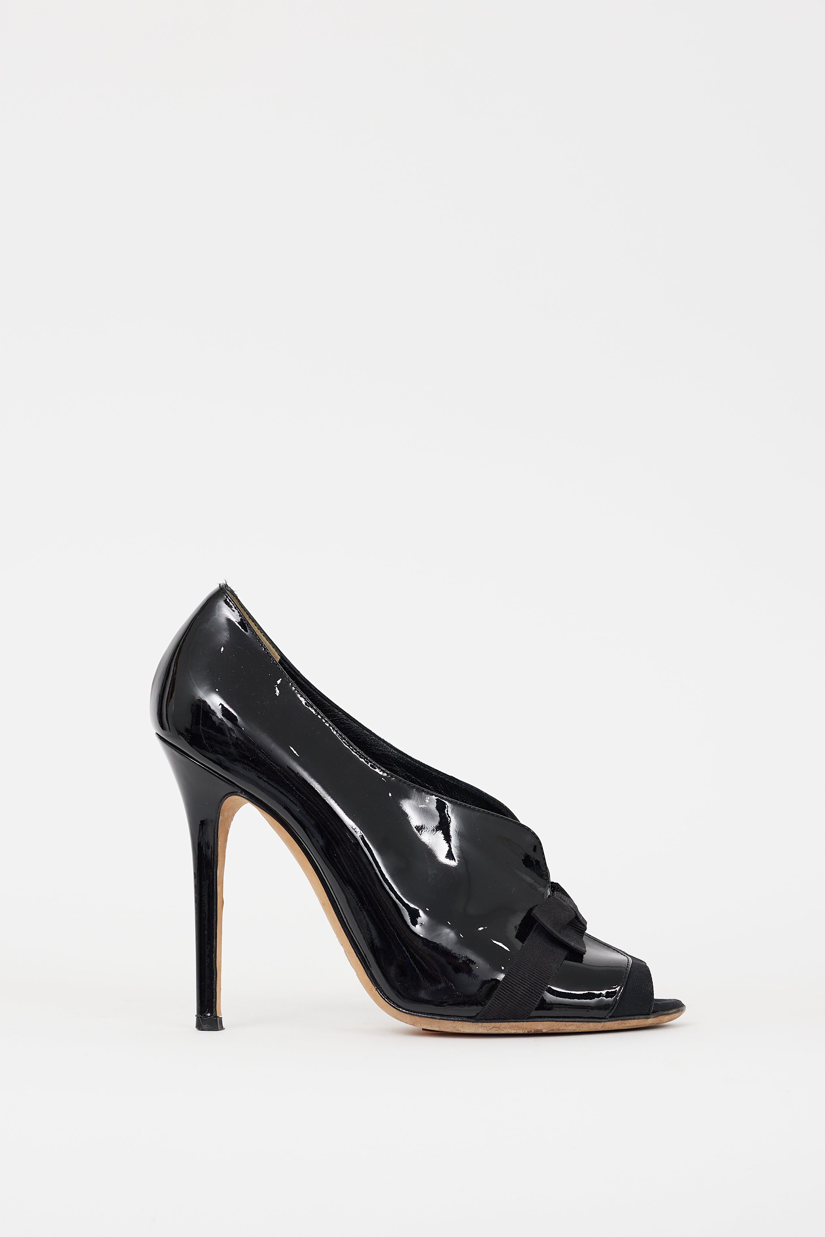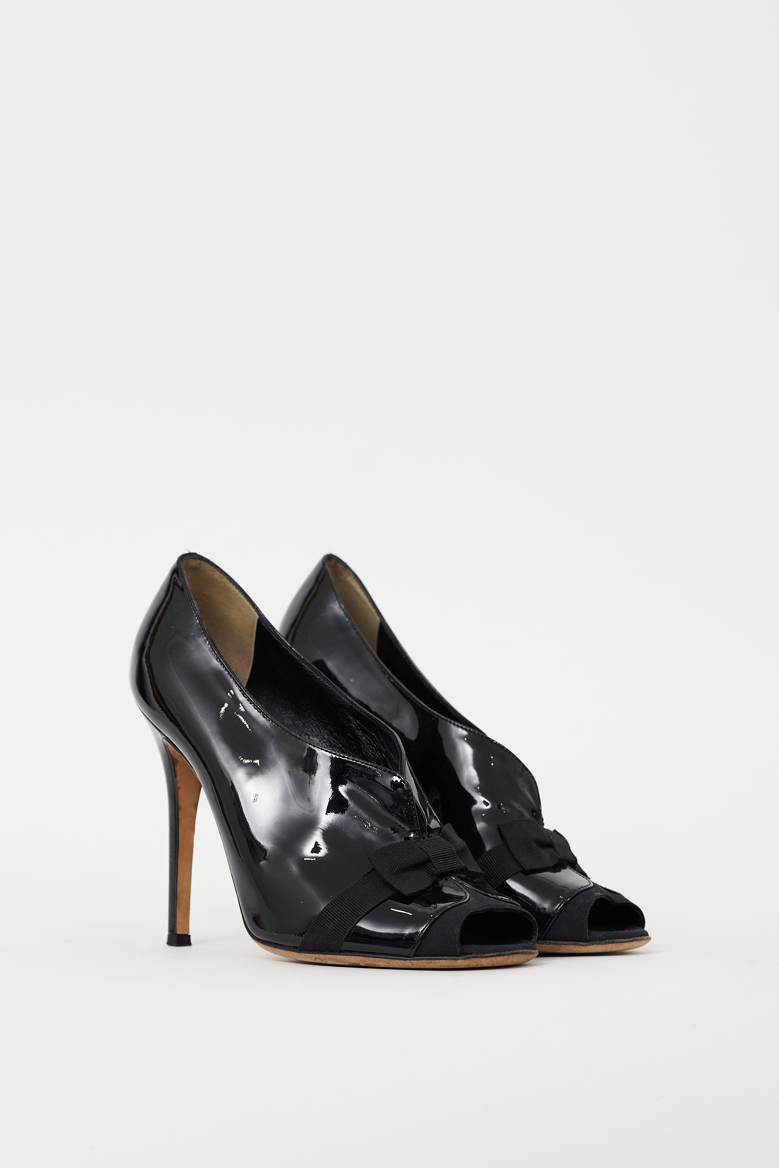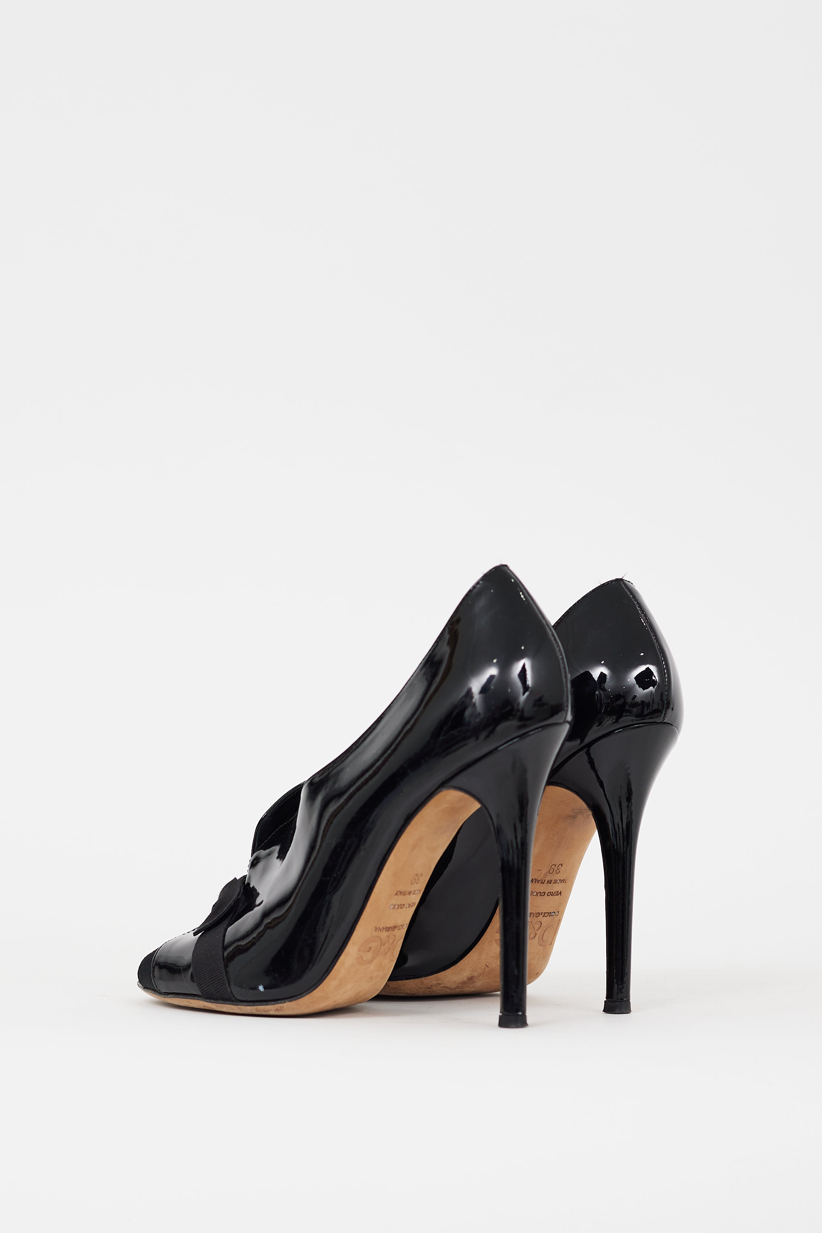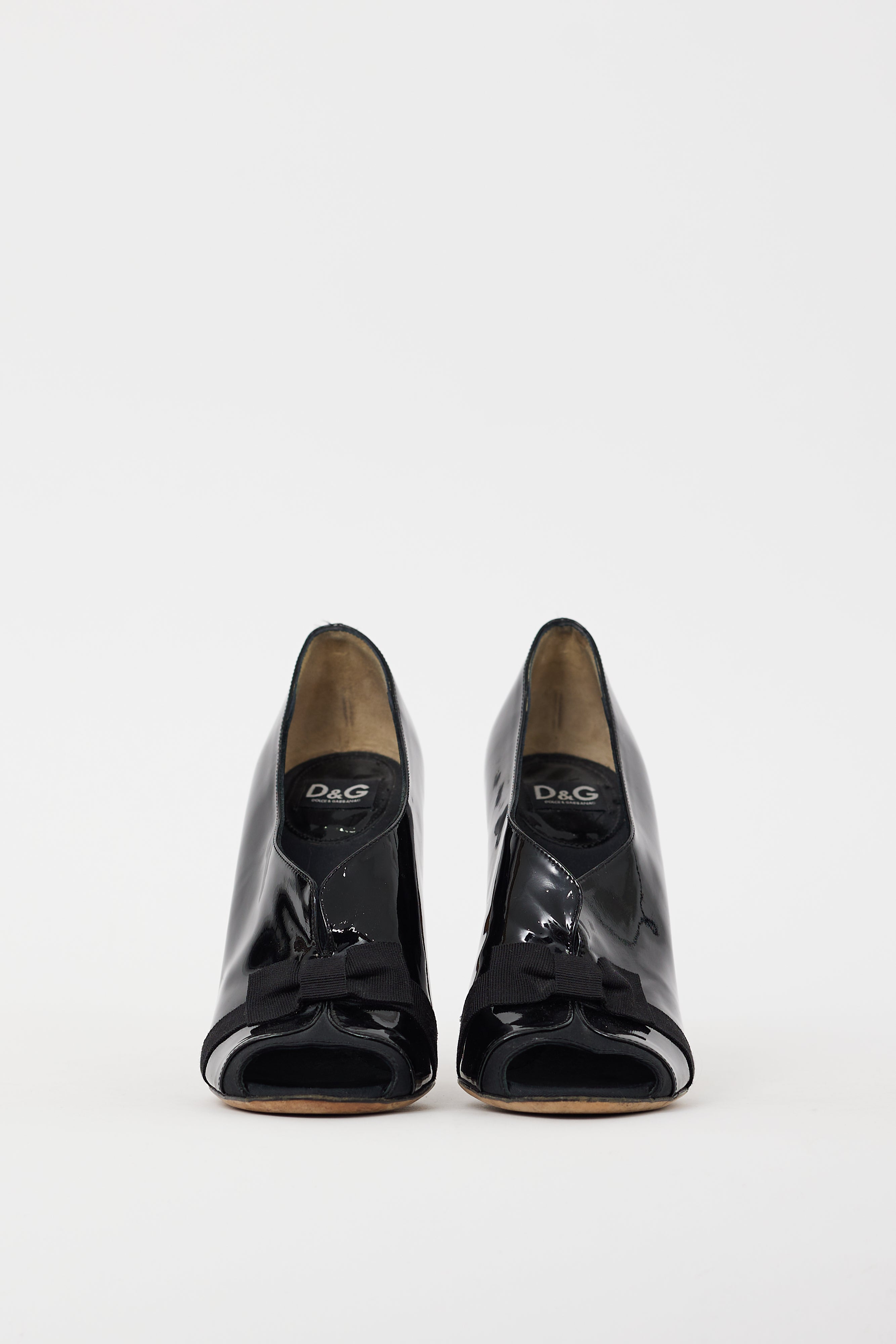 Pre-owned D&G black patent leather heels featuring a peep toe, wrapped stiletto heel, webbed bow detail at vamp, and slip on entry.
