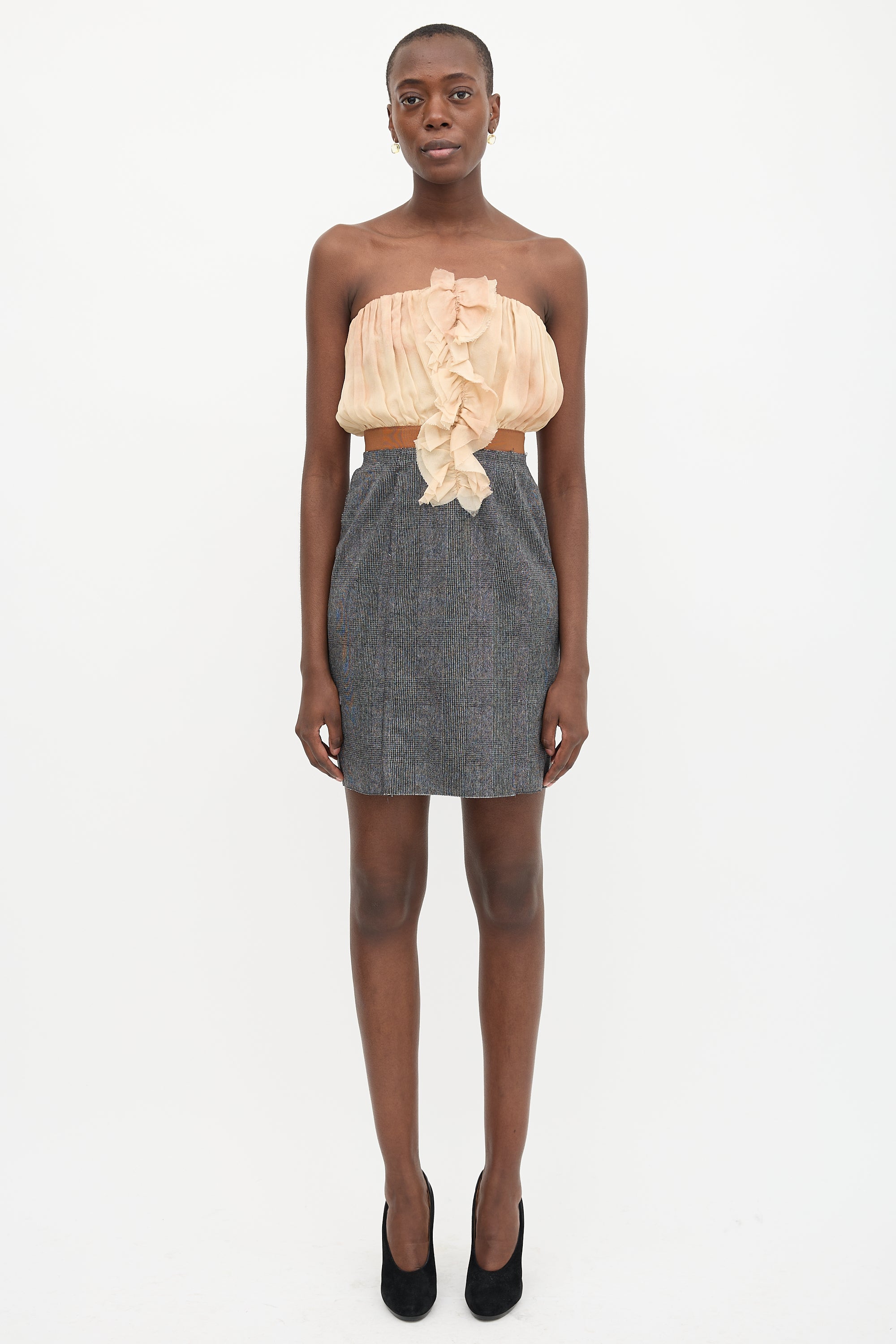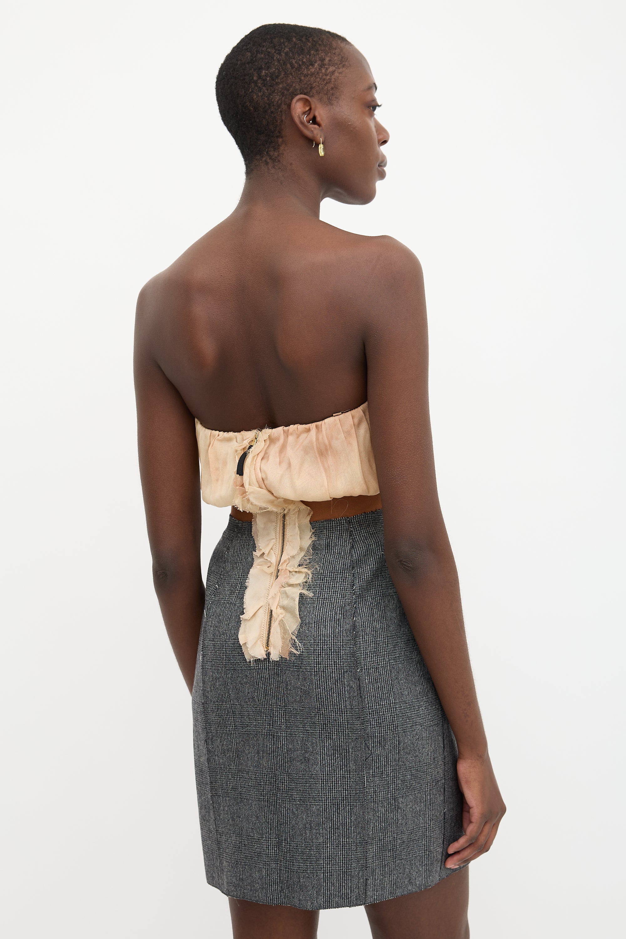 Pre-owned Dolce & Gabbana D&G beige chiffon and grey tweed strapless dress featuring front chest ruffle, interior corset top, grosgrain waistband, and back zip closure.