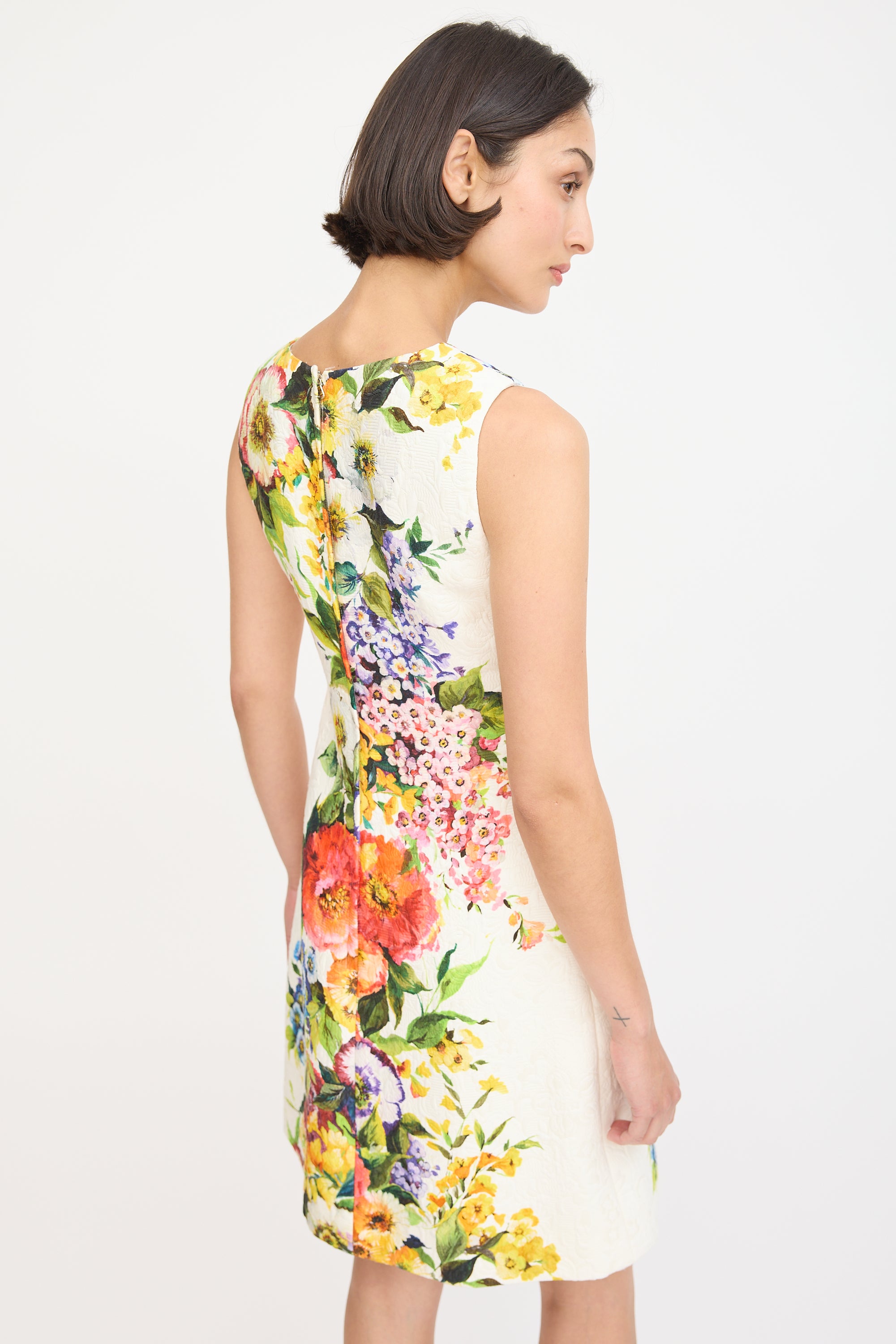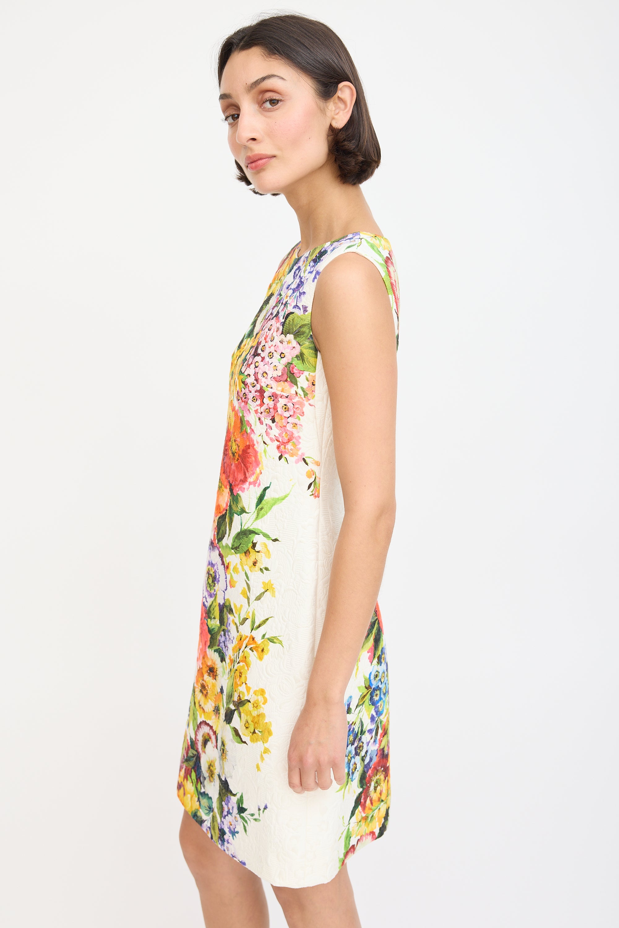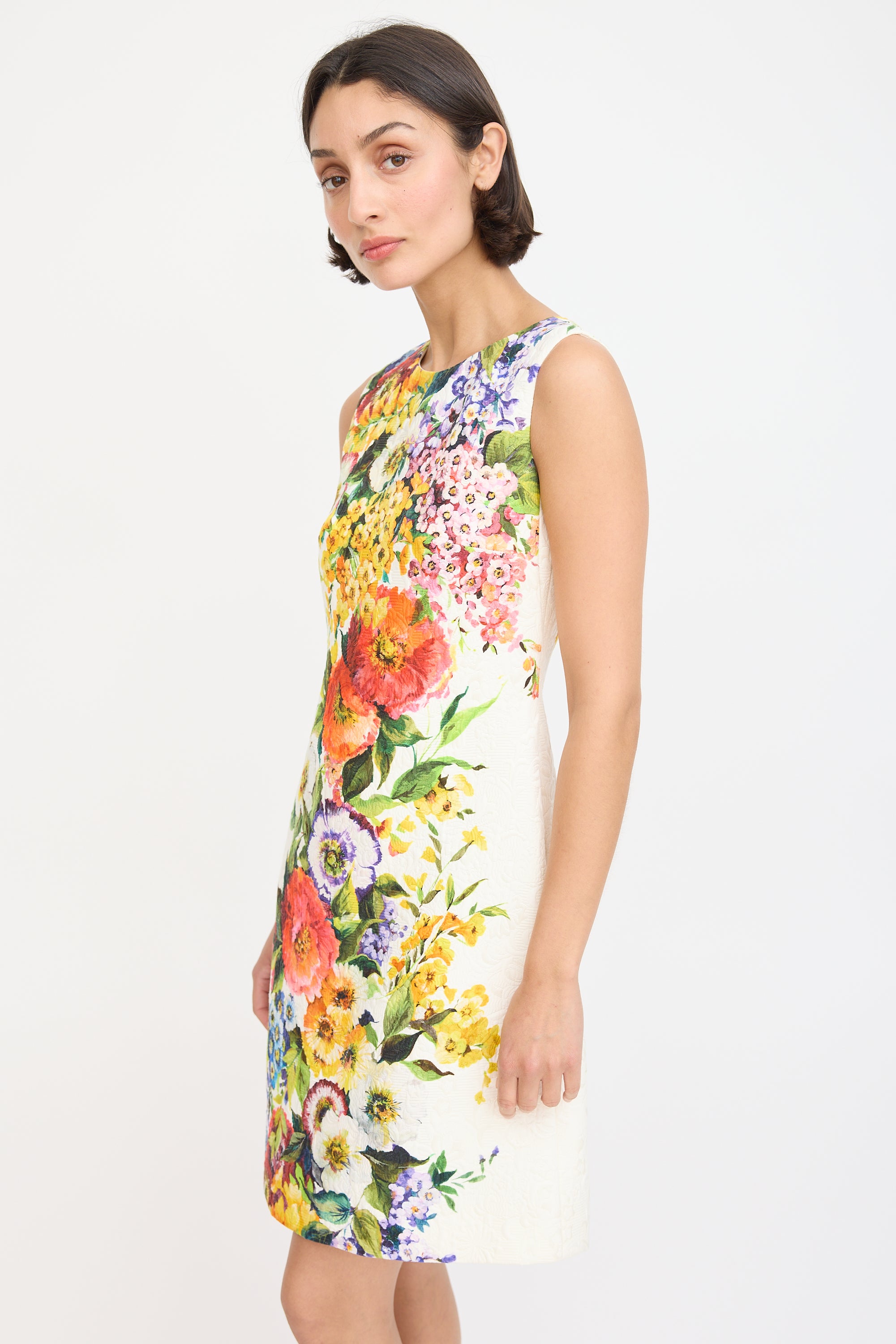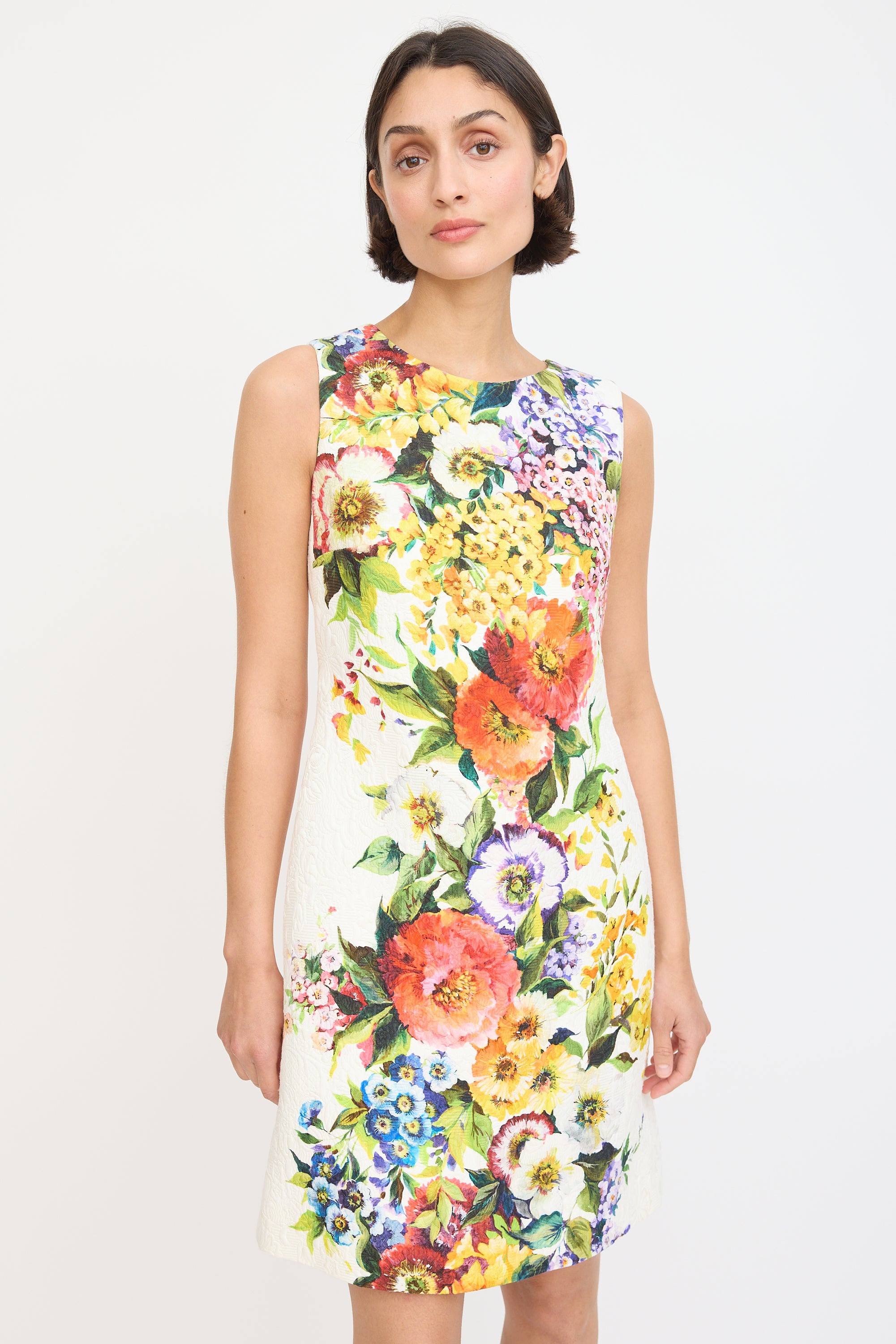 Pre-owned Dolce & Gabbana white and multicolour sleeveless midi sheath dress featuring a round neckline, floral jacquard and print throughout, darting at bust, and concealed back zip. Lined.