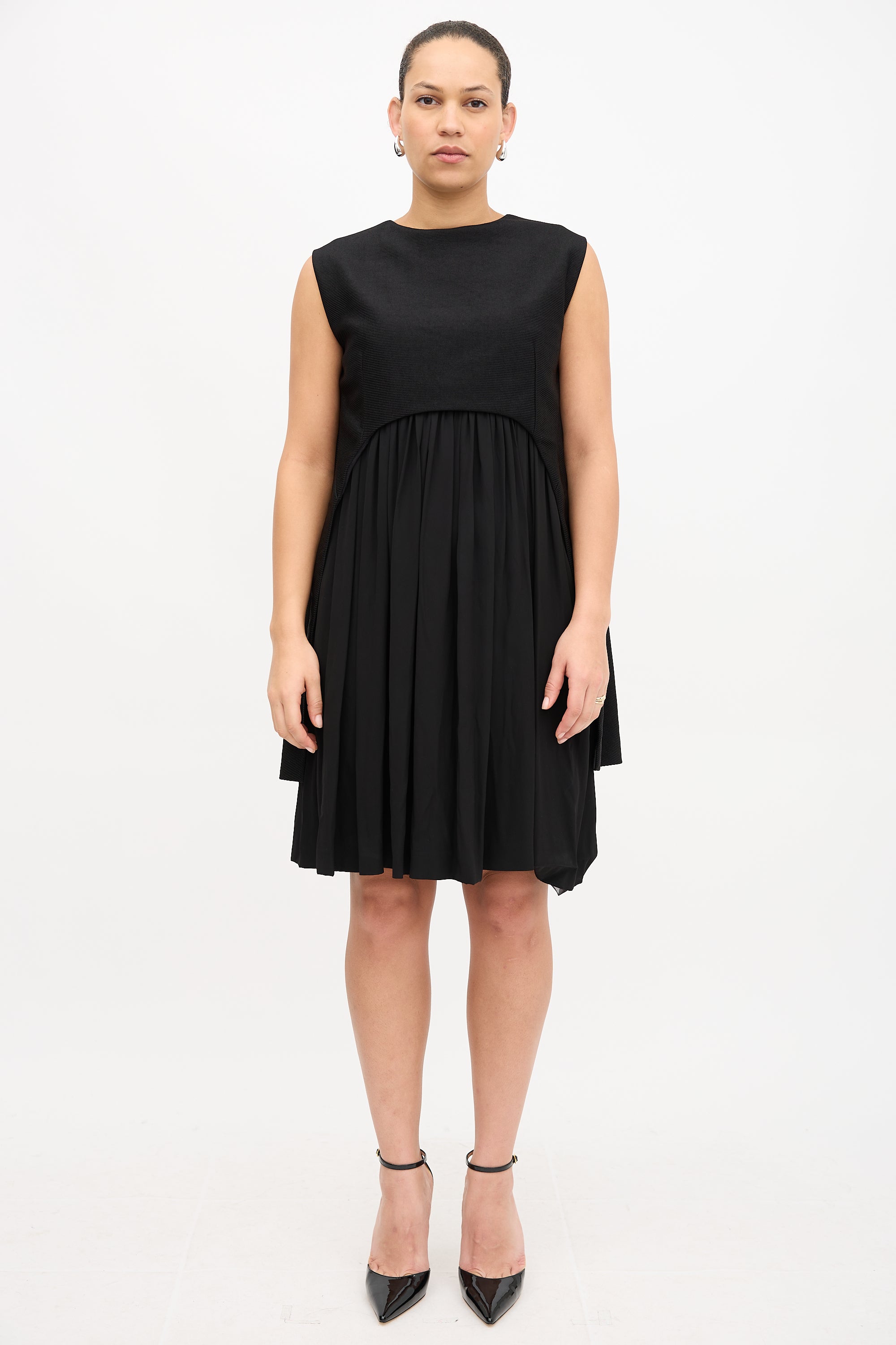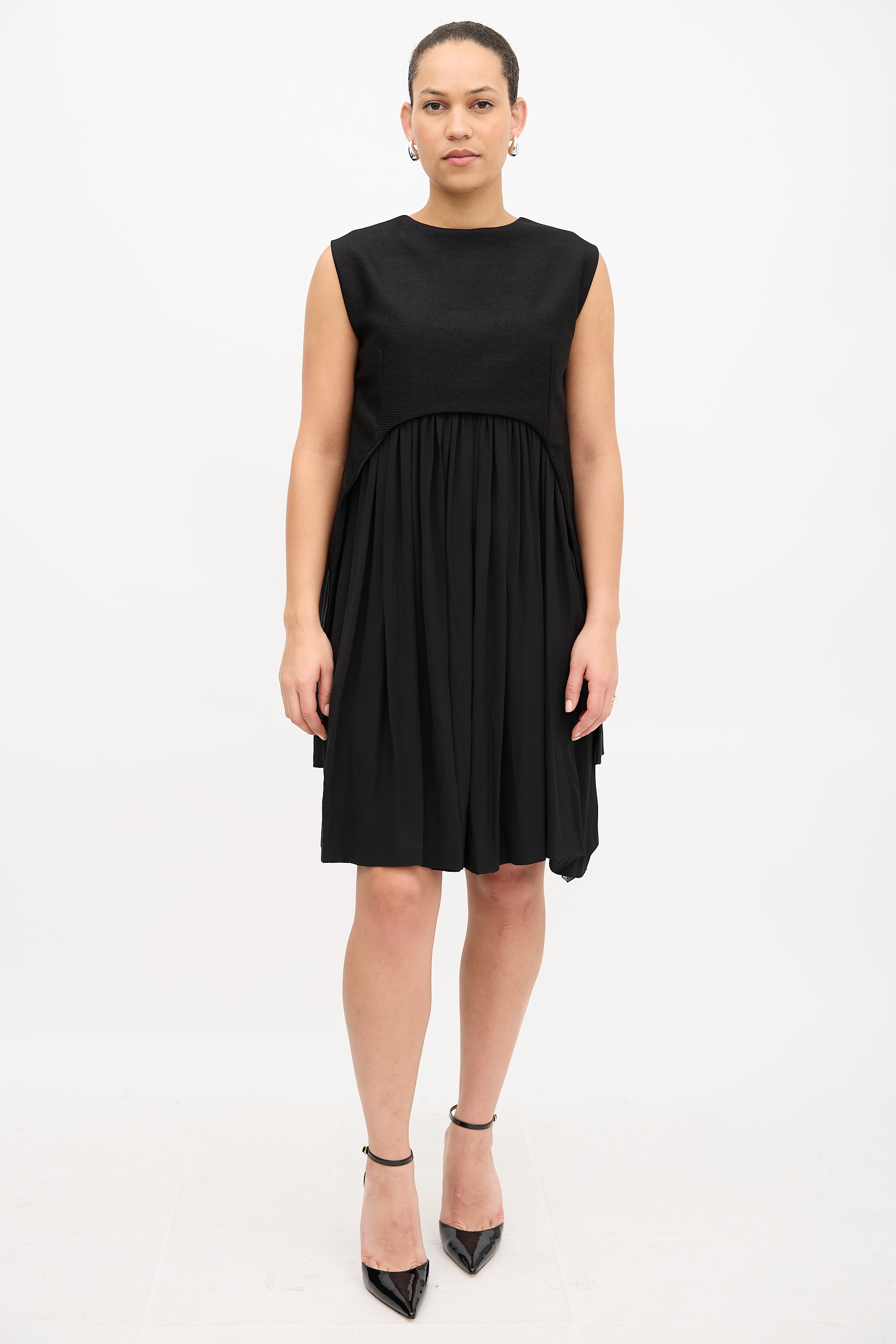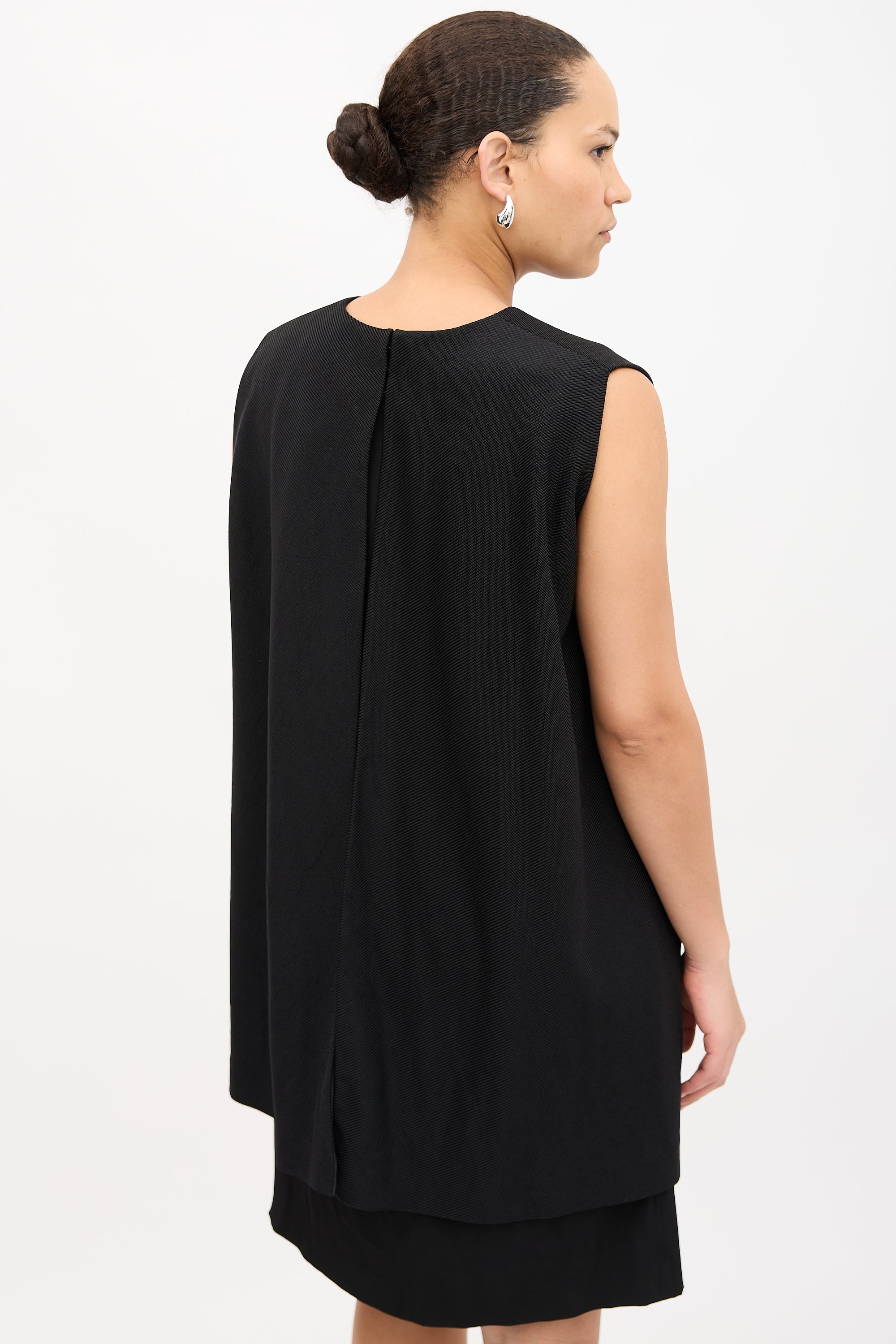 Pre-owned Balenciaga black sleeveless midi dress featuring round neckline, high low top layer with back hook and eye closure, gathered waist at underlayer, and concealed back zip closure. Lined top.