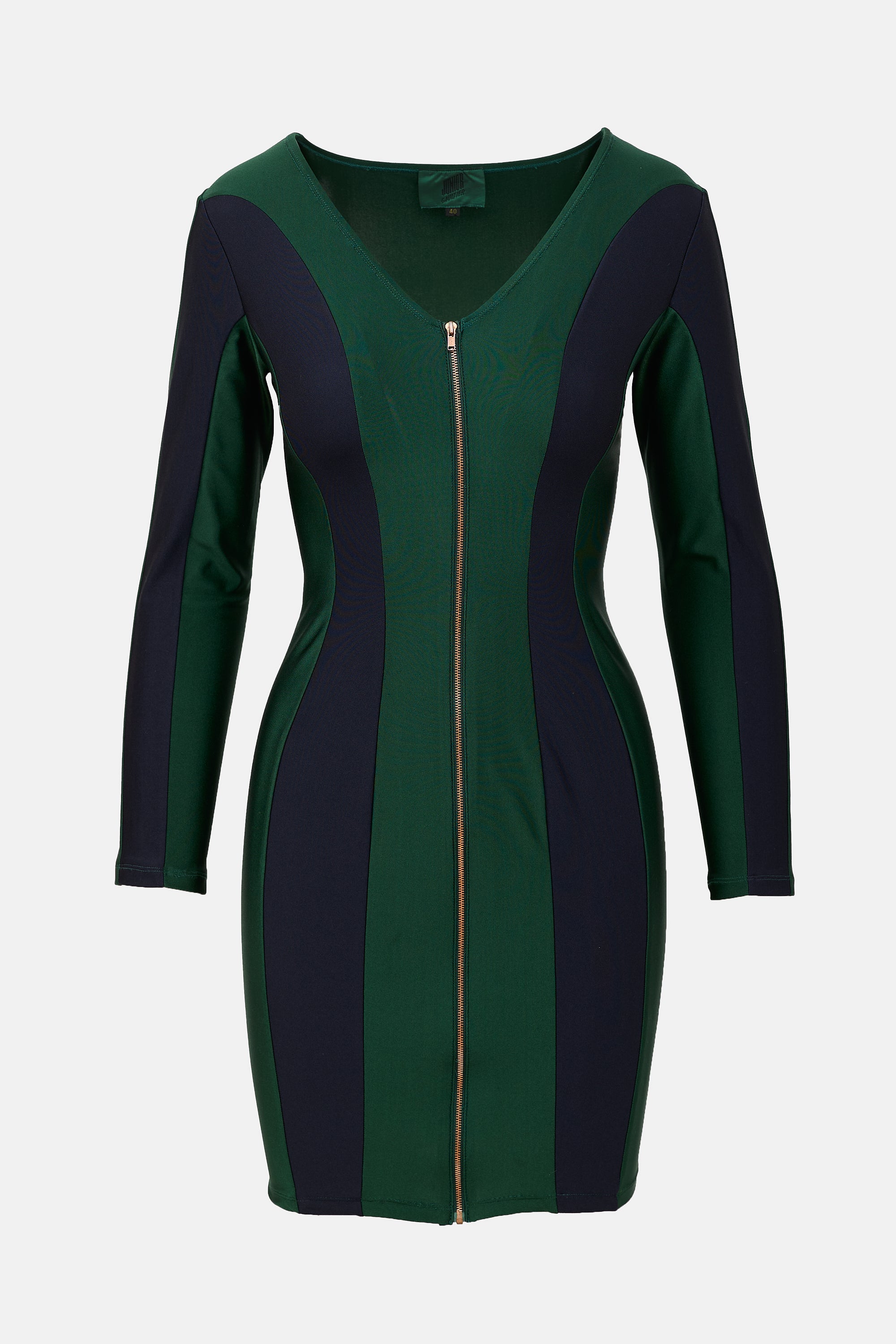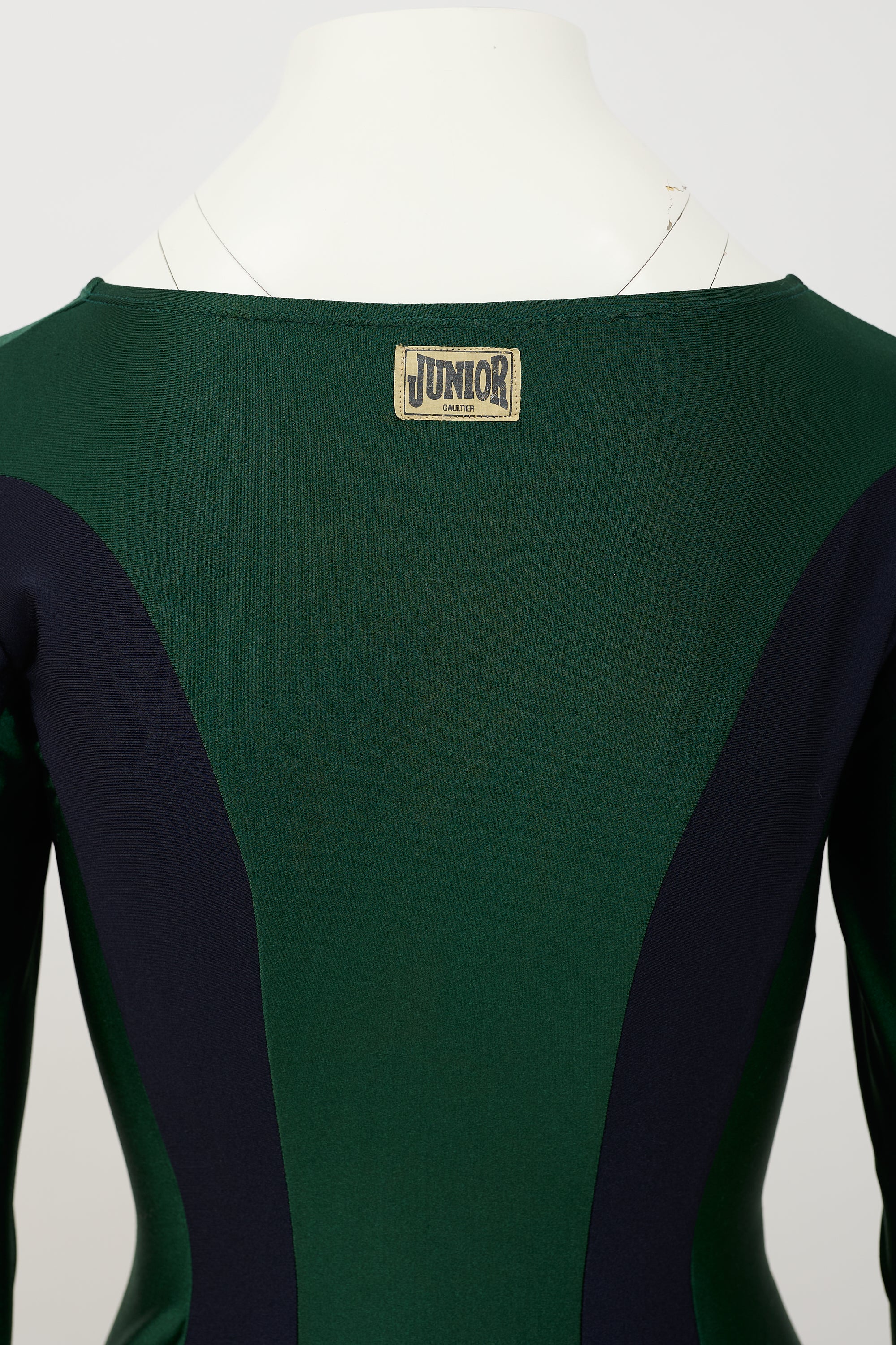 Pre-owned Junior Gaultier 1990 green and navy satin Les Rap'pieuse collection dress featuring a V-neckline, full zip front with gold tone hardware, logo tag at back collar, and bodycon silhouette.