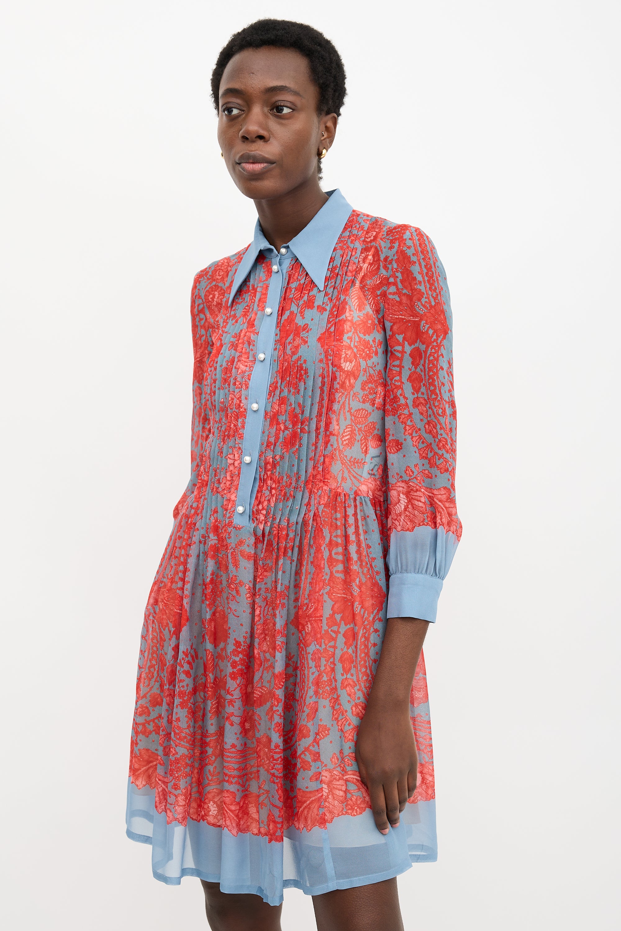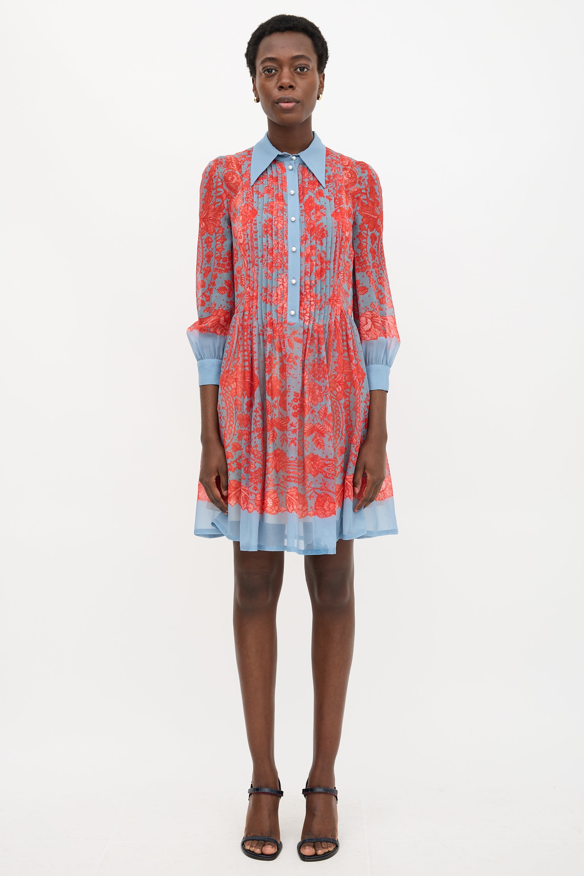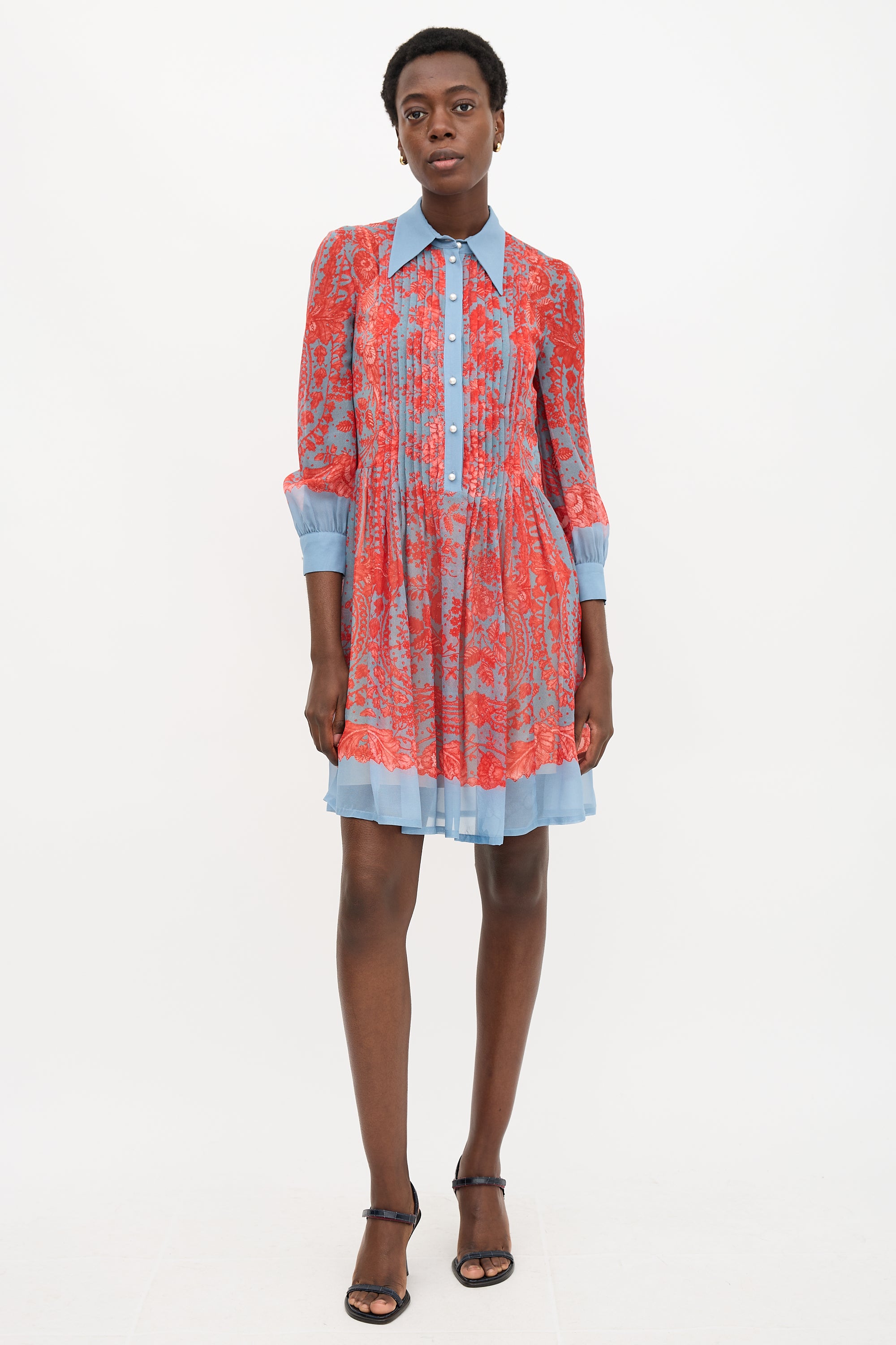 Pre-owned Philosophy blue and red silk floral printed shirt dress featuring a point collar, half button front with faux pearl buttons and a pleated placket, gathered skirt, and long sleeves with buttoned cuffs. Slip lining.