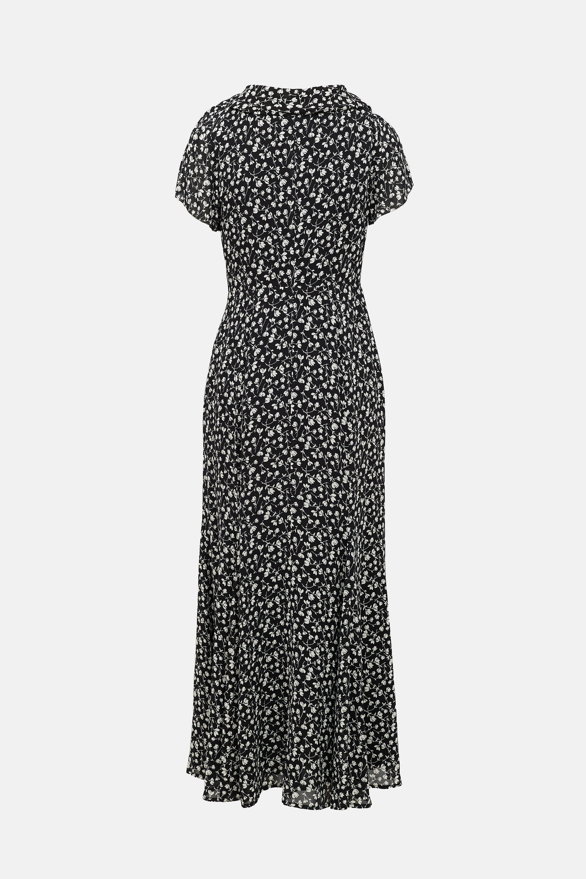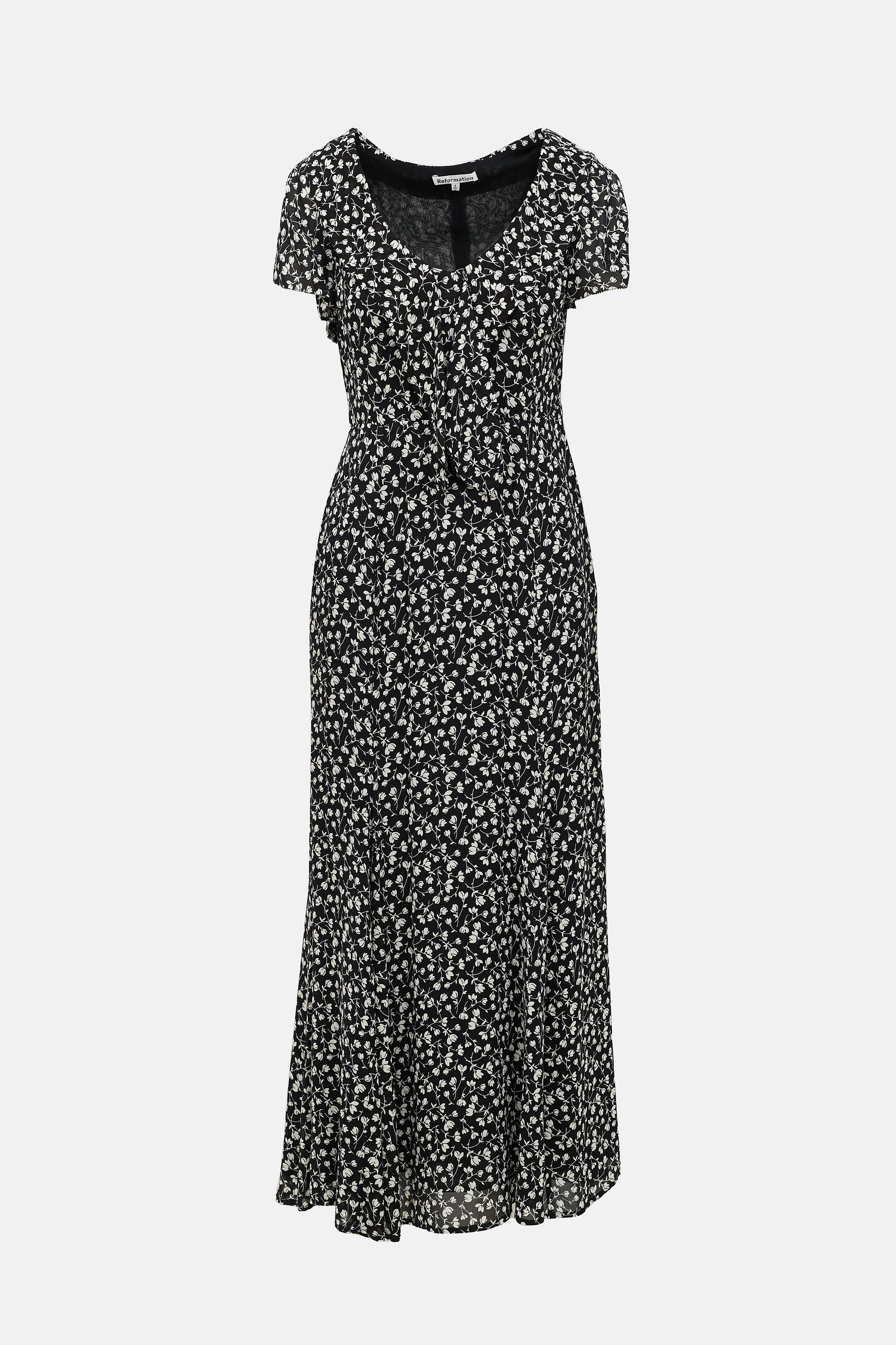 Pre-owned Reformation black Talleen maxi dress featuring a white floral print, collared V-neckline, and concealed back zip.