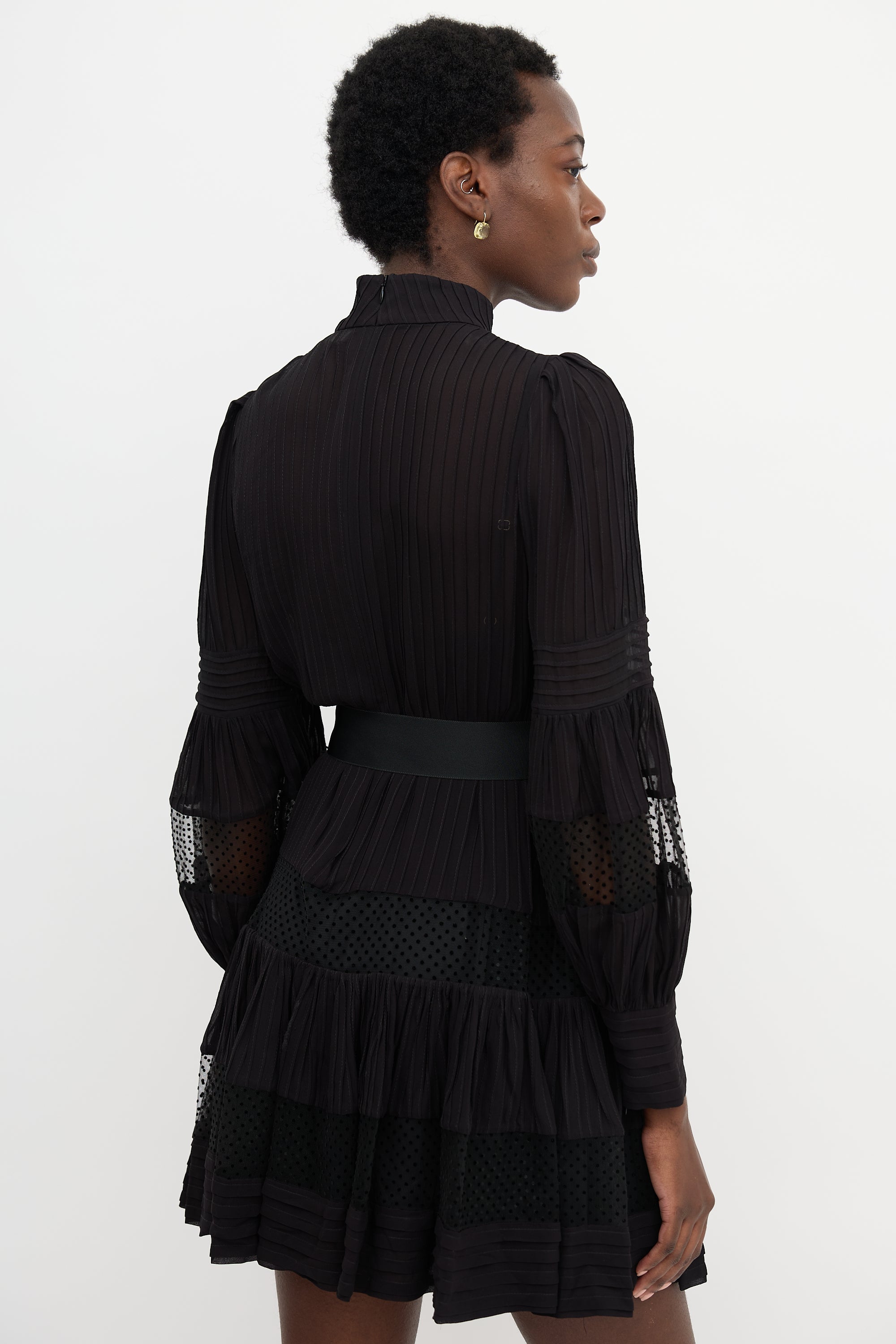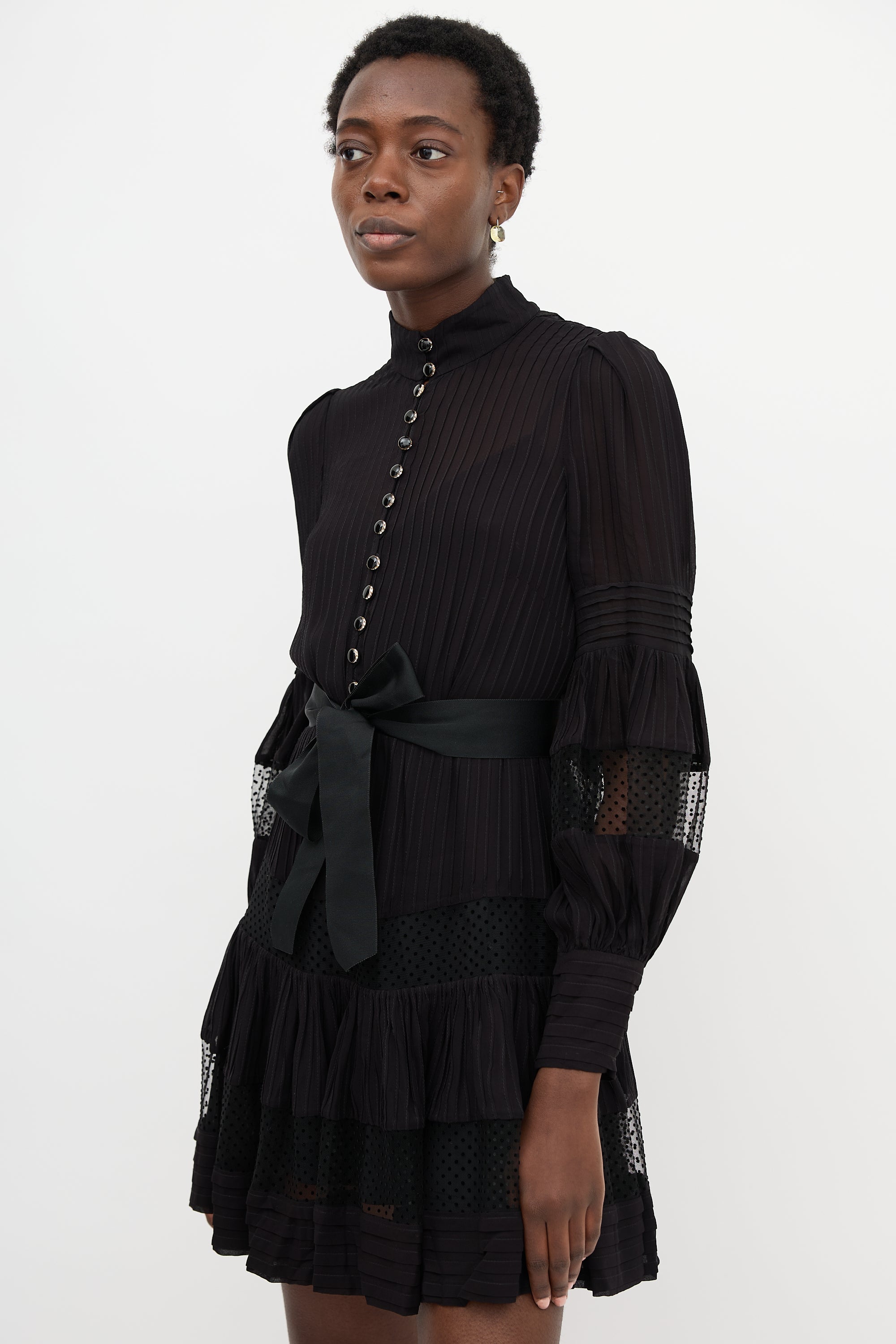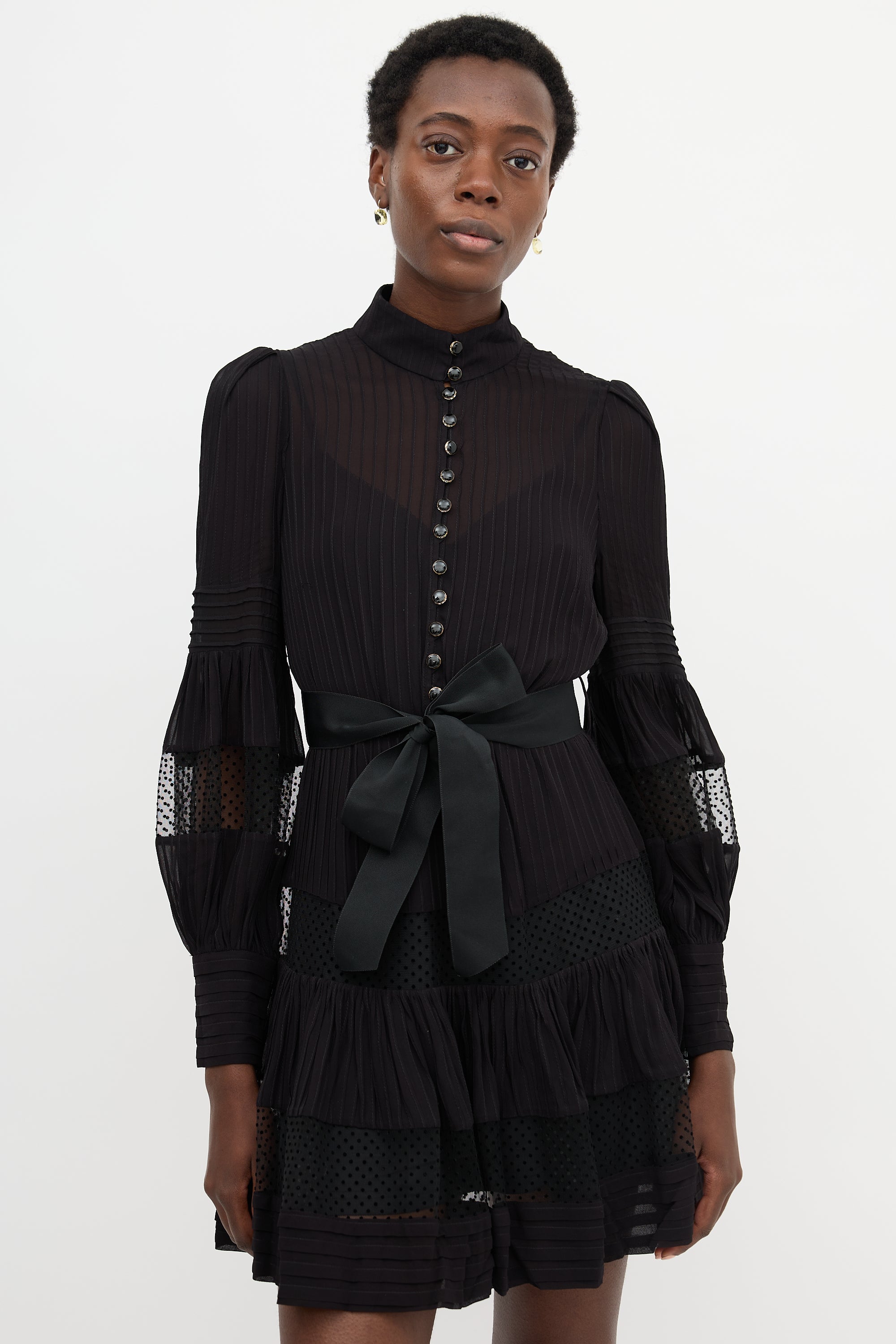 Pre-owned Zimmermann black spliced mesh mini dress featuring stand collar, button up front, tucks, polka dot mesh panels, tier skirt, waist belt, poet sleeves with buttoned cuffs, and concealed back zip closure. Comes with slip dress.