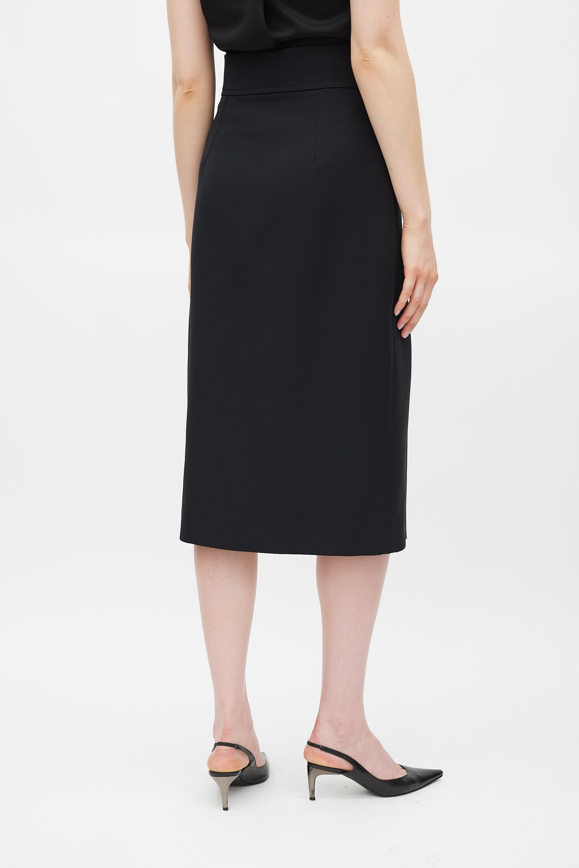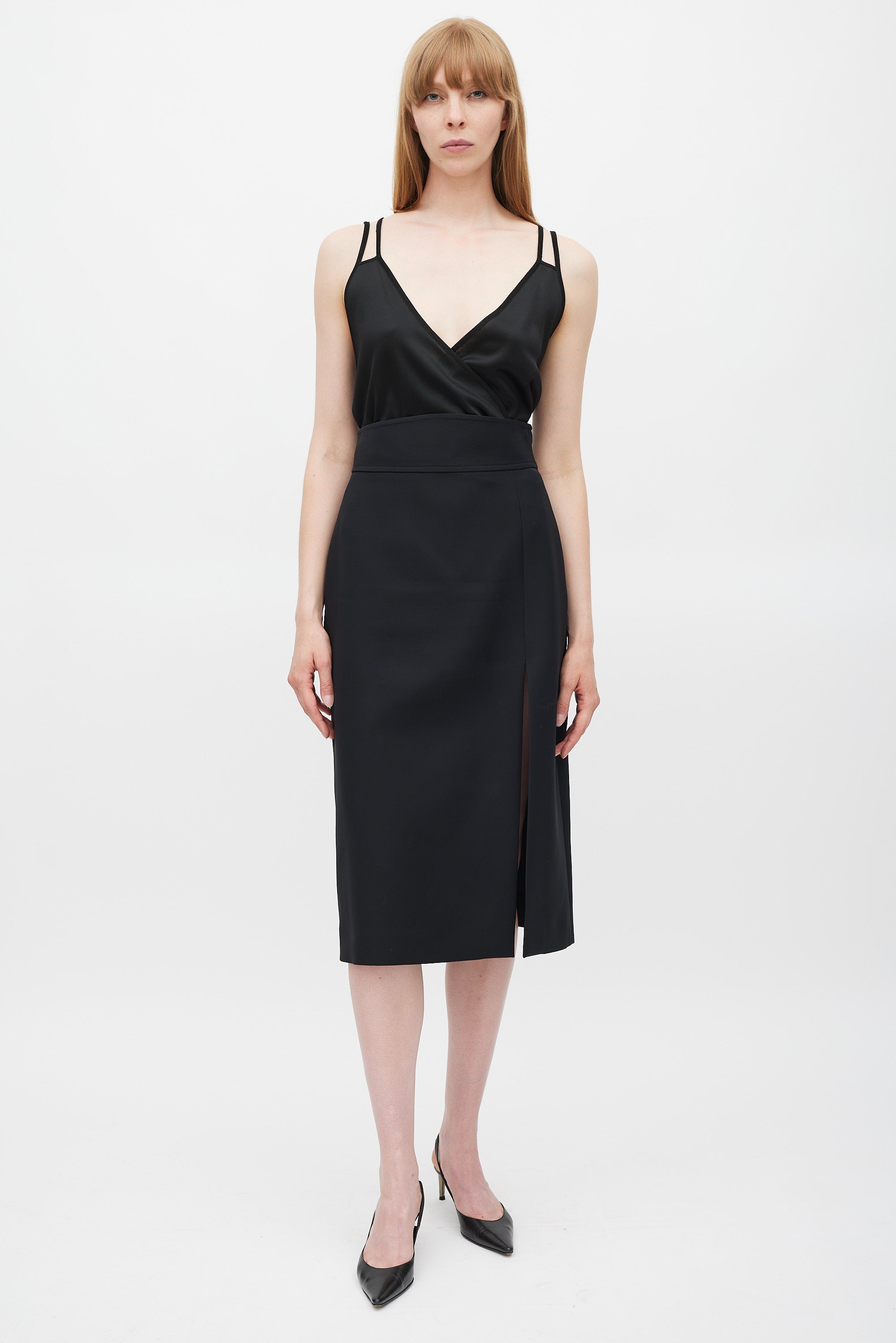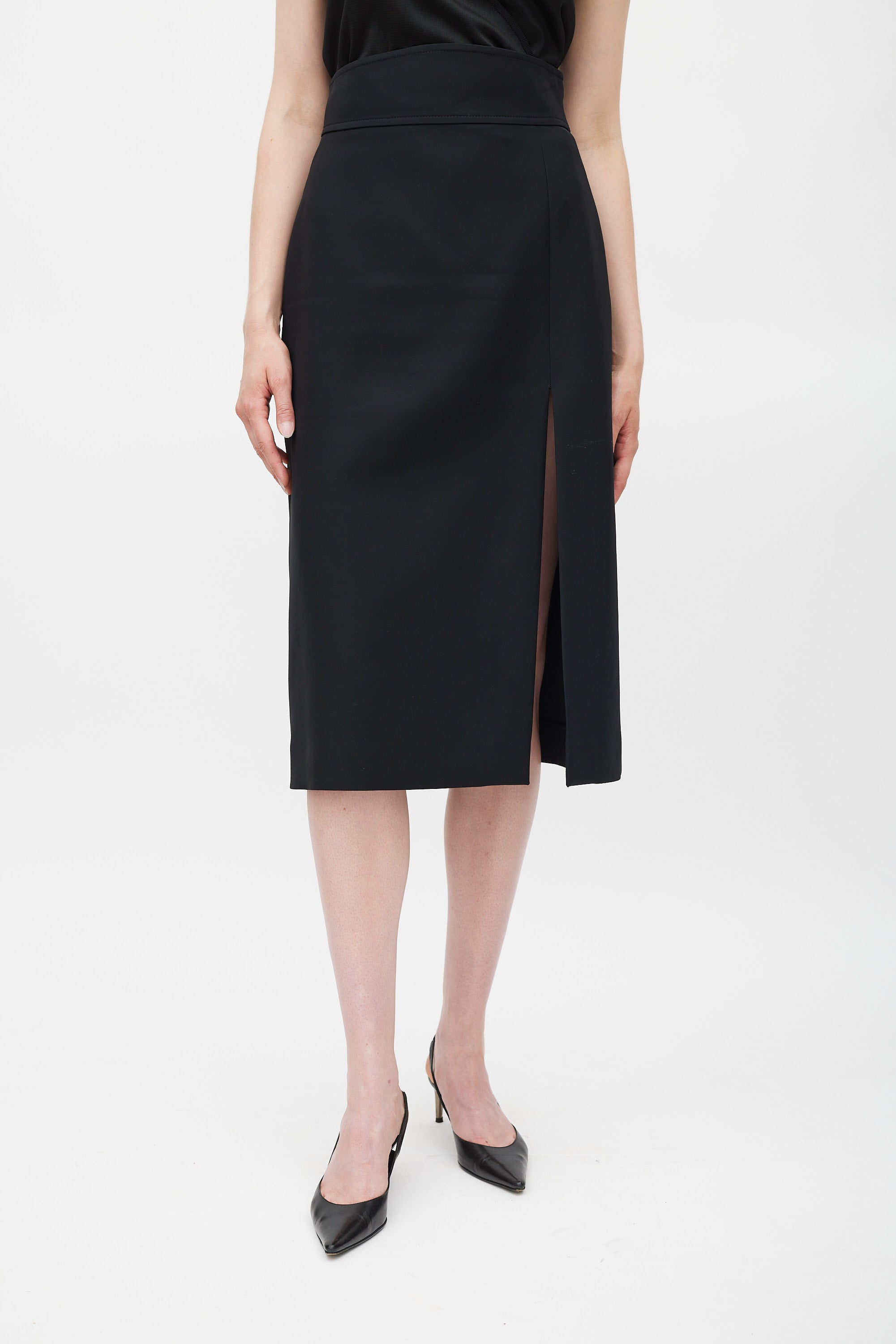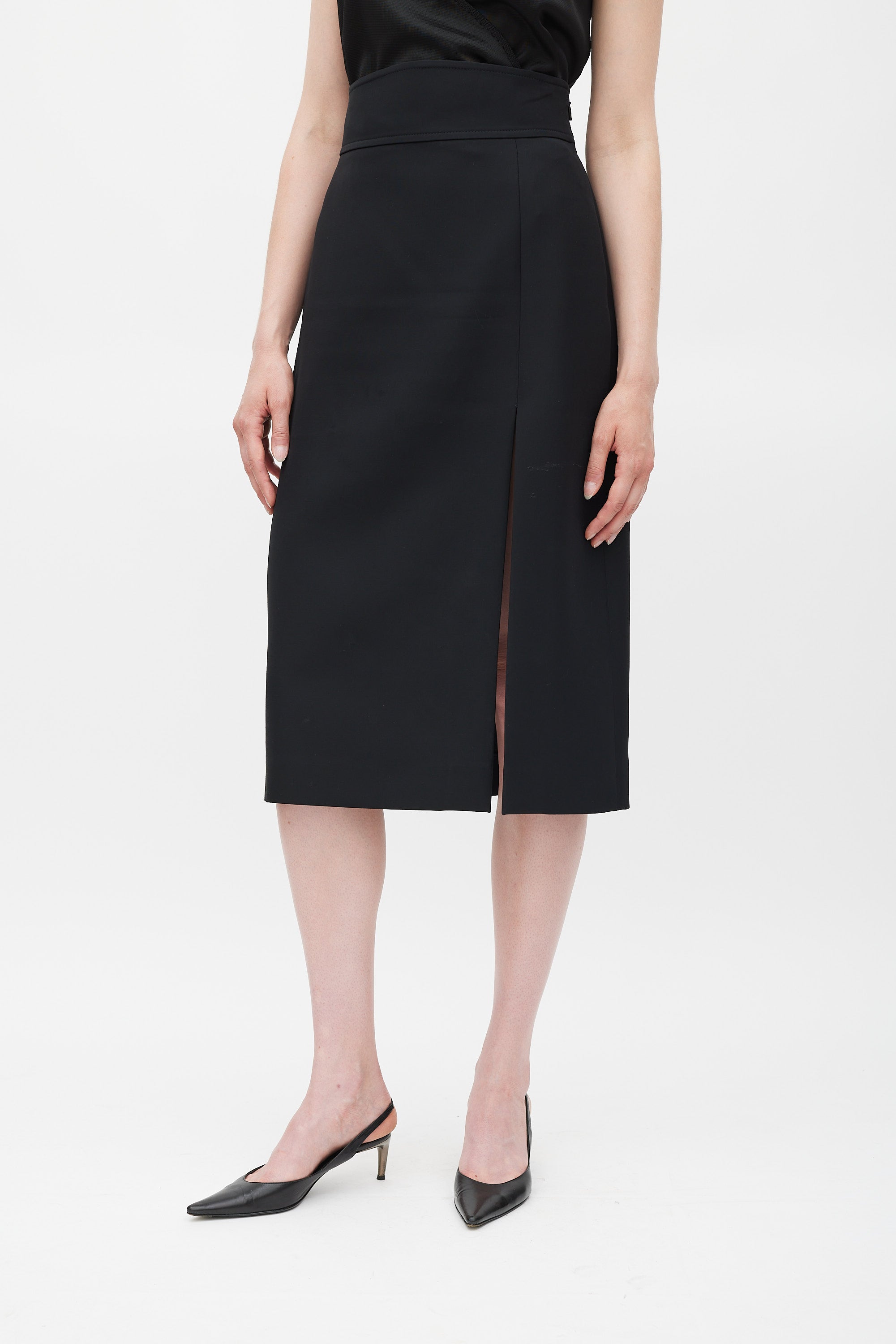 Pre-owned Gucci black silk skirt featuring a slit at hem, darted back, and zip at side with hook and eye closure. Clipped to fit model.
