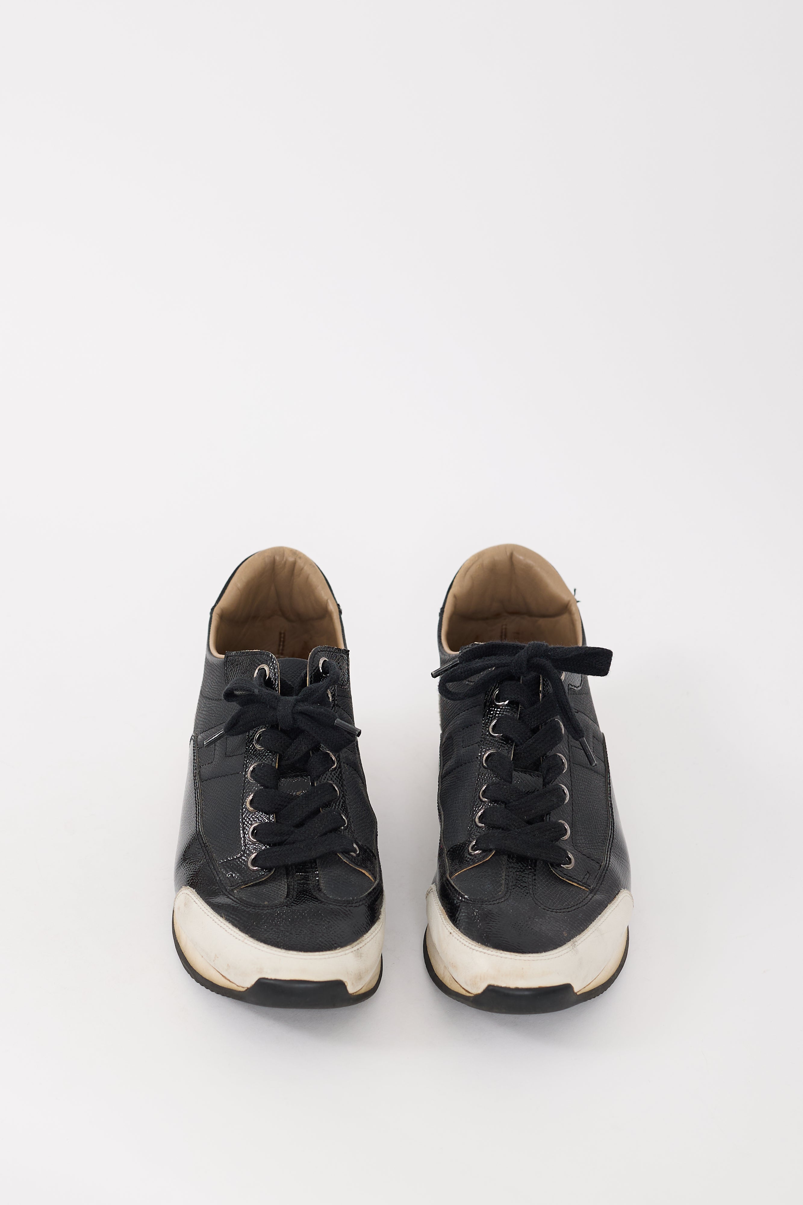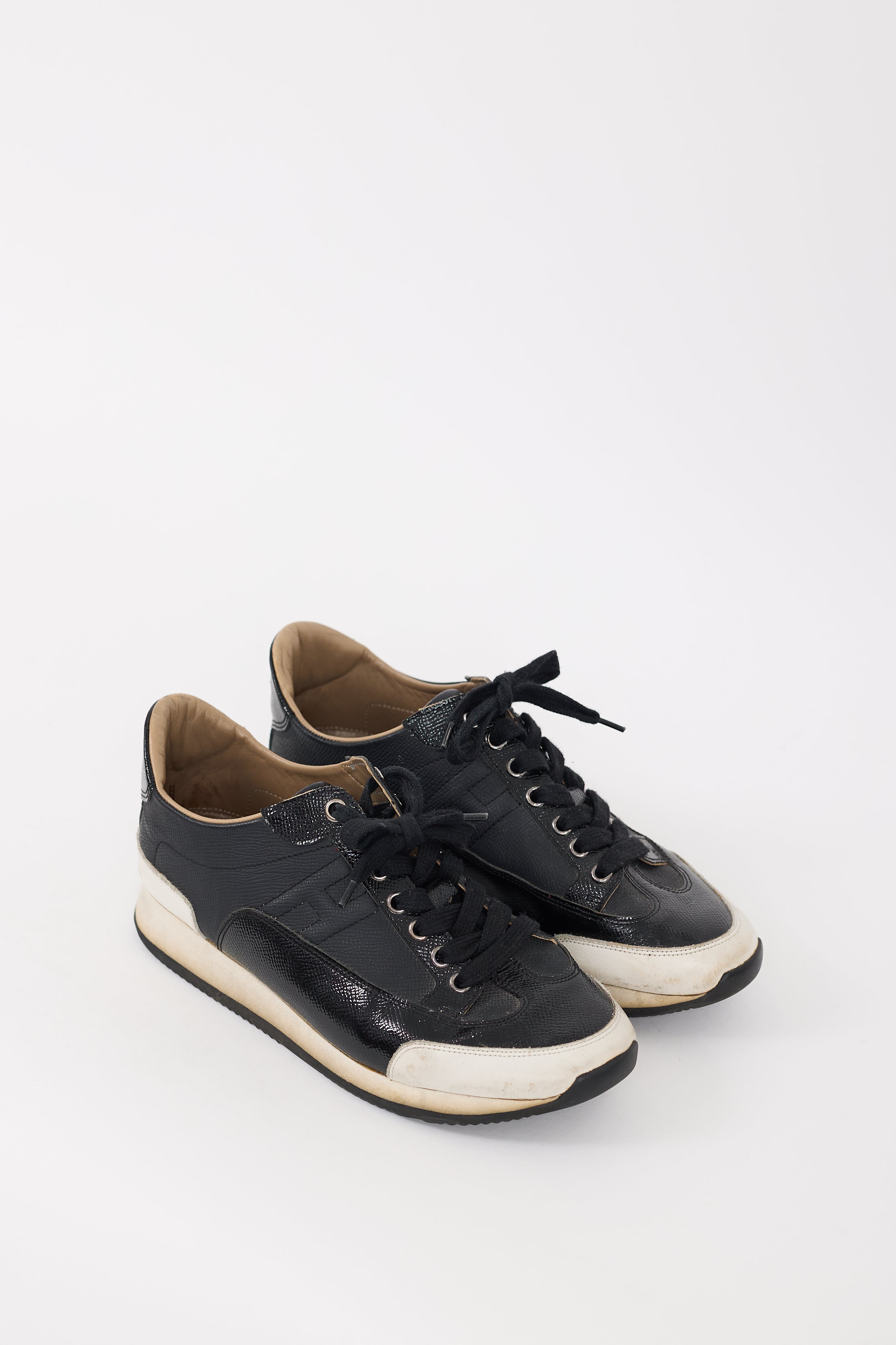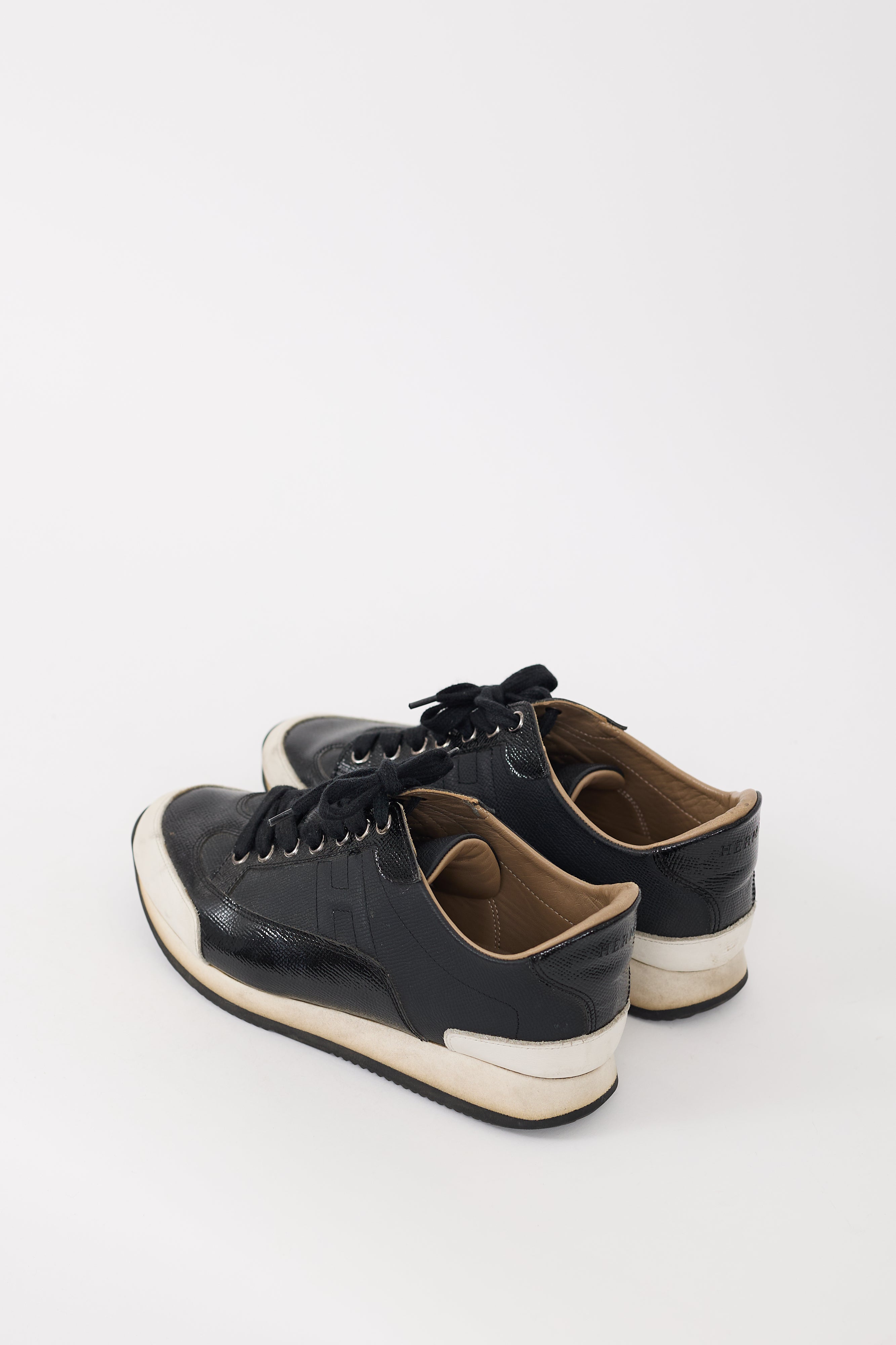 Pre-owned Hermès black sneakers featuring a rounded toe, leather and patent leather panelling with white accents at toe and heel, tonal stitching, lace up front, embossed H logo at sides, debossed logo at counter, and treaded rubber outsole.