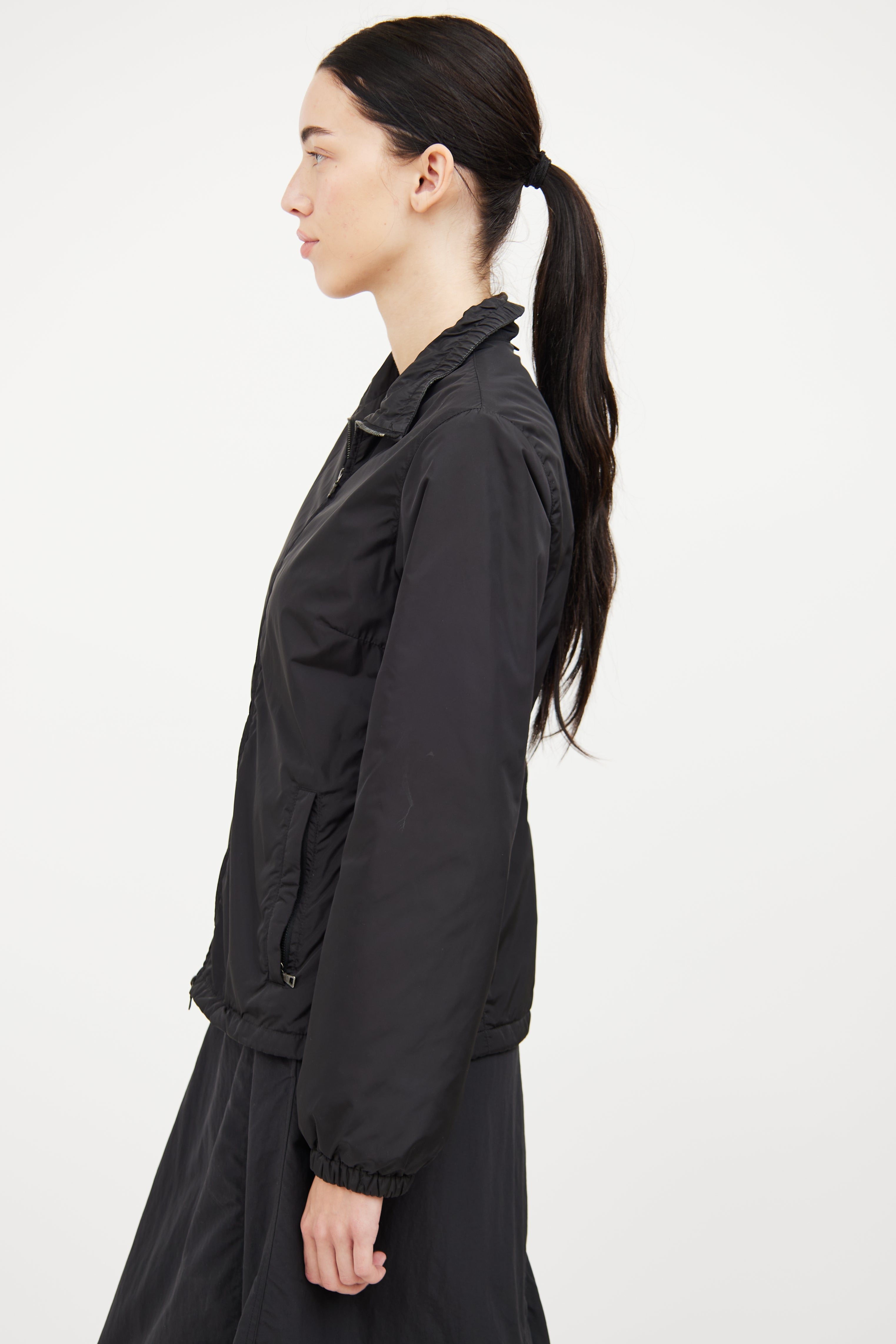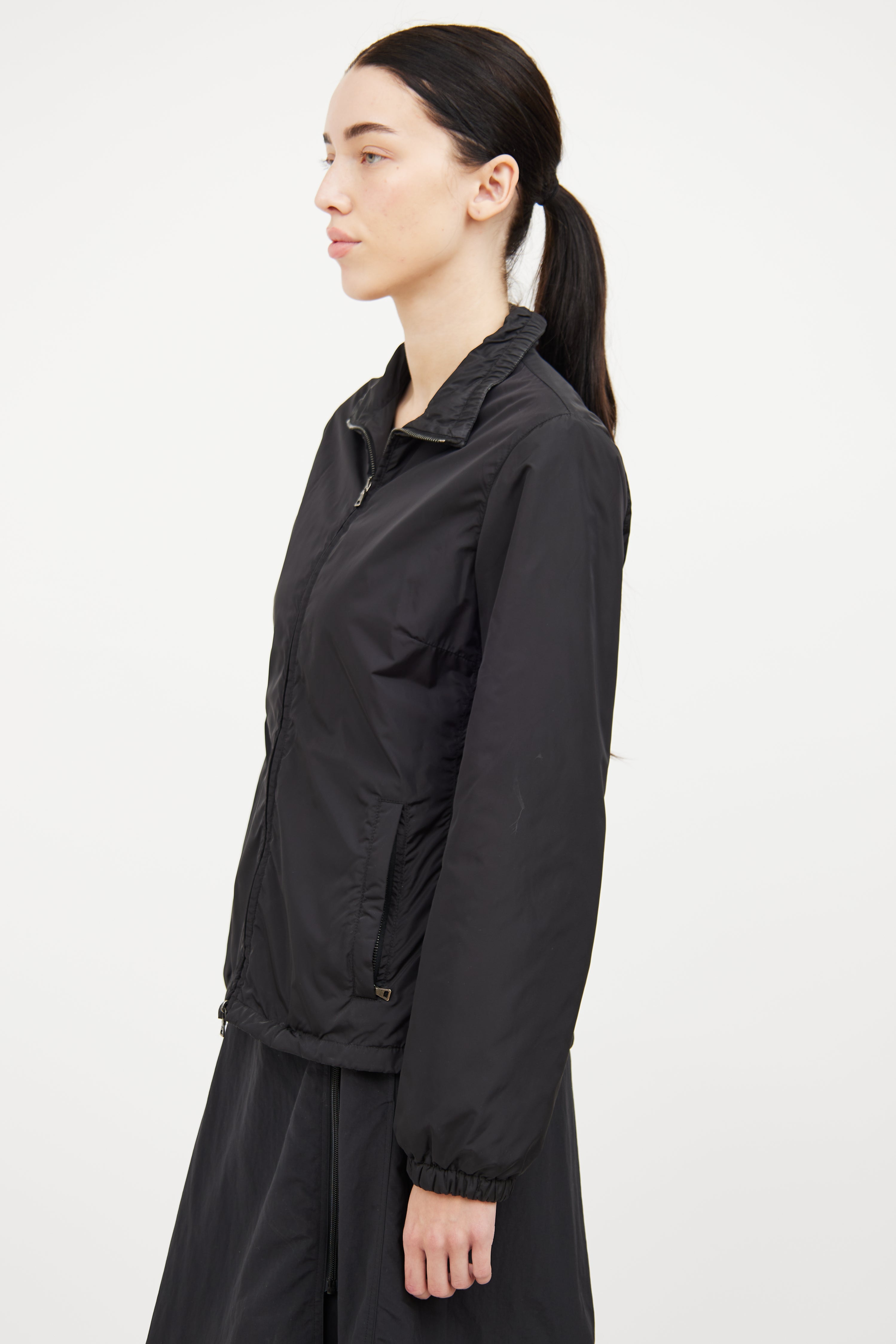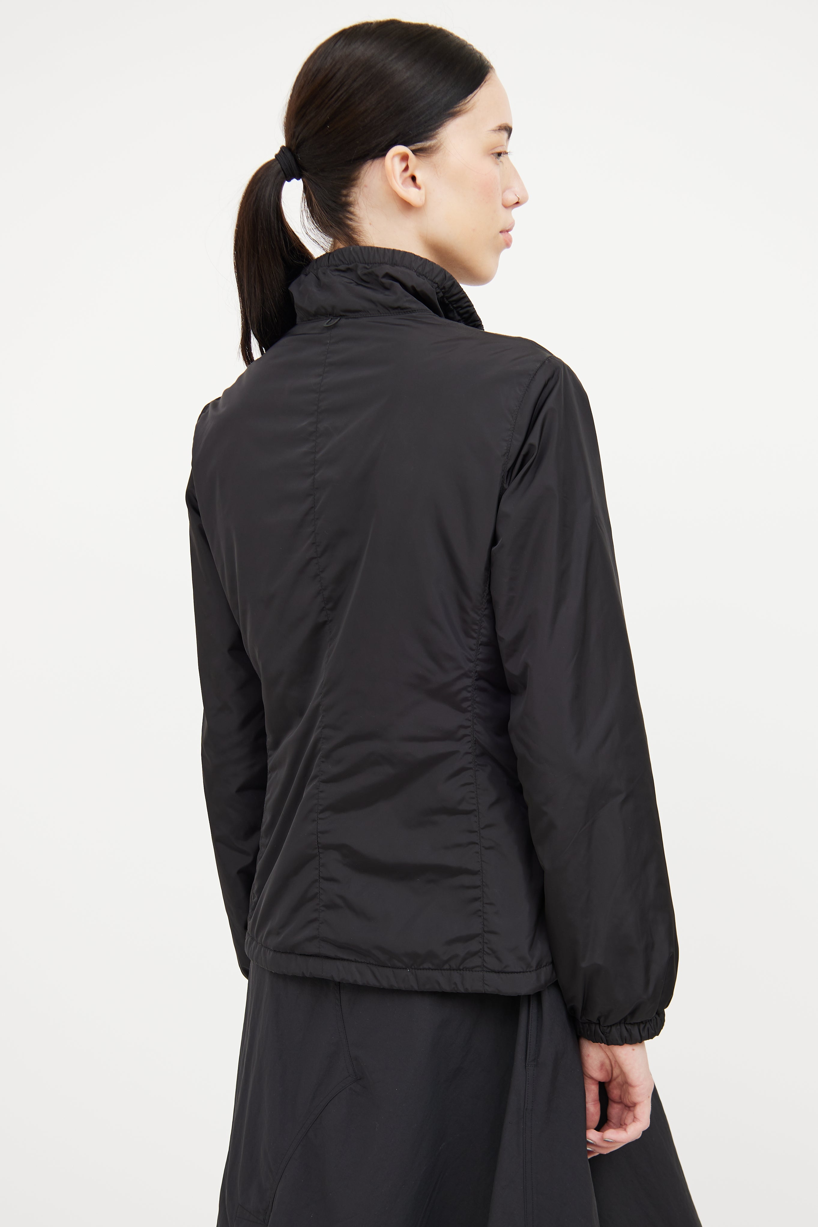 Pre-owned Prada Sport black nylon jacket featuring polyester padding insulation, two way metal zipper, two zip pockets, stand up collar with elastic, long sleeves with elastic cuff and cinch hem.