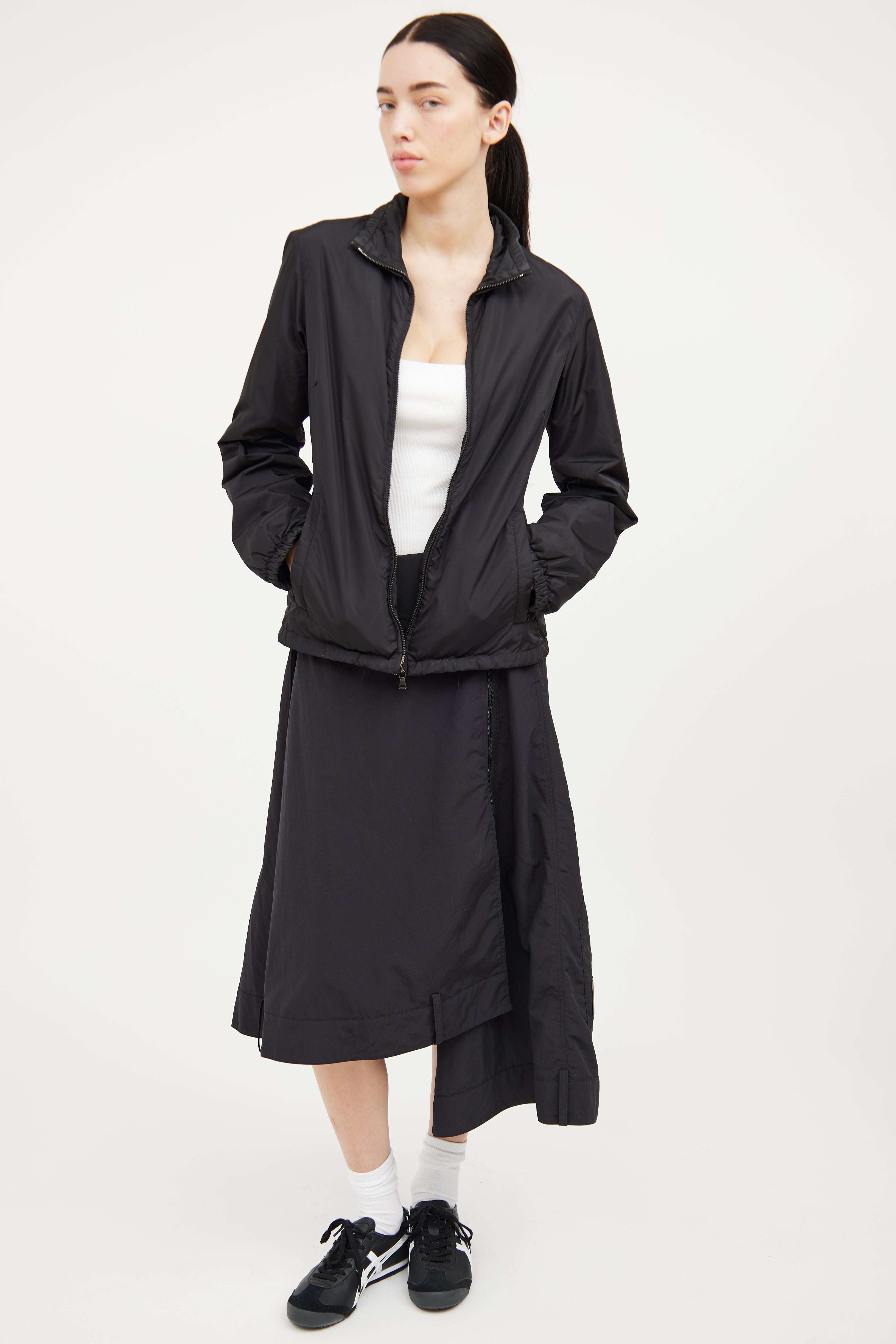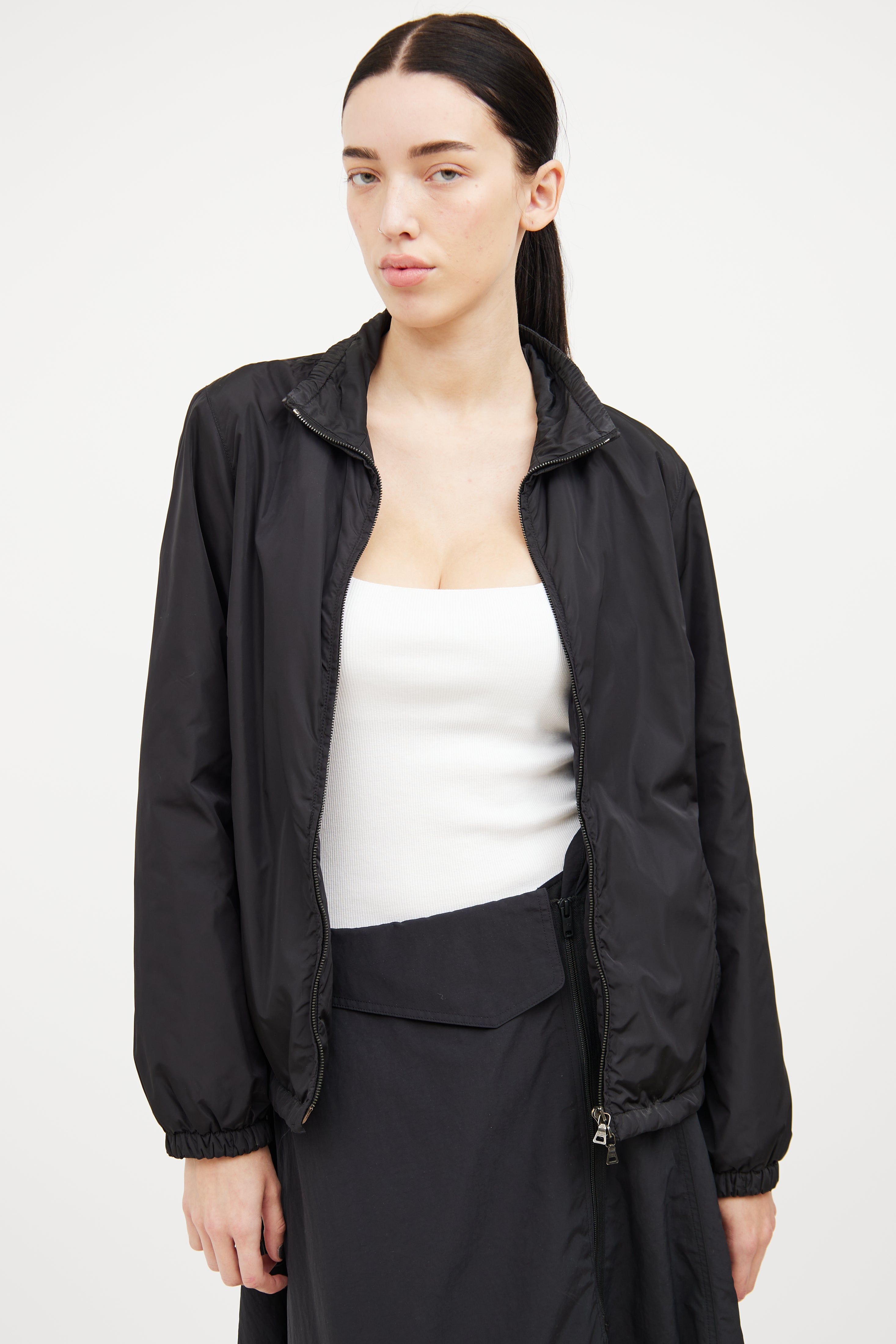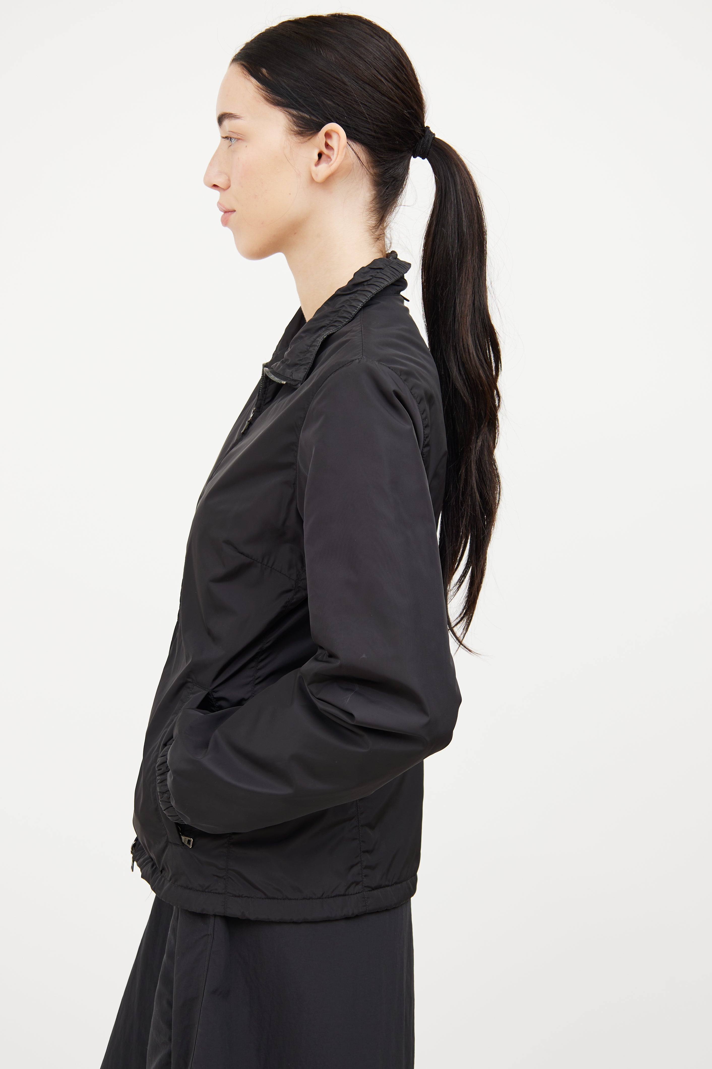 Pre-owned Prada Sport black nylon jacket featuring polyester padding insulation, two way metal zipper, two zip pockets, stand up collar with elastic, long sleeves with elastic cuff and cinch hem.