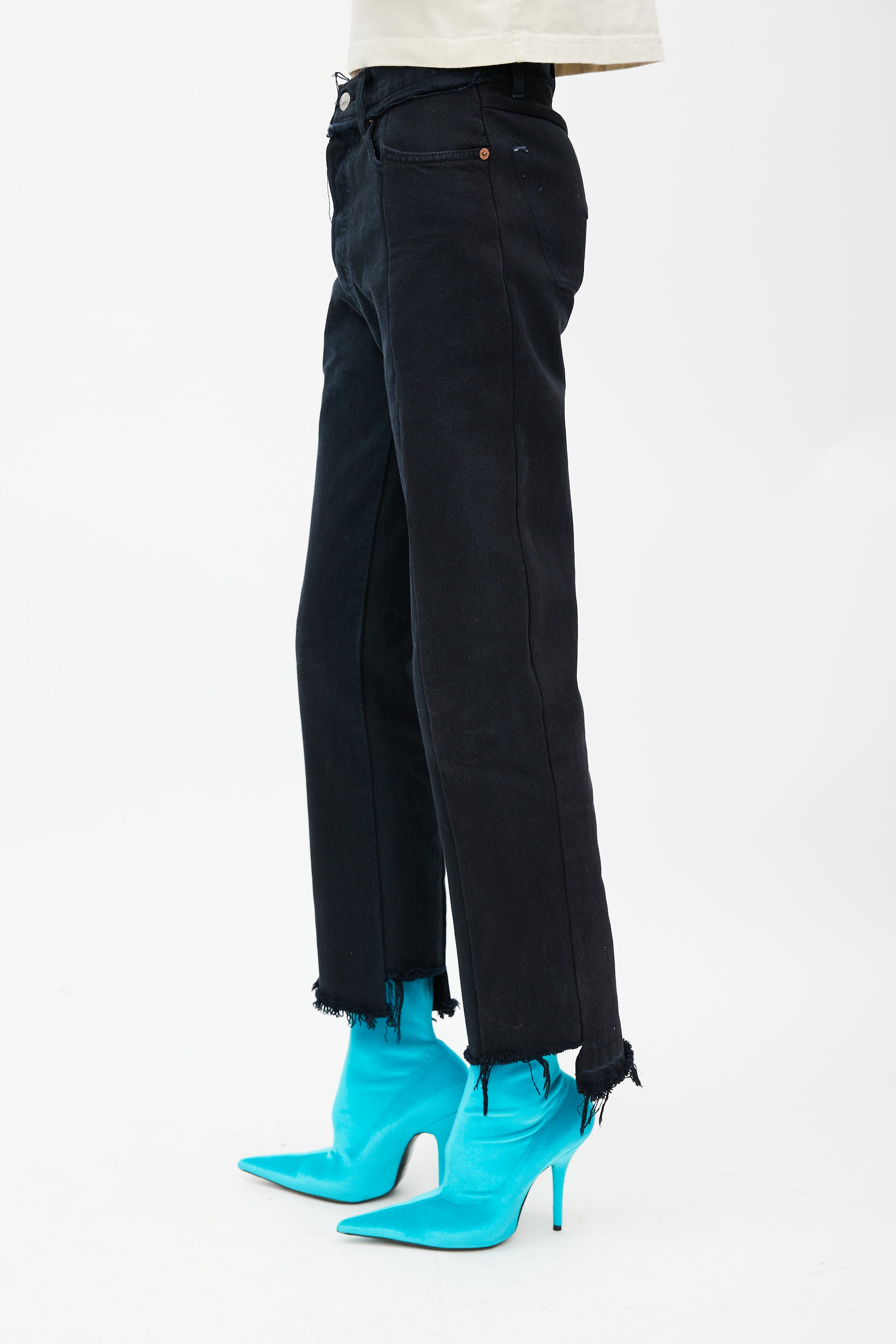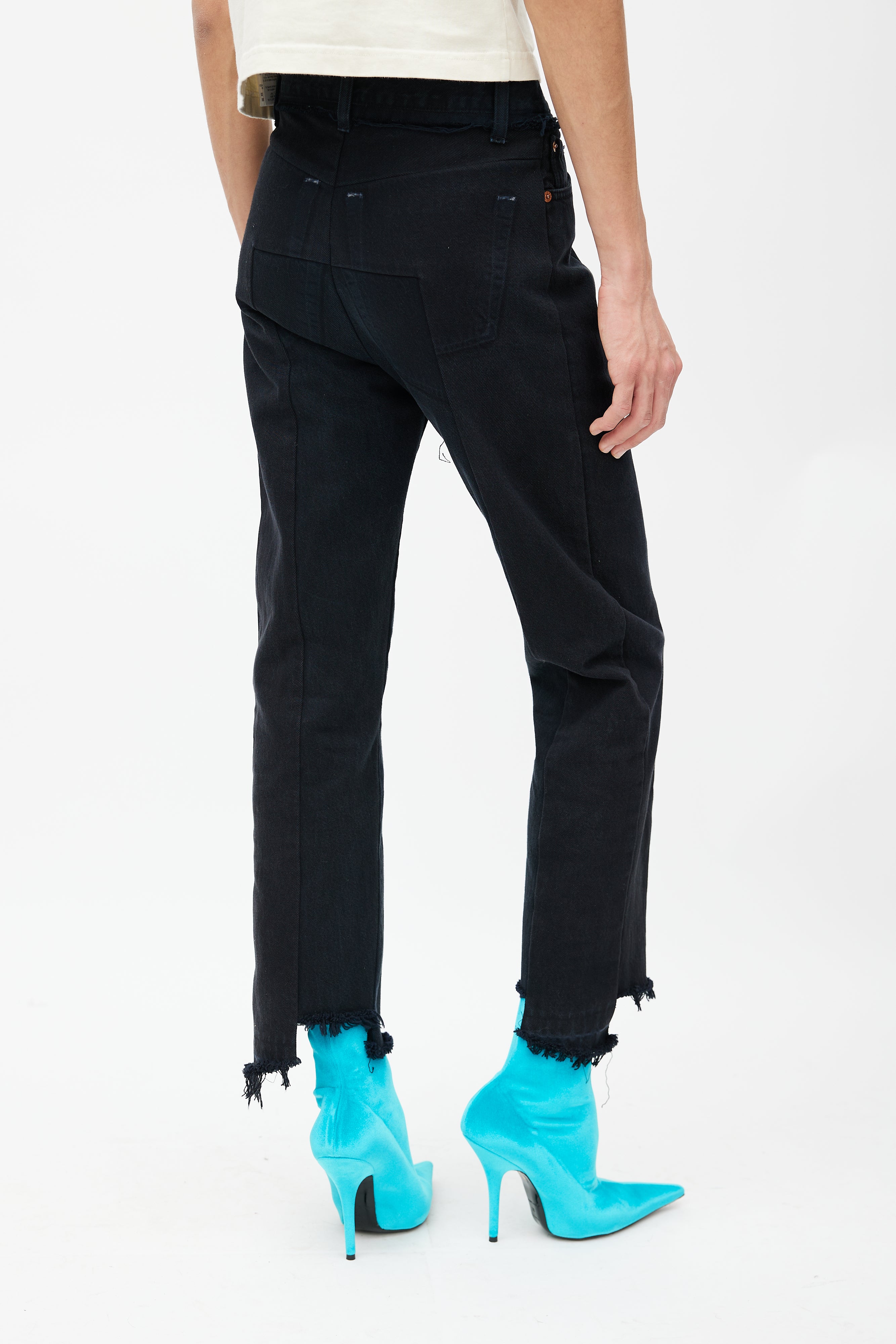 Pre-owned Vetements black deconstructed denim jeans featuring three slip pockets at hip, panelled seams, raw hem, and button fly closure.
