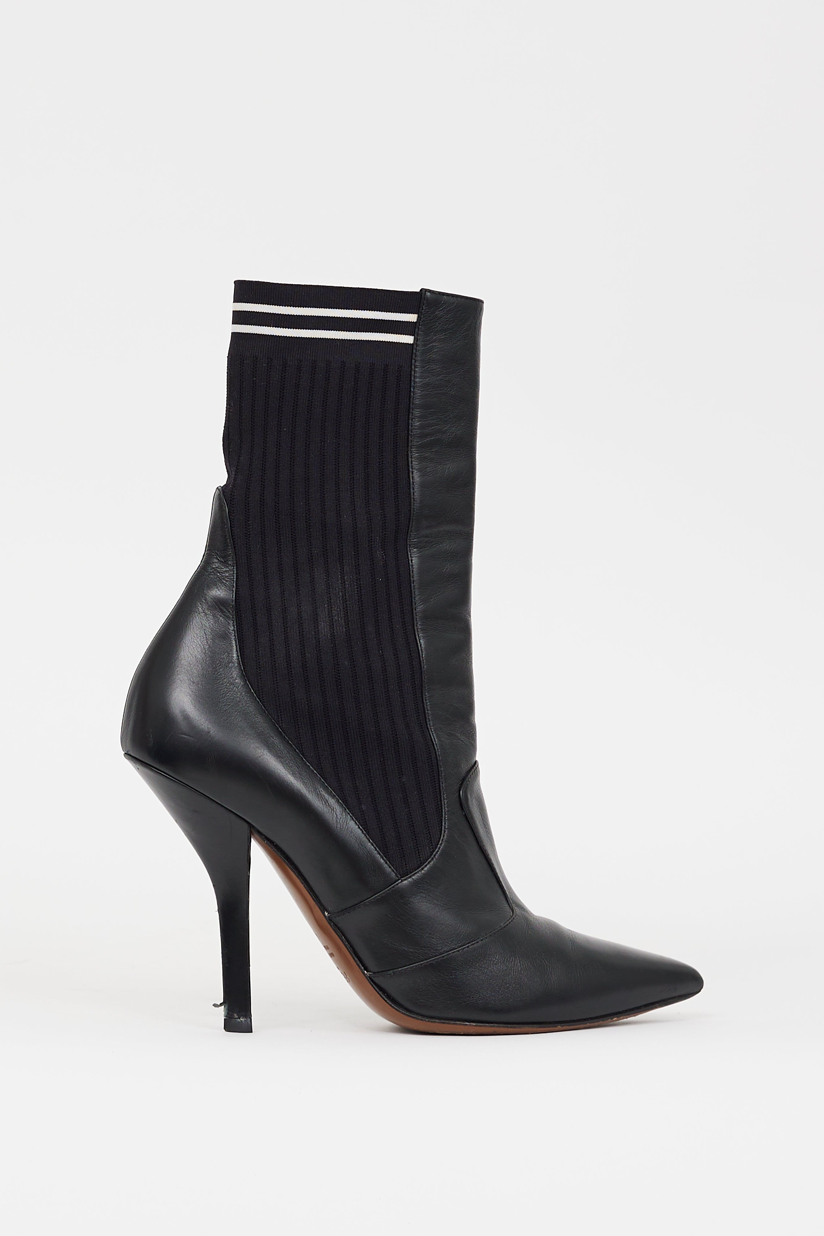 Pre-owned Fendi black leather Rococo Sock boots featuring a pointed toe, notched topline panelled construction, ribbed stretch textile shaft panelling with two white stripes at top edge, and covered stiletto heel.
