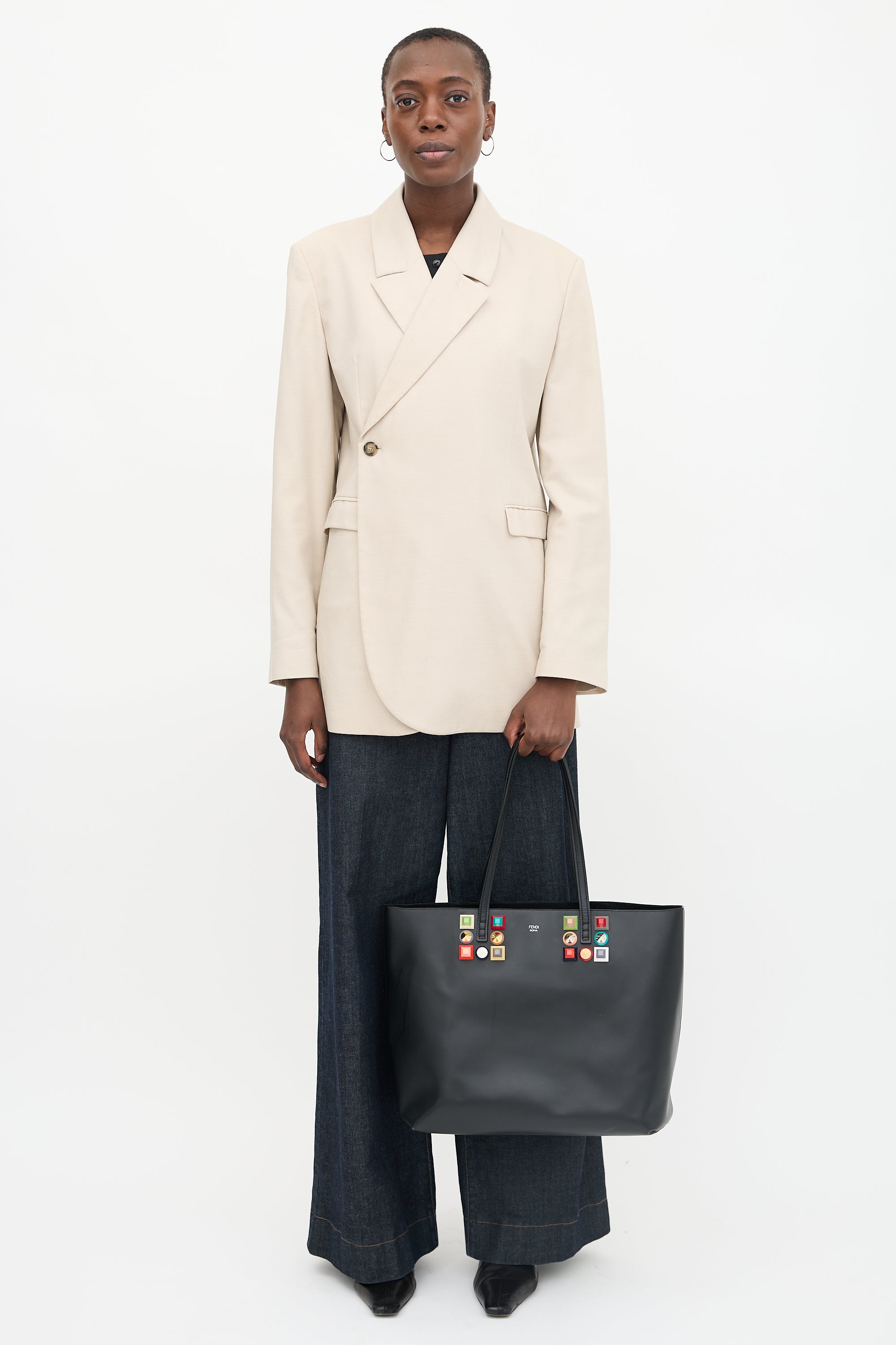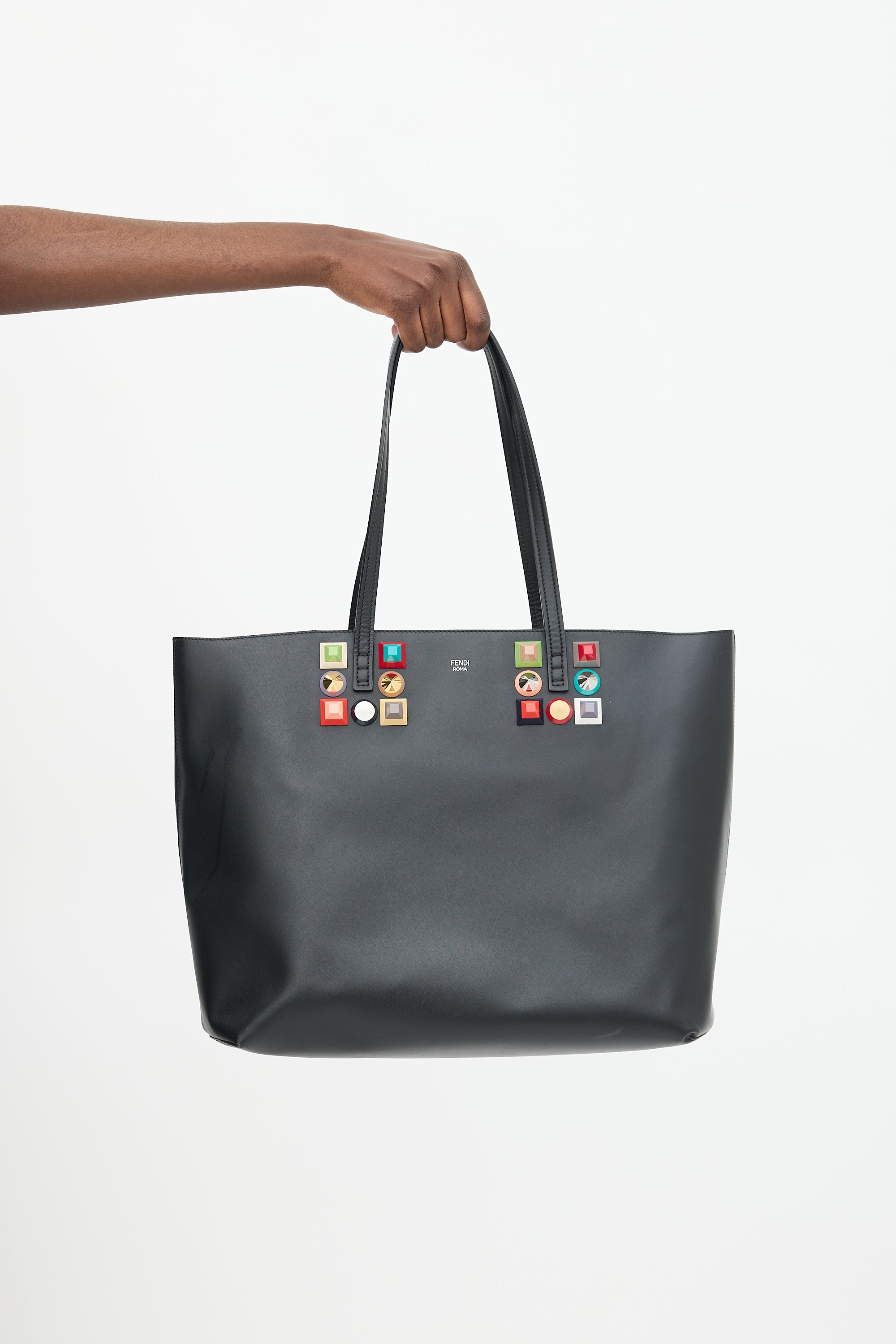 Pre-owned Fendi black leather Large Roll Tote bag featuring dual flat shoulder straps, multicolour stud embellishments at front and back collar, silver stamped logo at face, open top, and one main compartment with one zip pocket. Comes with original dust bag.