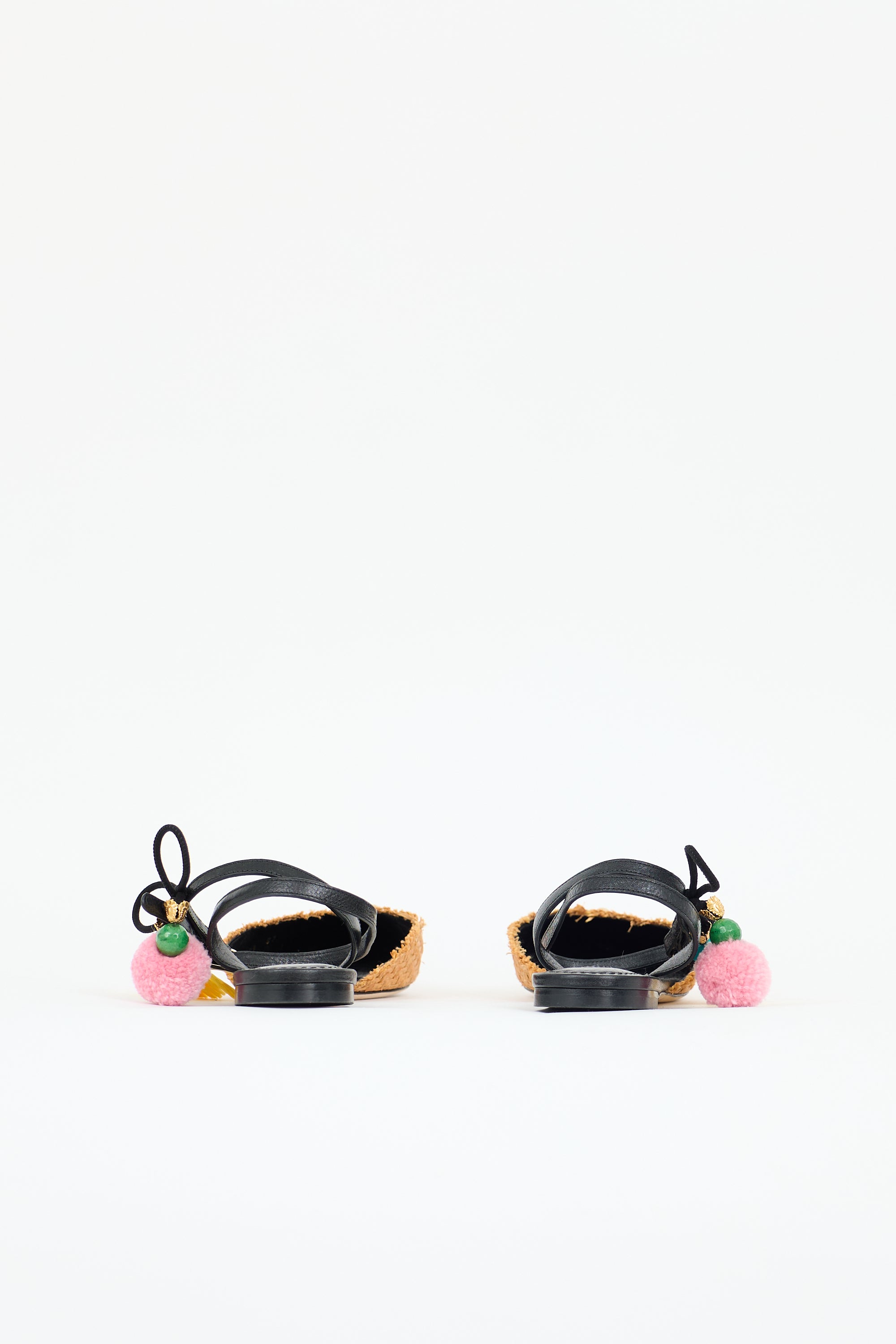 Pre-owned Dolce & Gabbana orange raffia flats featuring a pointed toe, mixed metal tone studs at vamp, blue anchor embroidery, black leather sole and wrap around ankle strap, gold tone buckle fastening, and bow at ankle with tassel and pom charms.