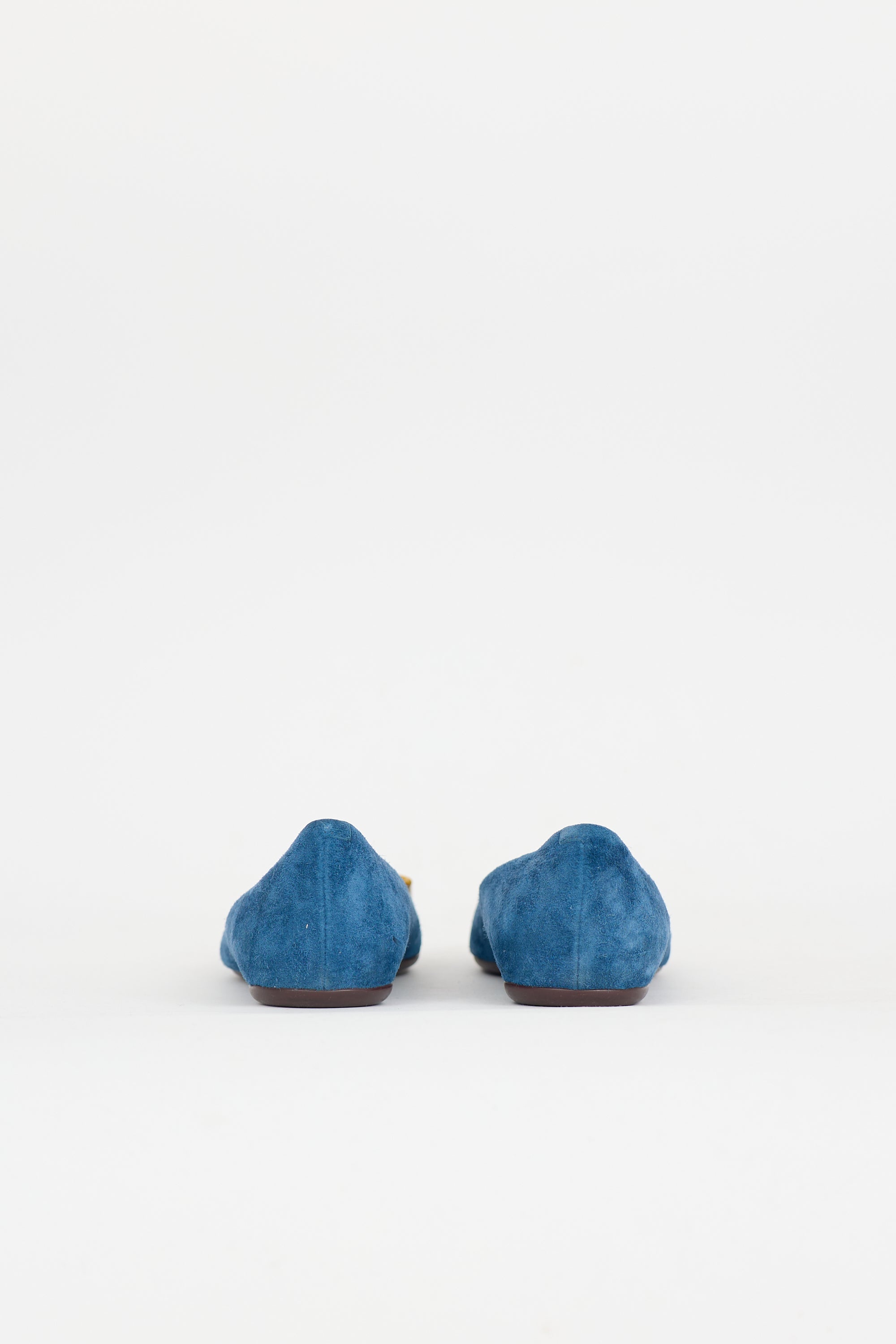 Pre-owned Roger Vivier blue suede flats featuring a rounded toe with yellow buckle hardware, slip on entry, and rubber sole.