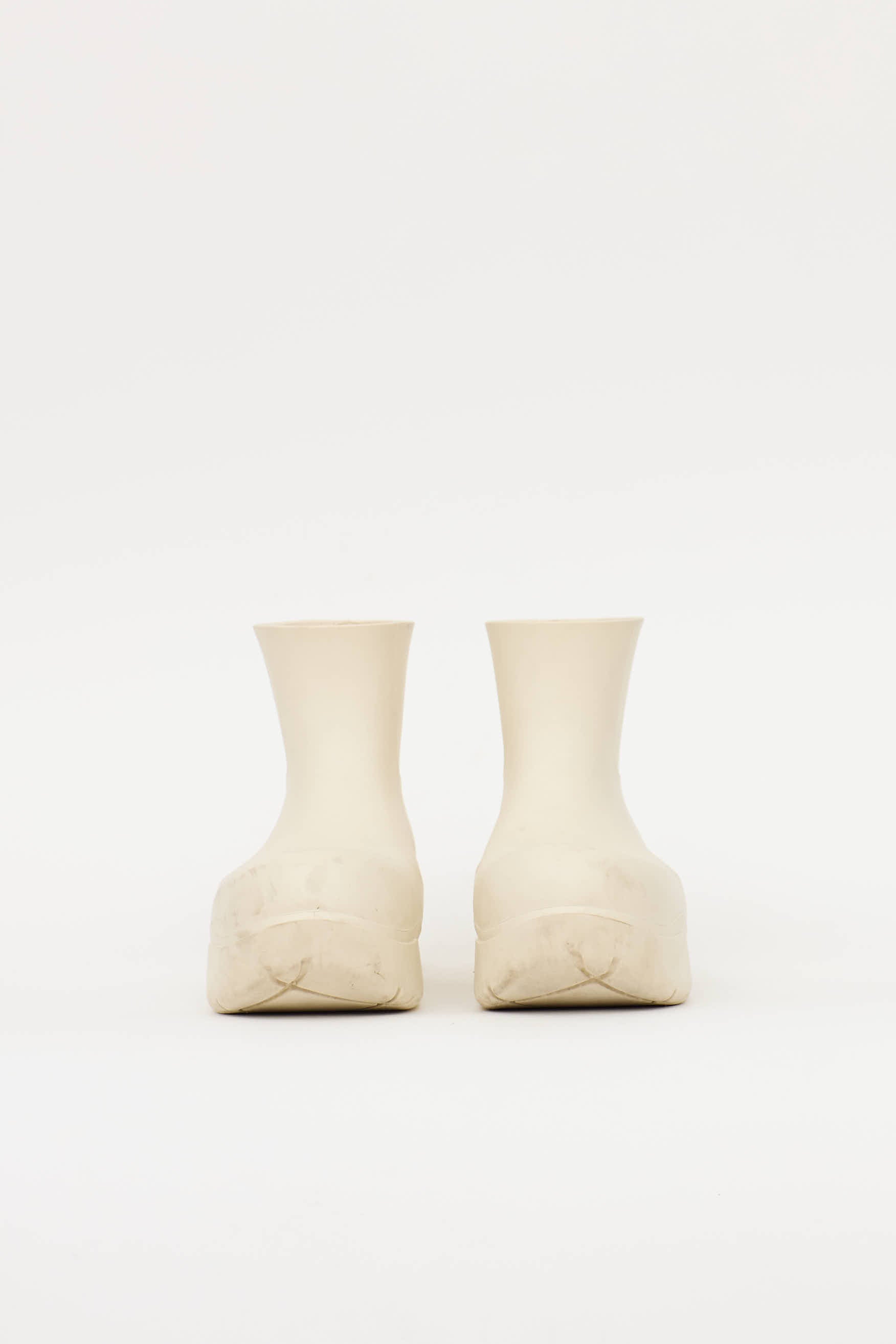 Pre-owned Bottega Veneta ceam rubber Puddle ankle boots featuring rounded toe, pull on entry, and concealed platform.