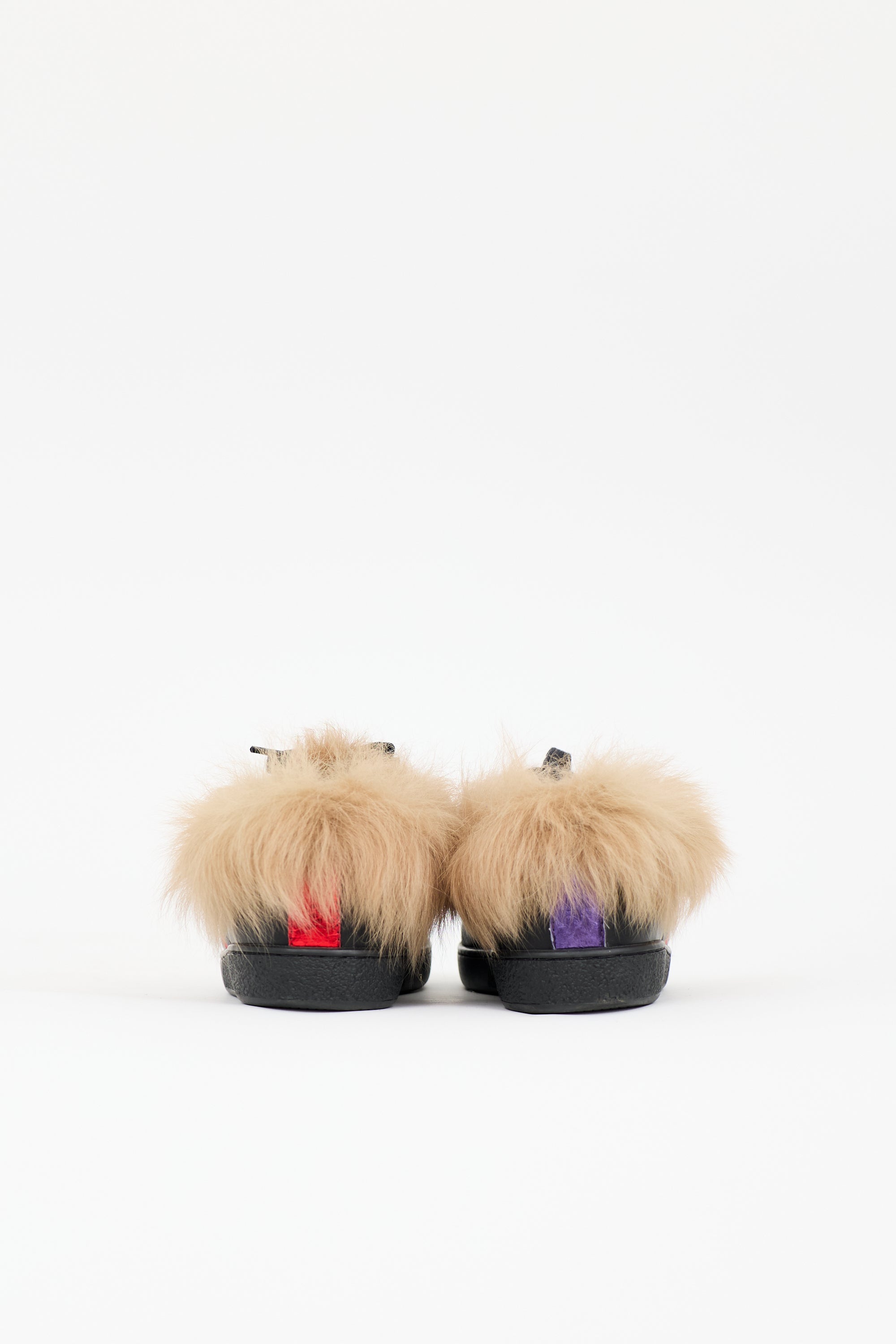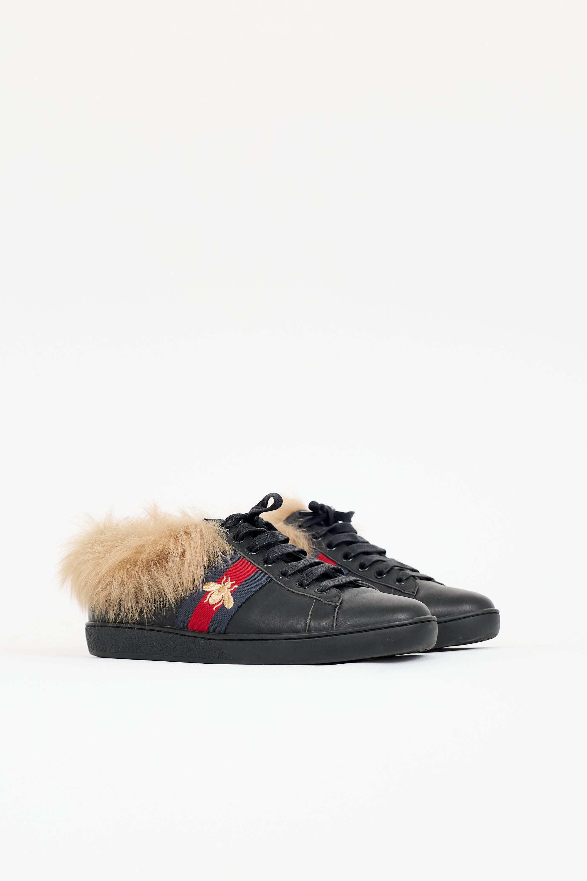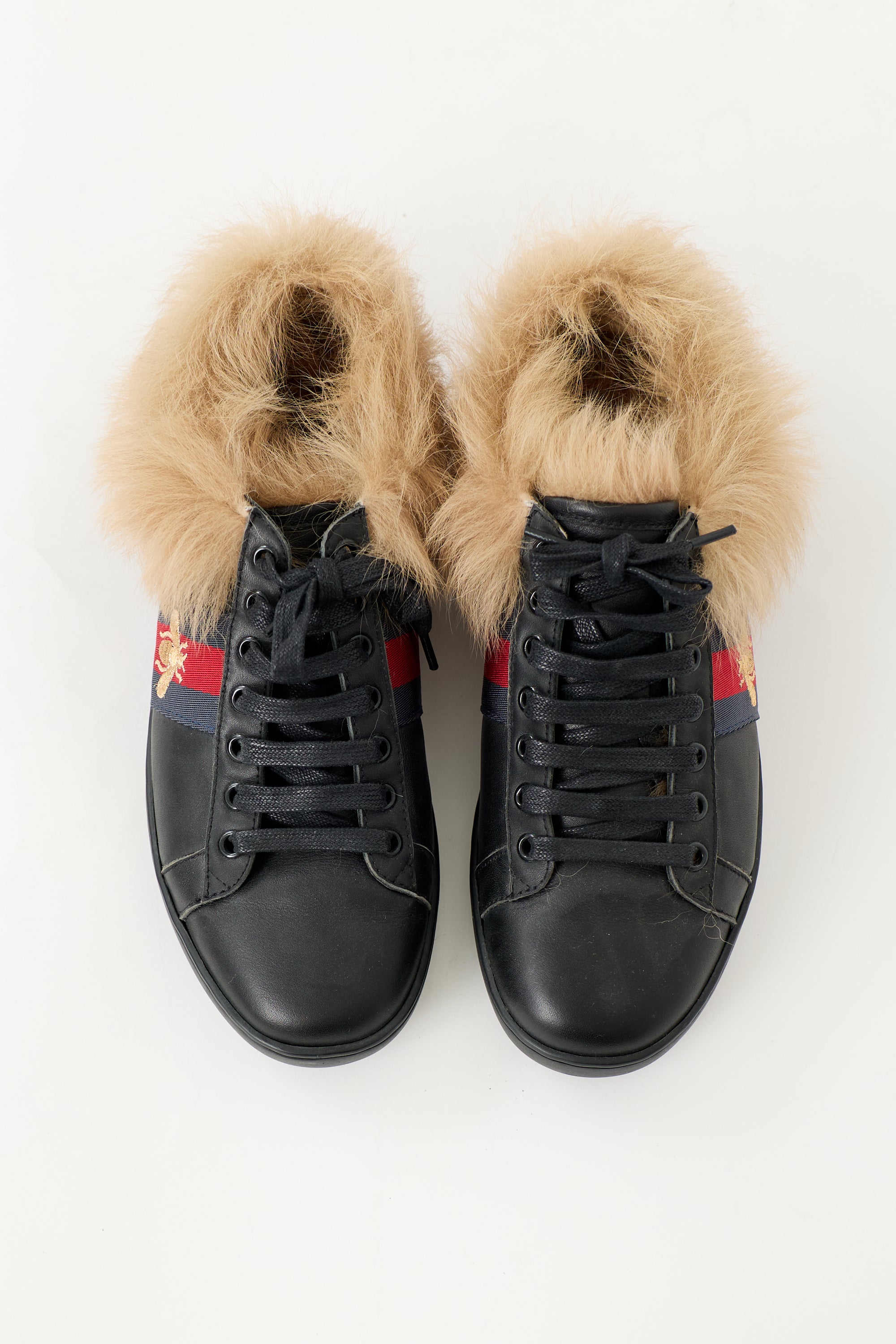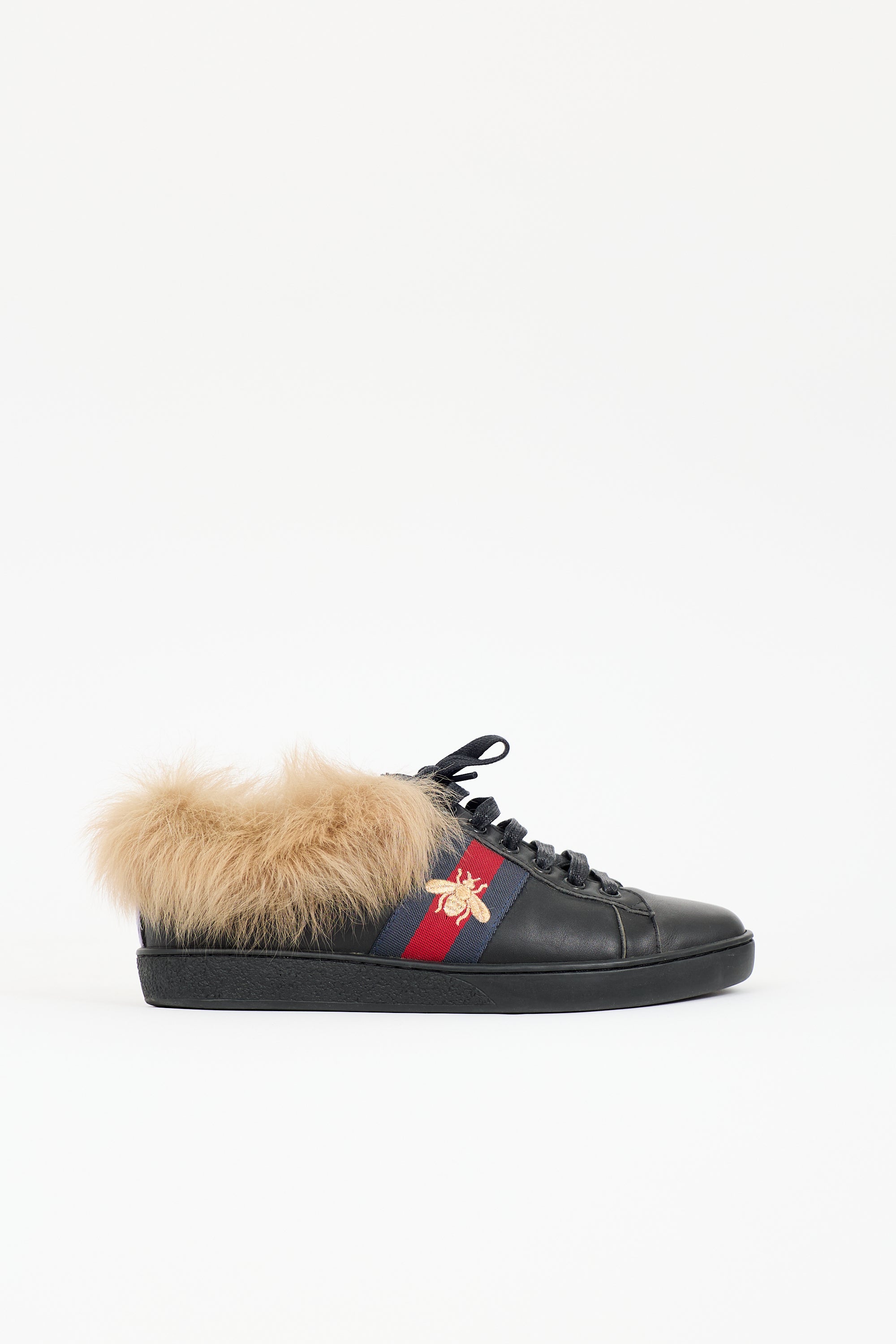 Pre-owned Gucci black leather Ace sneakers featuring rounded toe, lace up front, brown shearling lining, navy and red webbed stripe at side with gold Bee embroidery, purple metallic stripe at right heel, and red metallic stripe at left heel.
