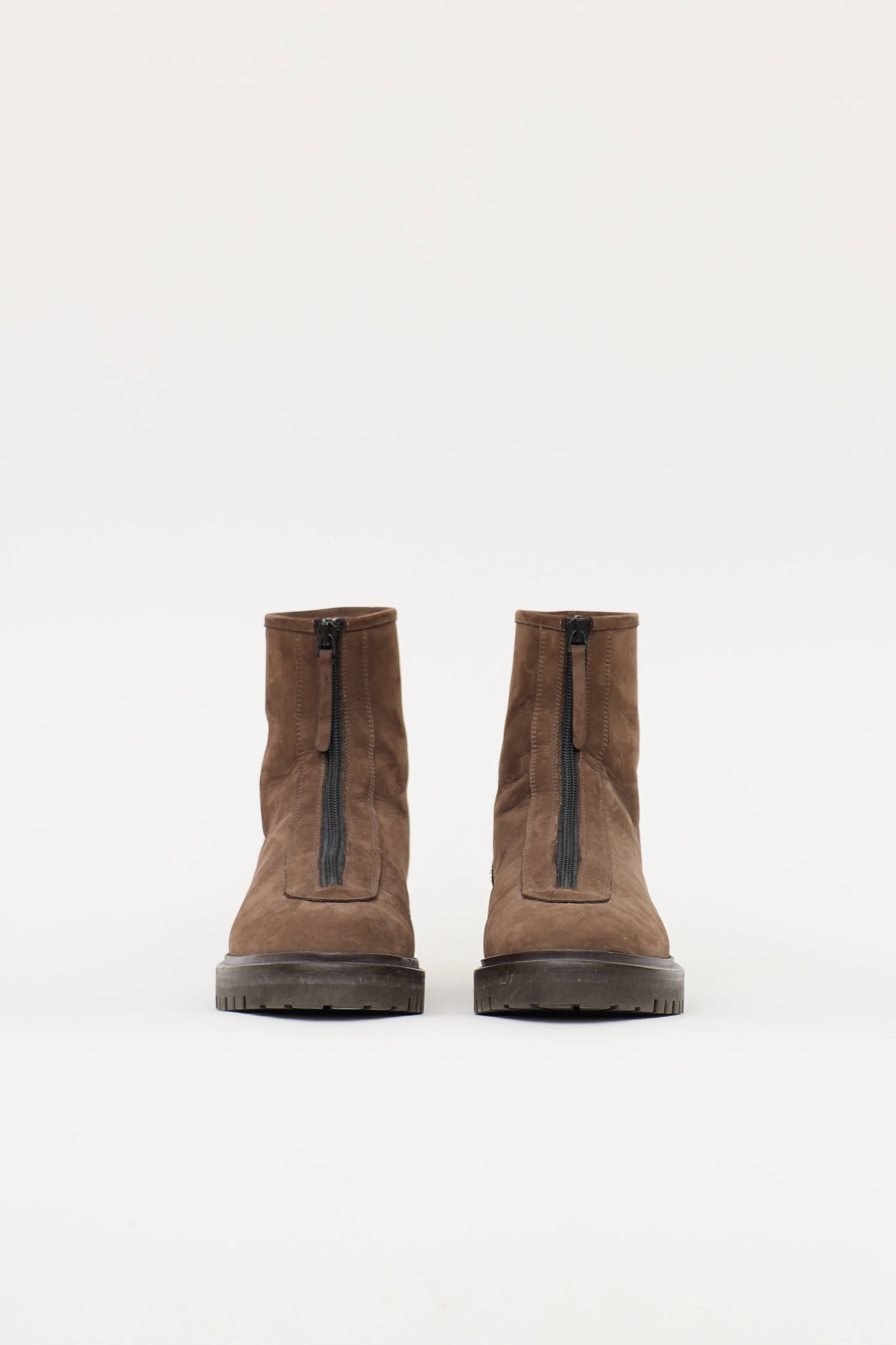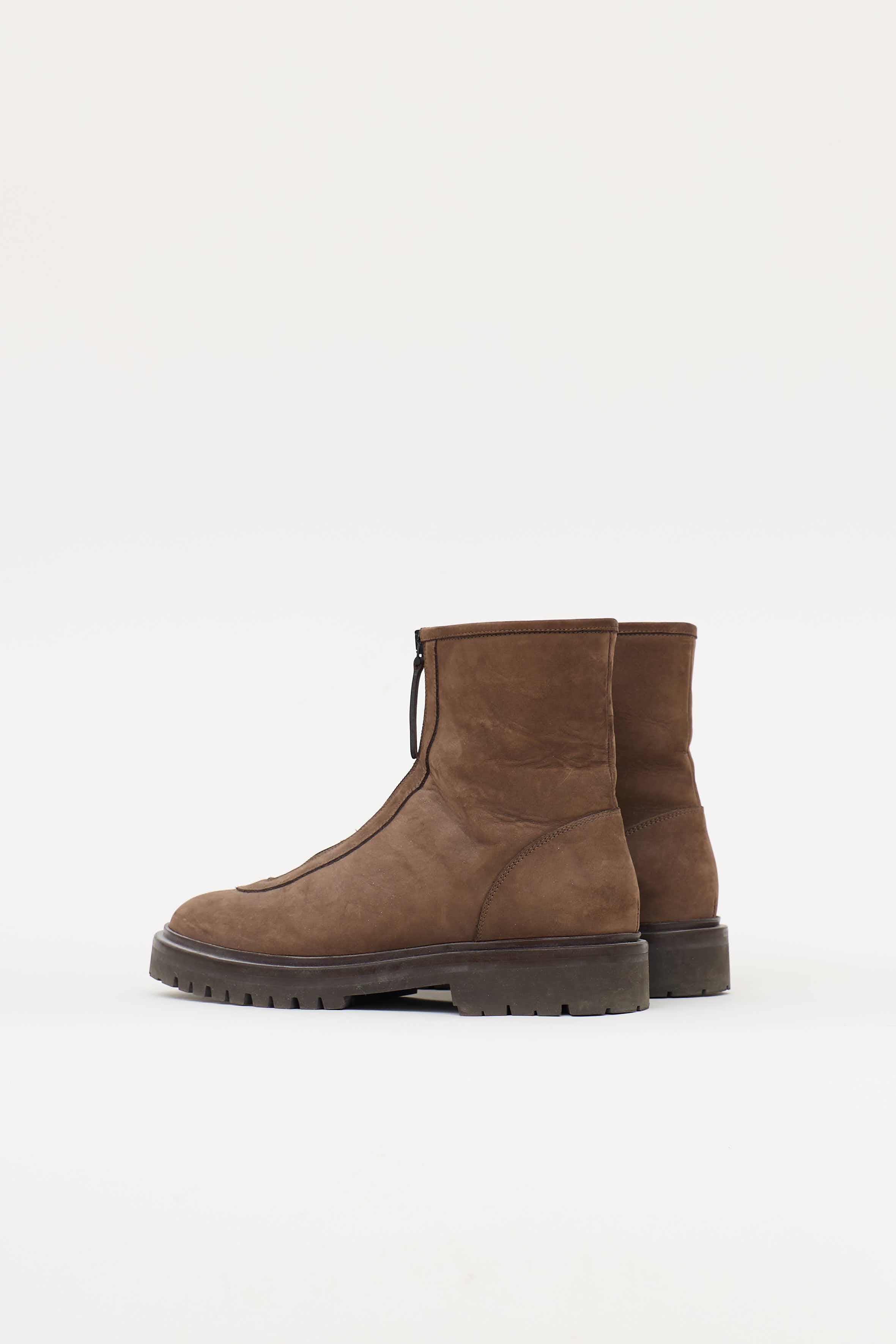 Pre-owned Legres brown ankle boot featuring a rounded toe, suede uppers, zipper entry at front with suede pull tab, and a rubber lug sole.