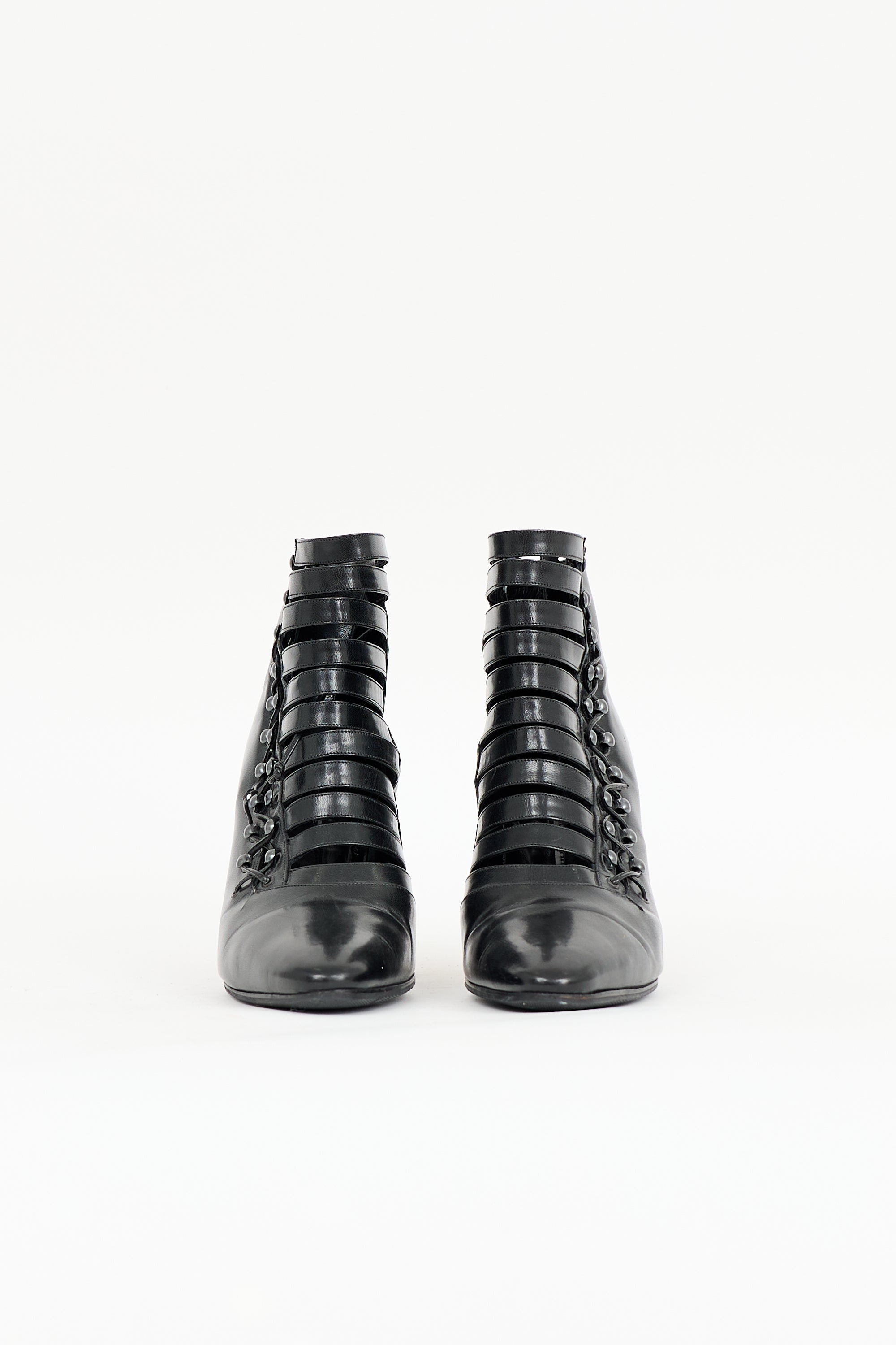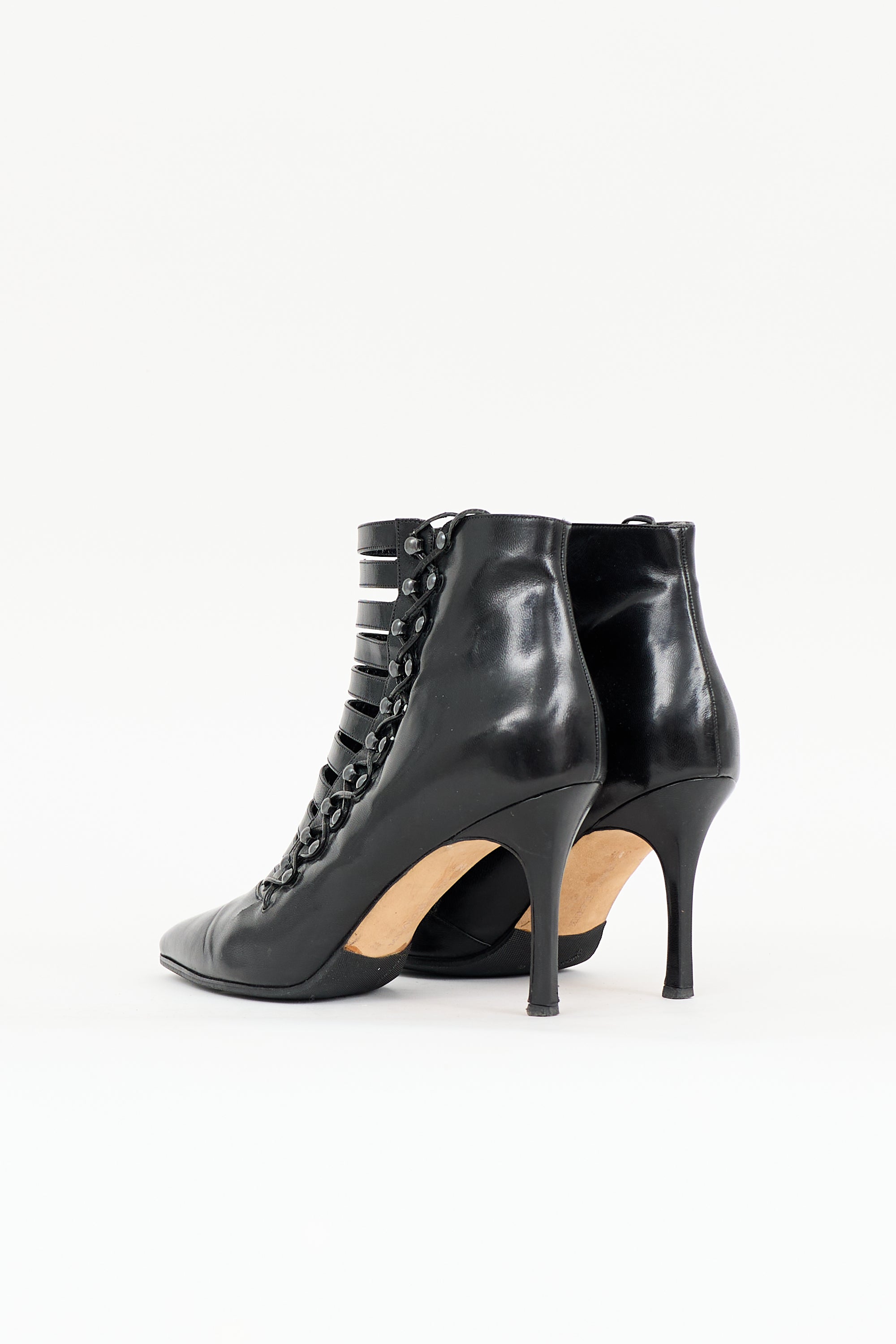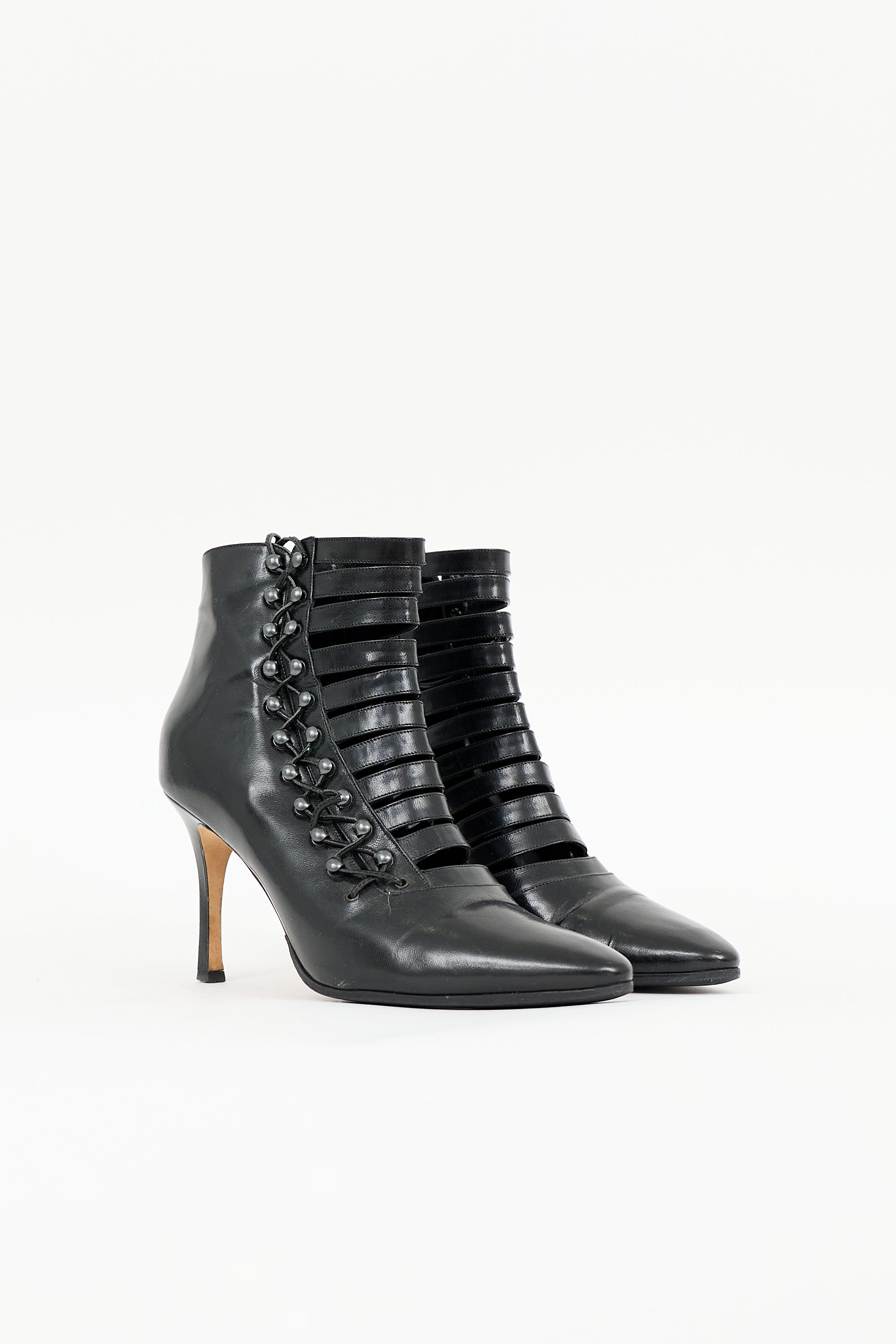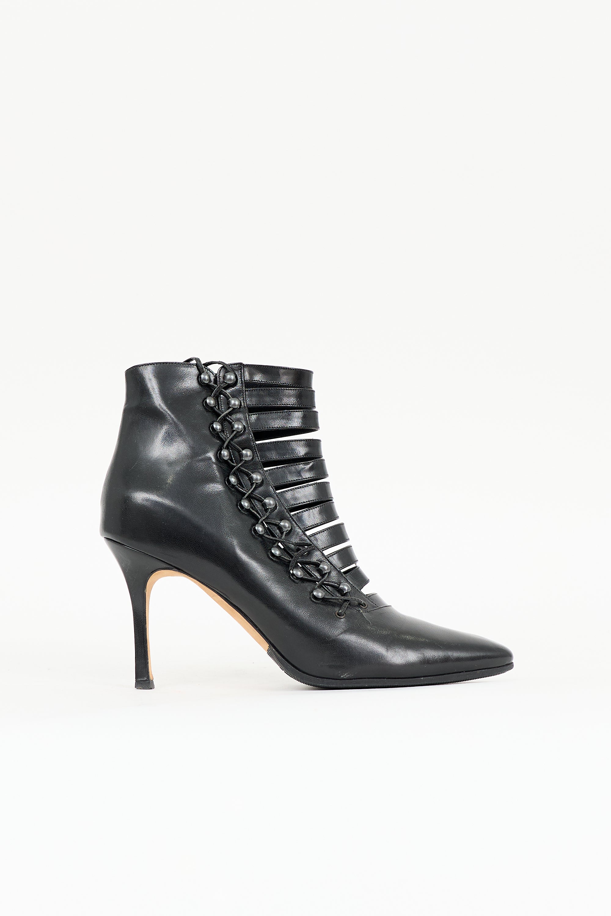 Pre-owned Manolo Blahnik black leather boots featuring pointed toe, lace up design, and covered stiletto heel.