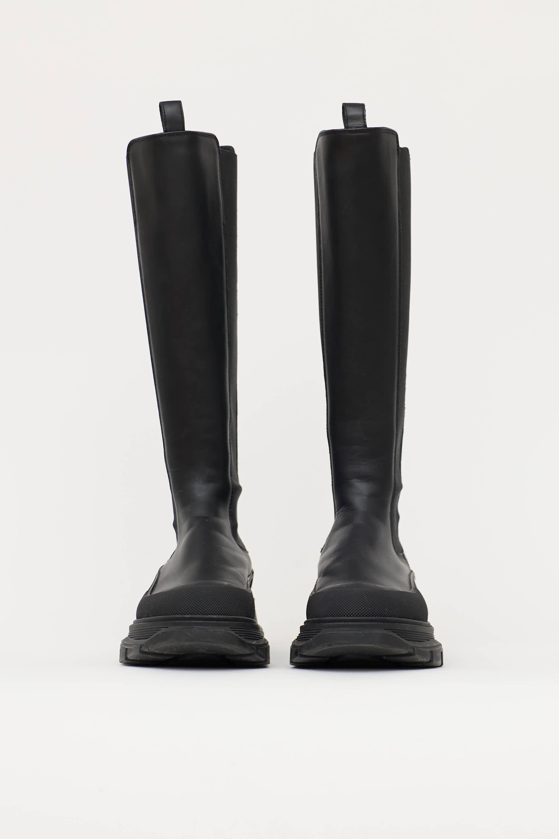 Pre-owned Alexander McQueen black Tread Slick boots featuring a round cap toe, rubber treaded outsole, debossed logo at sides, knee high shaft, gussets at sides, pull tab at collar, and zip closure at back.