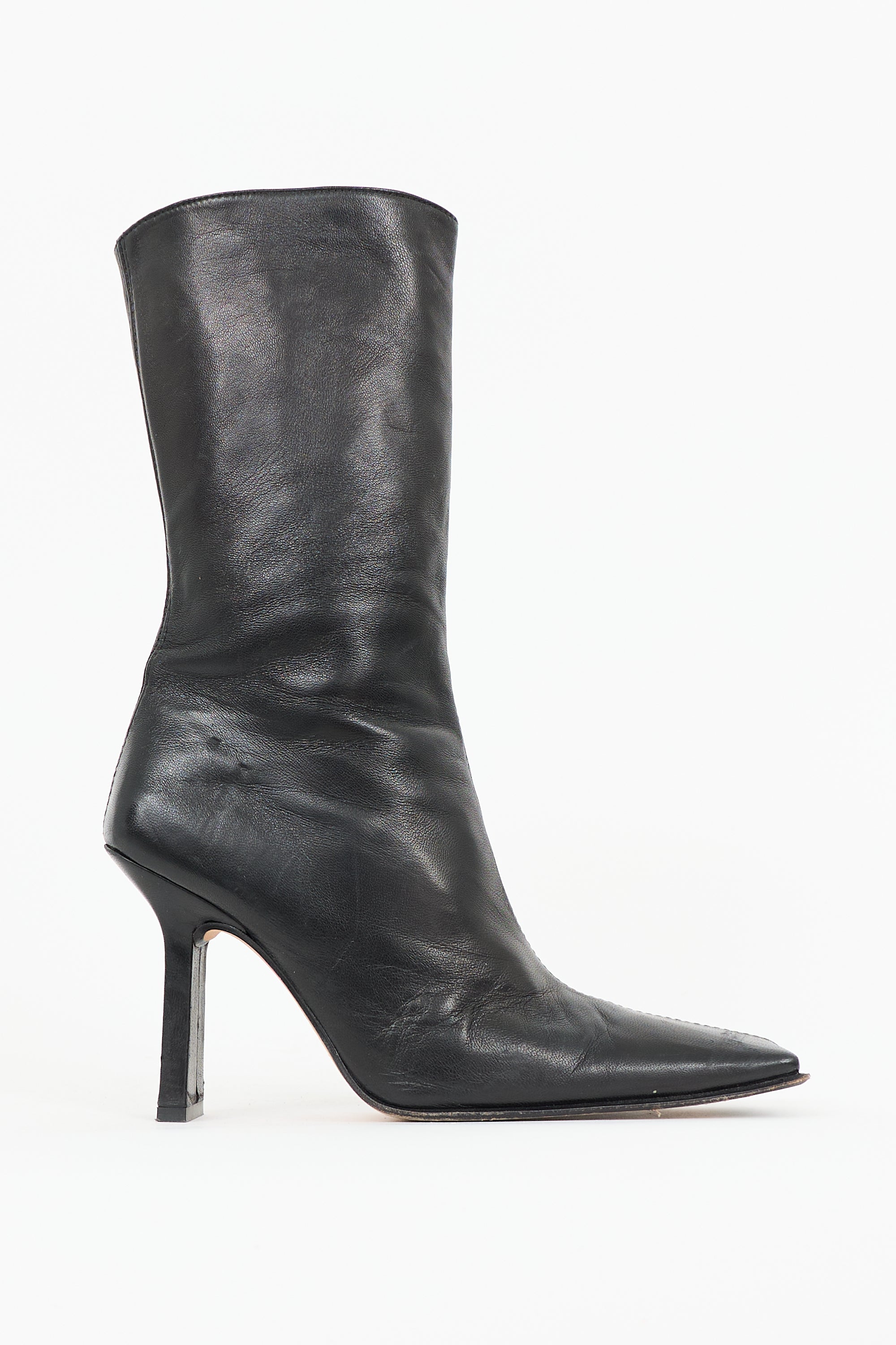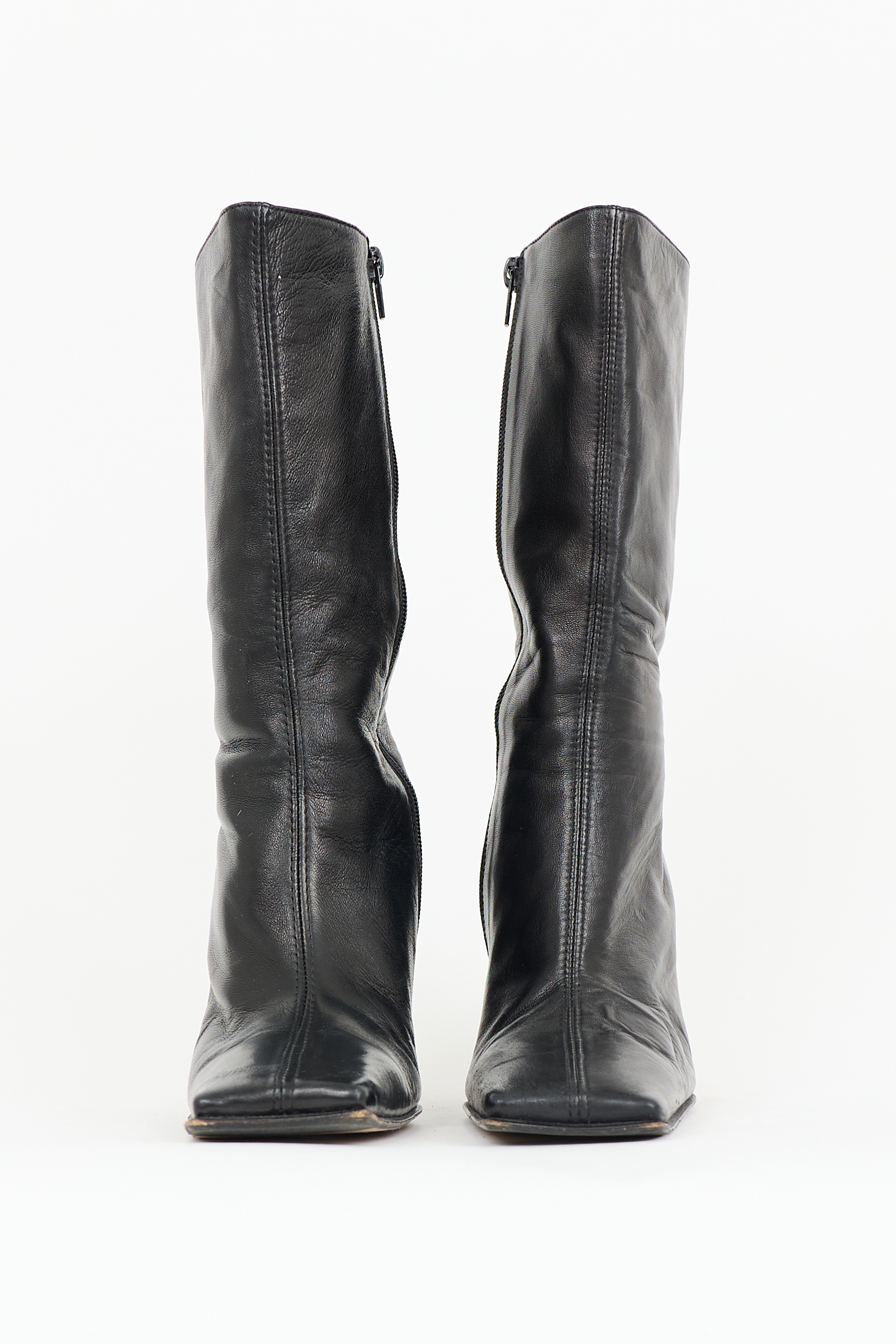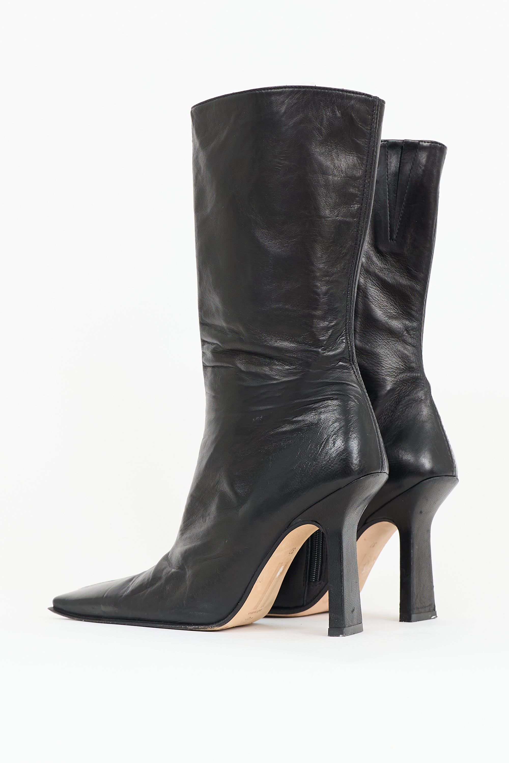 Pre-owned Miista black leather Noor boots featuring tapered toe, inner side zip closure, and covered reflex angle heel.