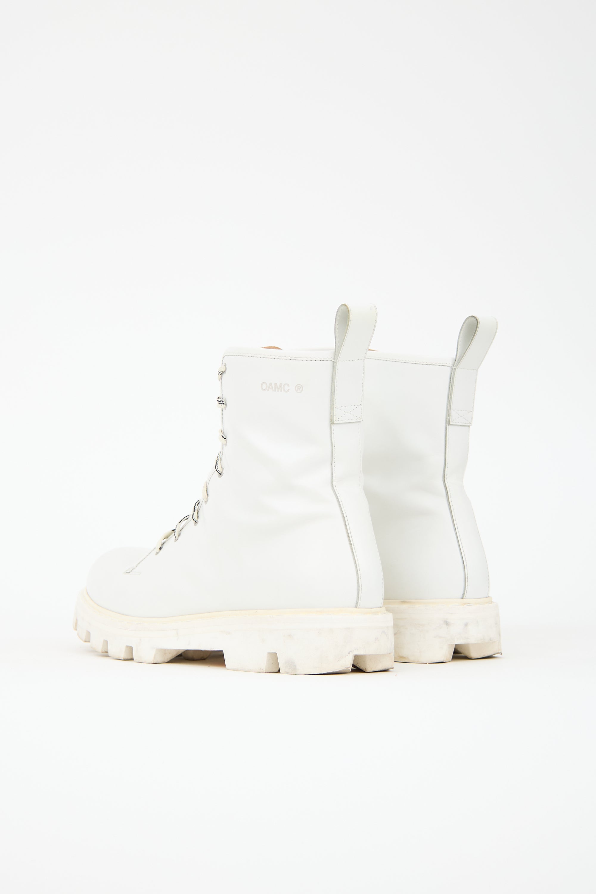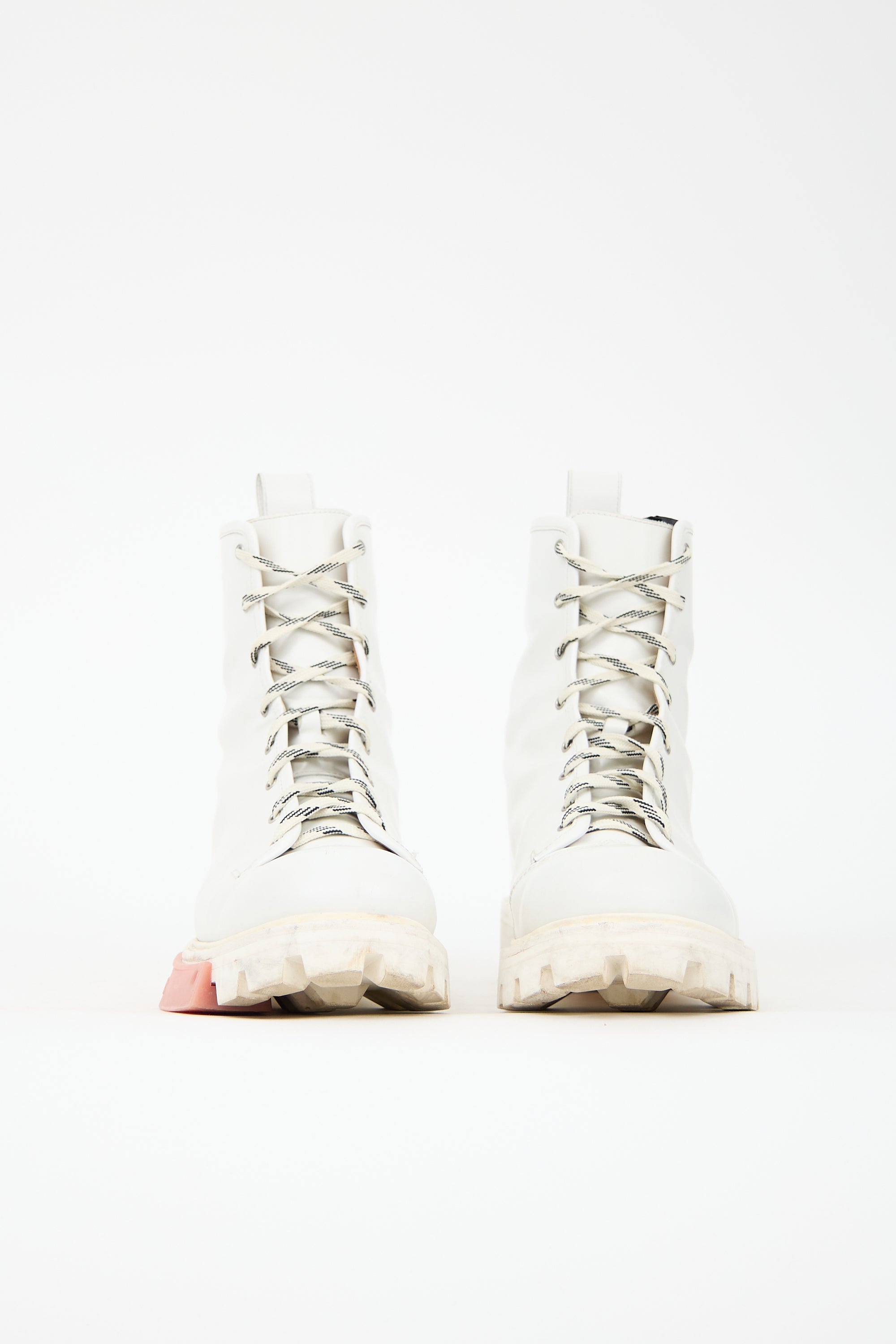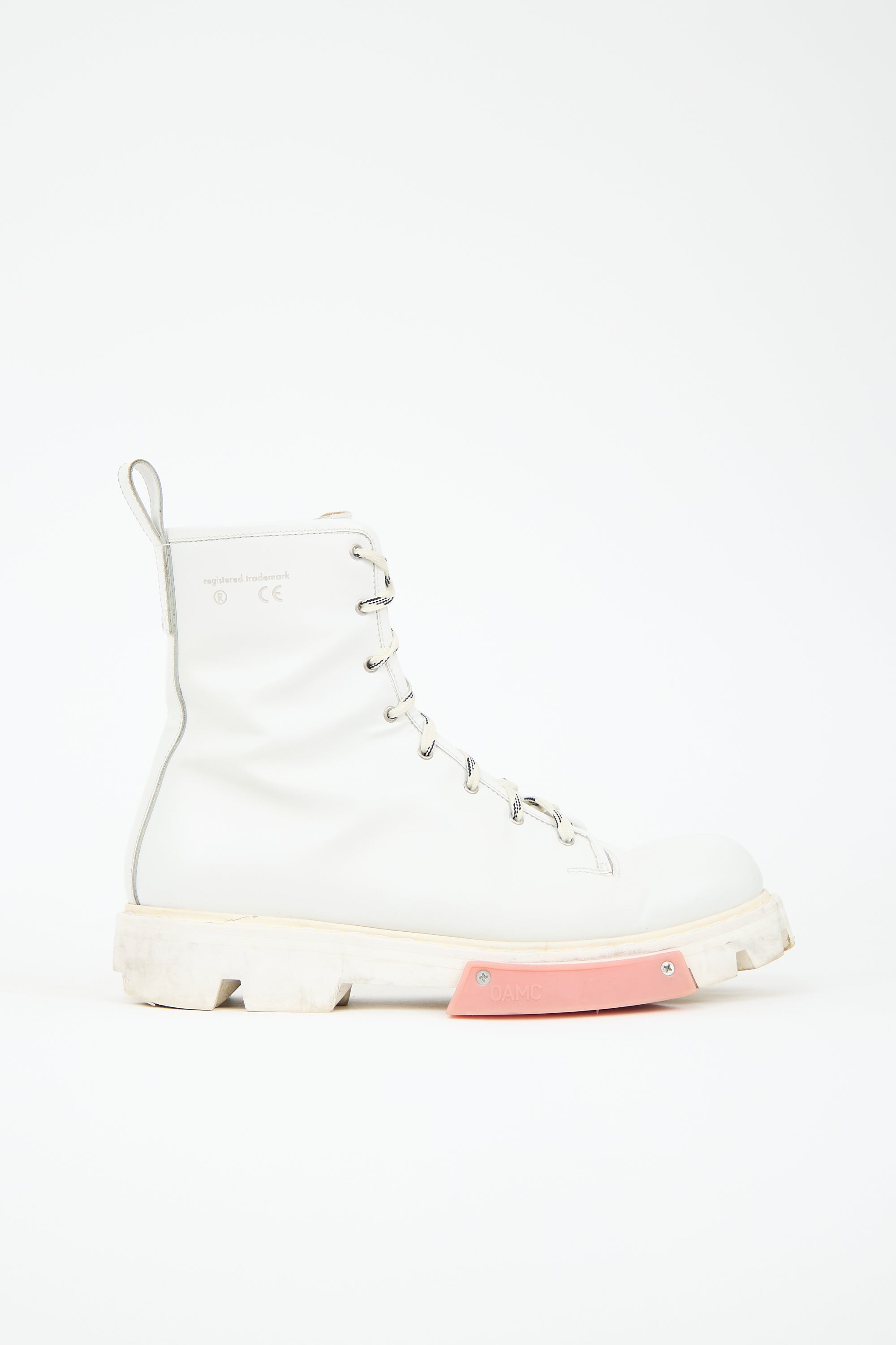 Pre-owned OAMC white leather lace up boots featuring a rounded toe, pull tab at counter, debossed logo at outer side, treaded rubber outsole, and a pink rubber block detail at right sole.