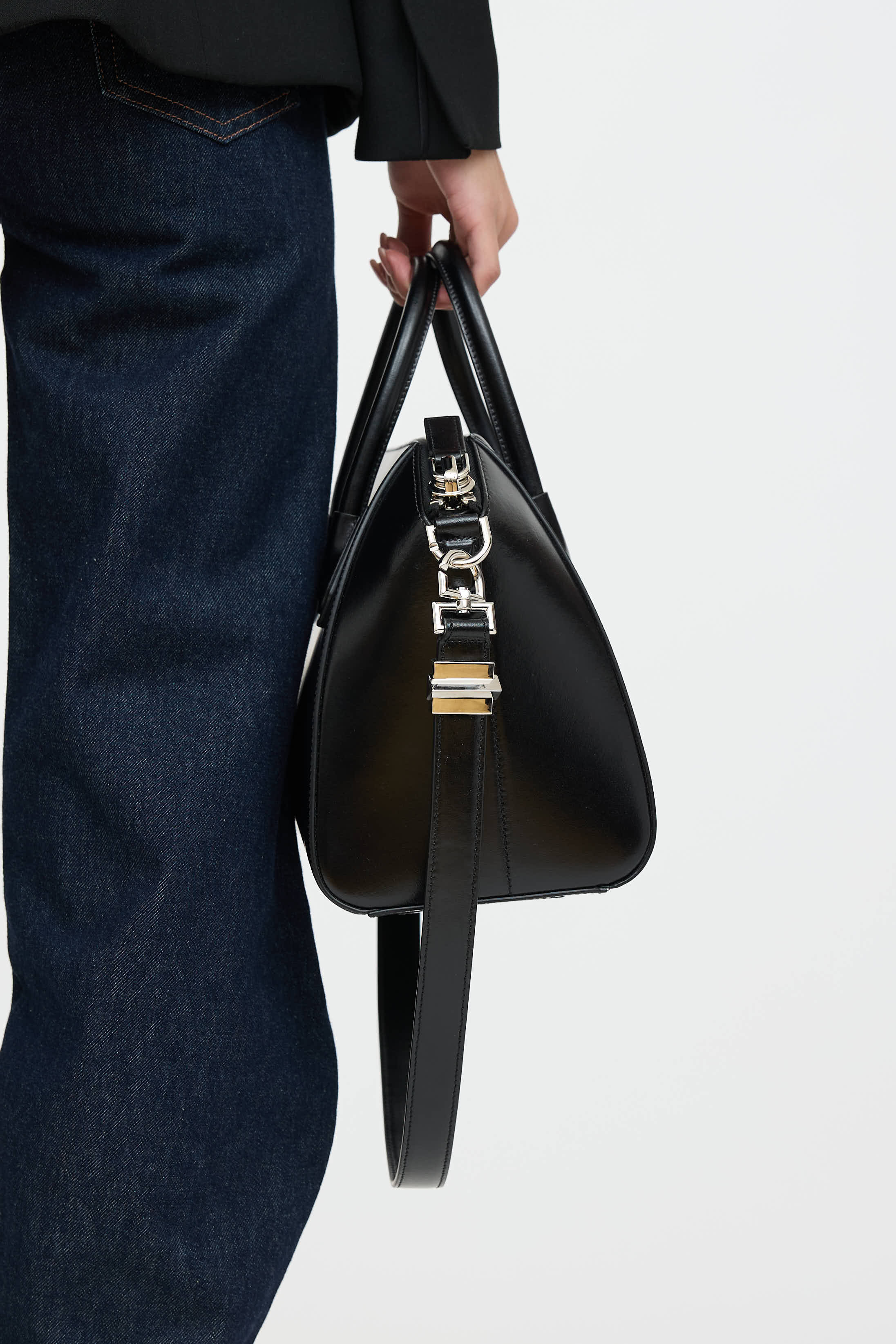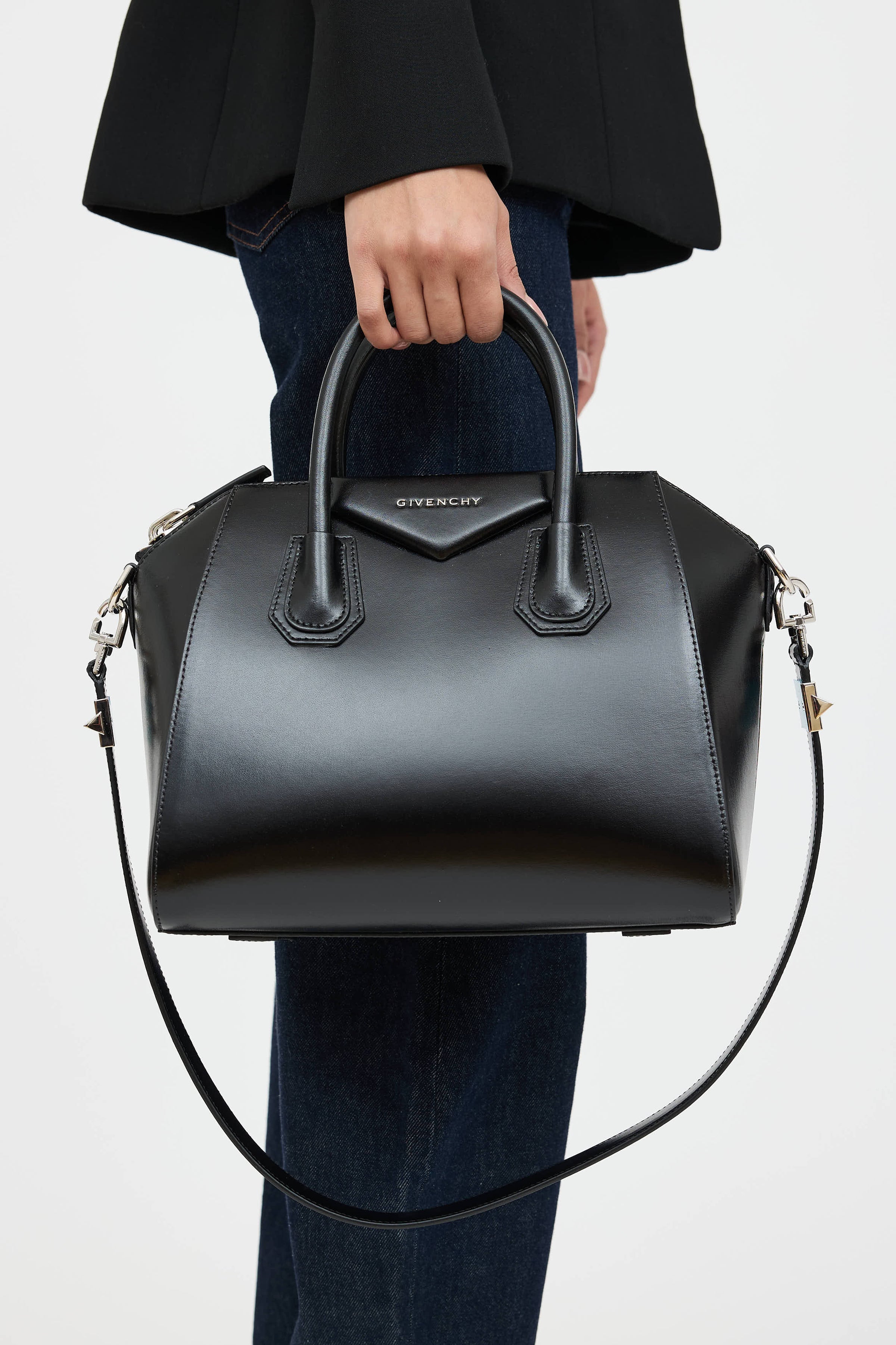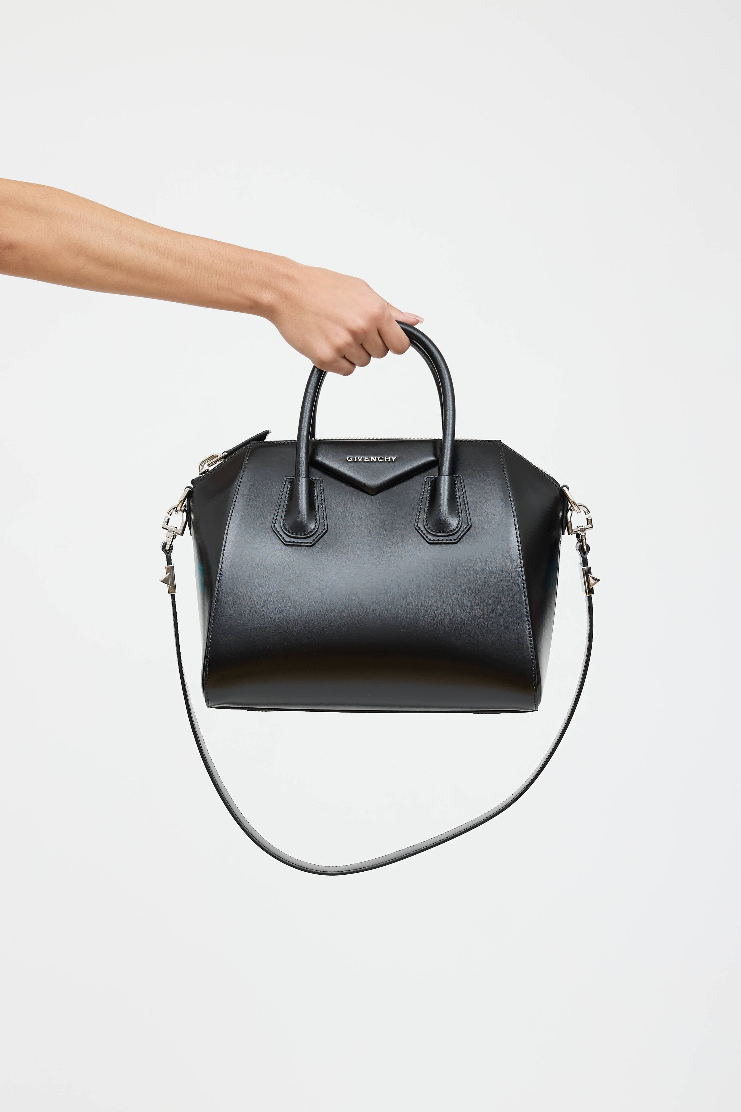 Pre-owned Givenchy black Antigona small leather bag featuring dual rolled top handles, detachable shoulder strap with studded hardware, silver tone logo hardware at face, one main compartment with two slip pockets and one zip pocket, and top zip closure.
