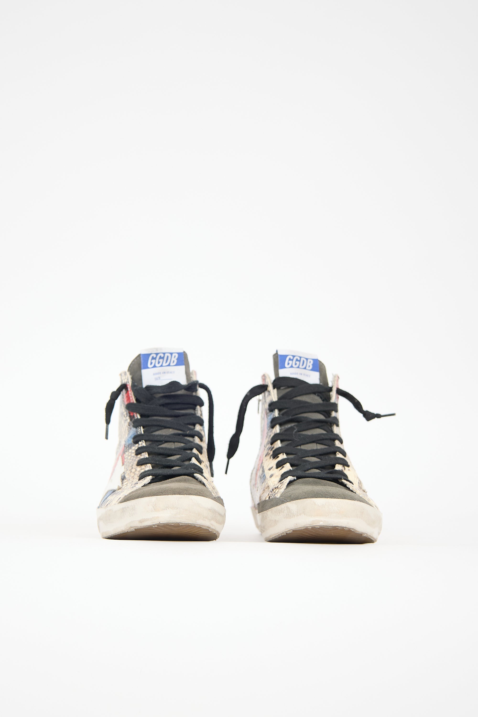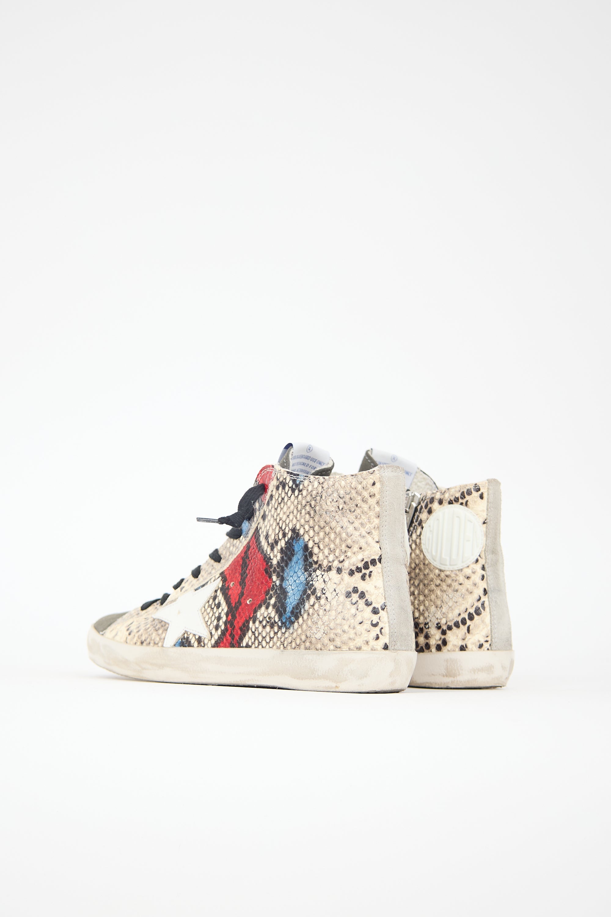 Pre-owned Golden Goose multicolour leather Francy sneaker featuring rounded toe with suede cap, lace up front, snakeskin effect leather, star patch and zip closure at side, and intentional distressing throughout.