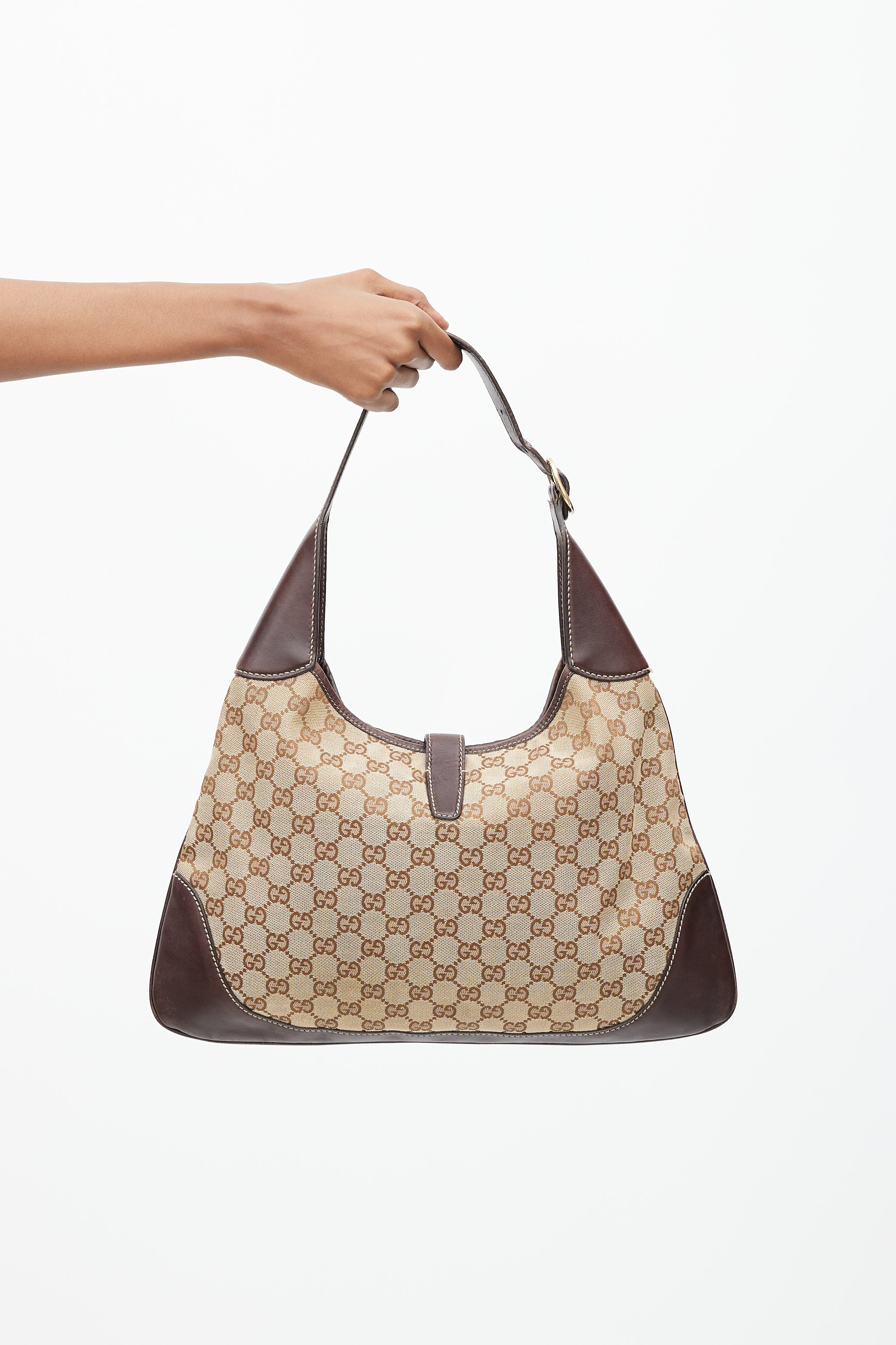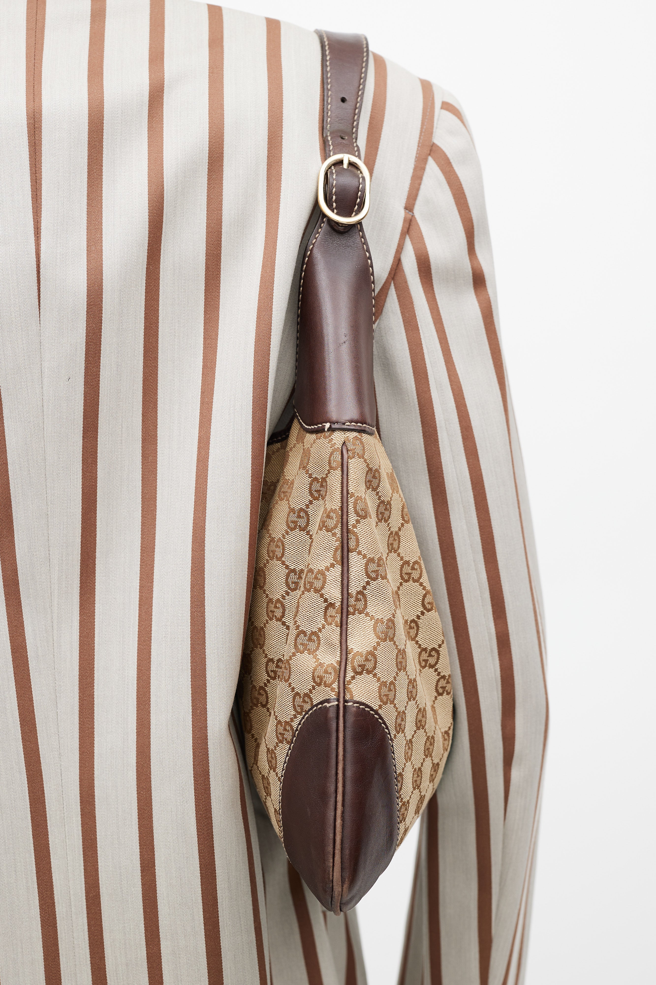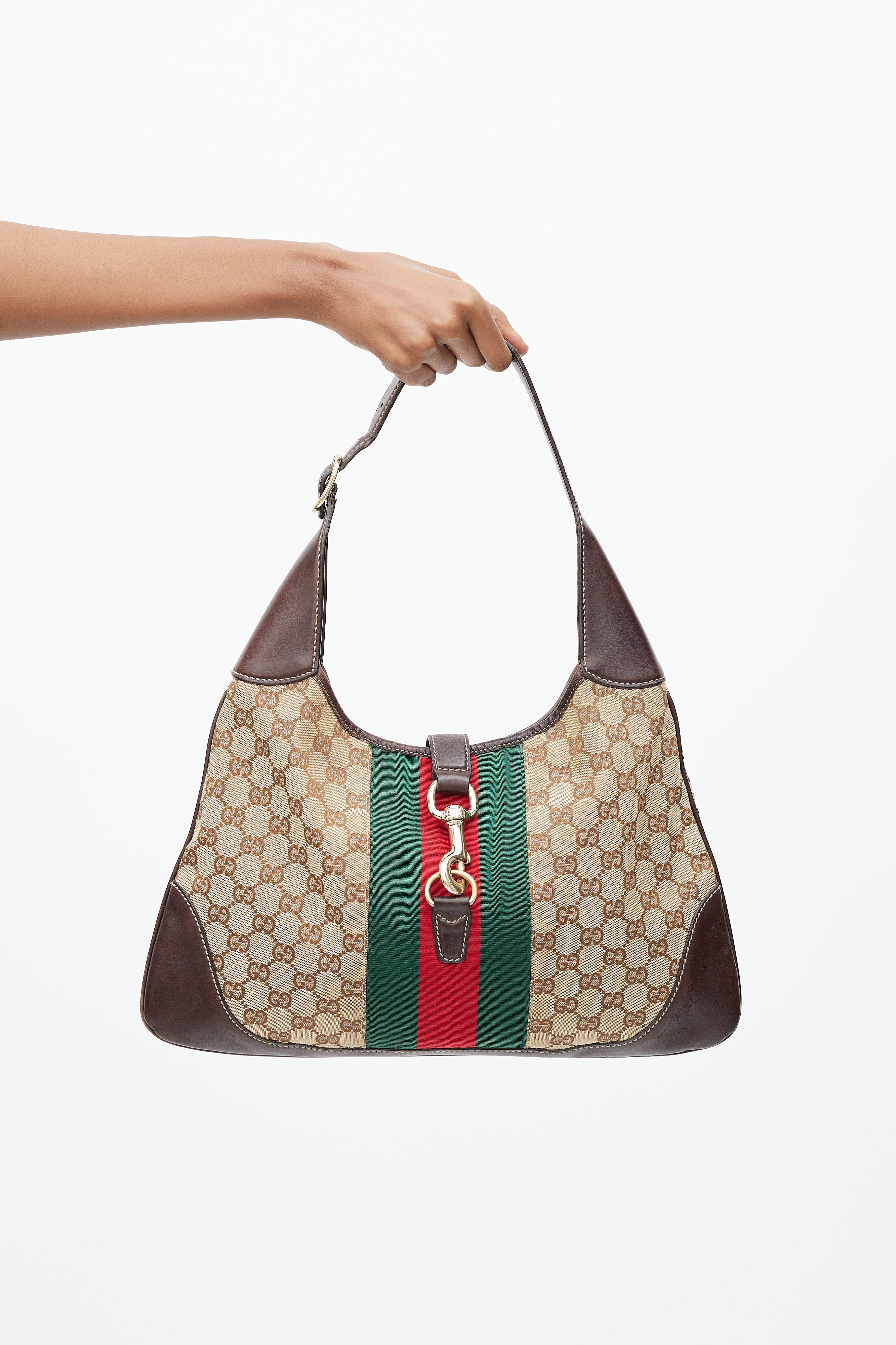 Pre-owned Gucci brown canvas and leather Jackie 1961 bag featuring webbing trim and lock closure at front, single leather top handle with adjustable buckle, GG monogram canvas throughout, leather panels at corners of bag, tonal stitching throughout, single zip pocket at interior, and interior lined with fabric.