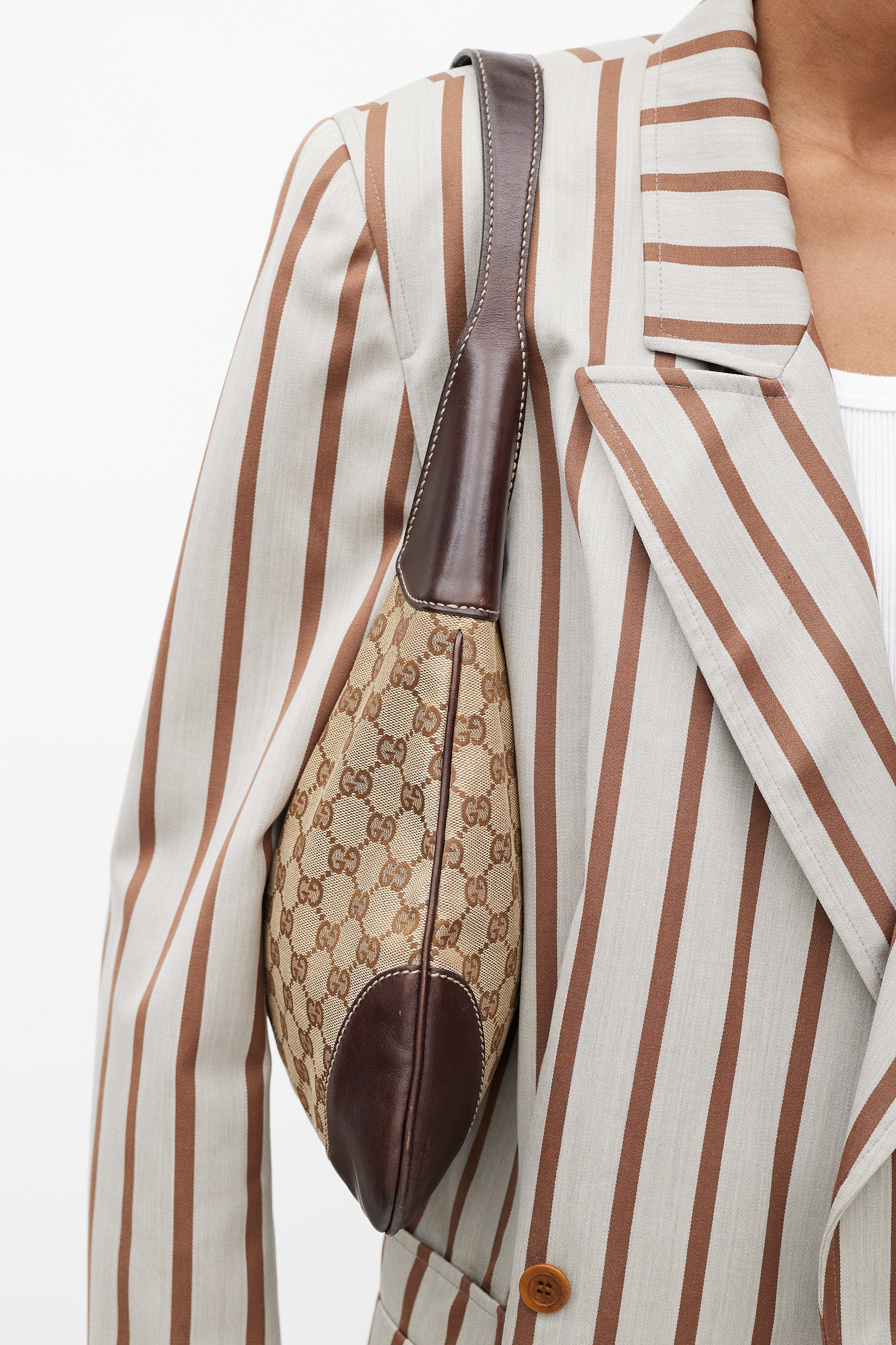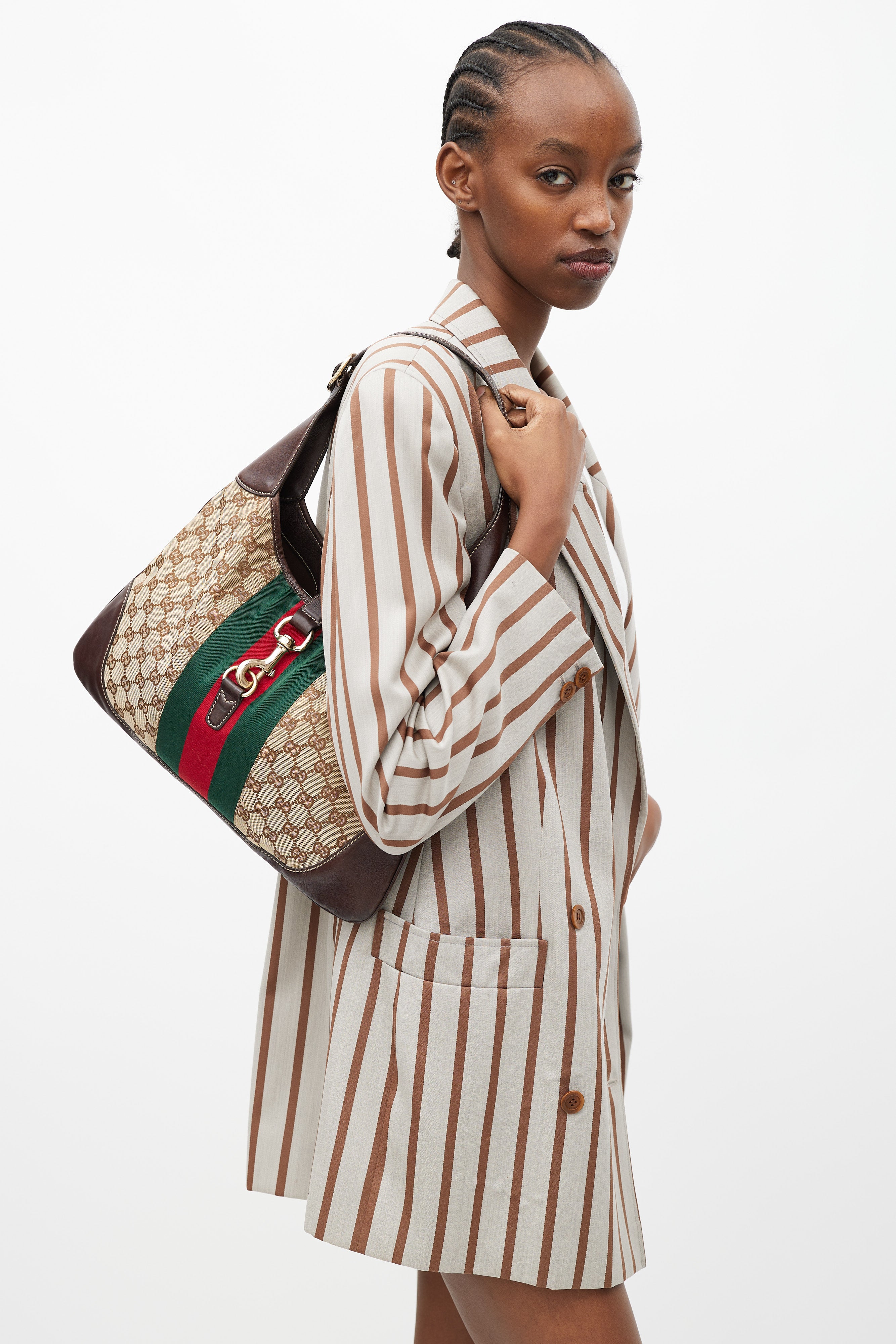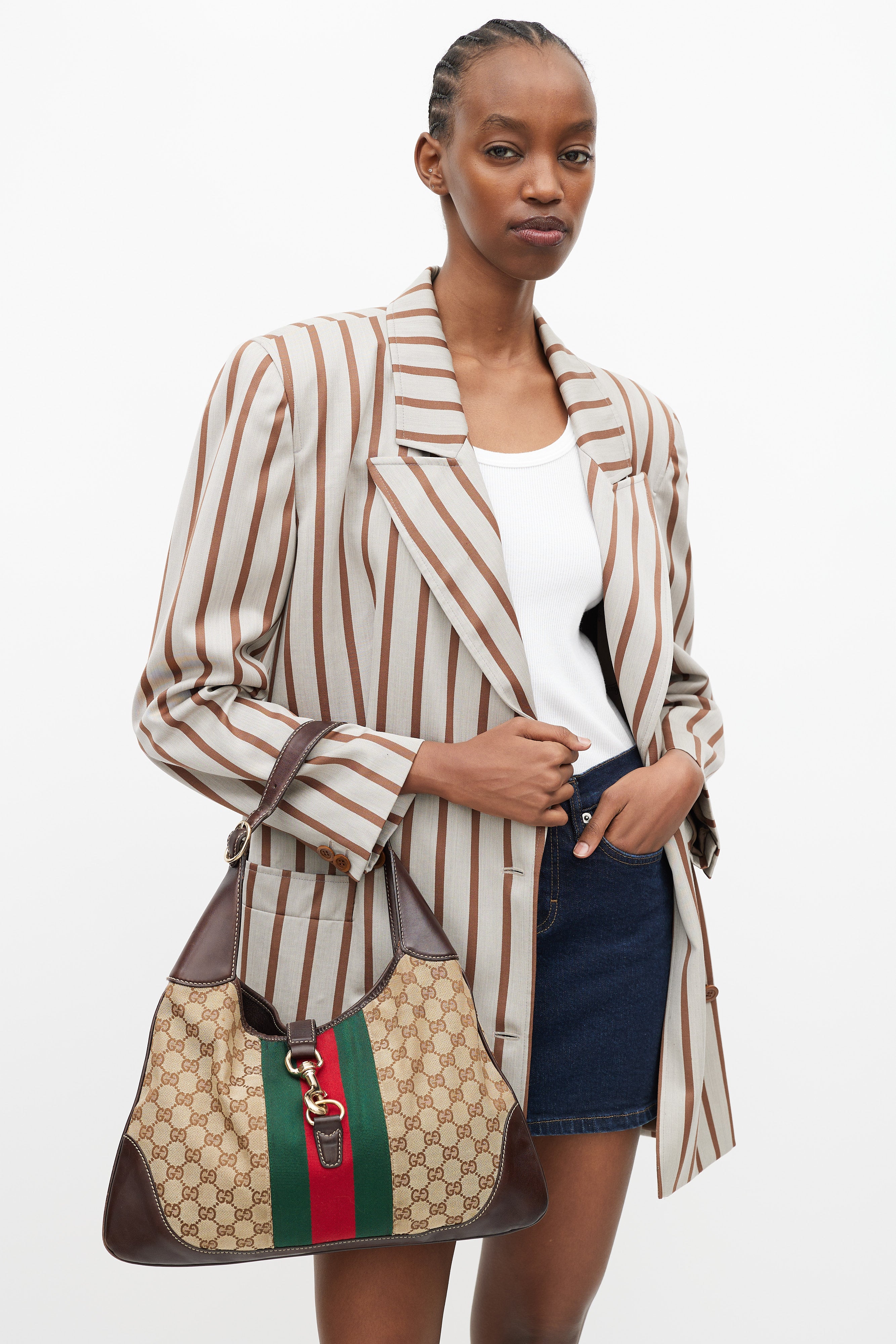Pre-owned Gucci brown canvas and leather Jackie 1961 bag featuring webbing trim and lock closure at front, single leather top handle with adjustable buckle, GG monogram canvas throughout, leather panels at corners of bag, tonal stitching throughout, single zip pocket at interior, and interior lined with fabric.