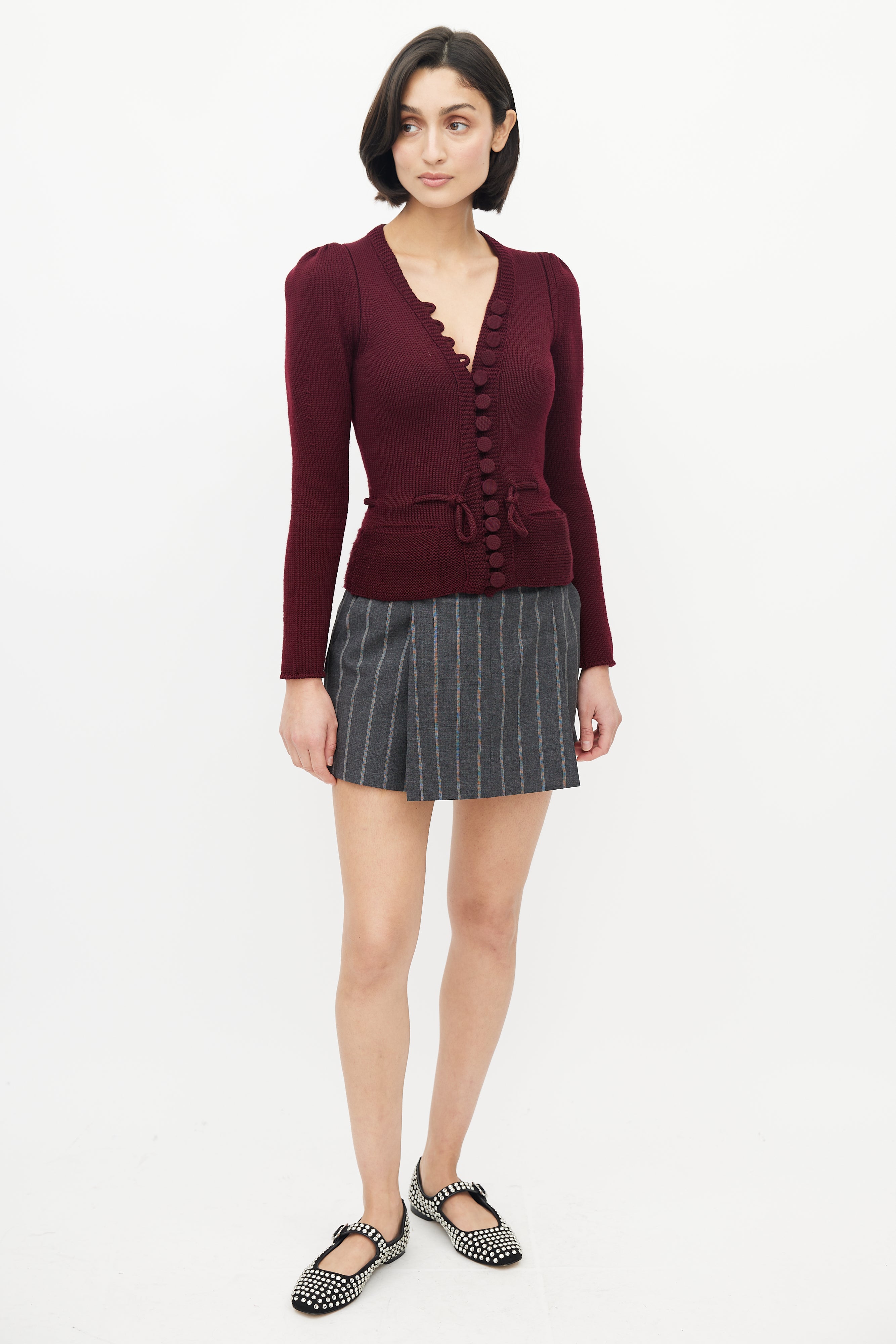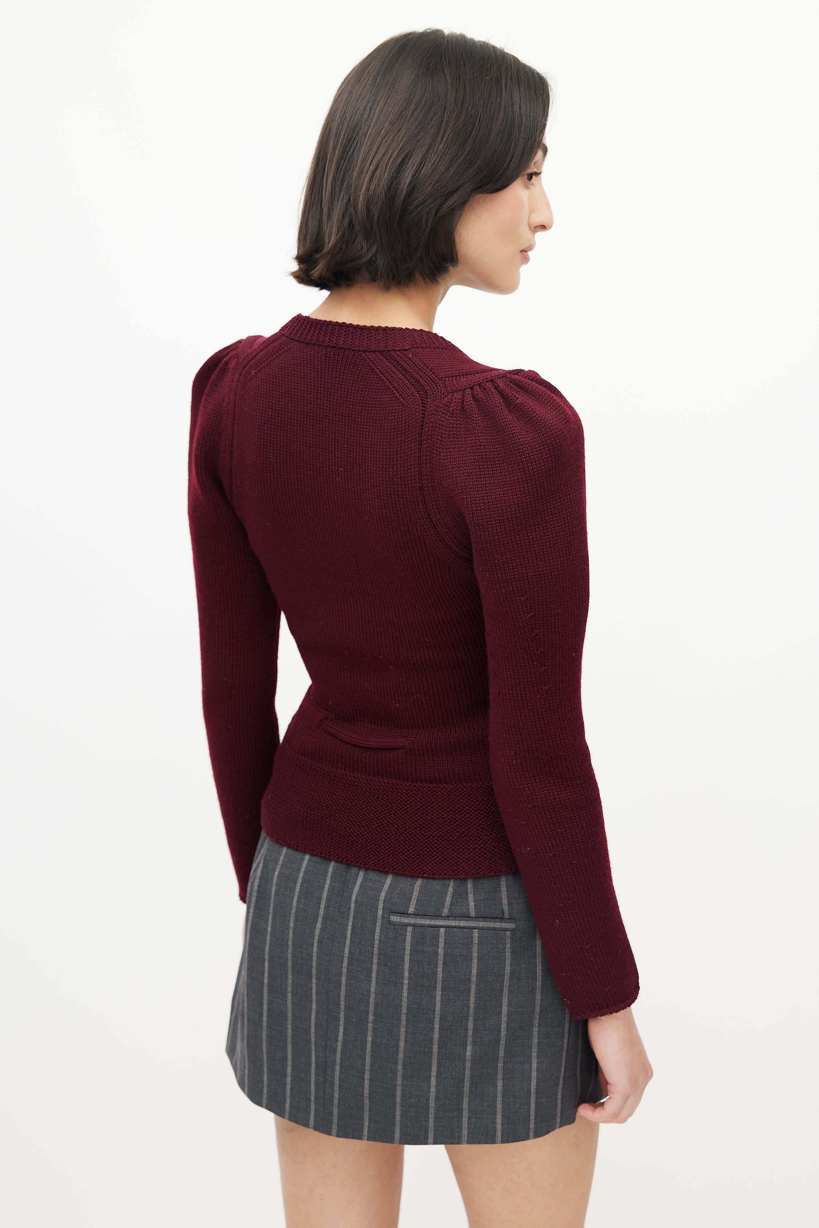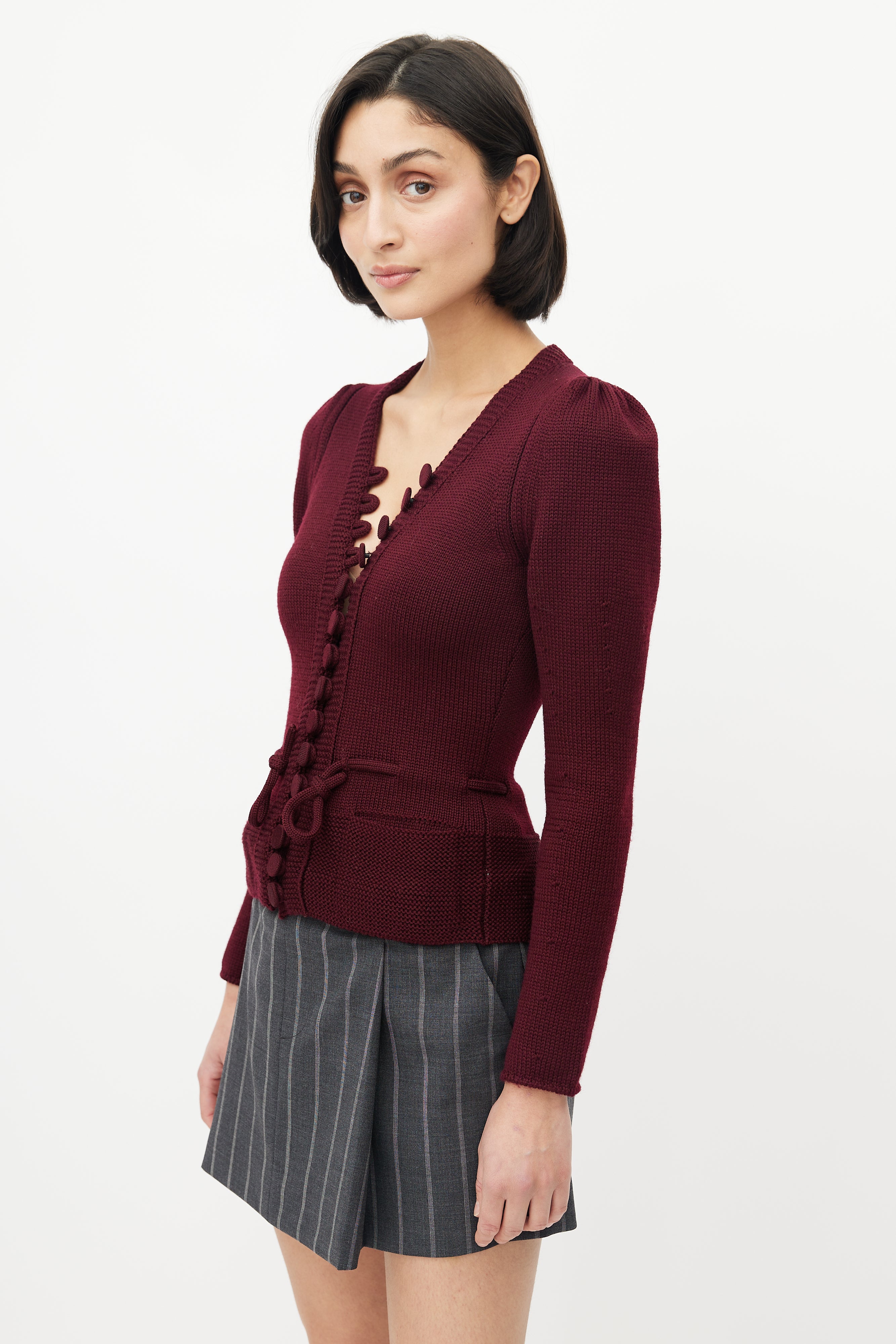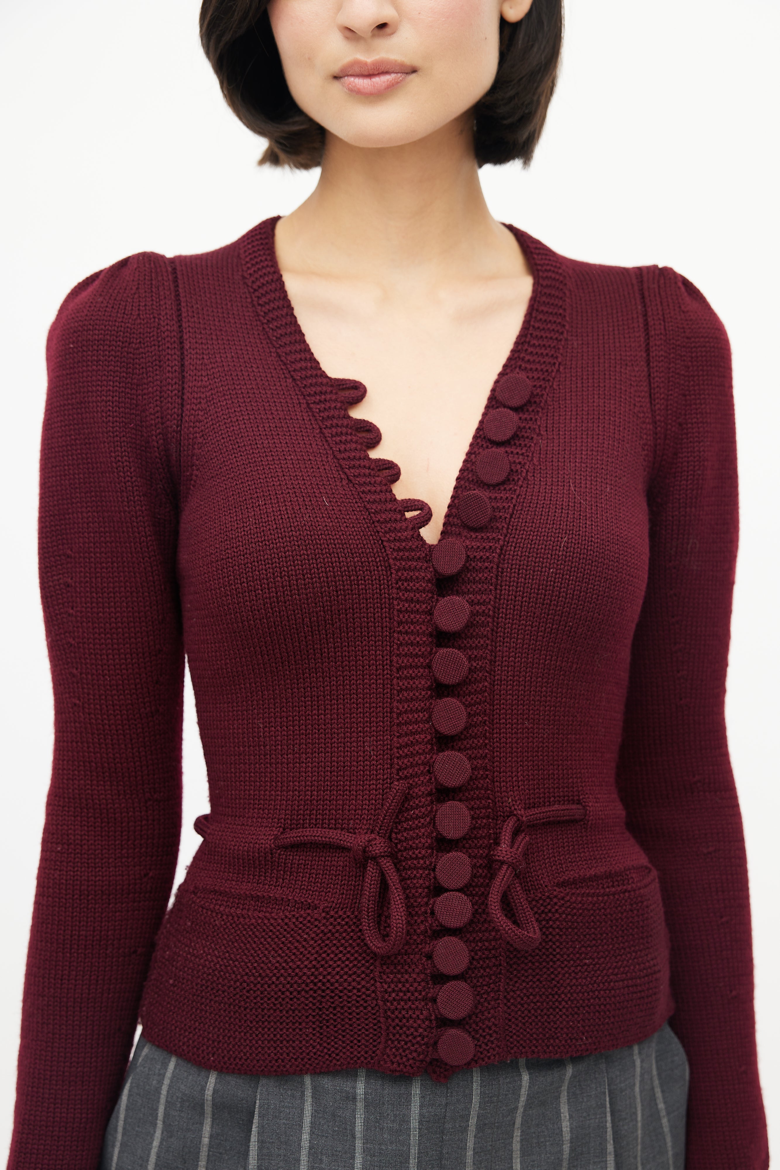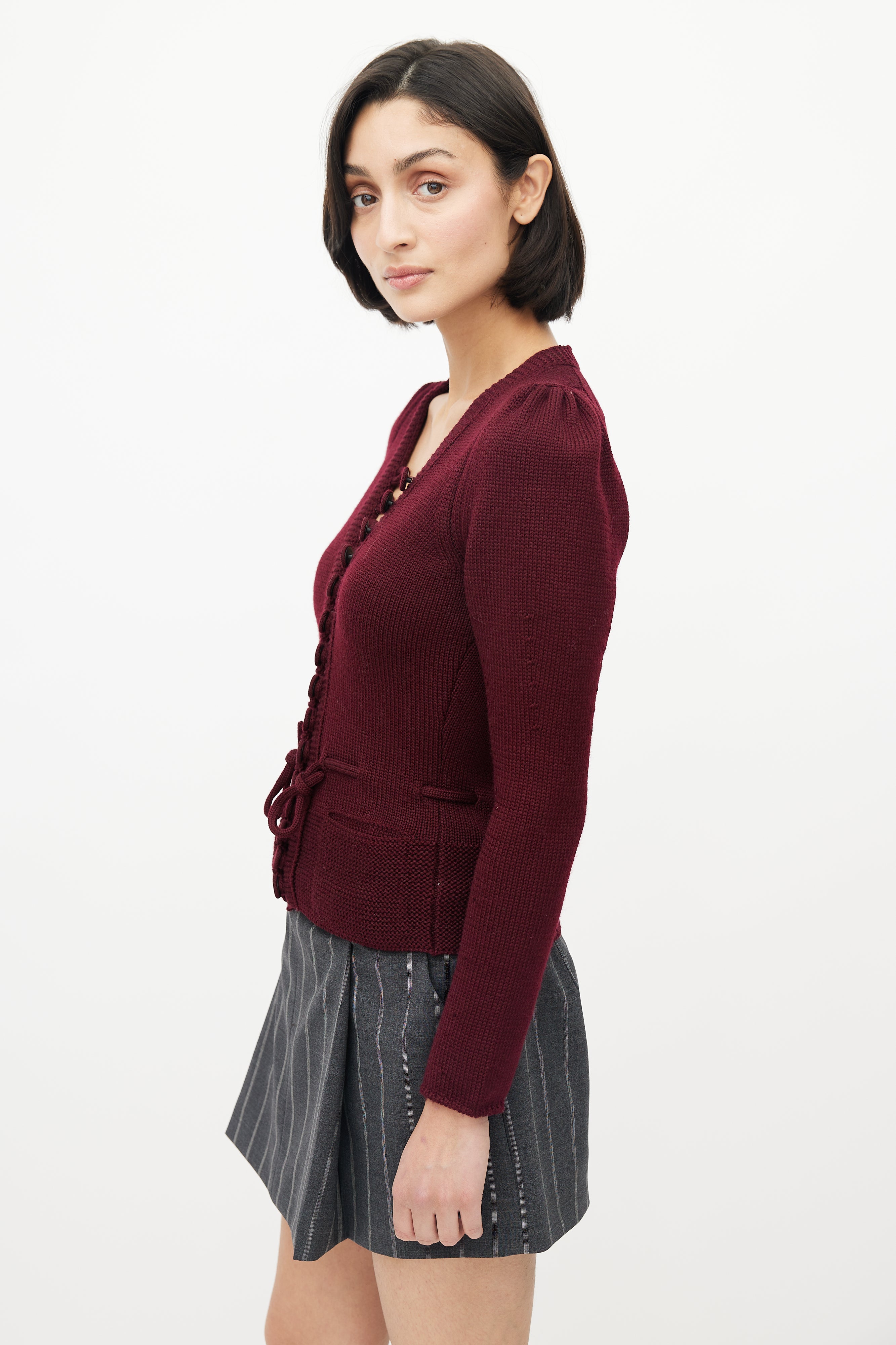 Pre-owned Gucci burgundy cardigan featuring covered button up front, two patch pockets at waist, V-neckline, puffed shoulder, and drawstring at waist.
