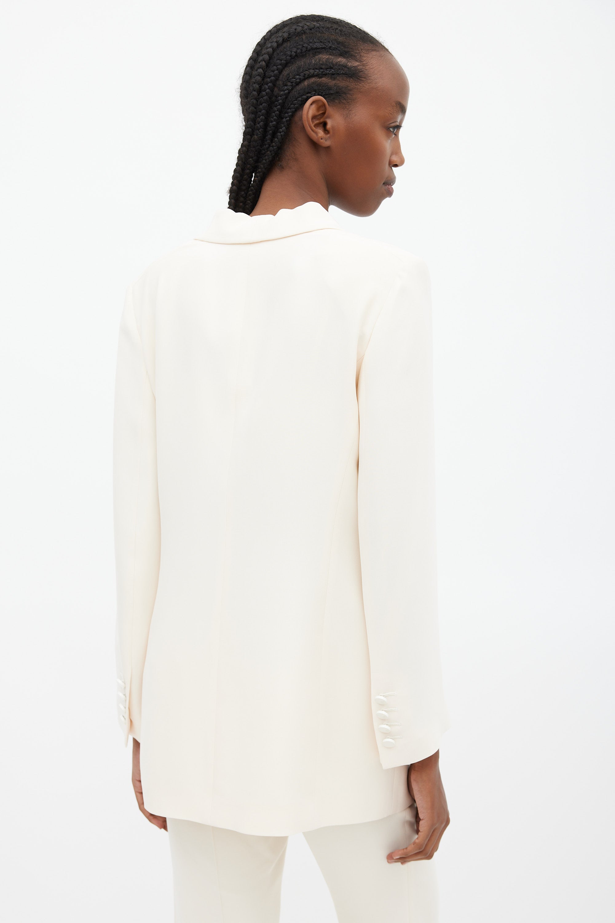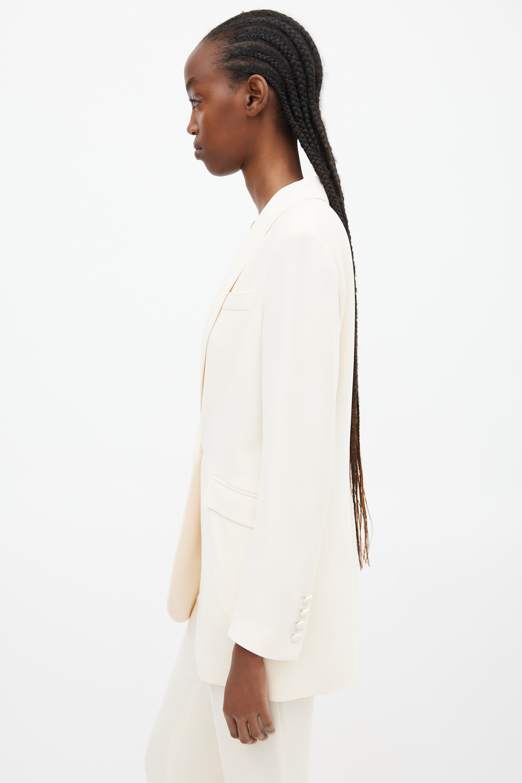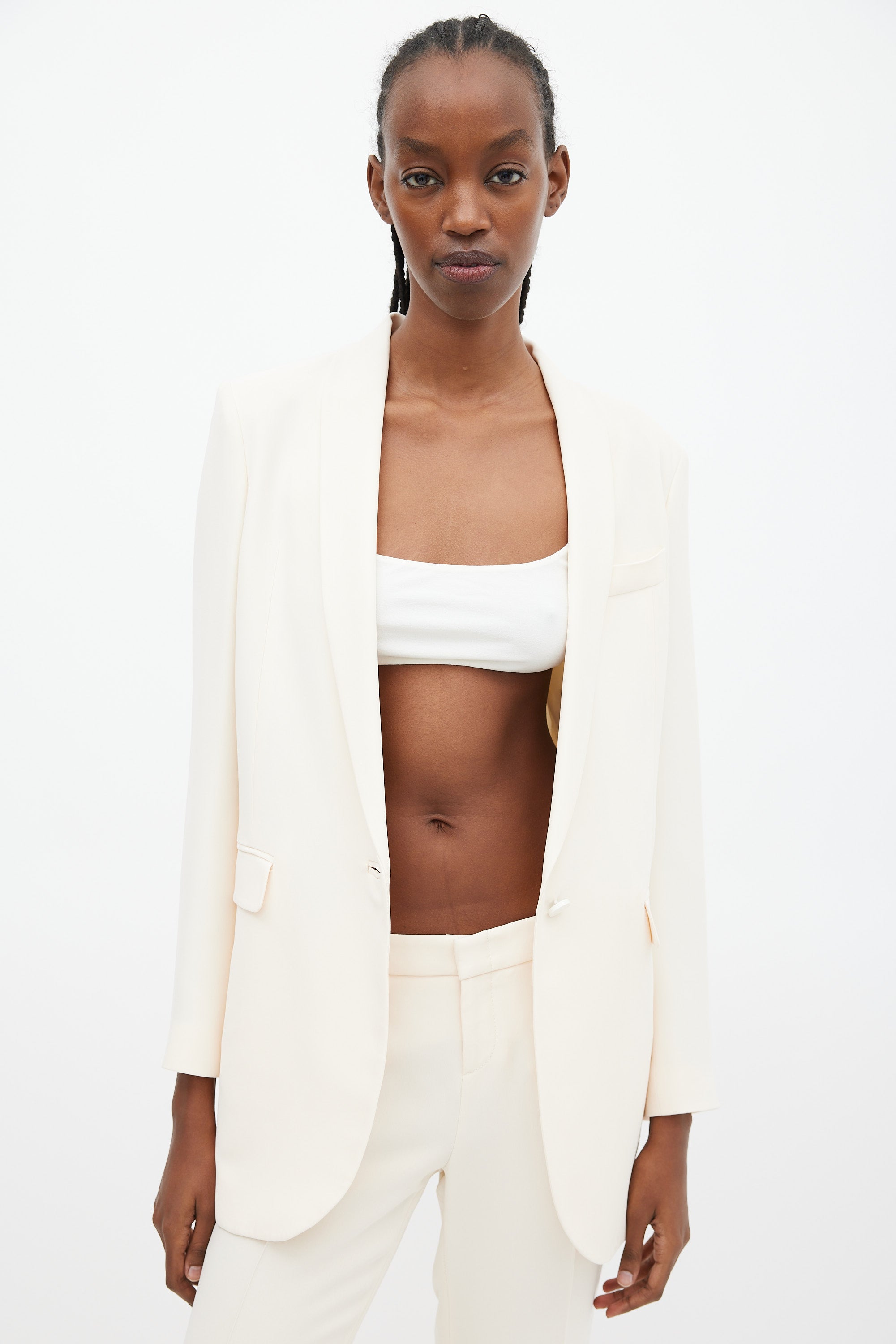 Pre-owned Gucci cream silk blazer featuring a shawl collar, single front button, single slip pocket at left chest, two front flap pockets, padded shoulders, long sleeves with buttoned cuffs, and gold tone Horsebit hardware detail at interior back neck. Lined.