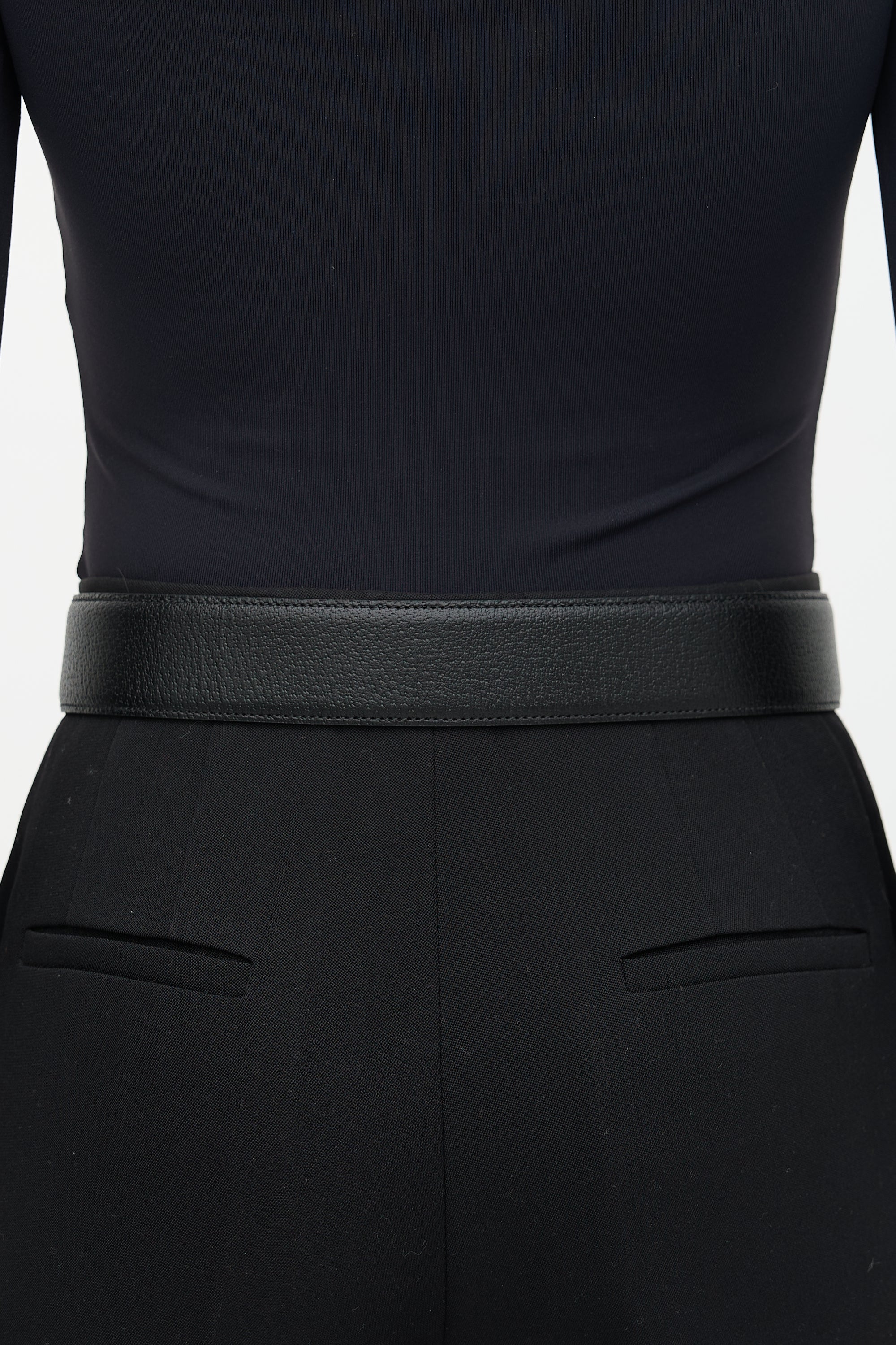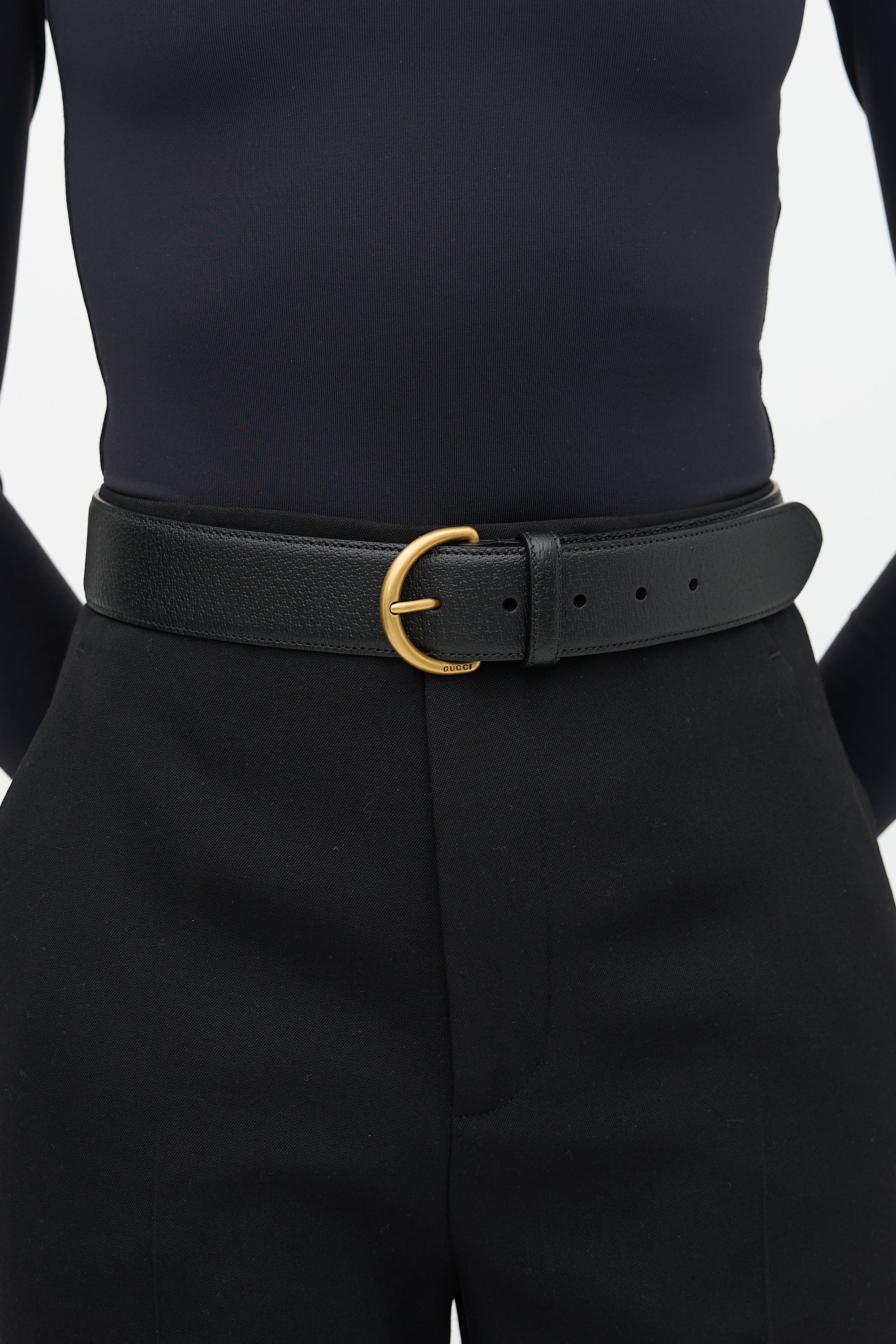 Pre-owned Gucci black leather belt featuring gold tone D-ring buckle with engraved logo and stamped logo at reverse.