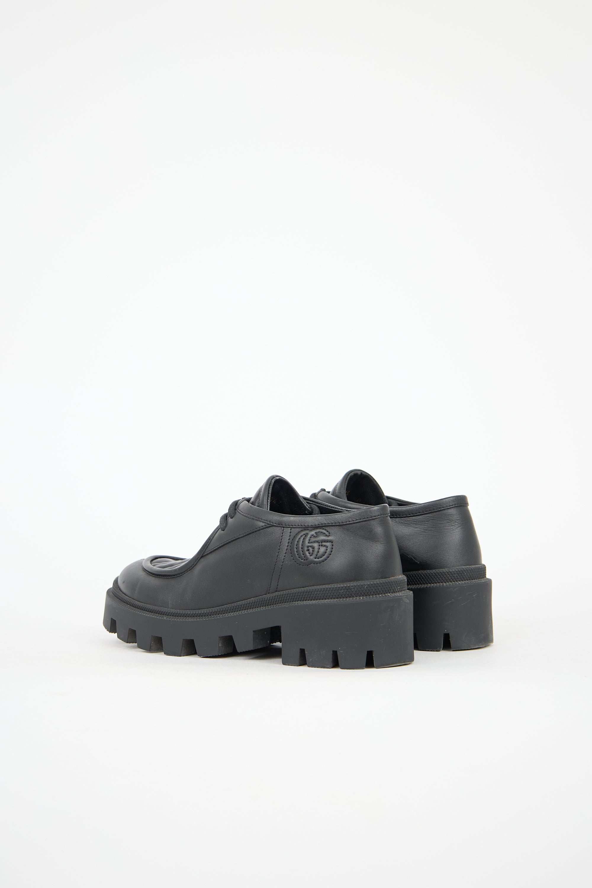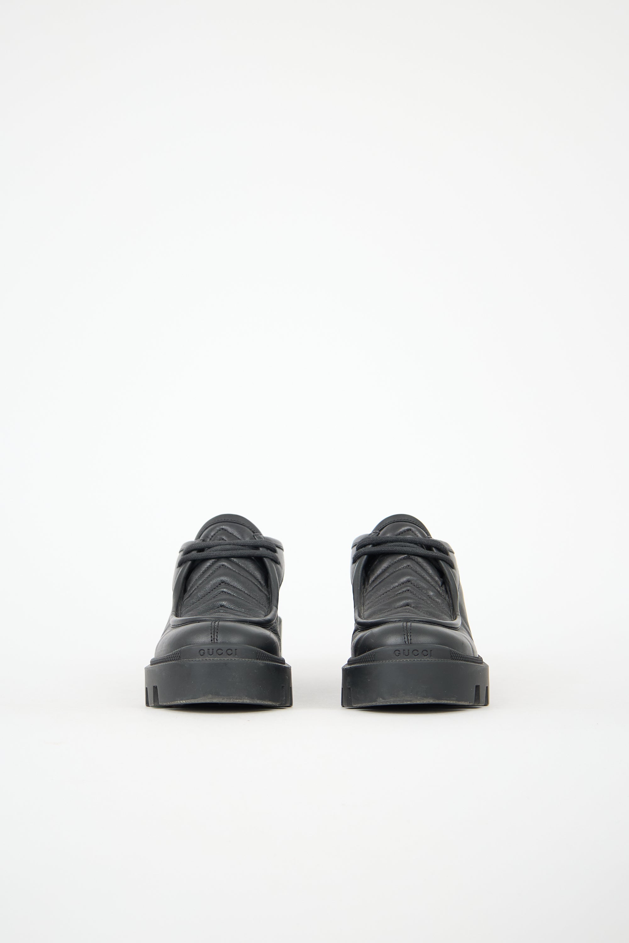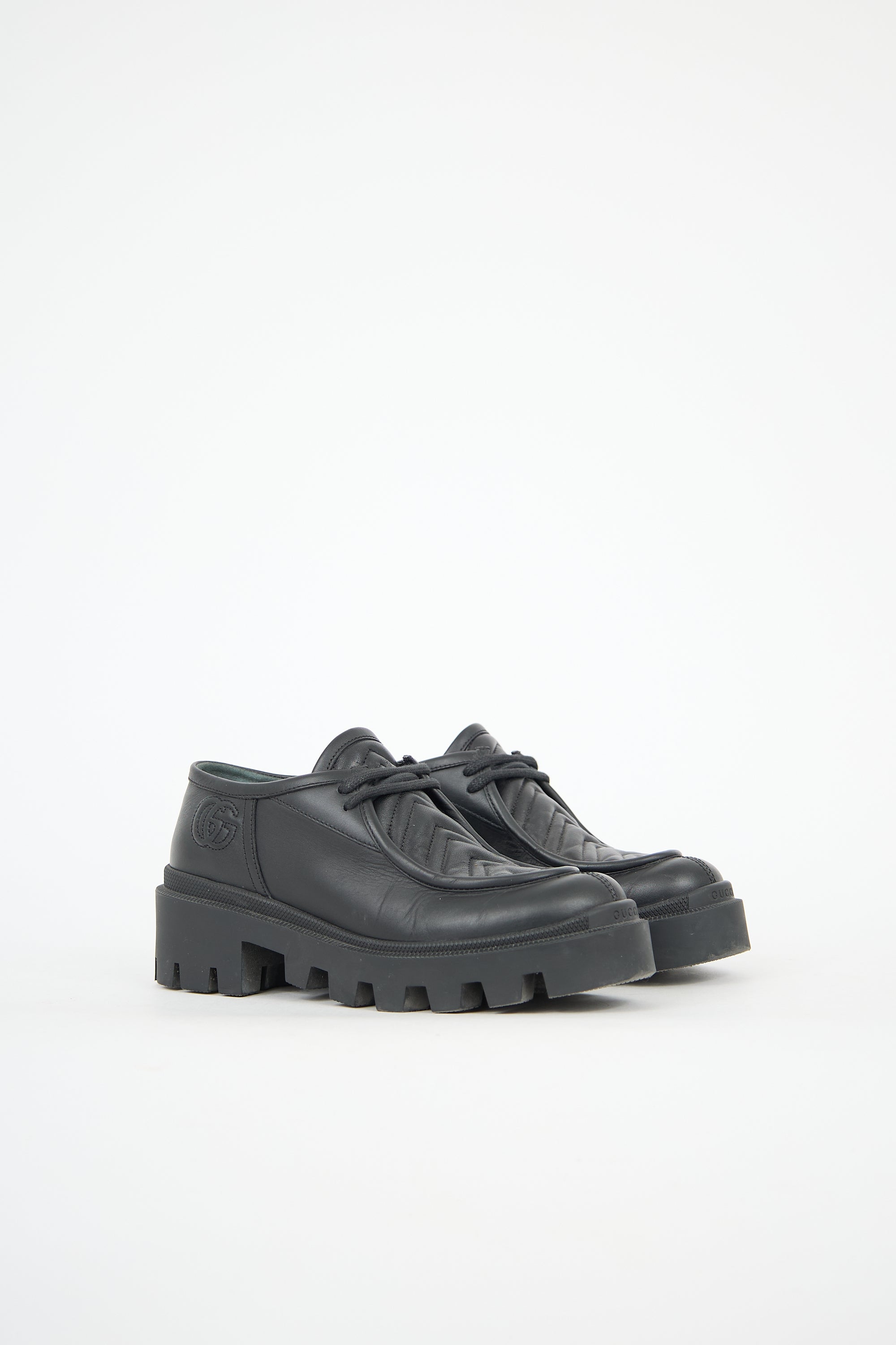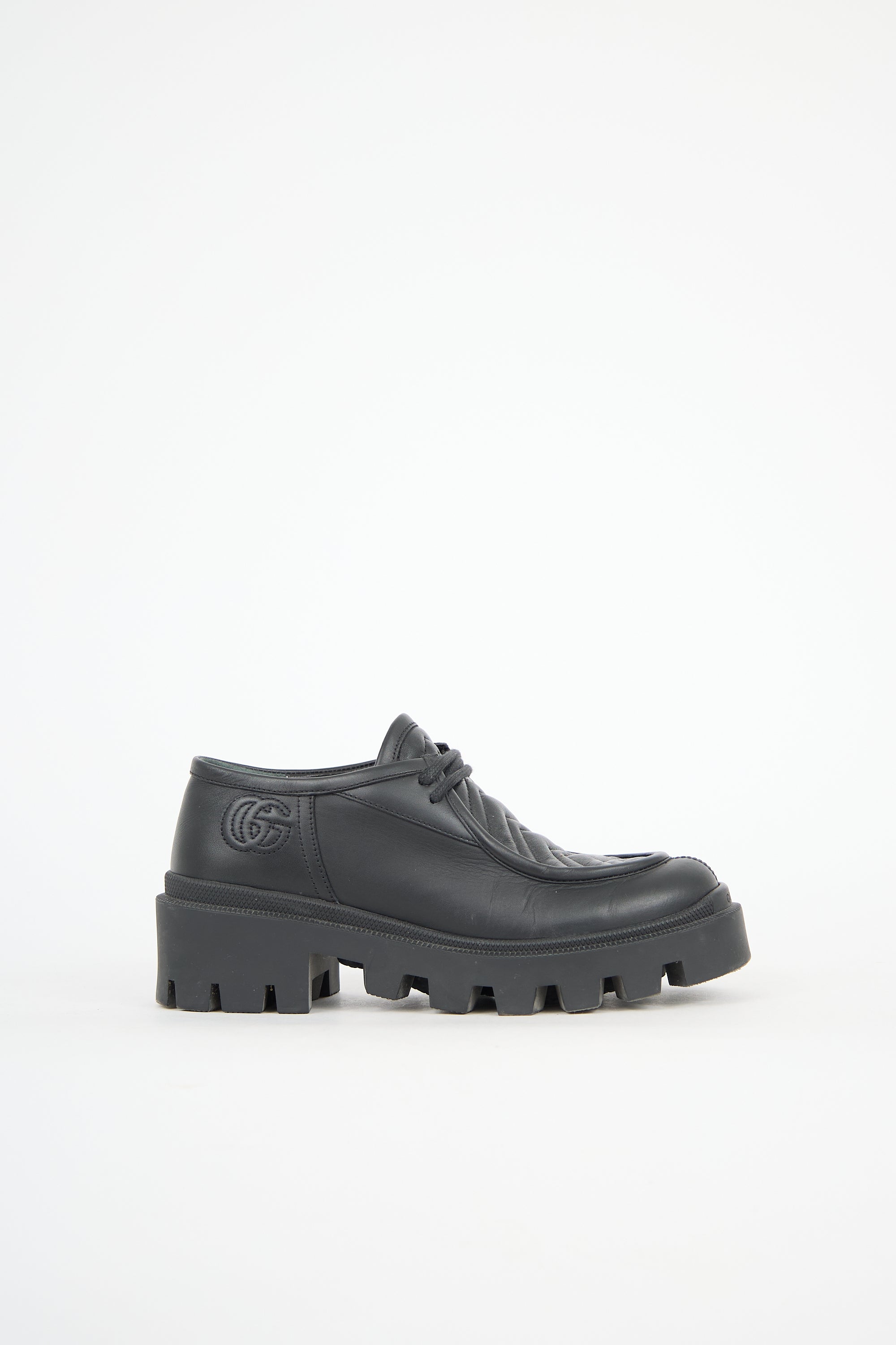 Pre-owned Gucci black leather boots featuring a rounded toe, lace up front, Matelasse leather tongue, stitched GG Marmont logo at collar, and treaded rubber sole. Comes with extra set of laces.