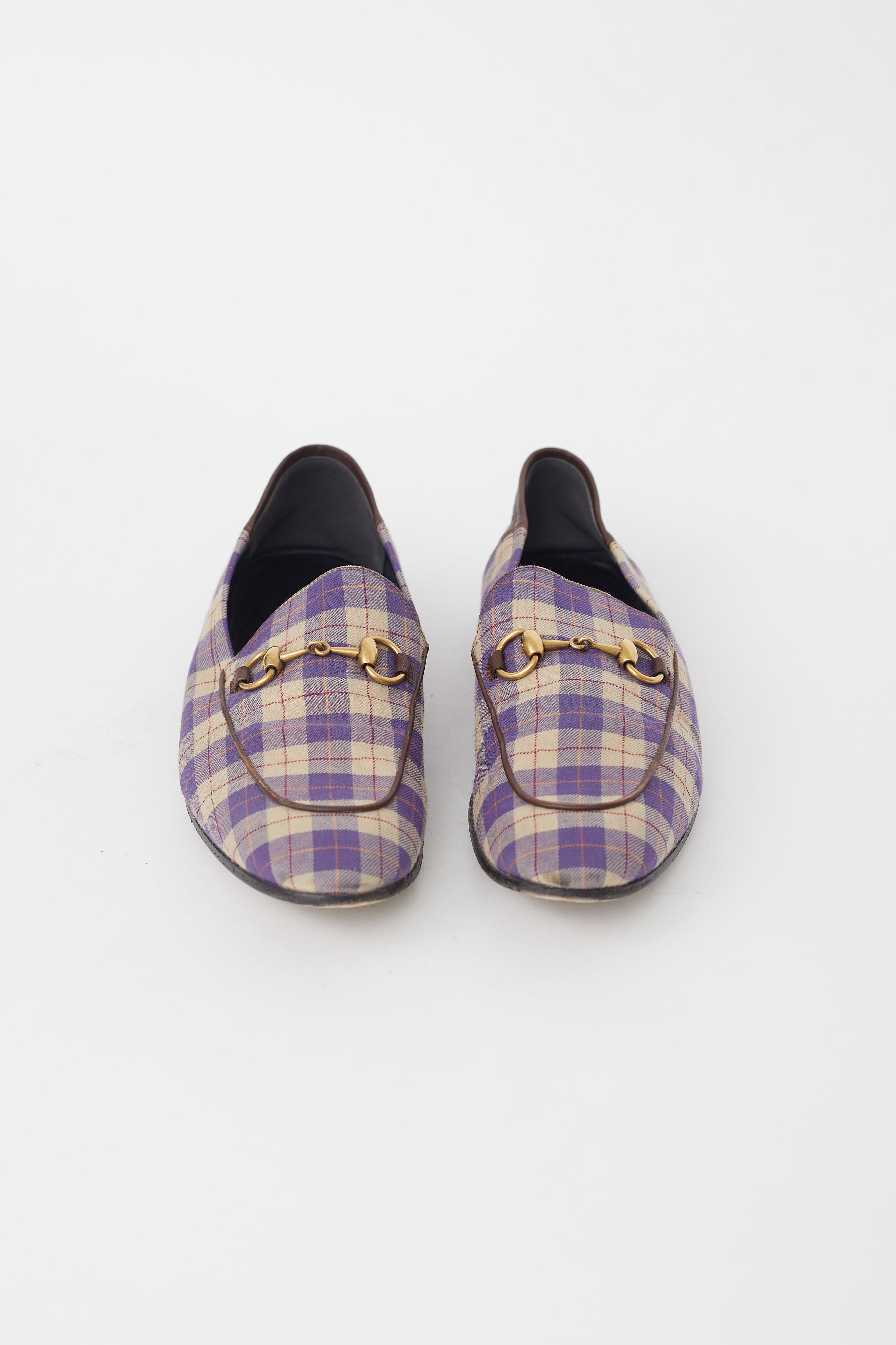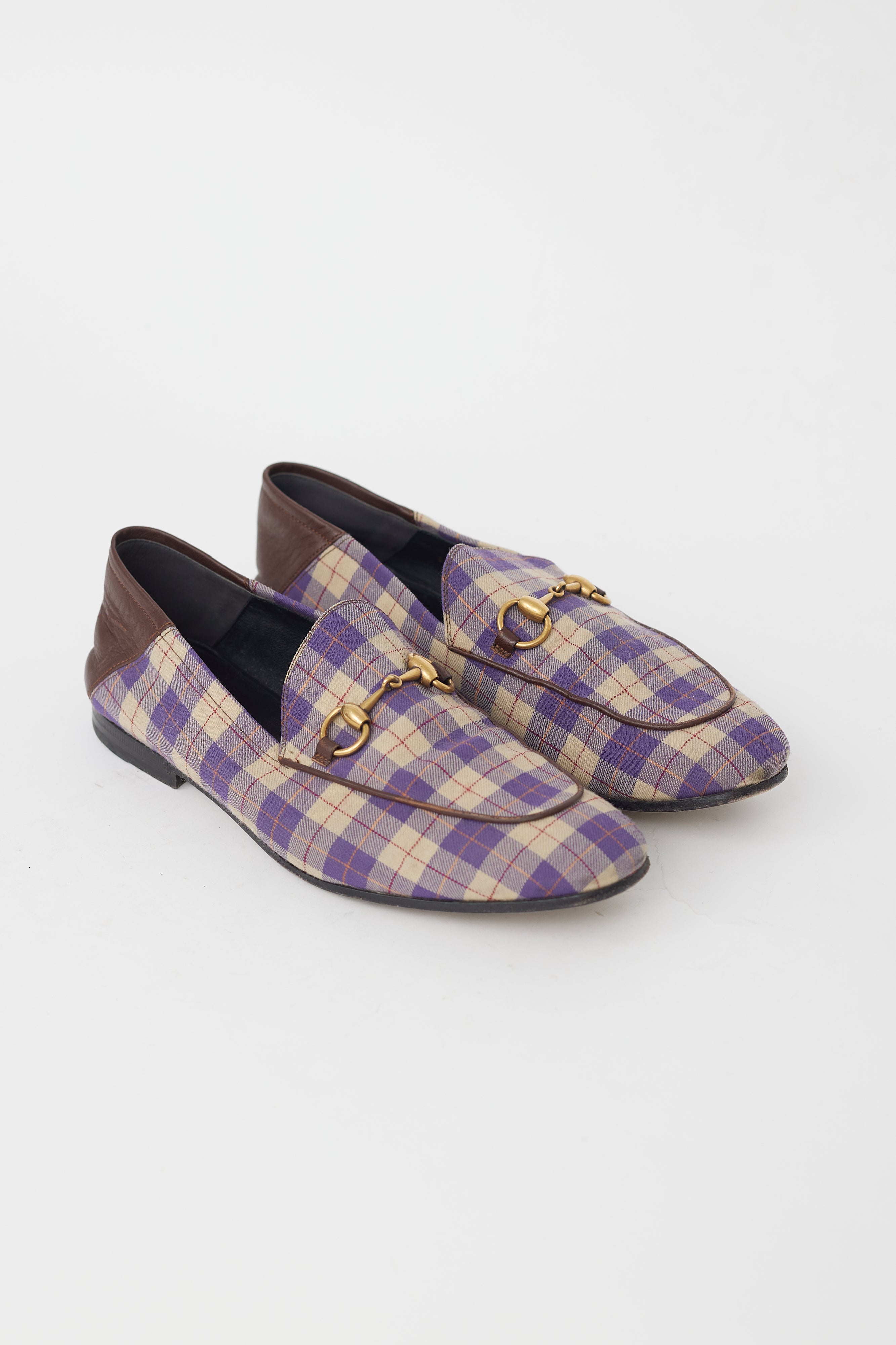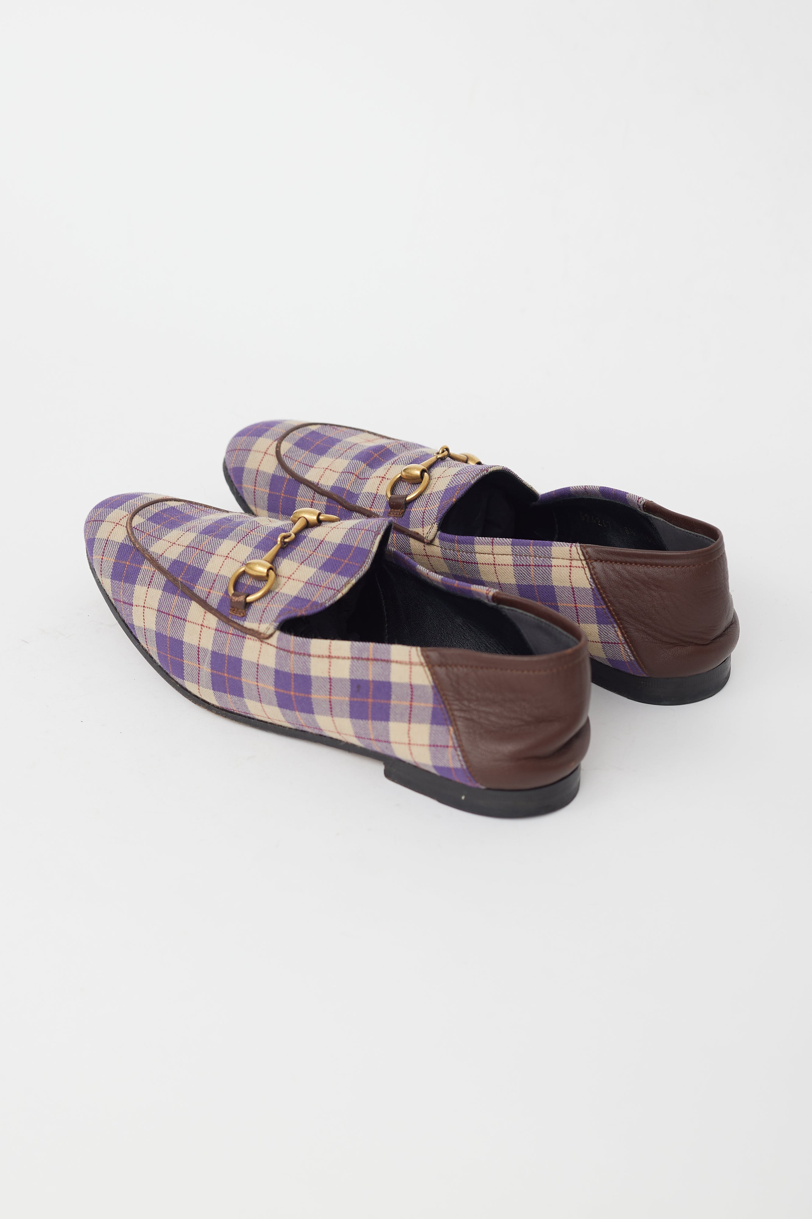 Pre-owned Gucci purple and cream plaid loafers featuring collapsible heel, round toe, brown leather counter, gold tone horse-bit detail at vamp, short stacked heel, and leather insoles.