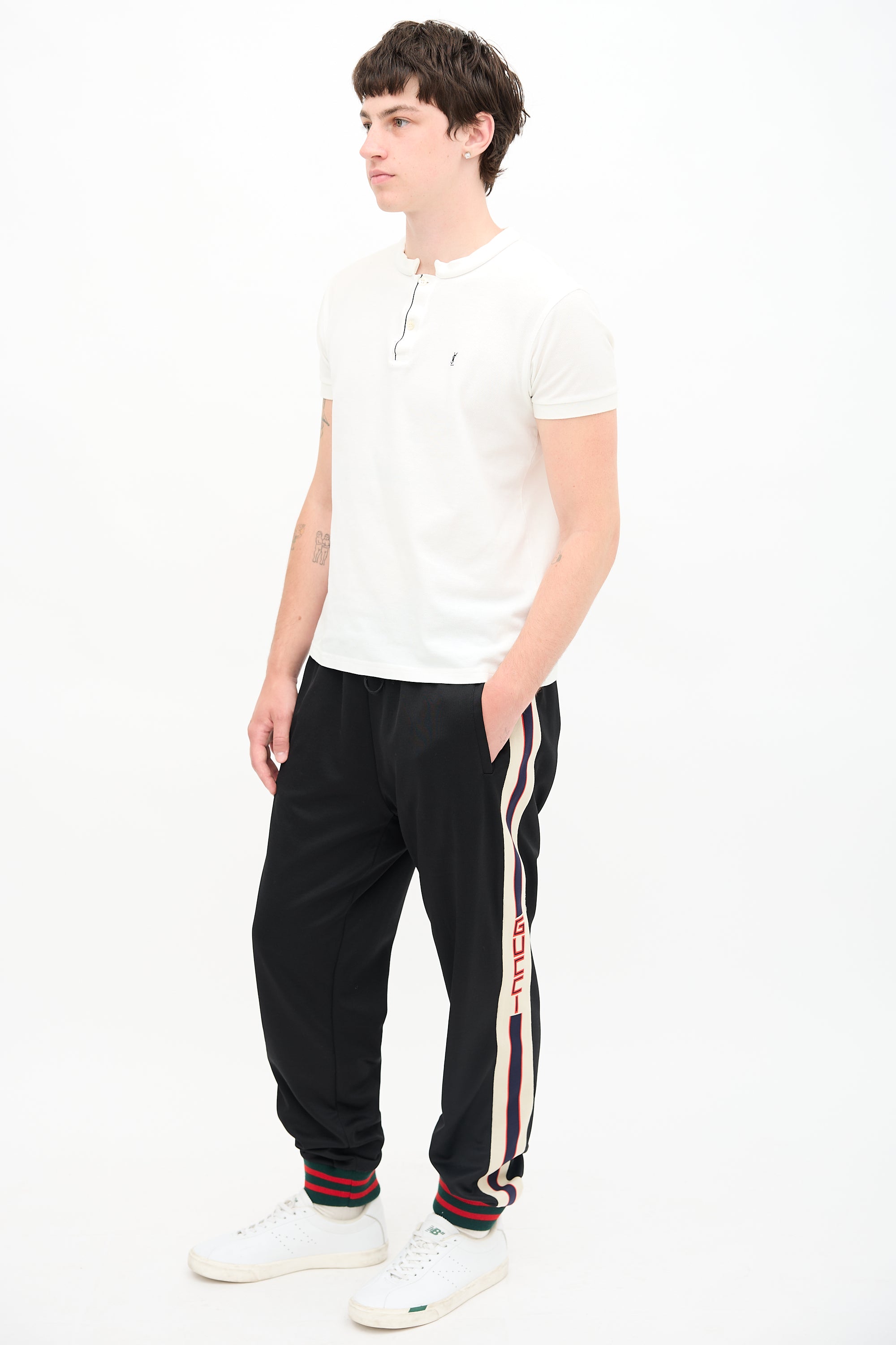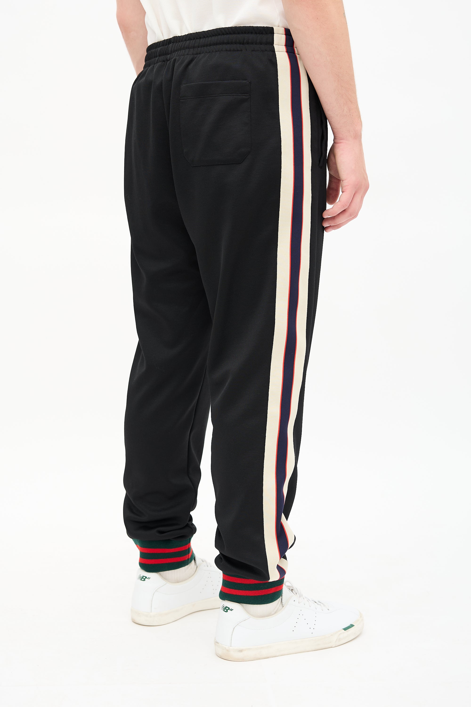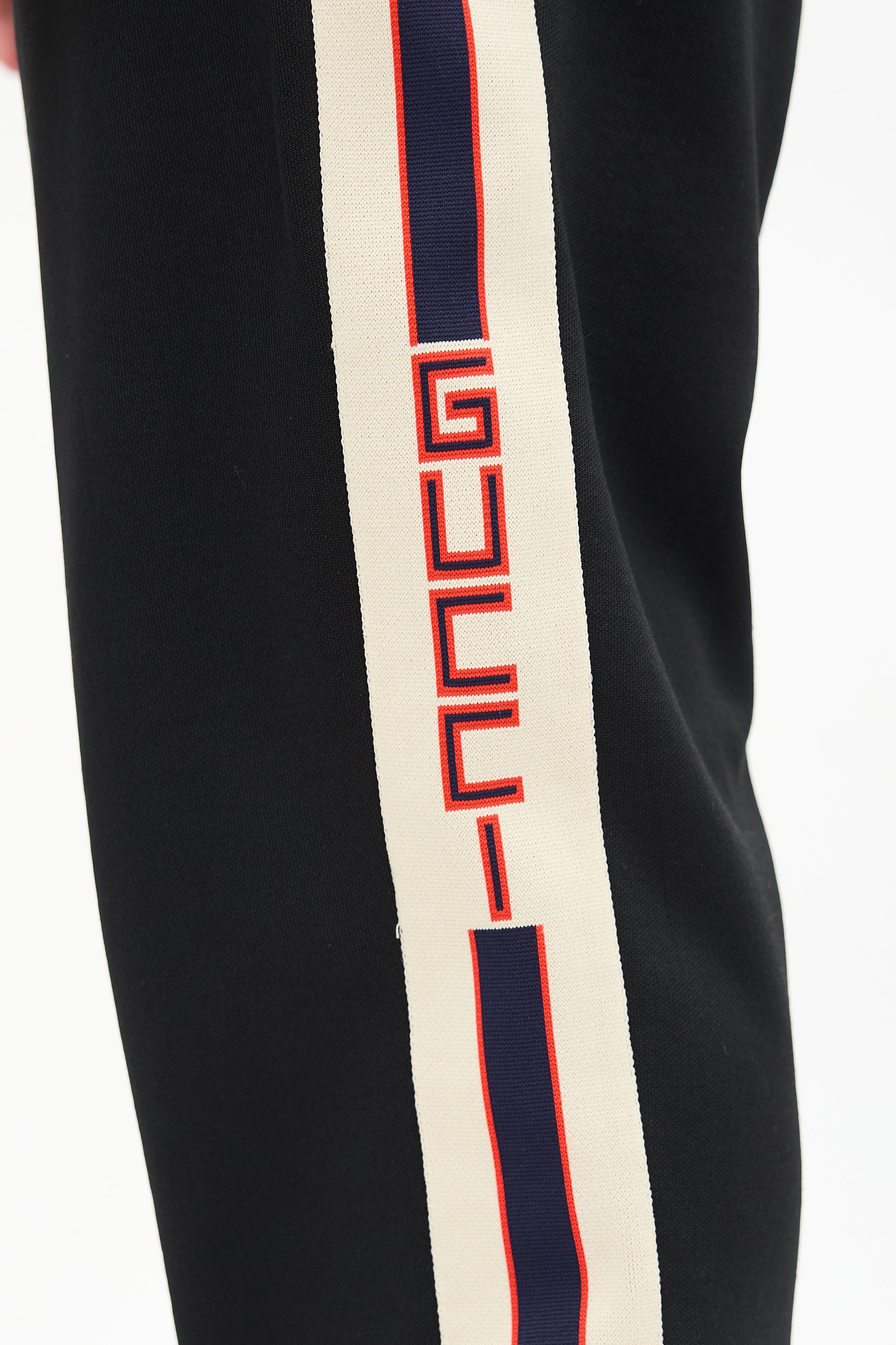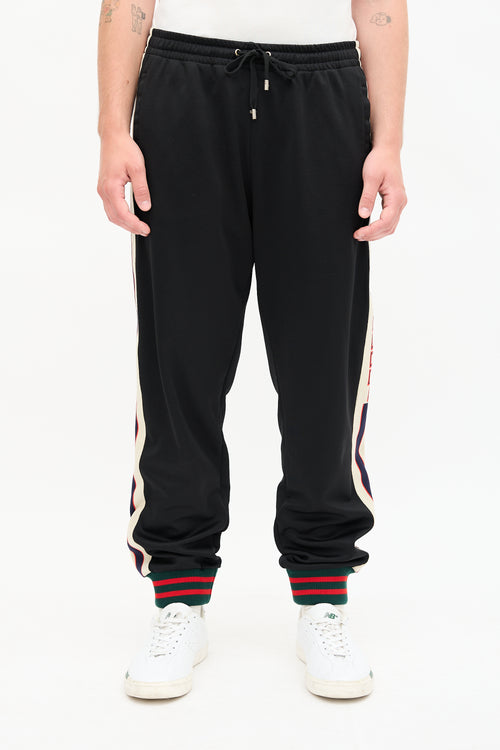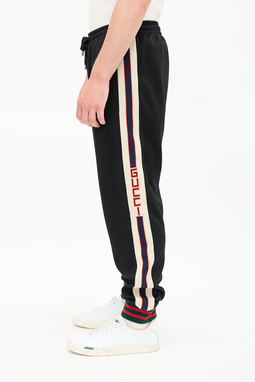 Pre-owned Gucci black and multicolour tech jersey track pants featuring elasticized drawstring waist, tapered leg, webbing stripe trim with logo at sides, stripe ribbed hem, and three pocket styling.