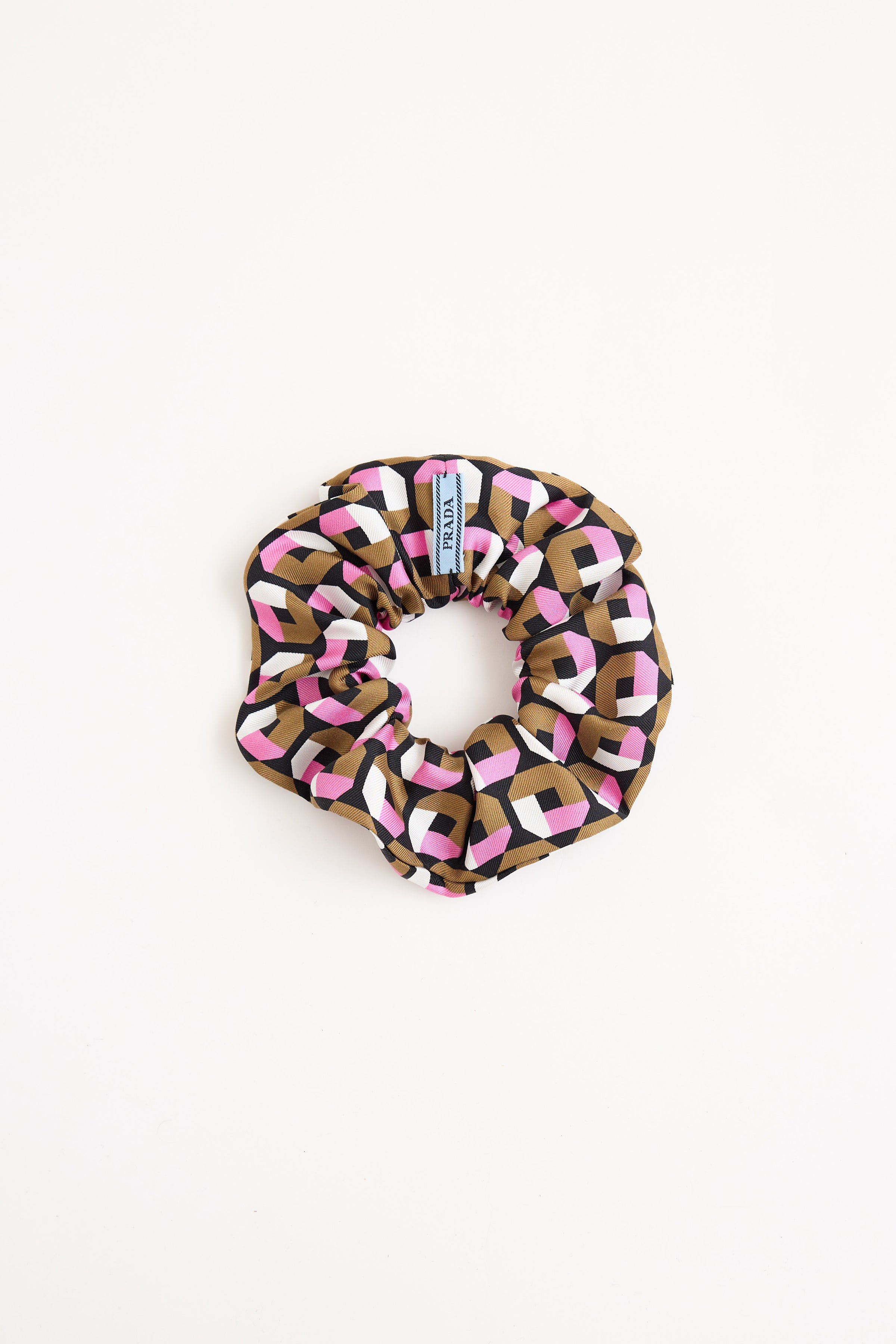 Pre-owned Prada pink, brown, white, and black silk scrunchie featuring geometric print, black signature triangle logo plaque, and logo tab at reverse.
