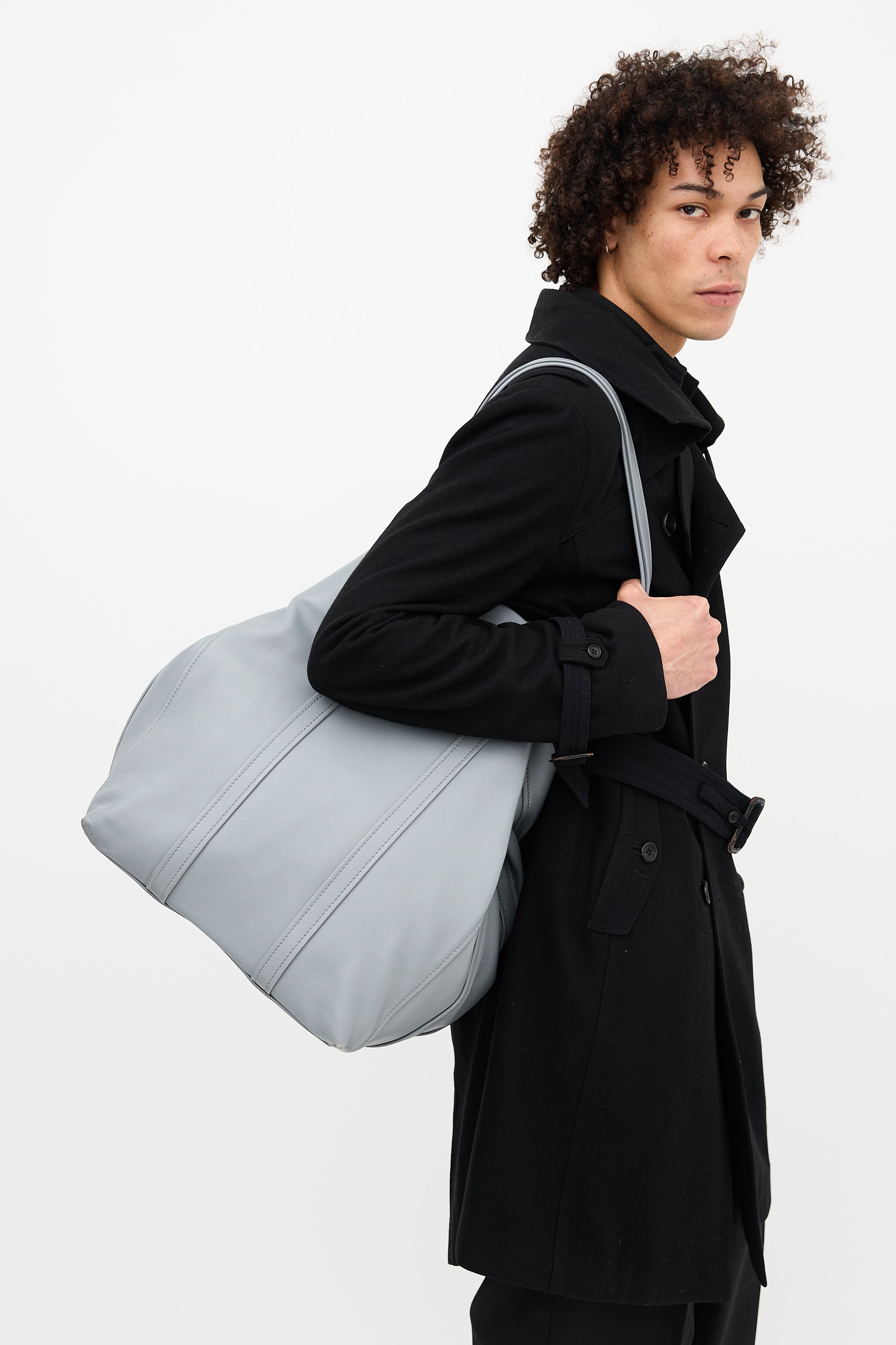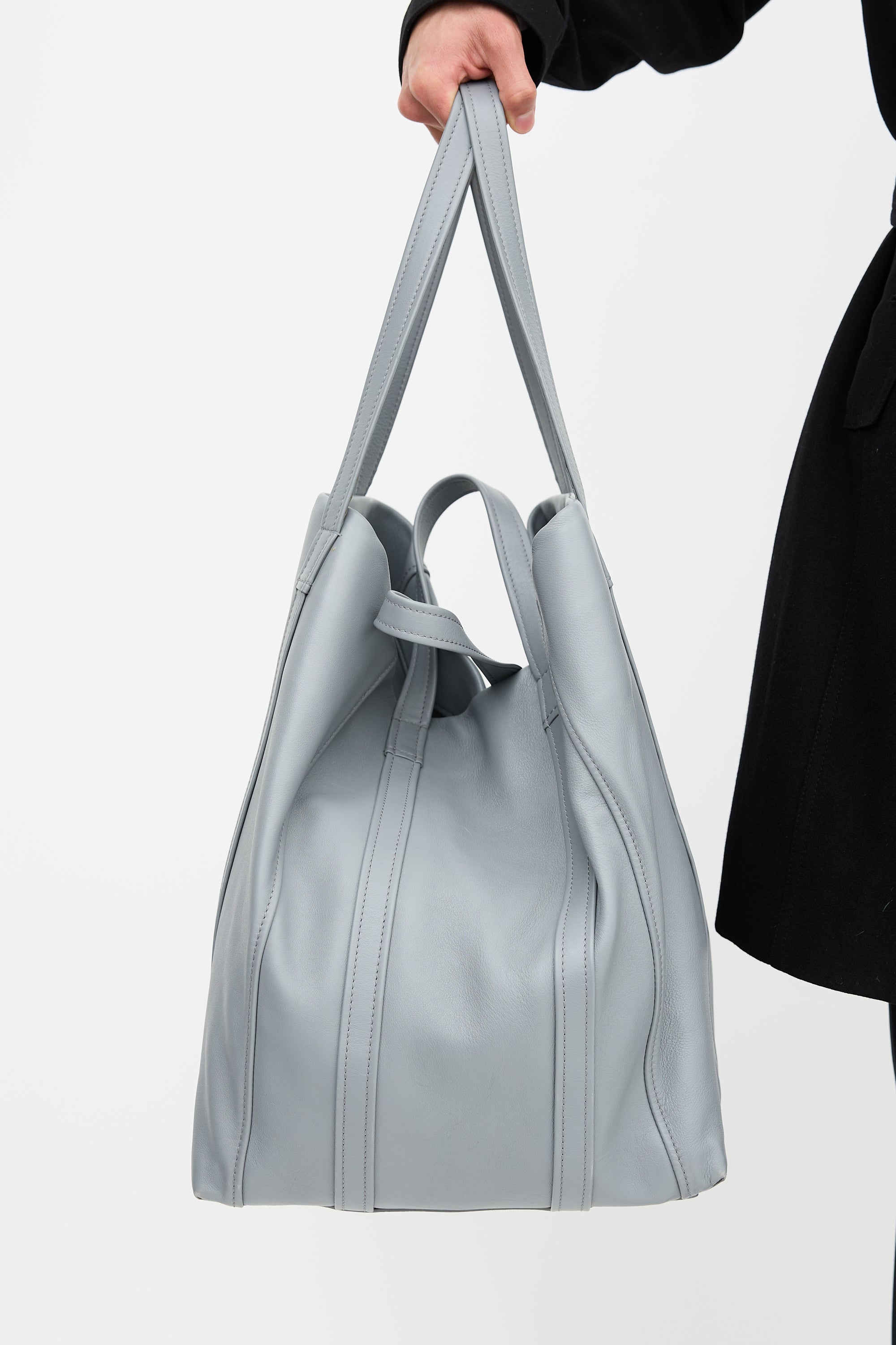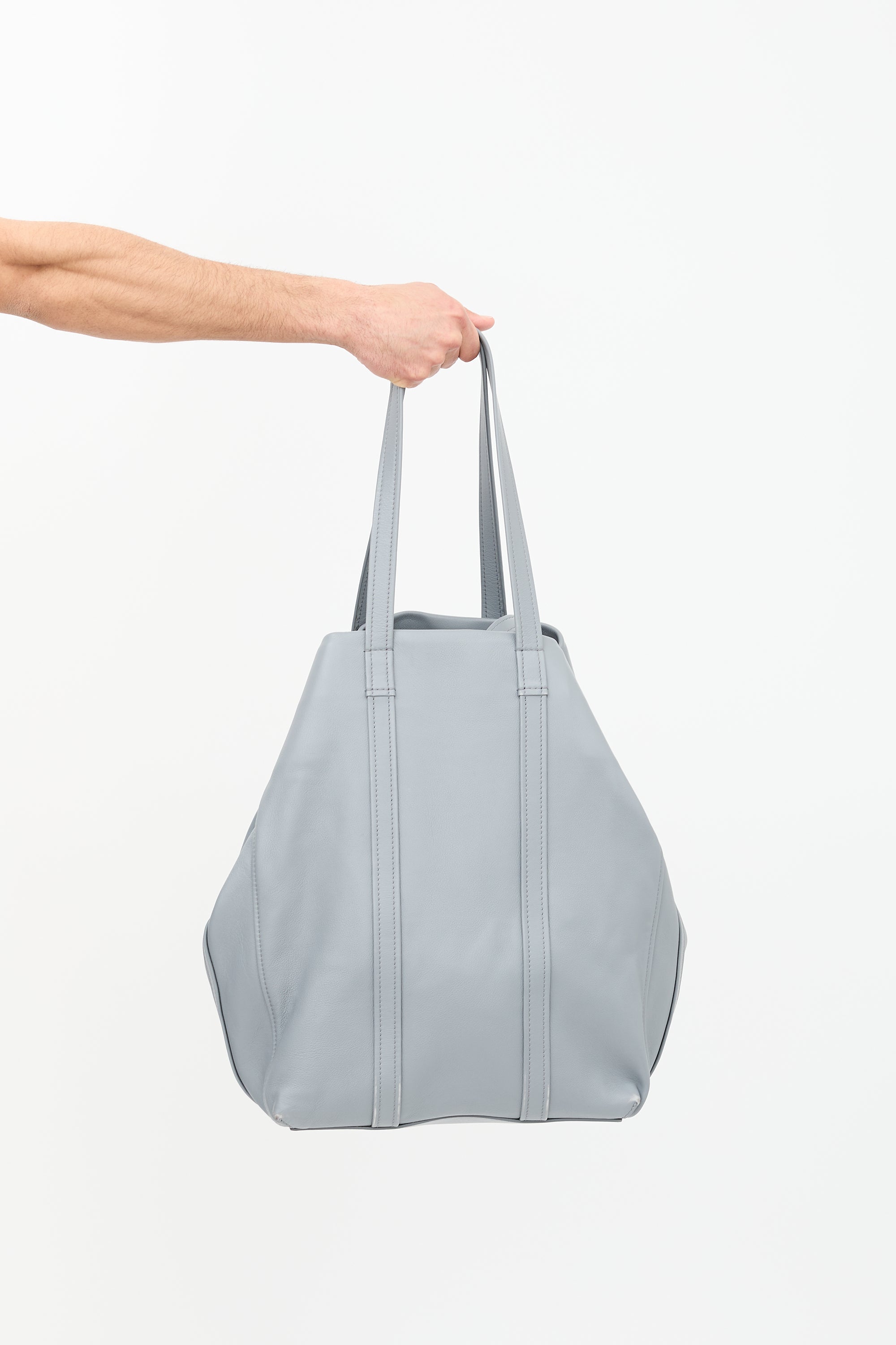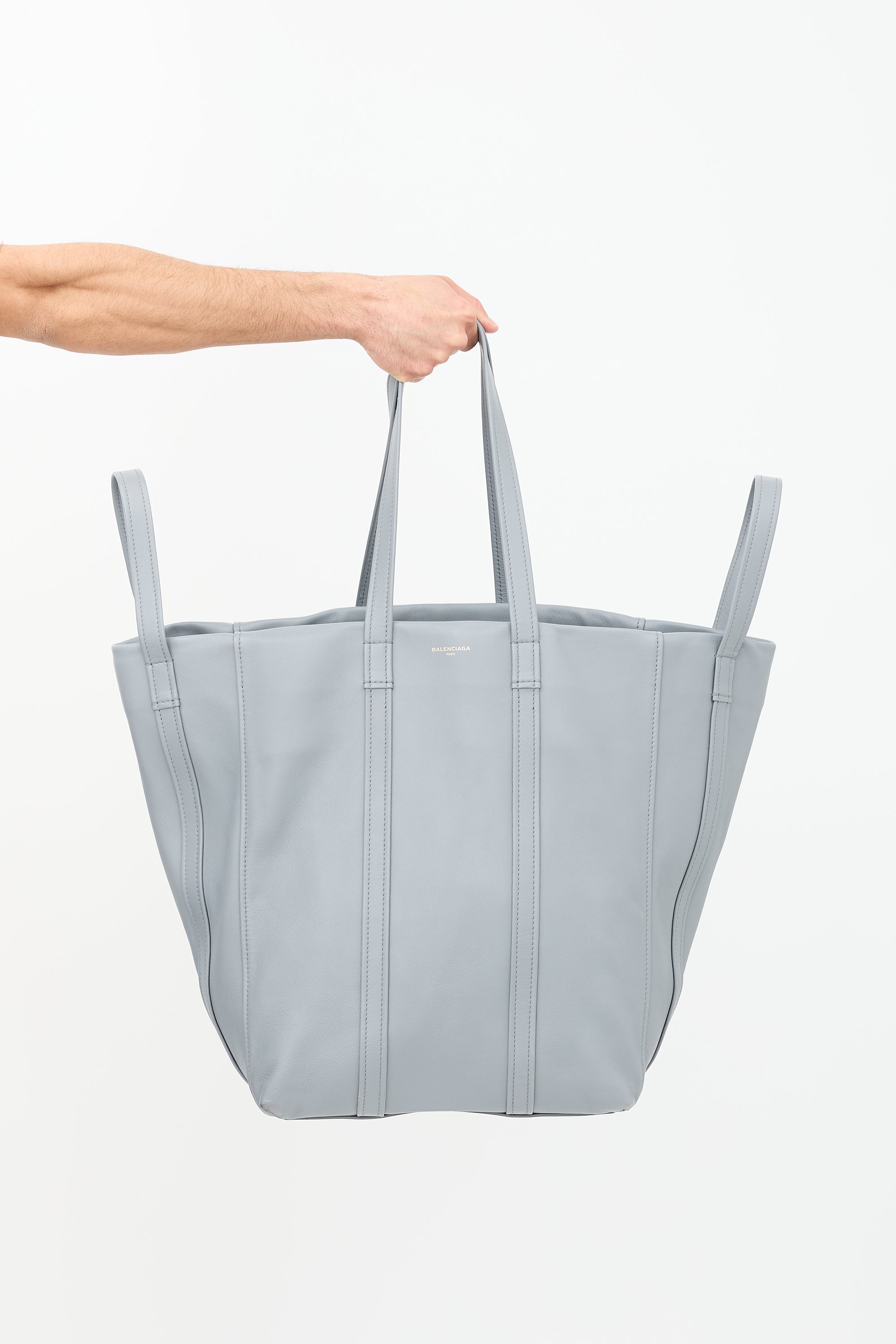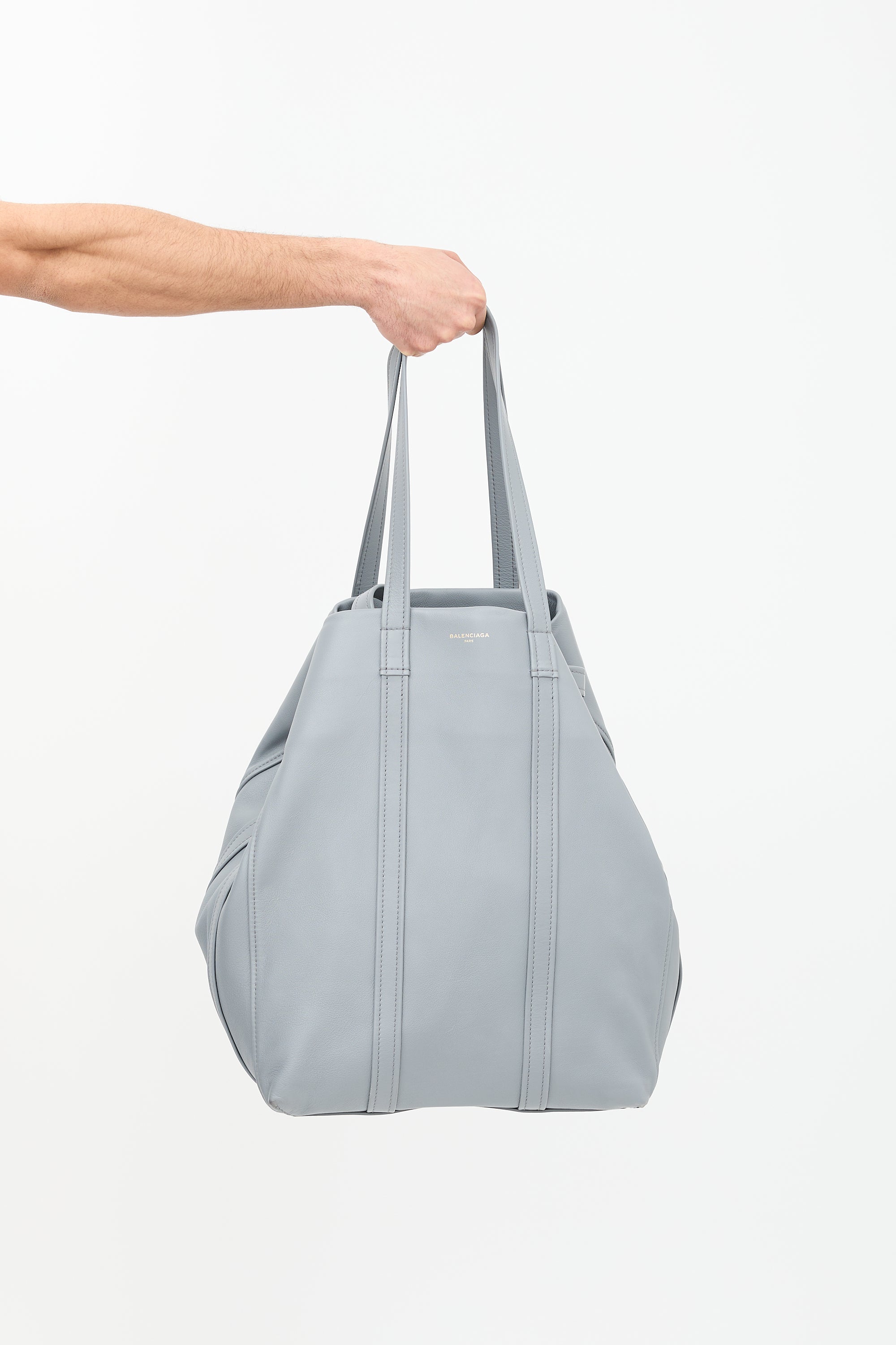 Pre-owned Balenciaga Fall Winter 2017 grey leather Laundry Cabas extra large tote bag featuring four flat top handles, gold tone hardware, two gold stamped logos at each face, tonal stitching, zip closure with snap button at one side, and one interior zip pocket.