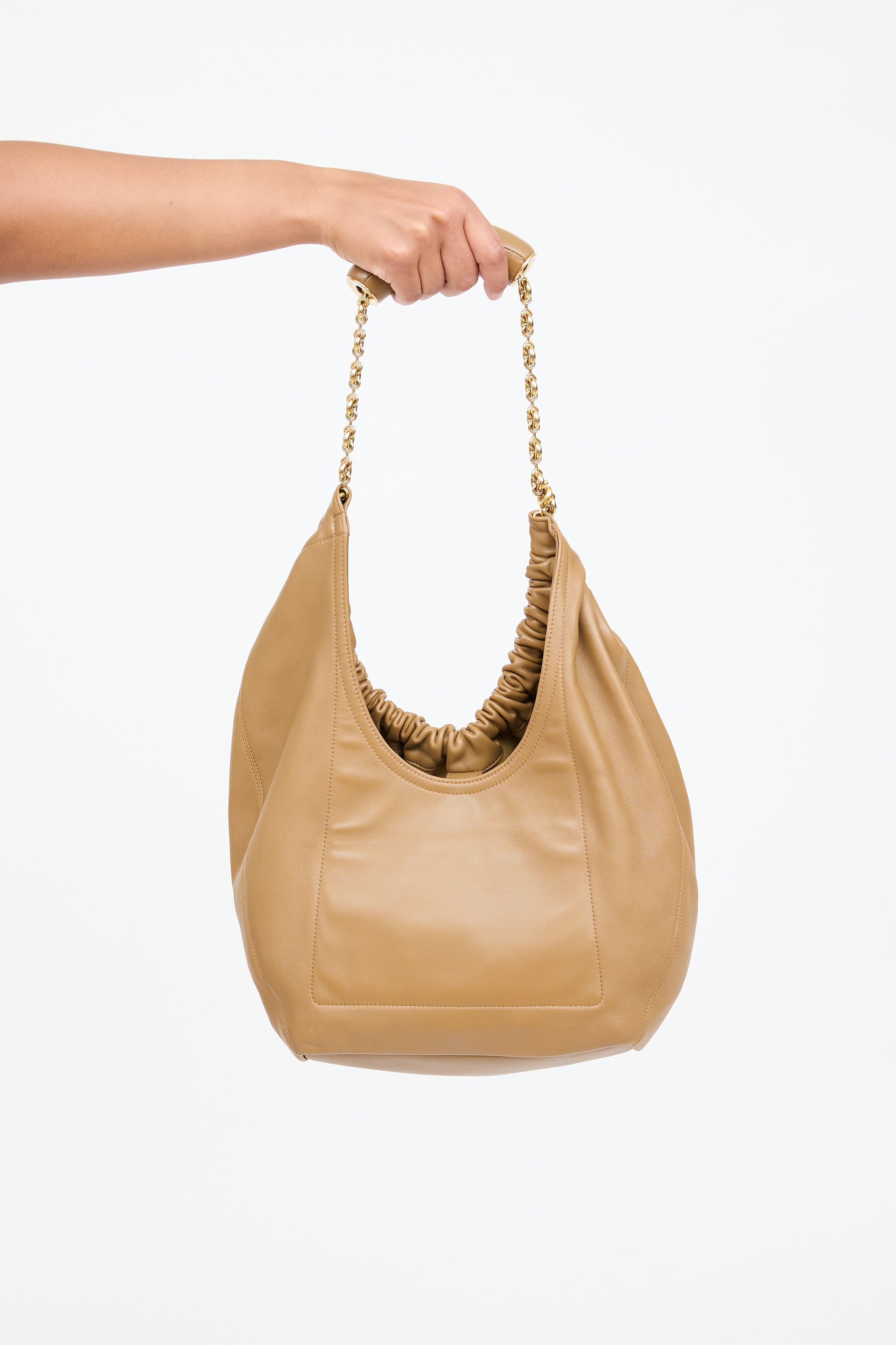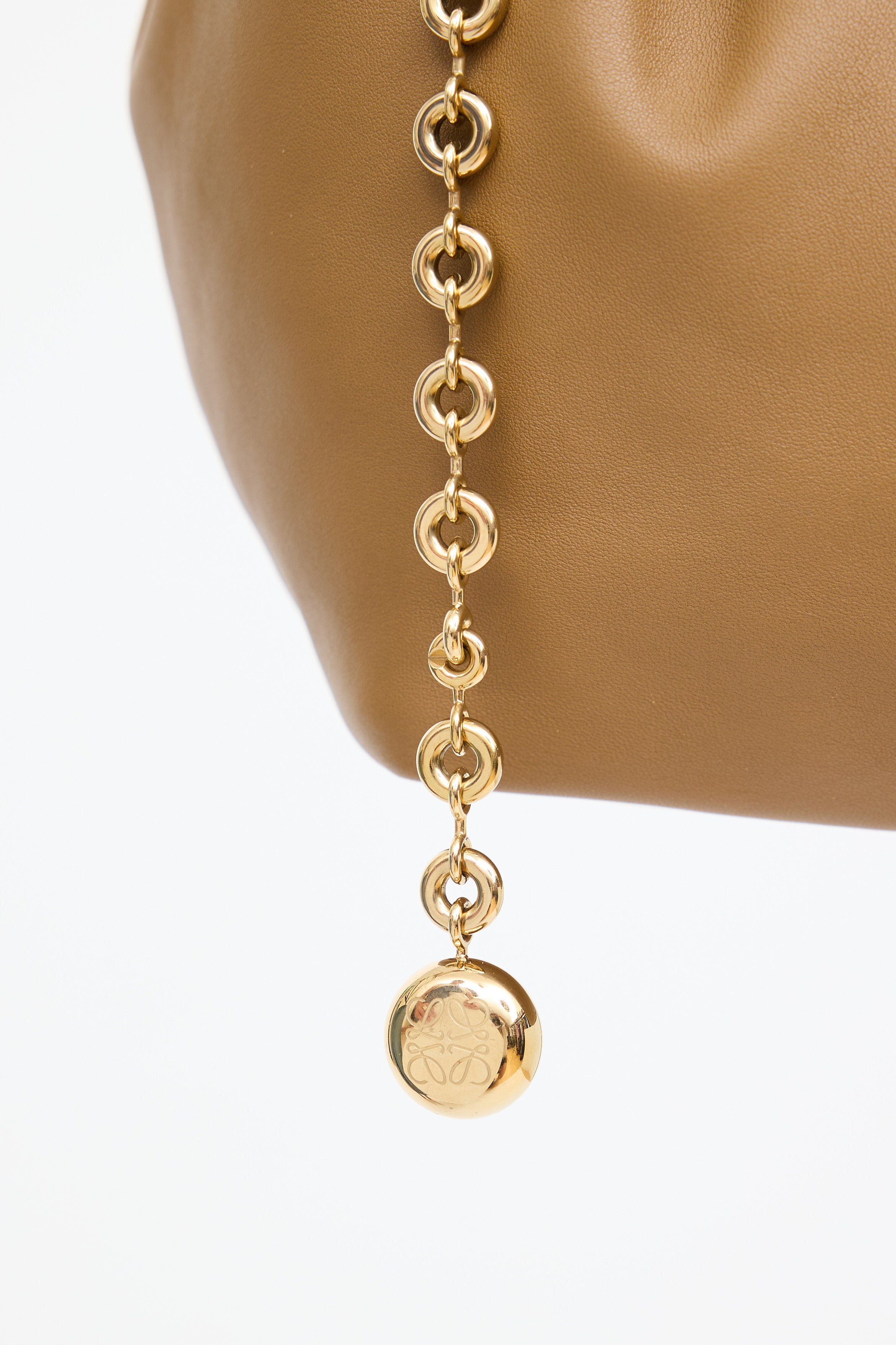 Pre-owned Loewe brown leather medium Squeeze bag featuring singular rolled top handle with adjustable gold tone chain-link, structured base, cinched open top with magnetic closure, embossed logo at back, and one main compartment with interior zip pocket.