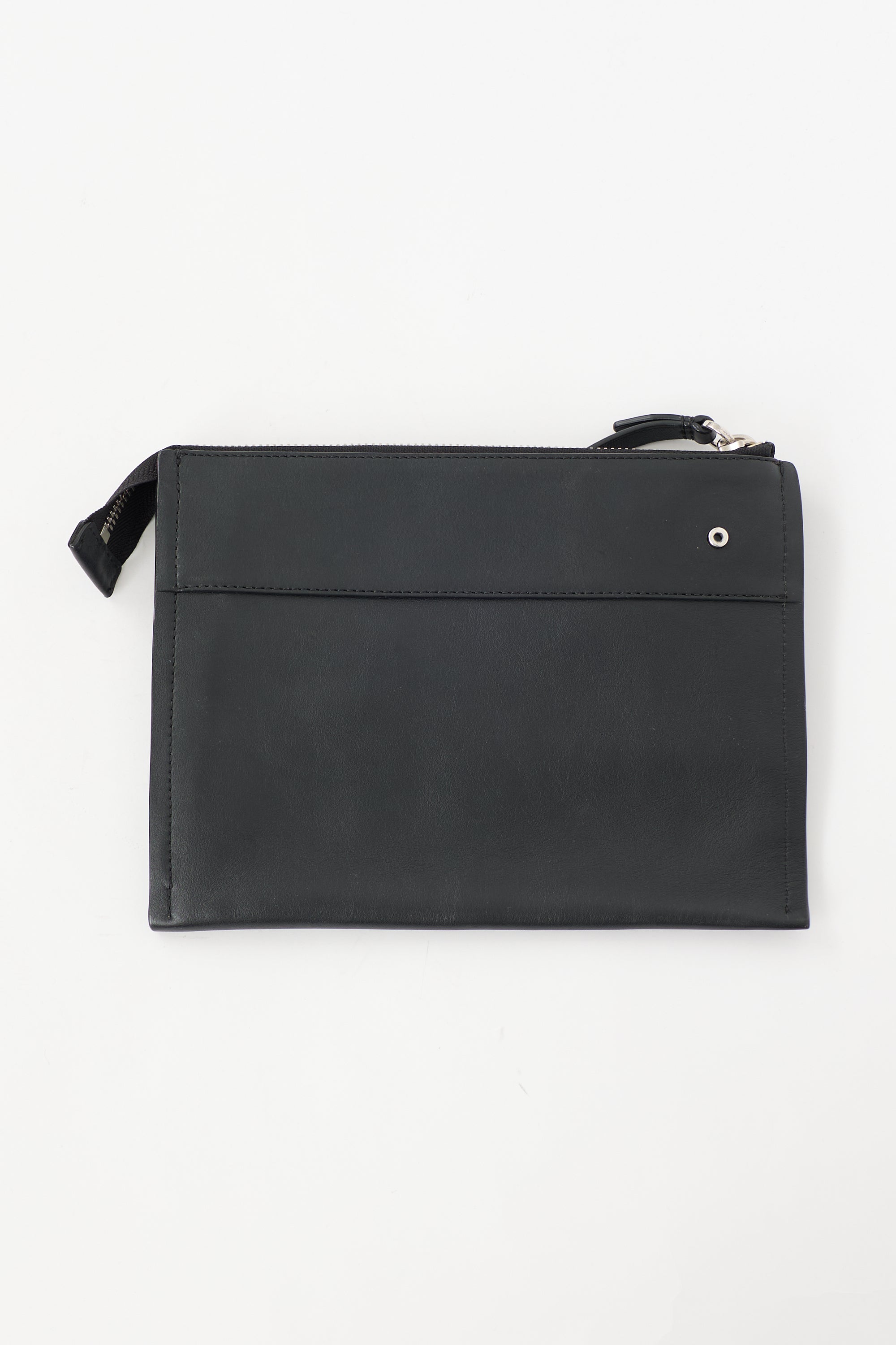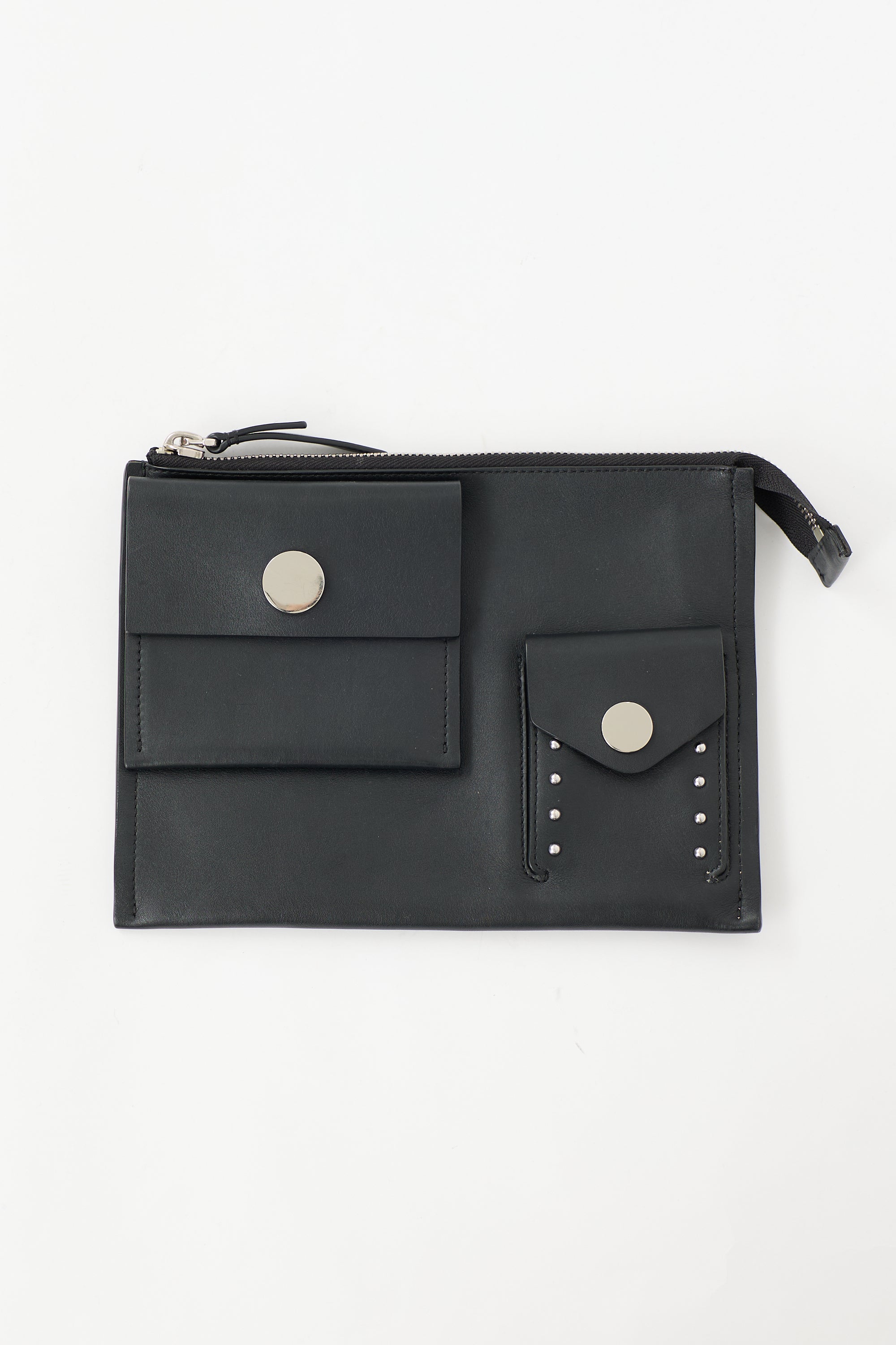 Pre-owned 3.1 Phillip Lim black leather clutch featuring silver tone hardware, two front flap pockets, stud trim at one pocket, top zip closure, and one lined main compartment.